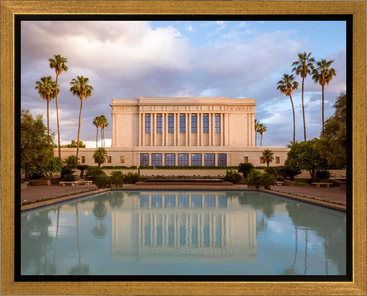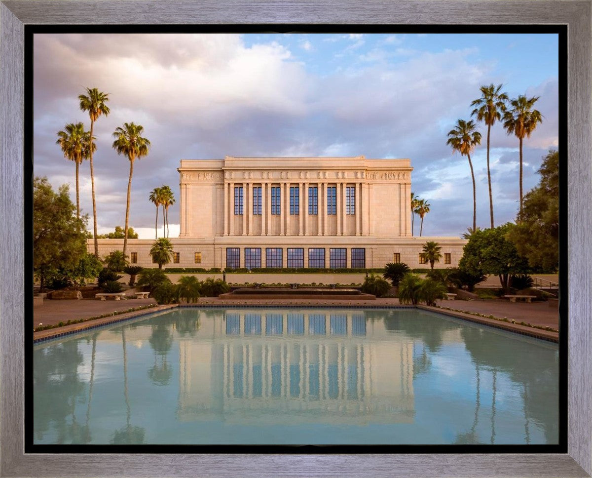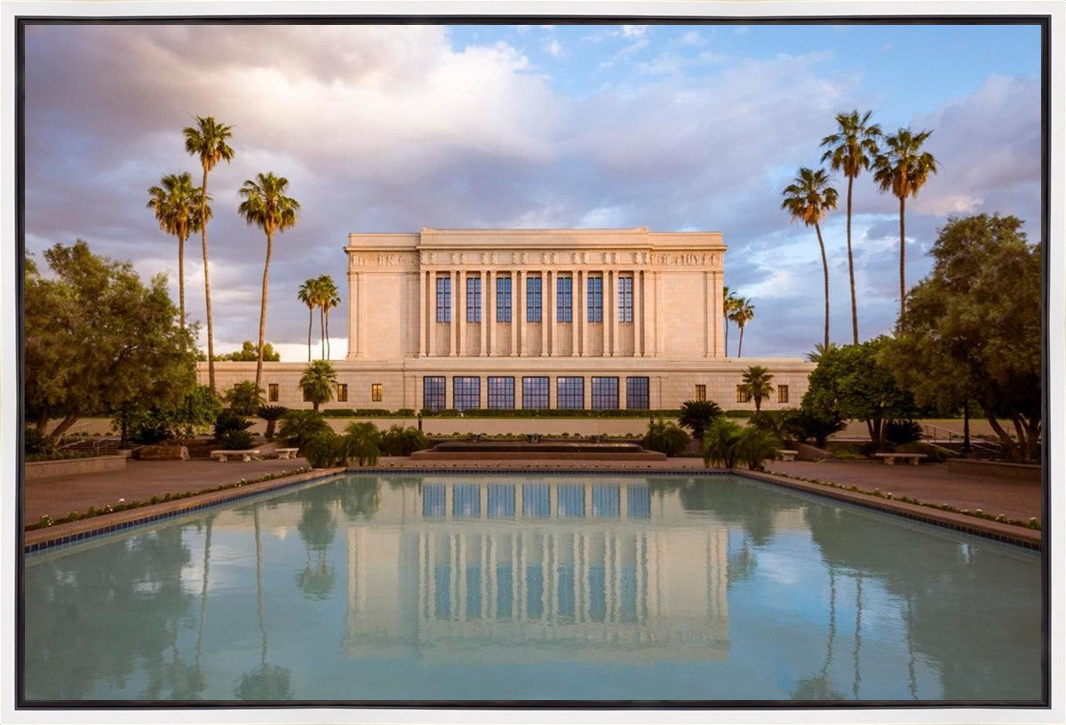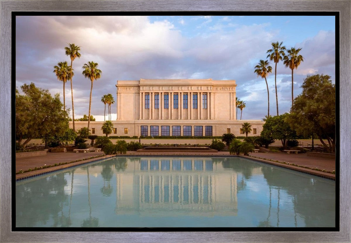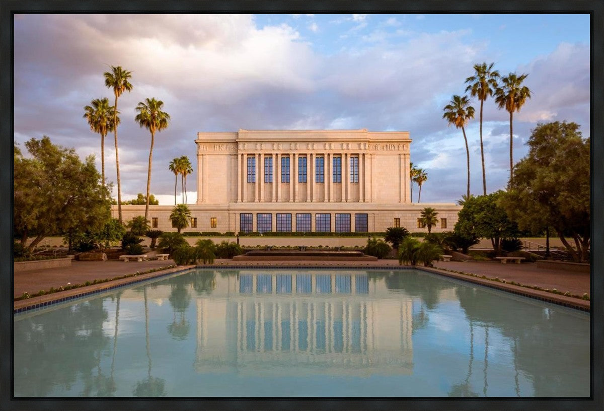 A peaceful garden view of the Mesa, Arizona temple at sunset