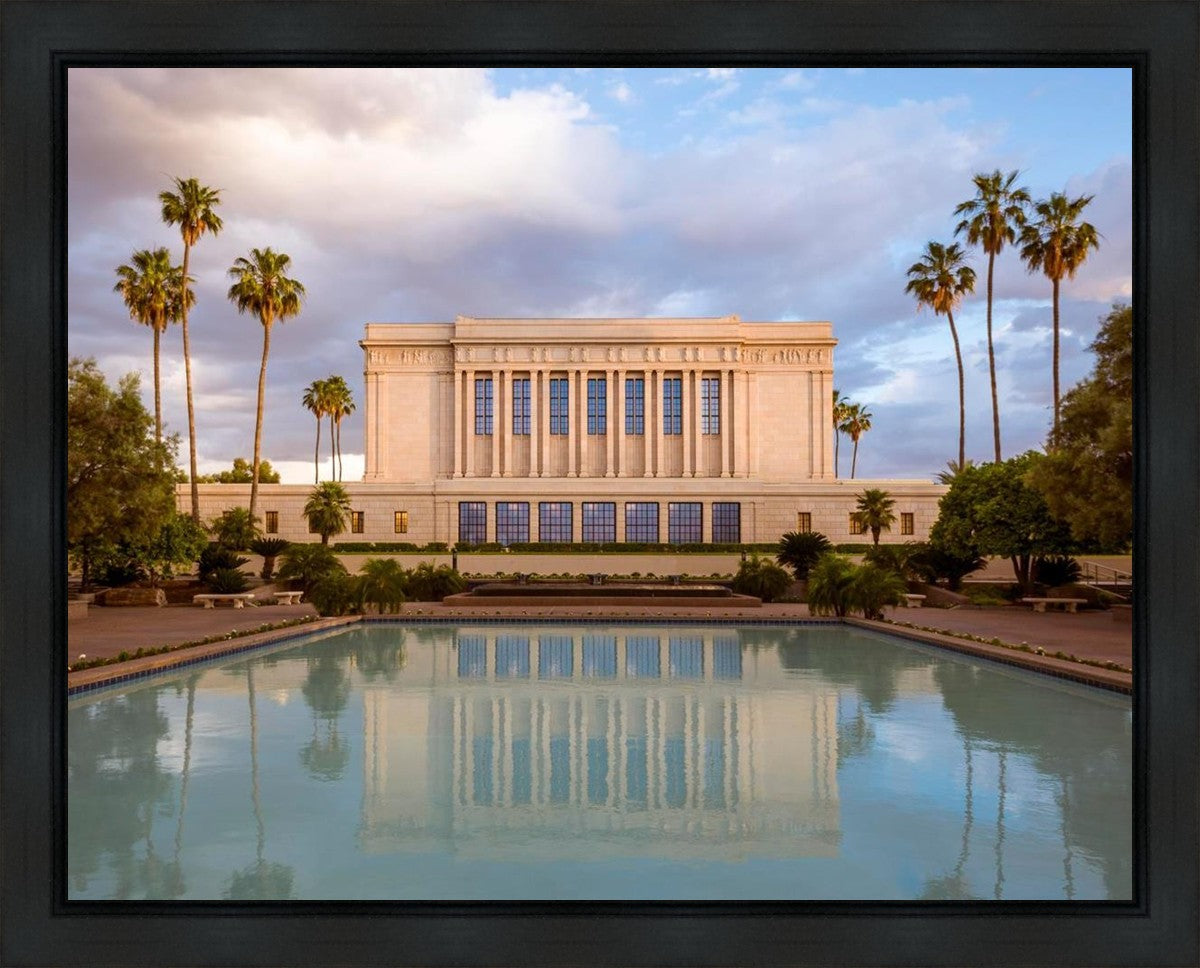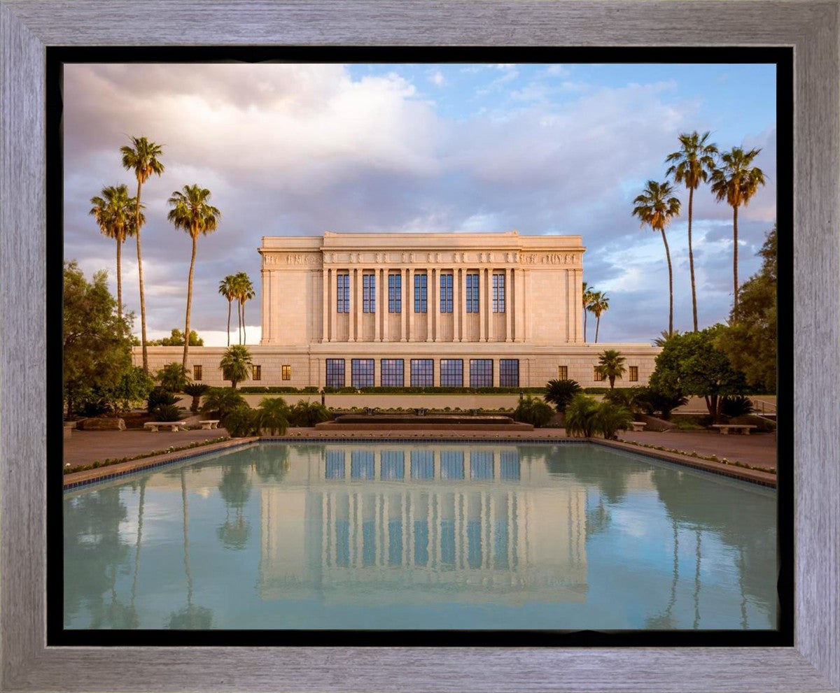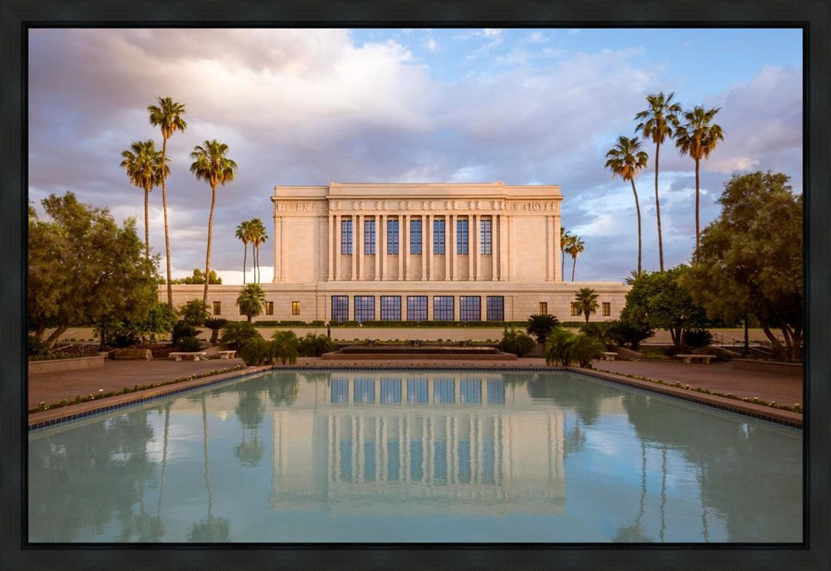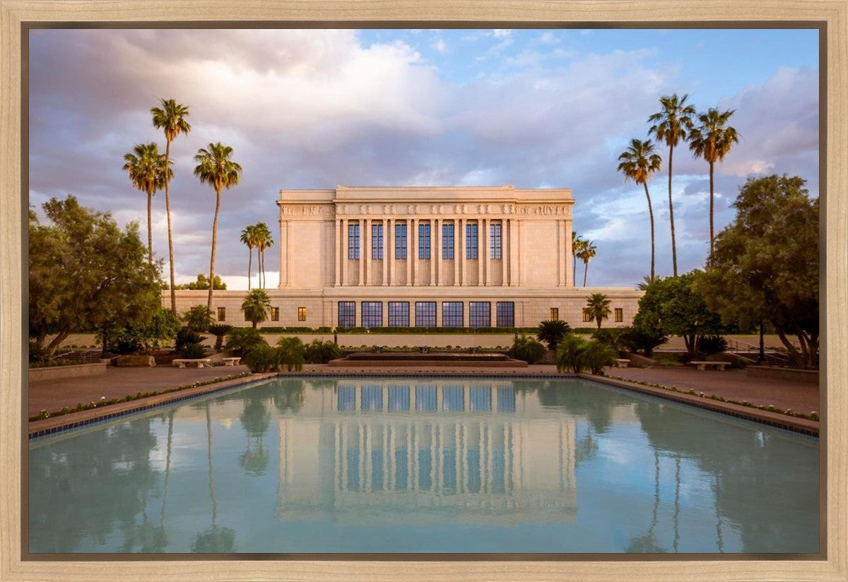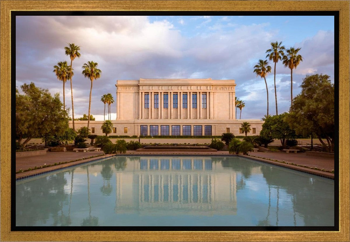 A peaceful garden view of the Mesa, Arizona temple at sunset
