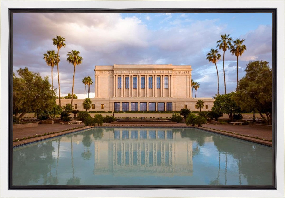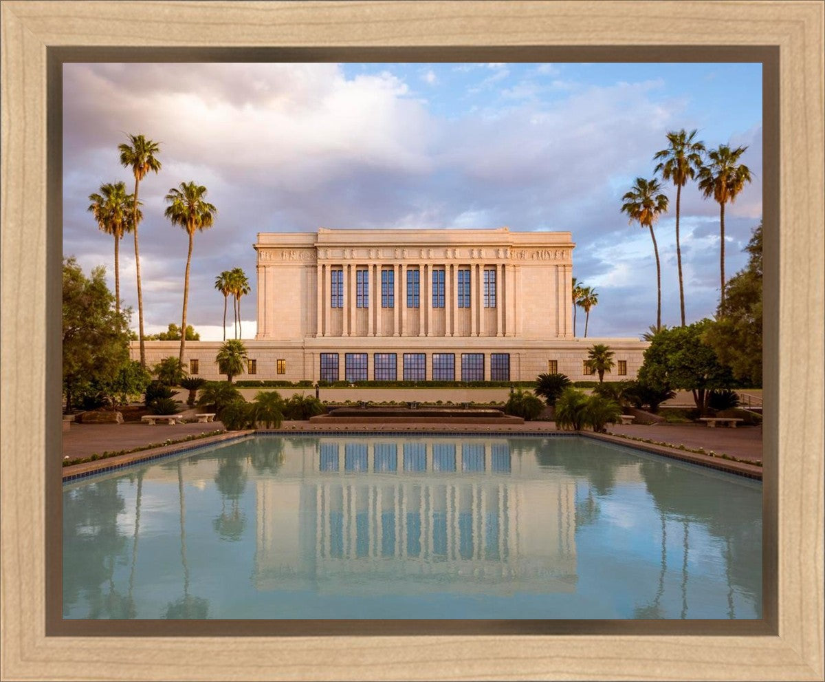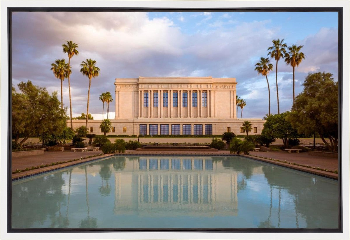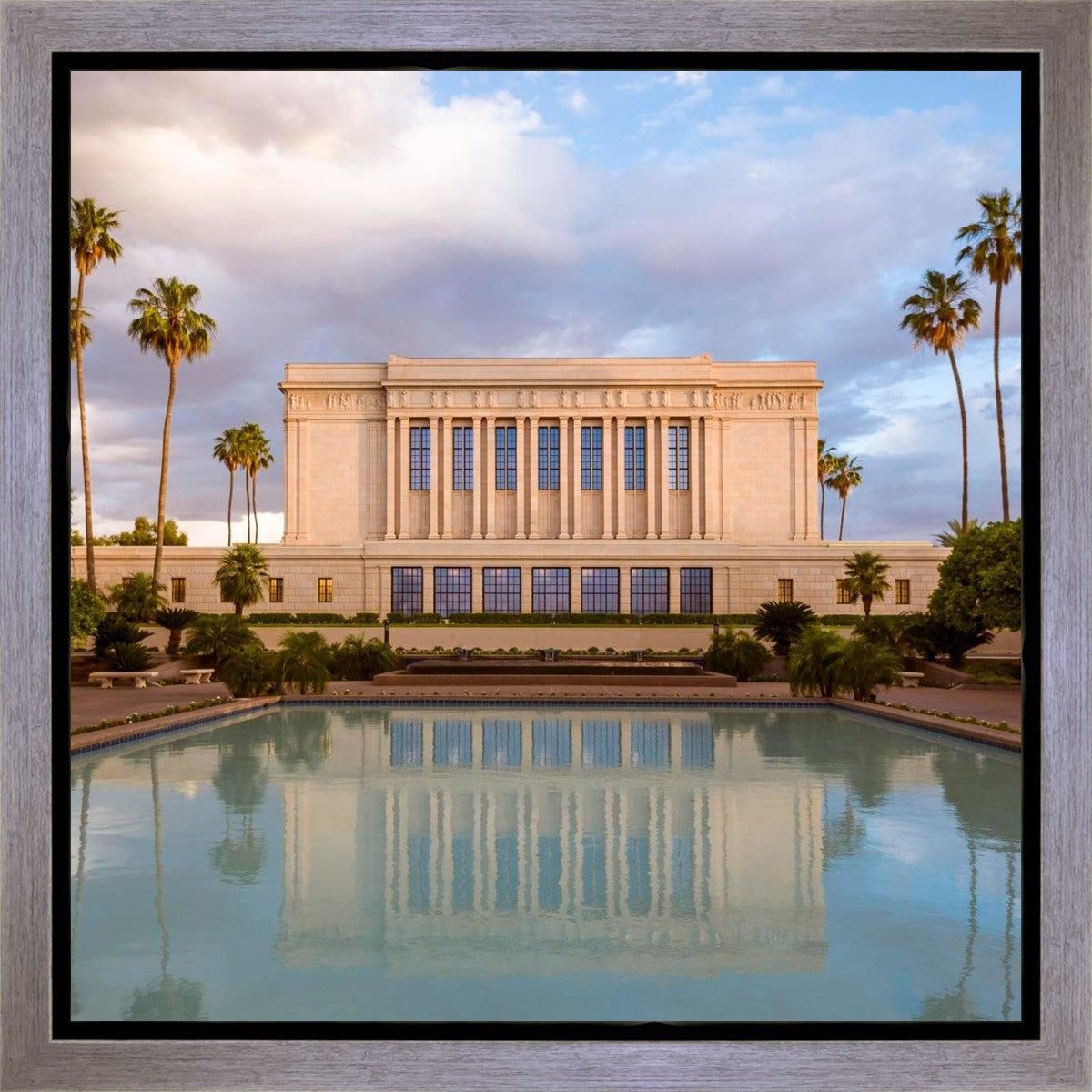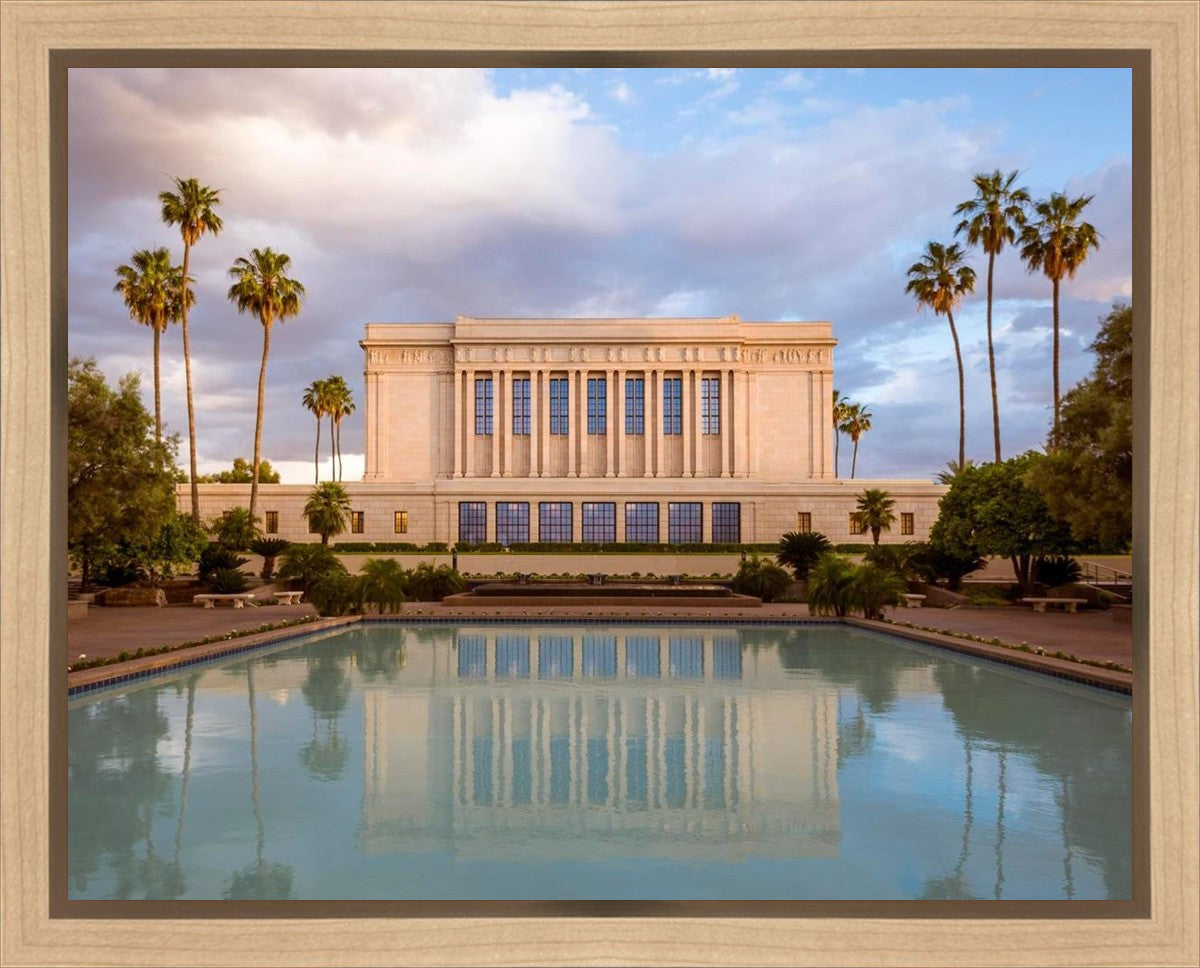 A peaceful garden view of the Mesa, Arizona temple at sunset