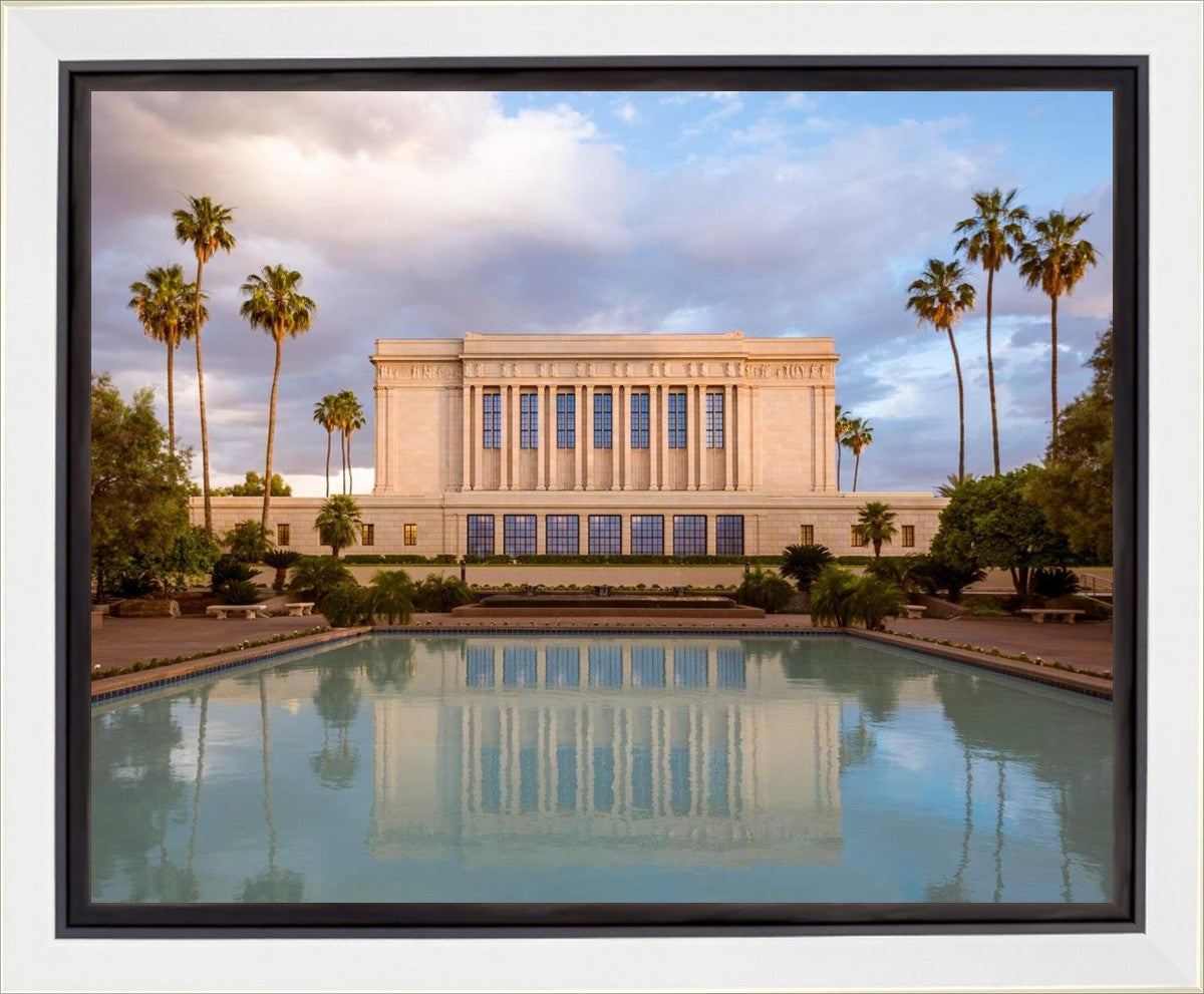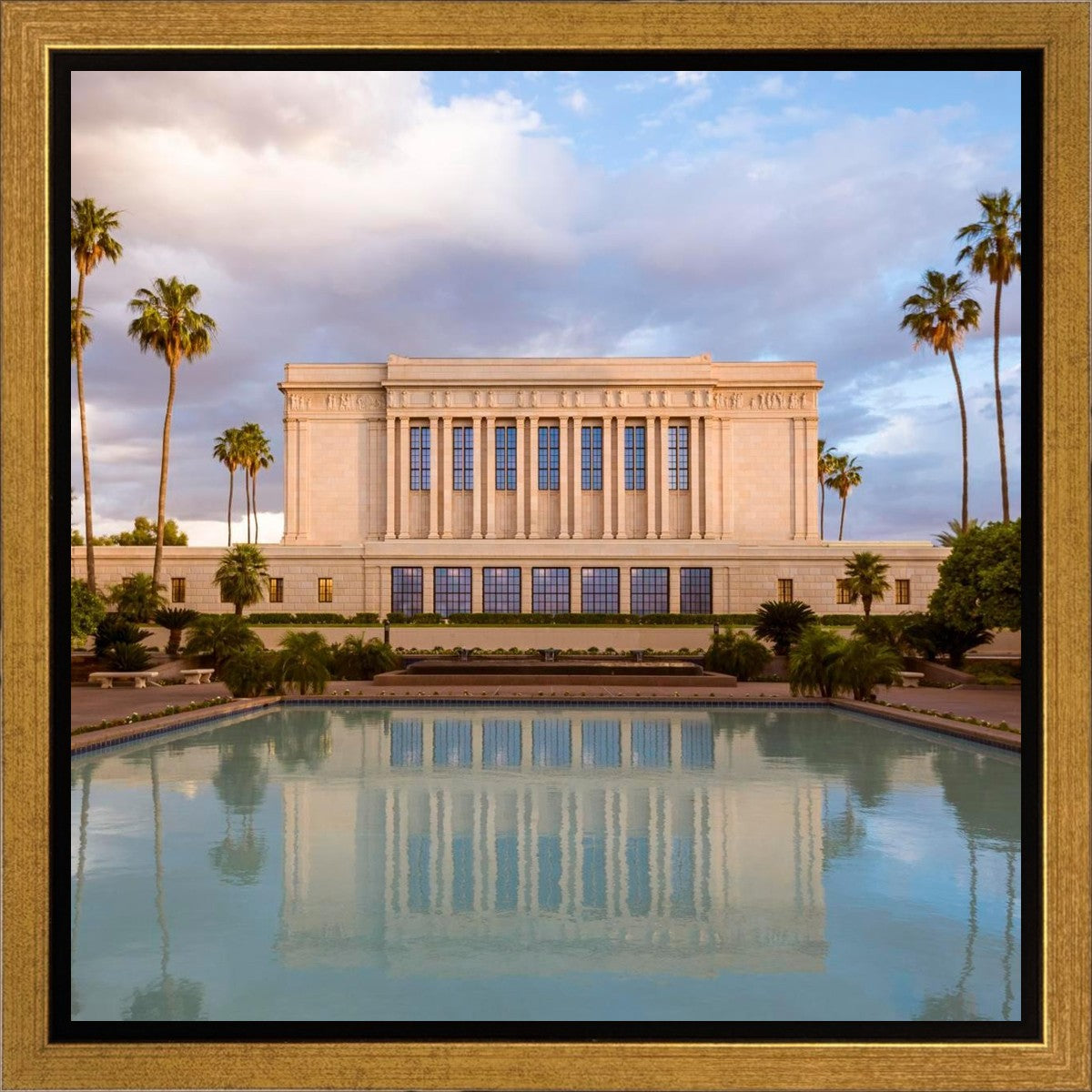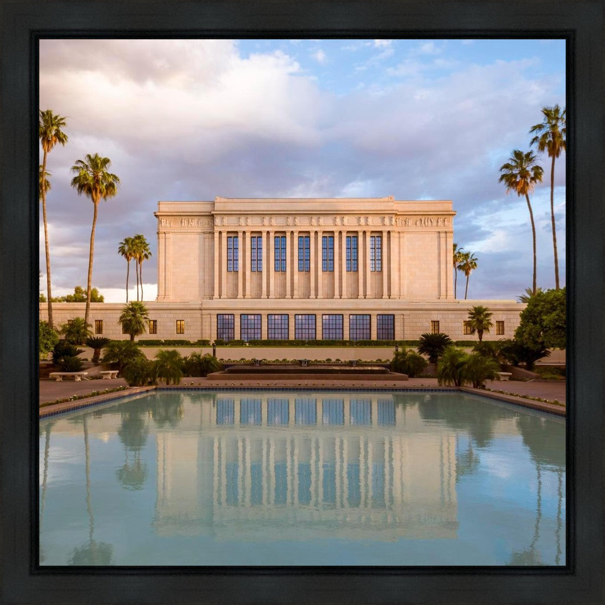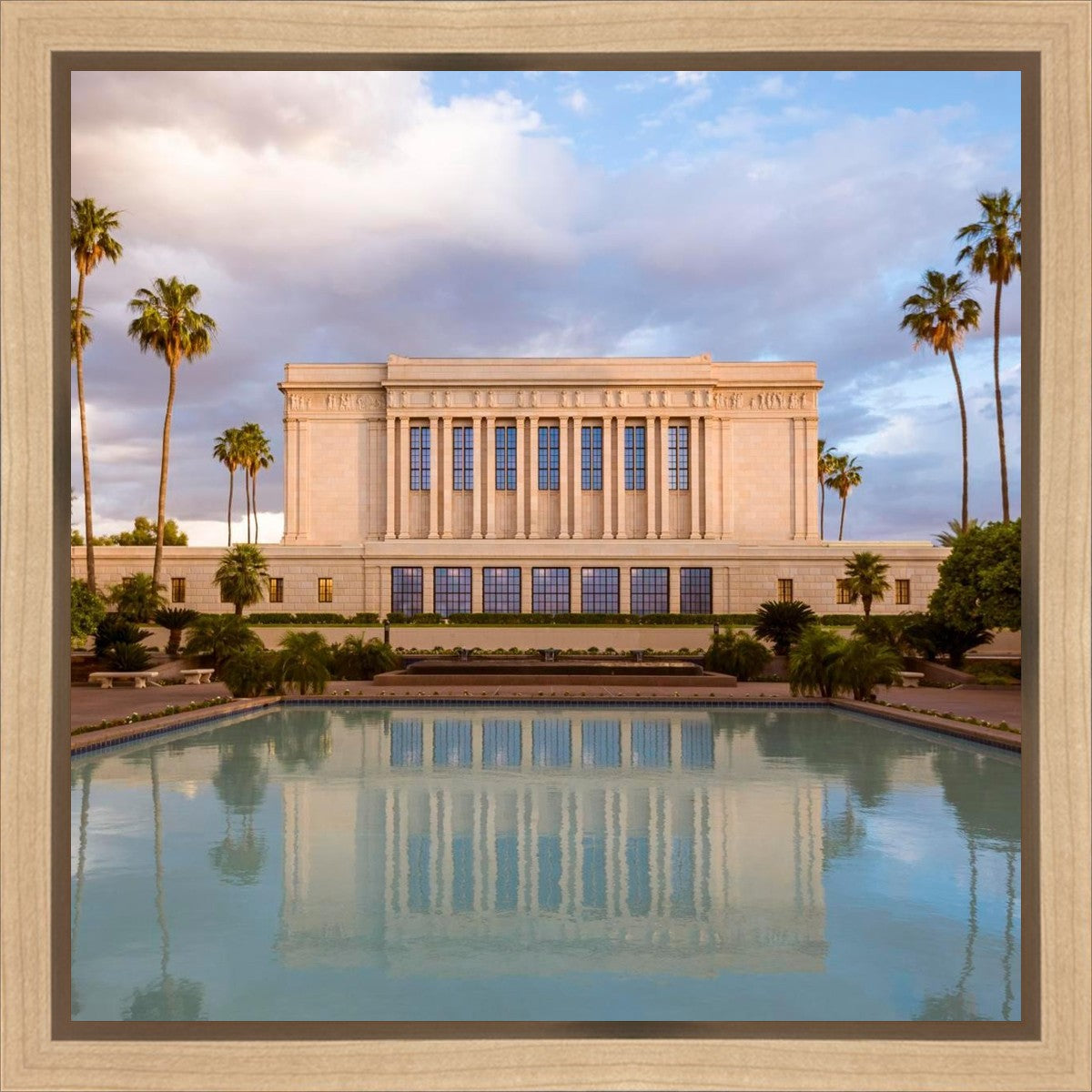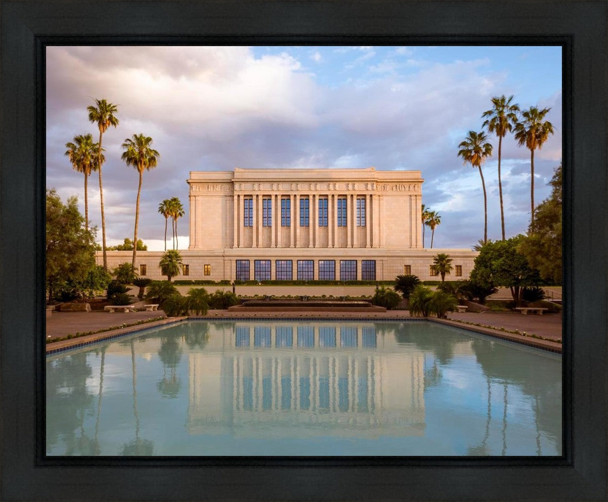 A peaceful garden view of the Mesa, Arizona temple at sunset