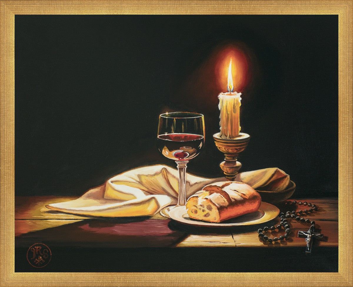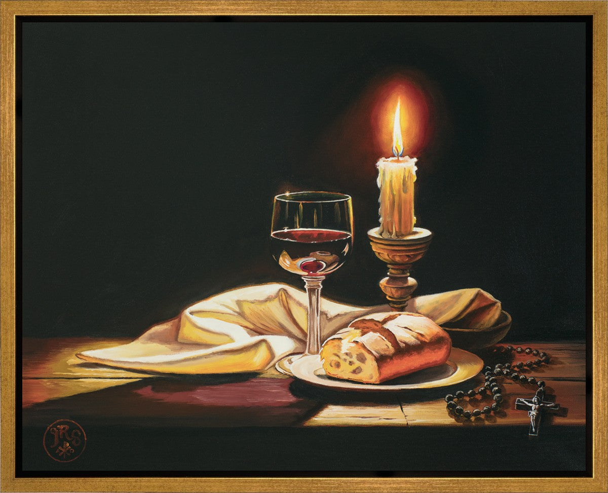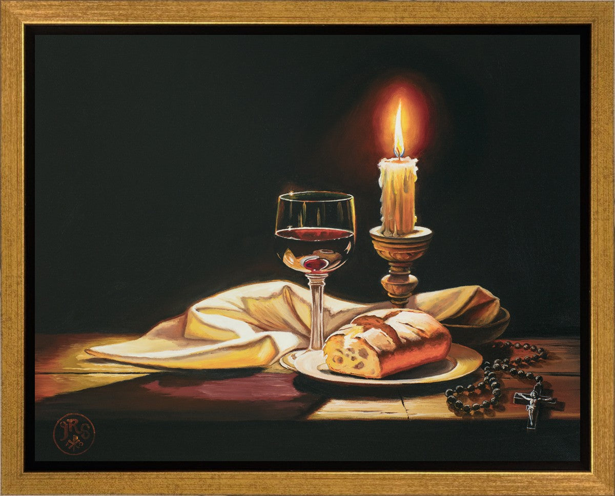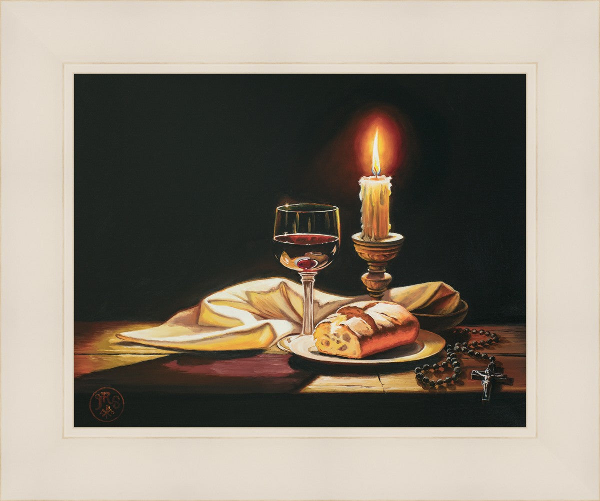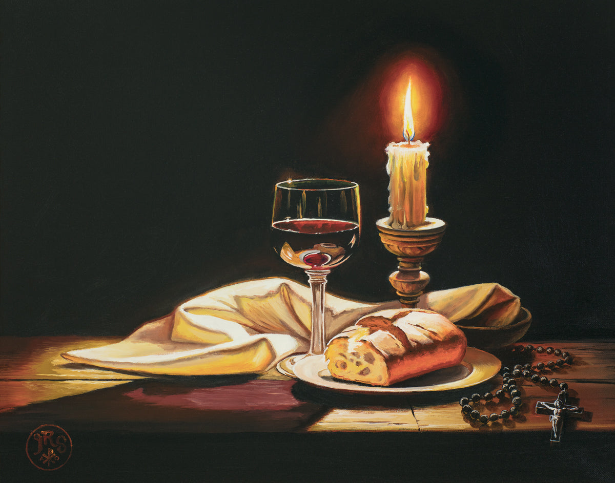 This painting features symbolic eucharistic elements bathed in candle light as a vehicle for portraying the Way, the Truth, and the Light. With a rosary laid next to the elements, this piece also aims to remind us how we all have direct access via prayer to daily interaction with our Lord and Savior.