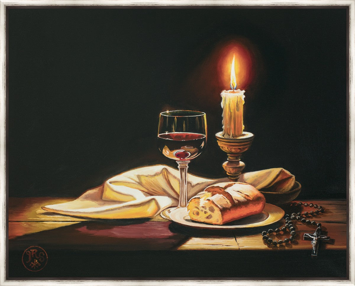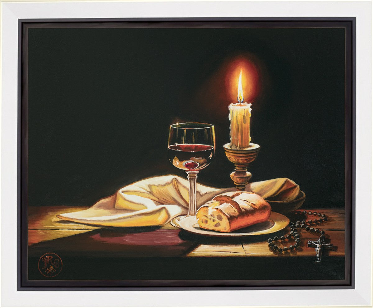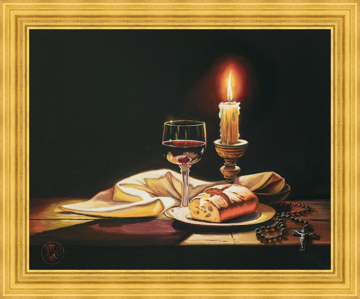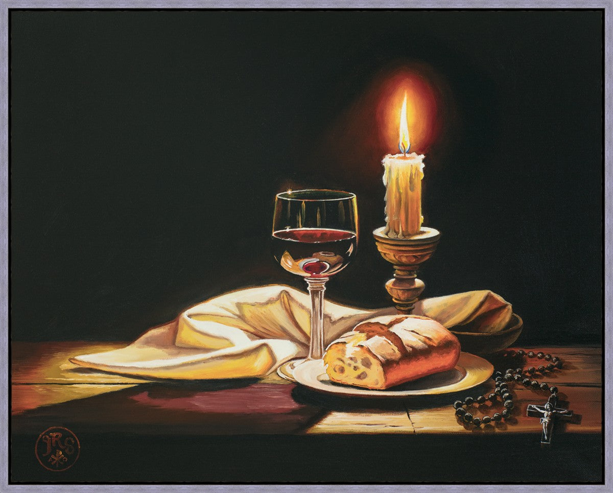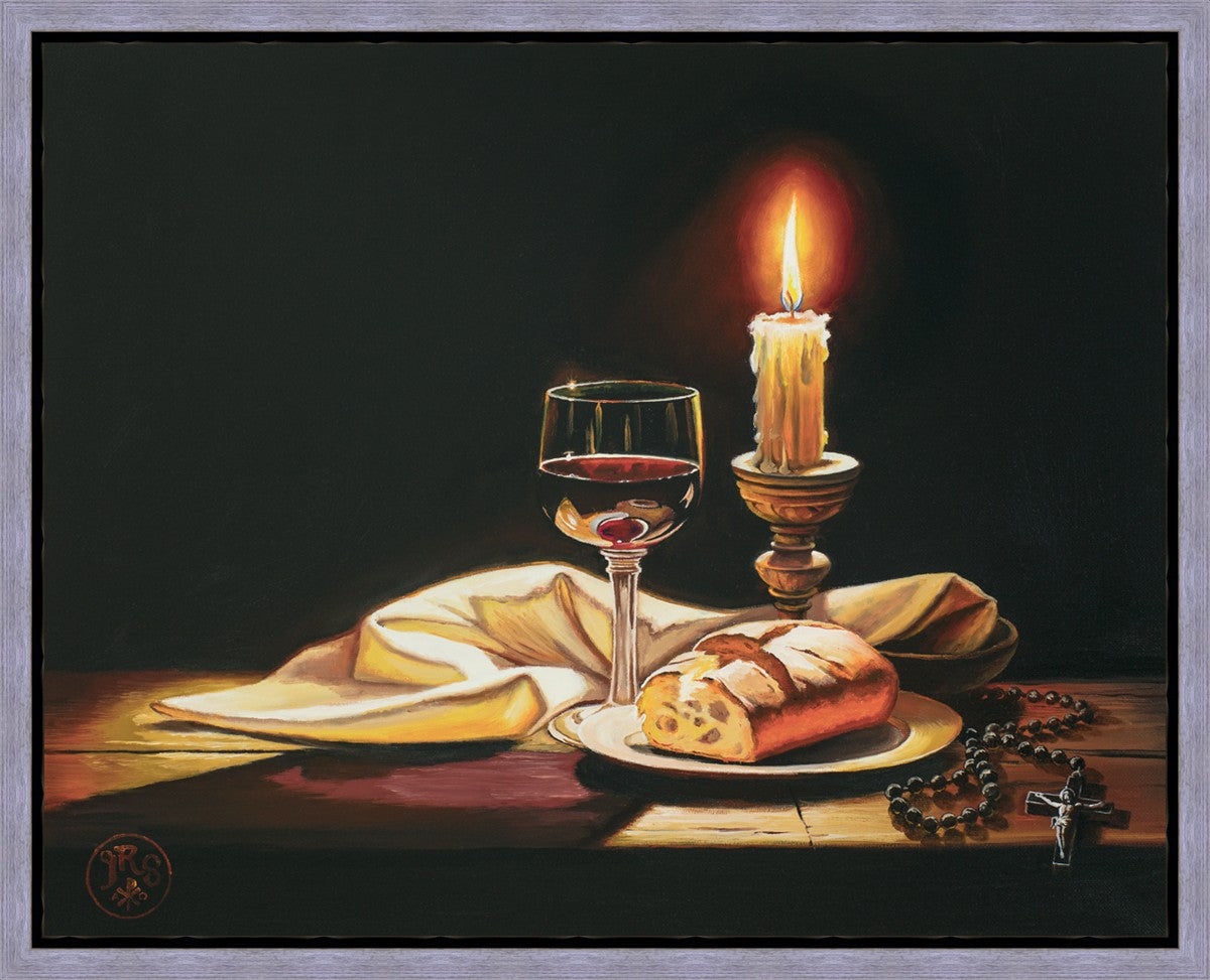 This painting features symbolic eucharistic elements bathed in candle light as a vehicle for portraying the Way, the Truth, and the Light. With a rosary laid next to the elements, this piece also aims to remind us how we all have direct access via prayer to daily interaction with our Lord and Savior.