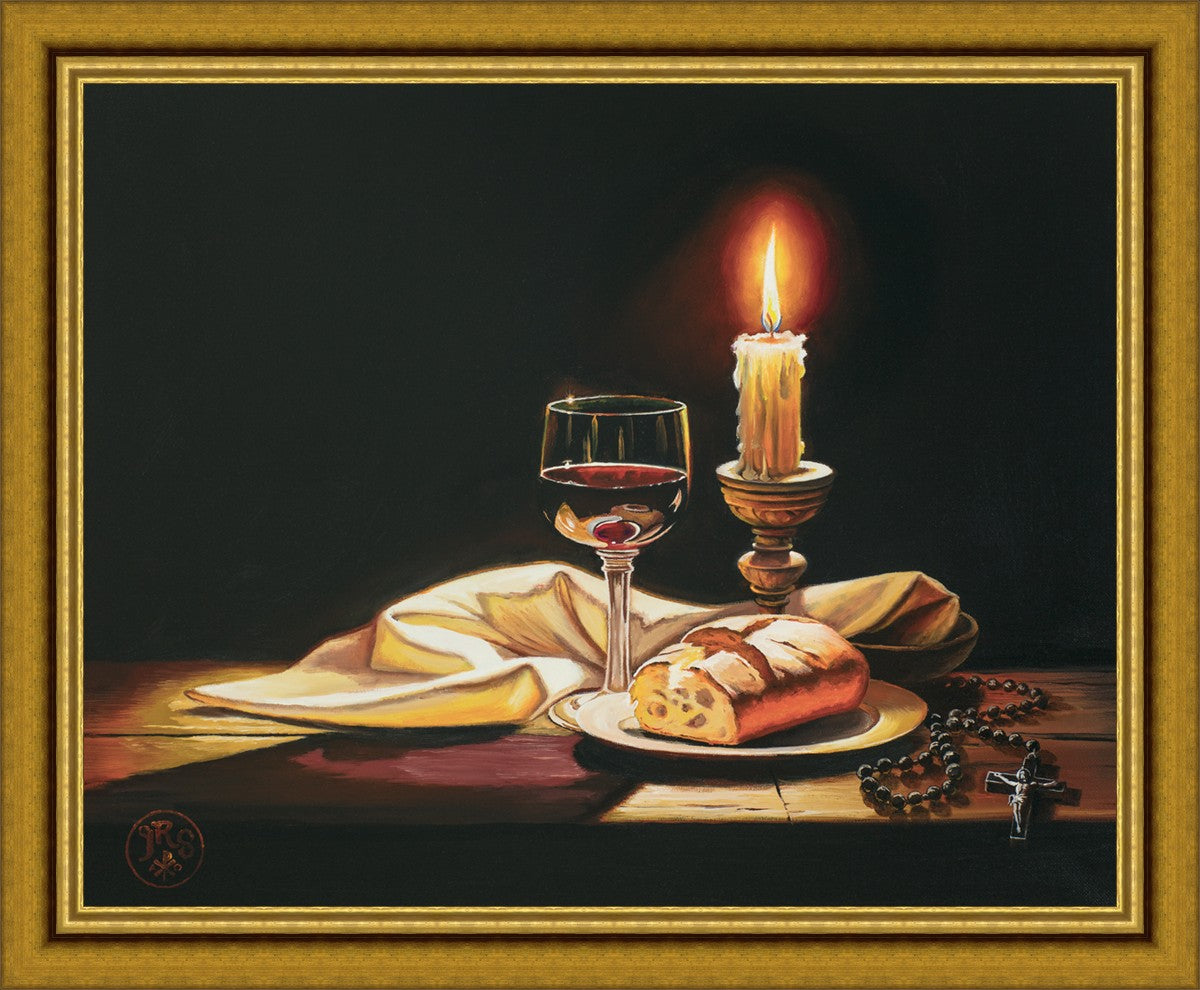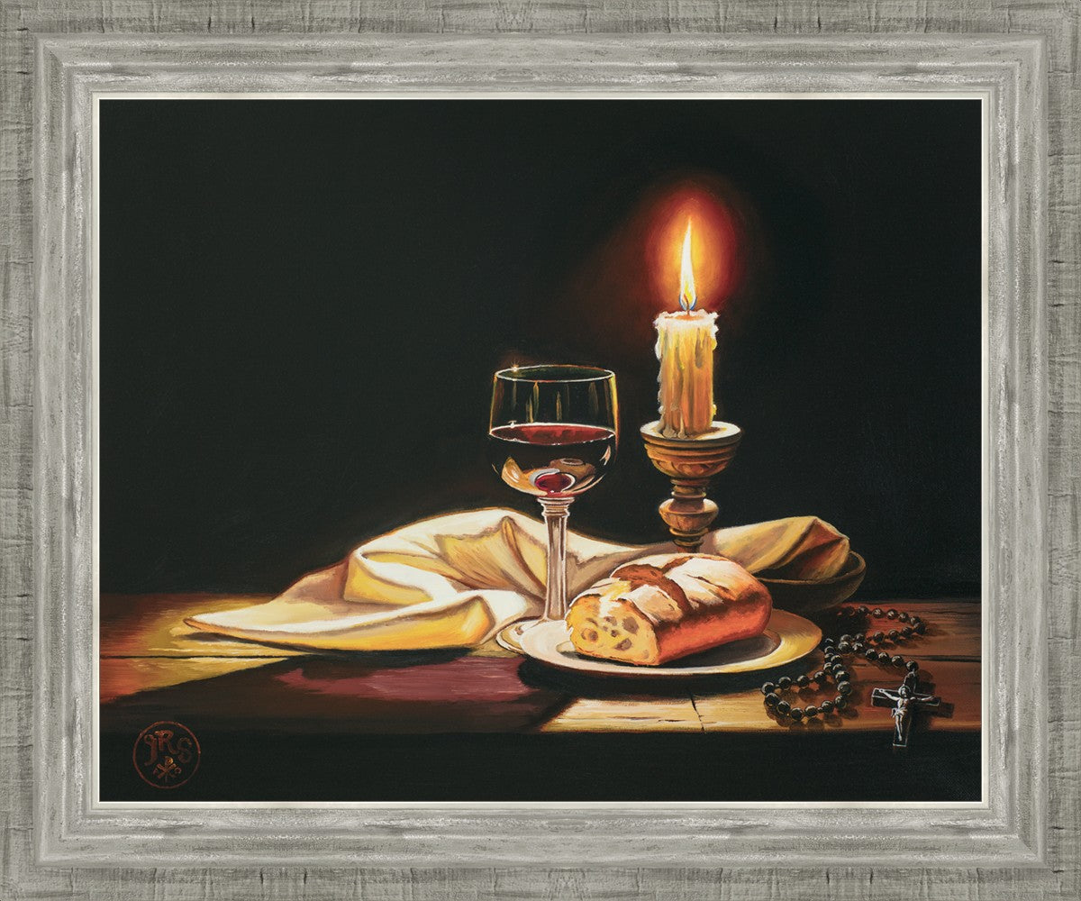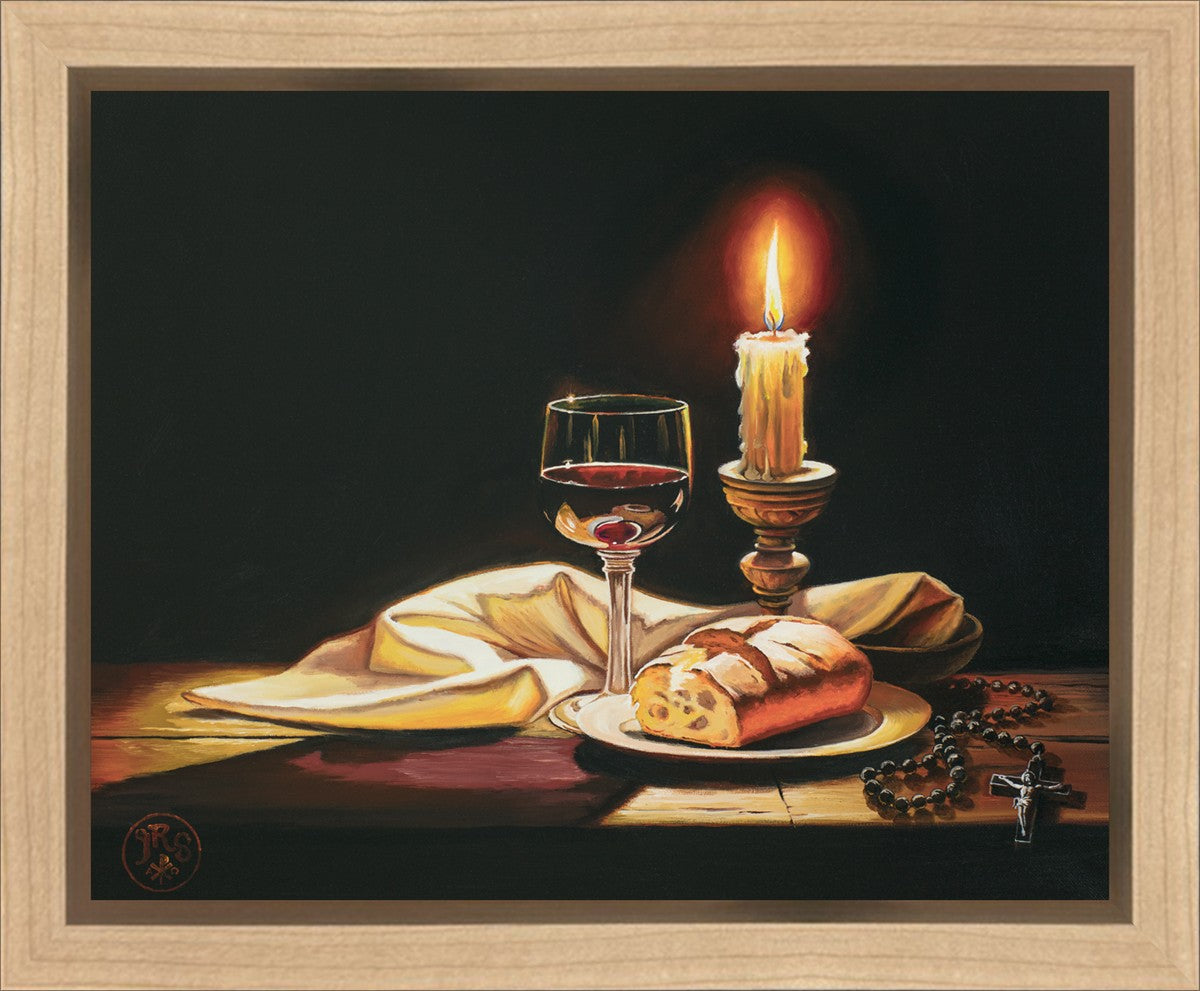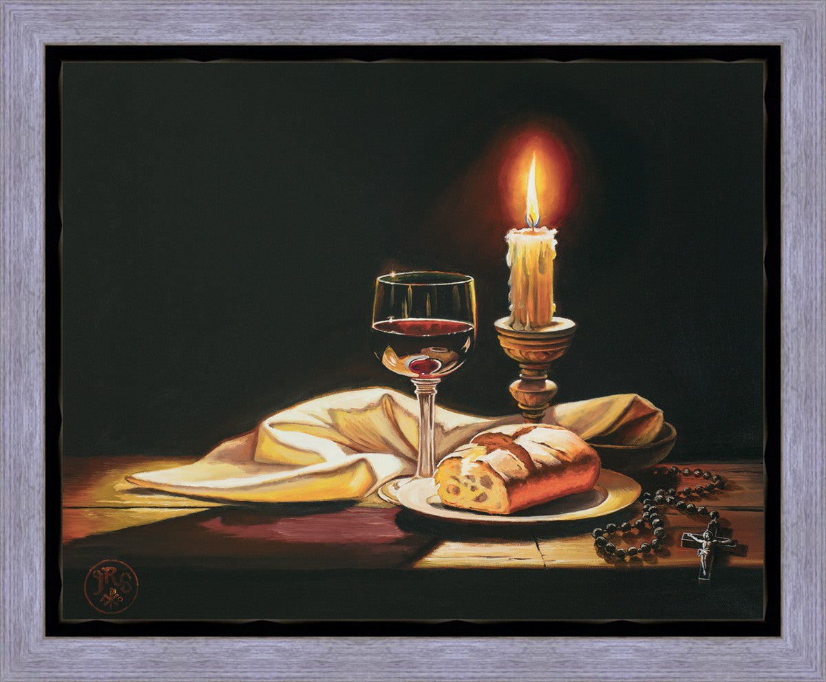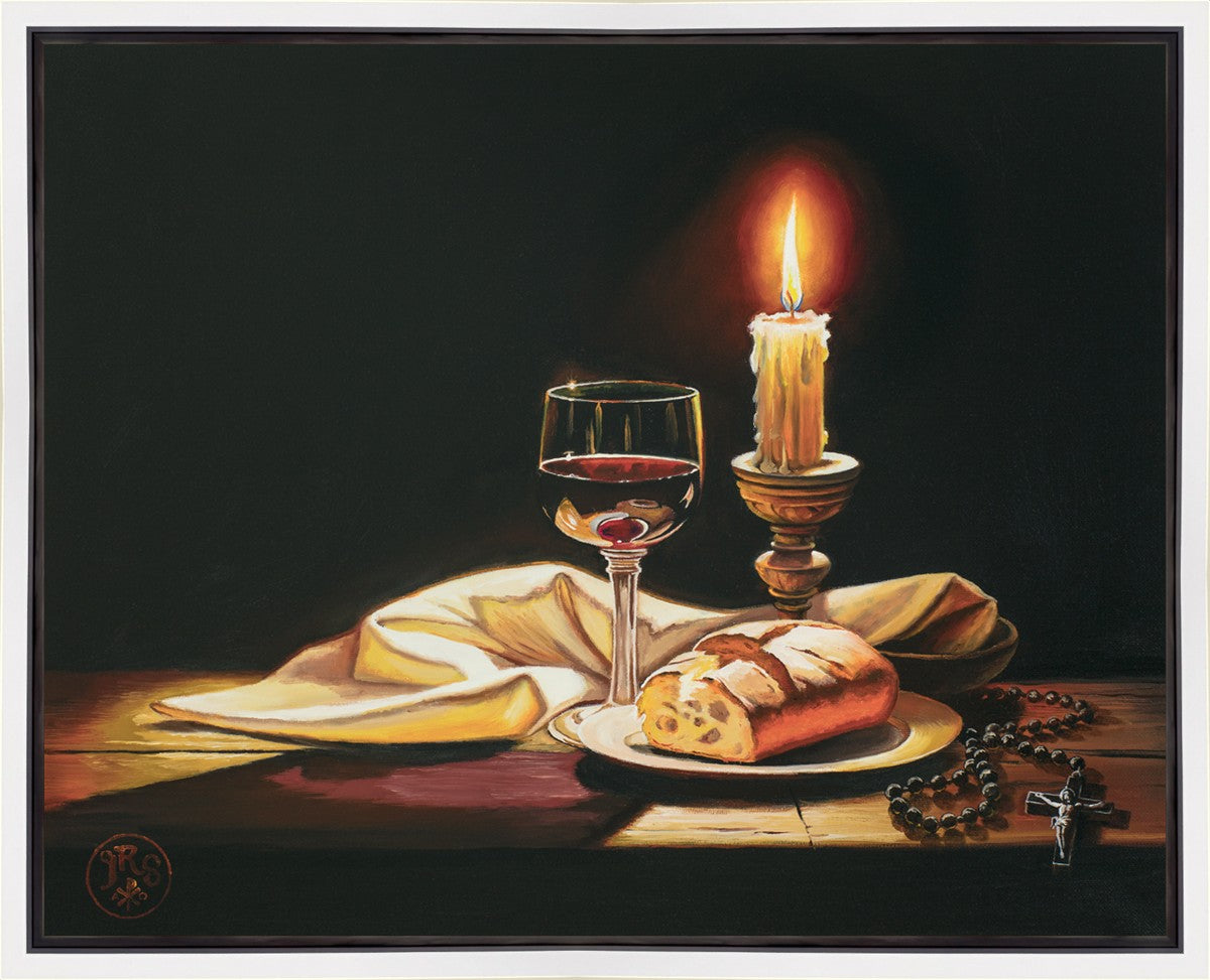 This painting features symbolic eucharistic elements bathed in candle light as a vehicle for portraying the Way, the Truth, and the Light. With a rosary laid next to the elements, this piece also aims to remind us how we all have direct access via prayer to daily interaction with our Lord and Savior.