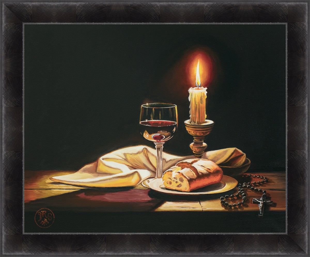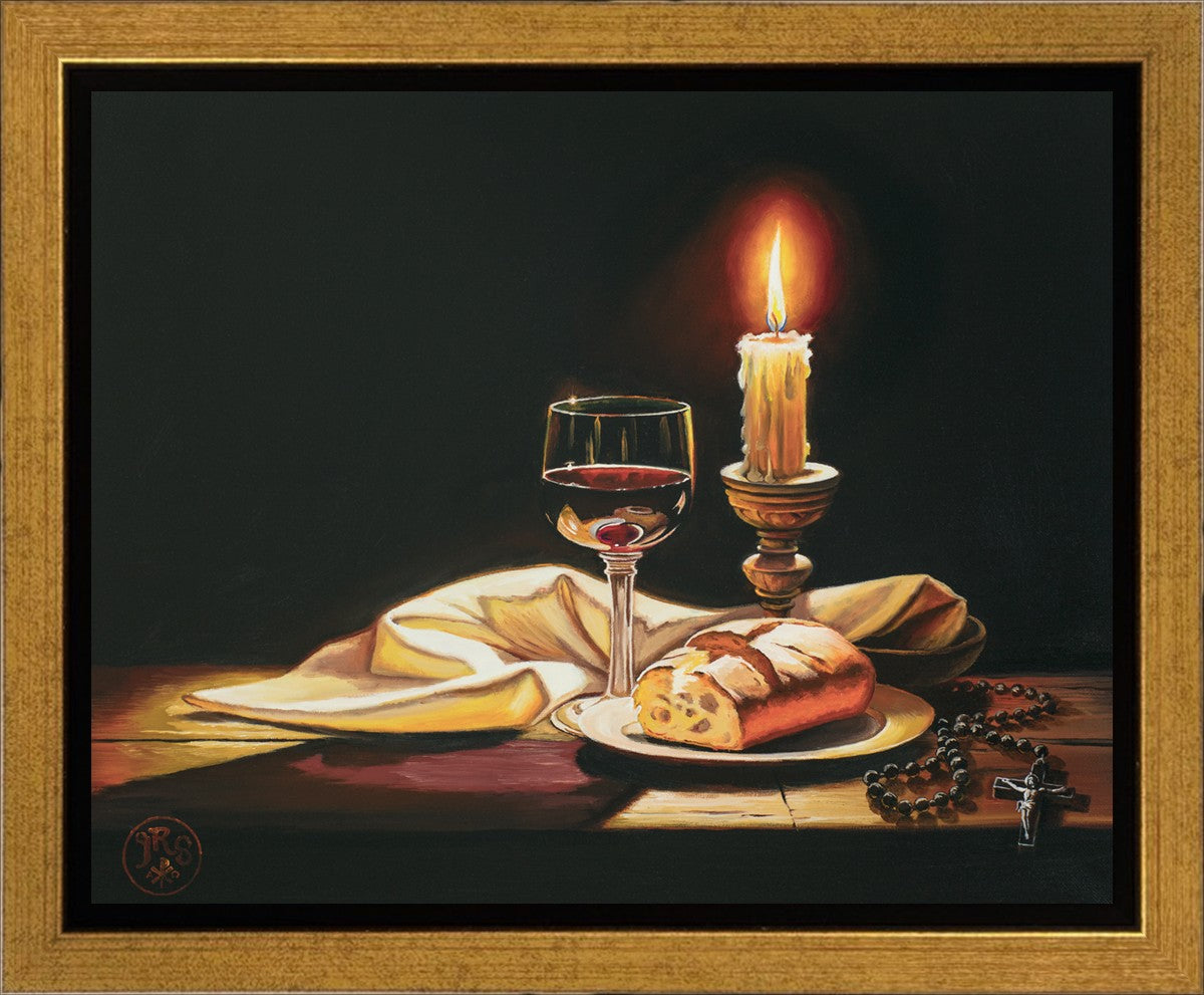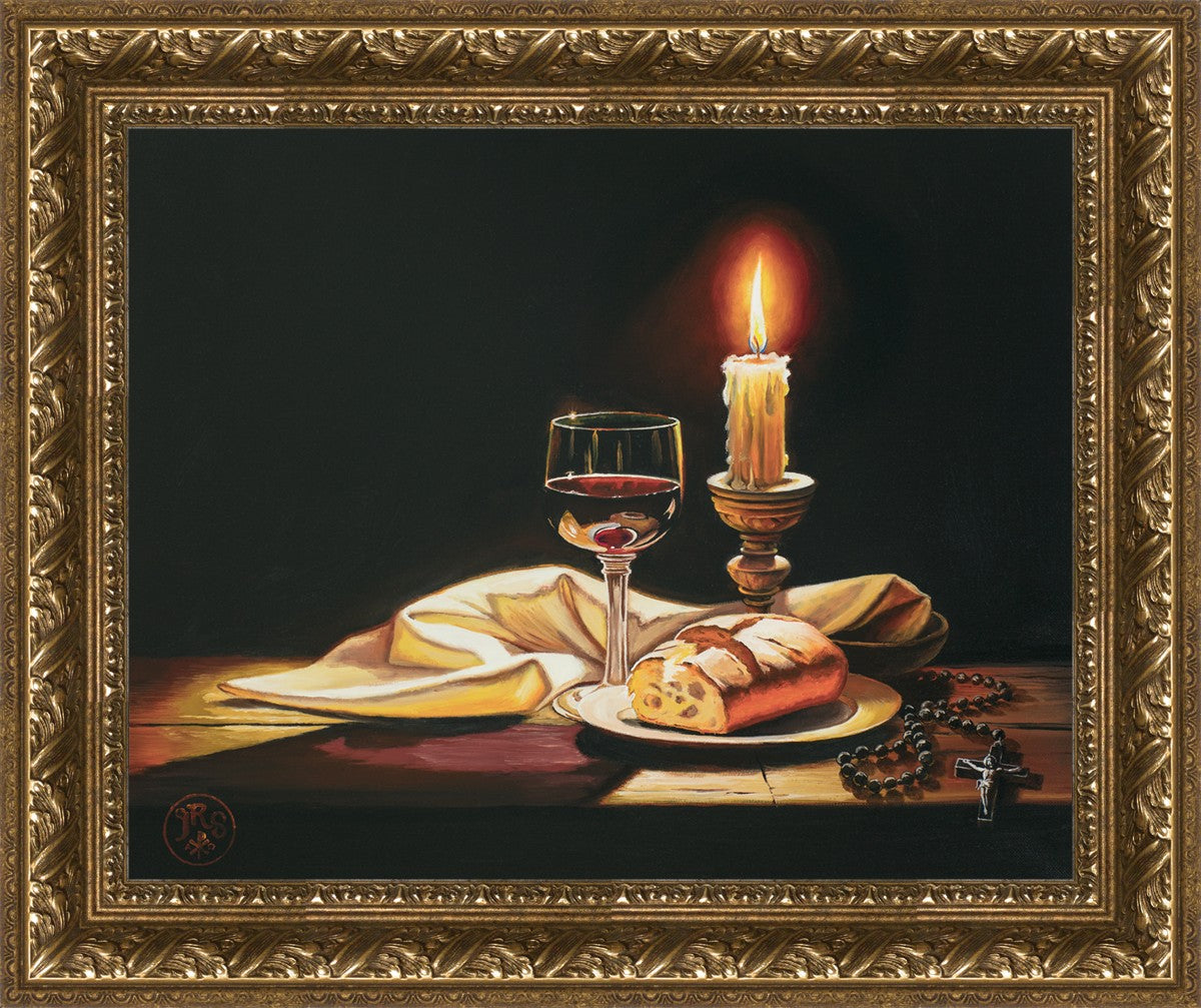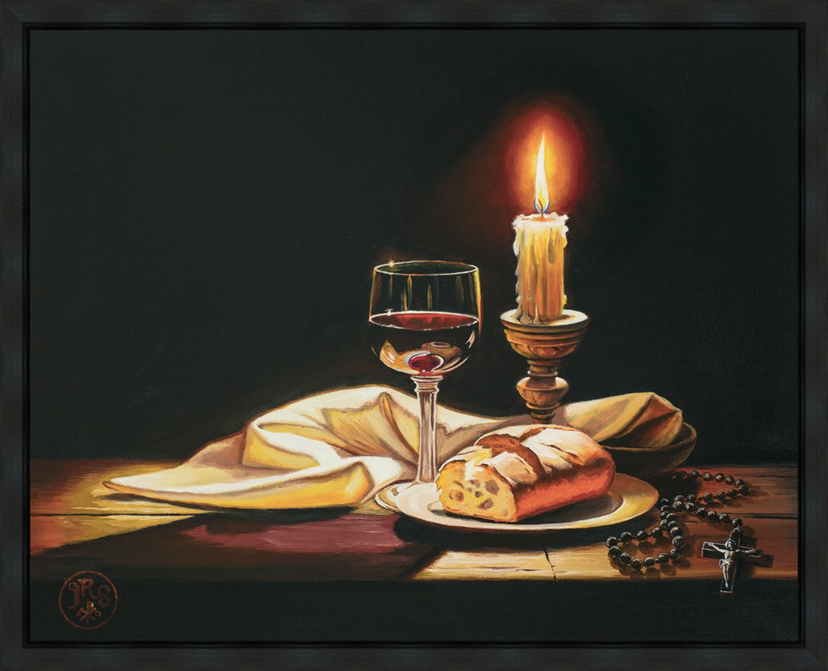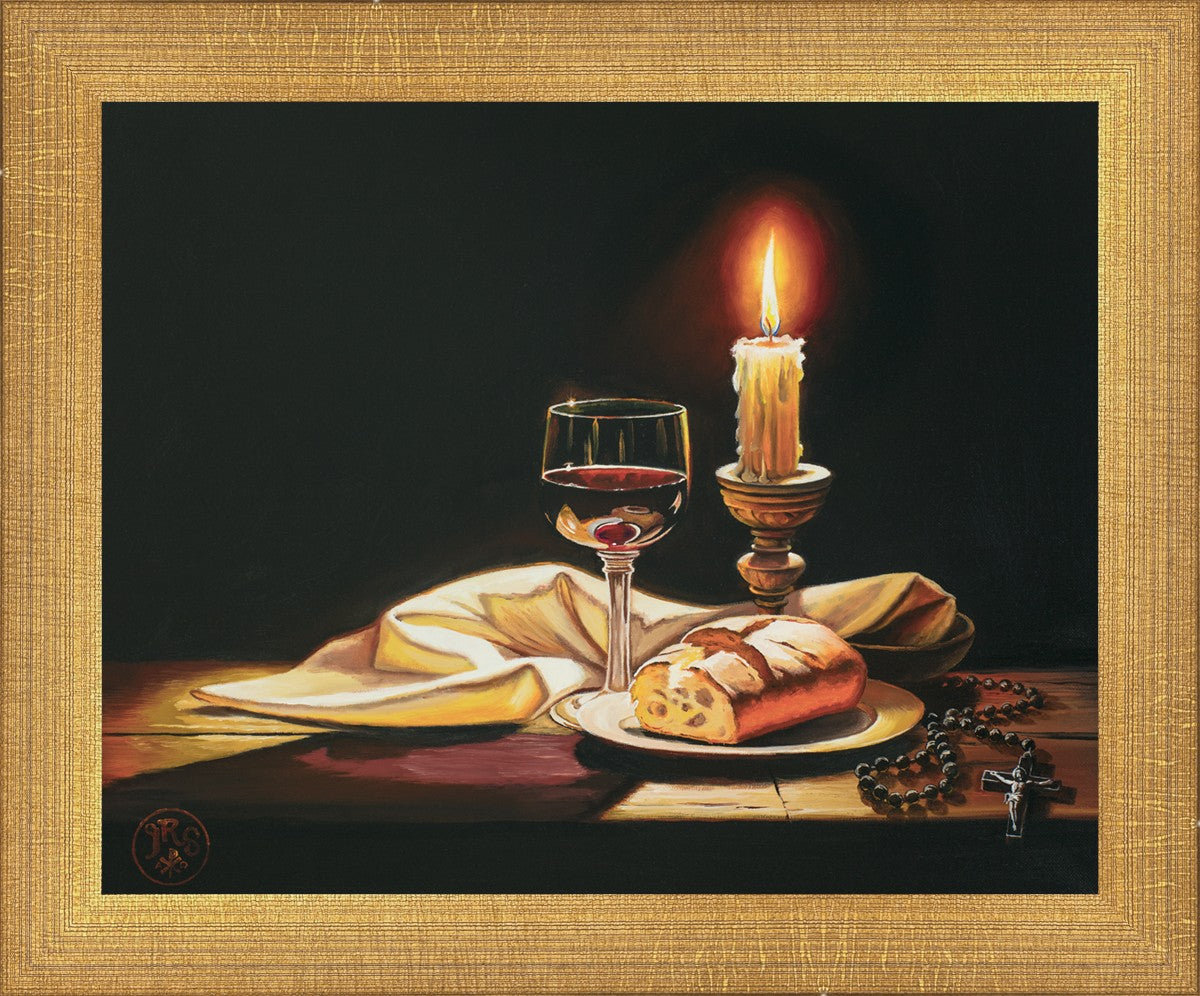 This painting features symbolic eucharistic elements bathed in candle light as a vehicle for portraying the Way, the Truth, and the Light. With a rosary laid next to the elements, this piece also aims to remind us how we all have direct access via prayer to daily interaction with our Lord and Savior.