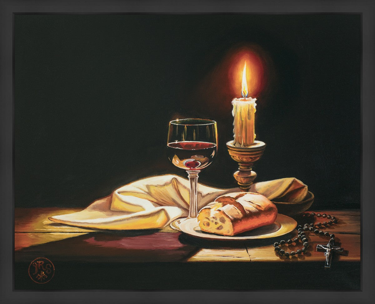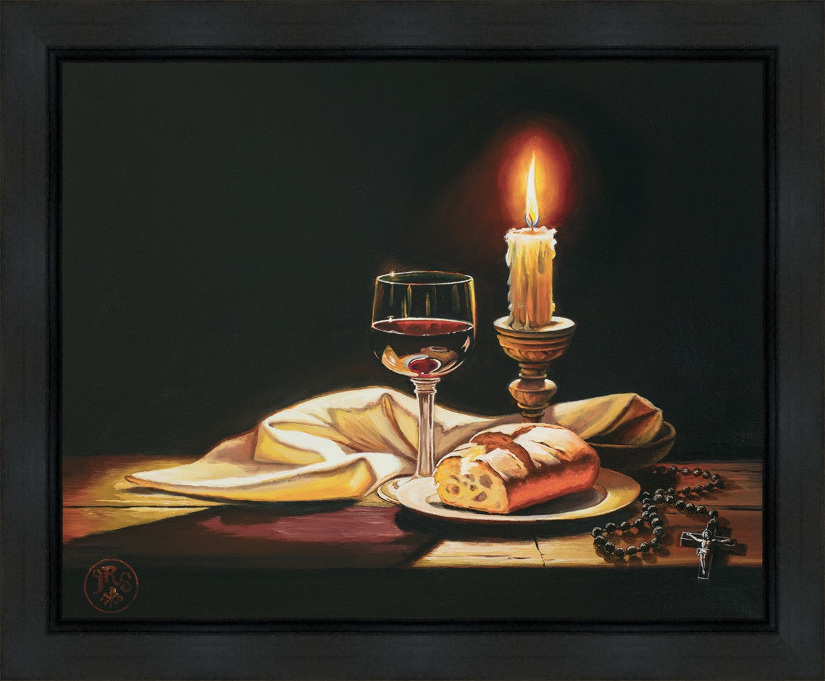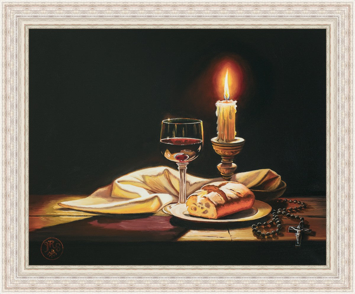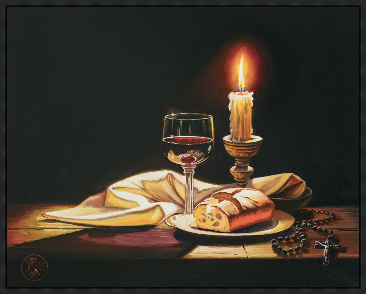This painting features symbolic eucharistic elements bathed in candle light as a vehicle for portraying the Way, the Truth, and the Light. With a rosary laid next to the elements, this piece also aims to remind us how we all have direct access via prayer to daily interaction with our Lord and Savior.