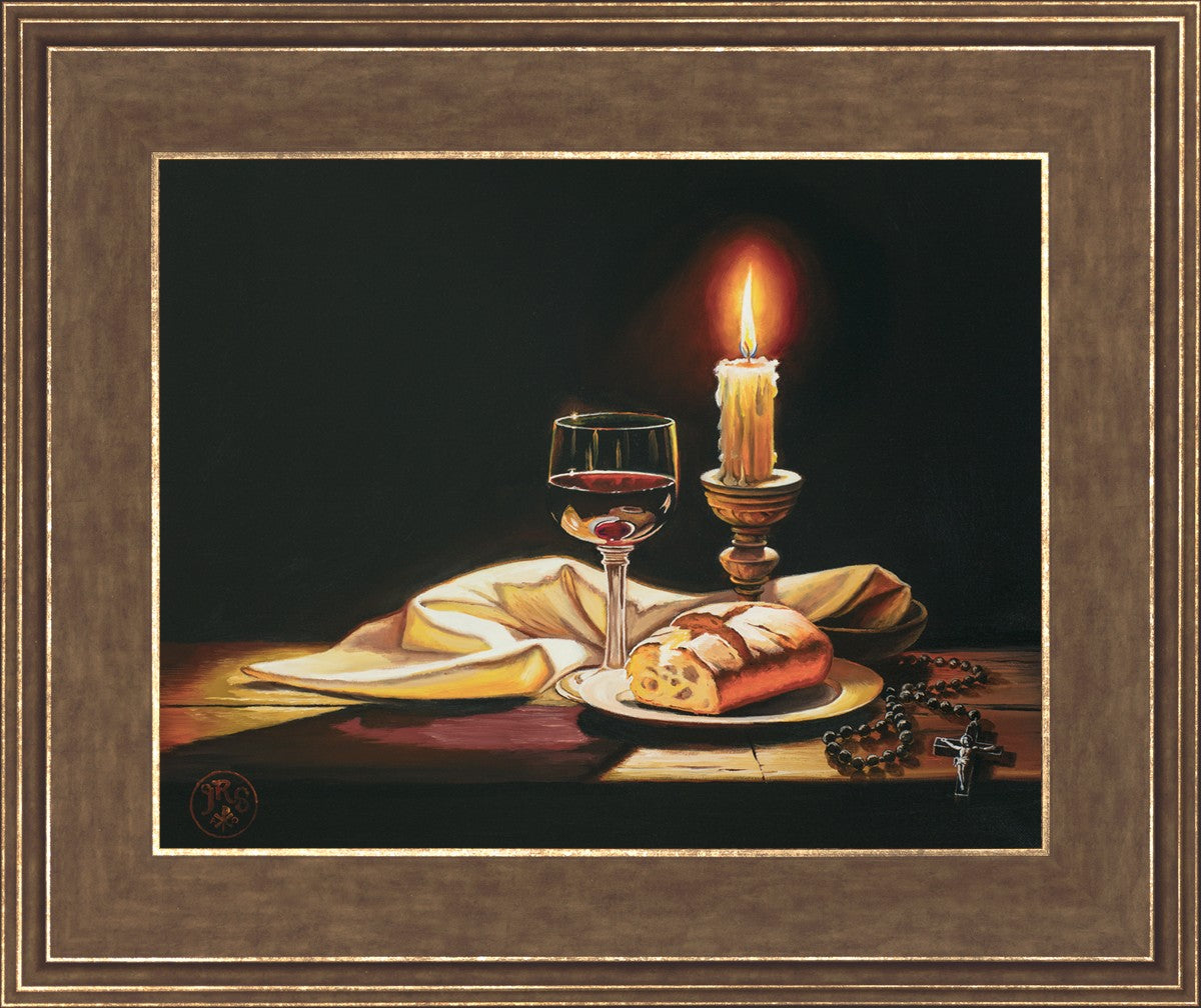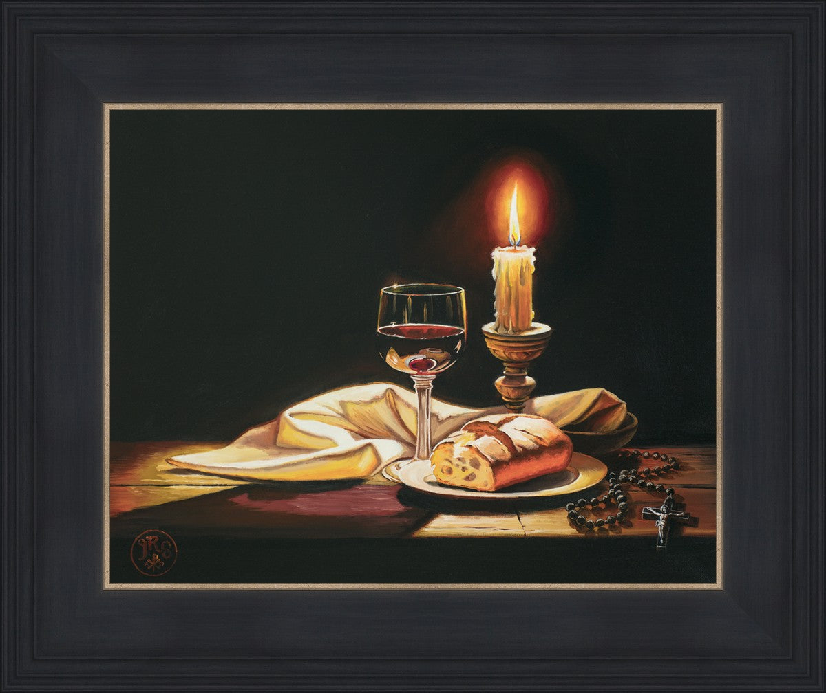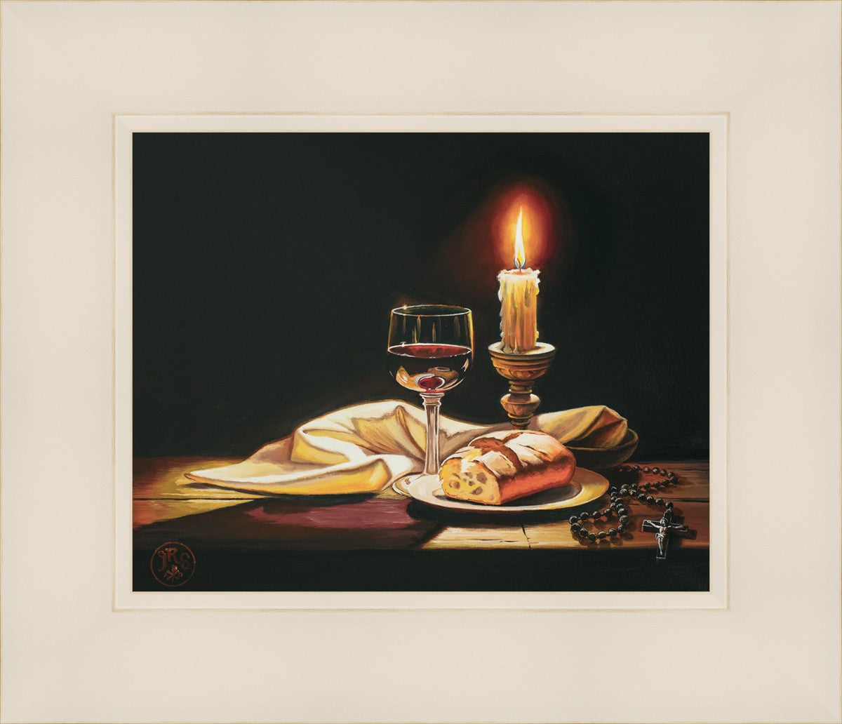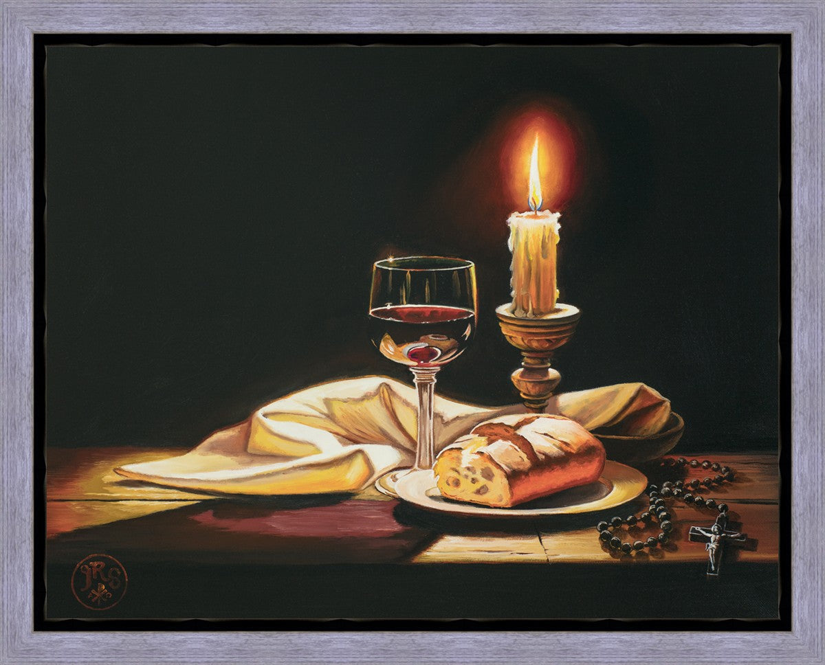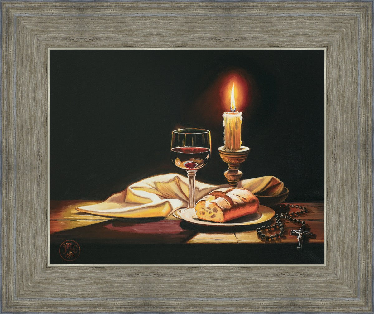 This painting features symbolic eucharistic elements bathed in candle light as a vehicle for portraying the Way, the Truth, and the Light. With a rosary laid next to the elements, this piece also aims to remind us how we all have direct access via prayer to daily interaction with our Lord and Savior.