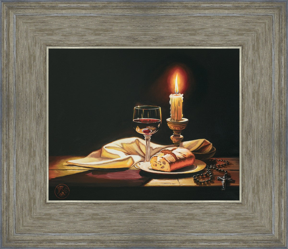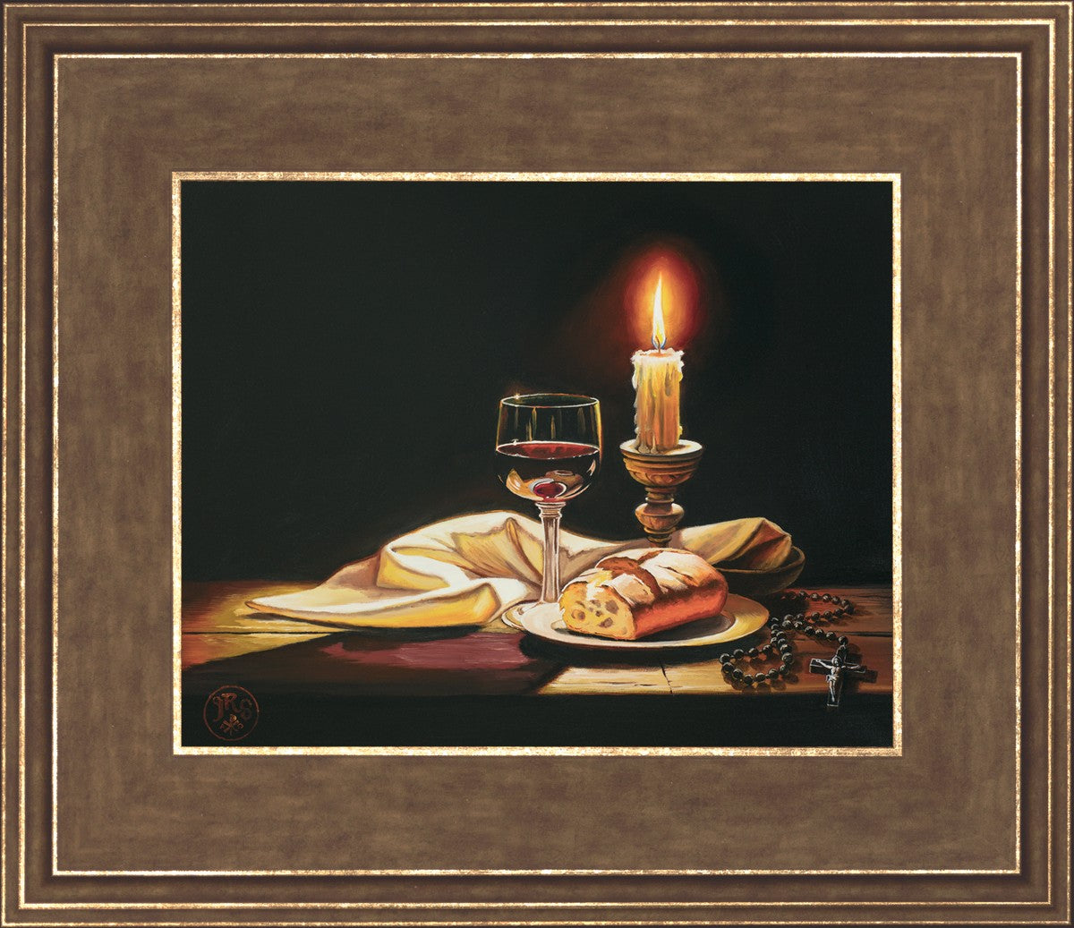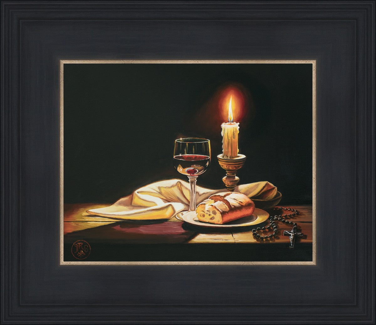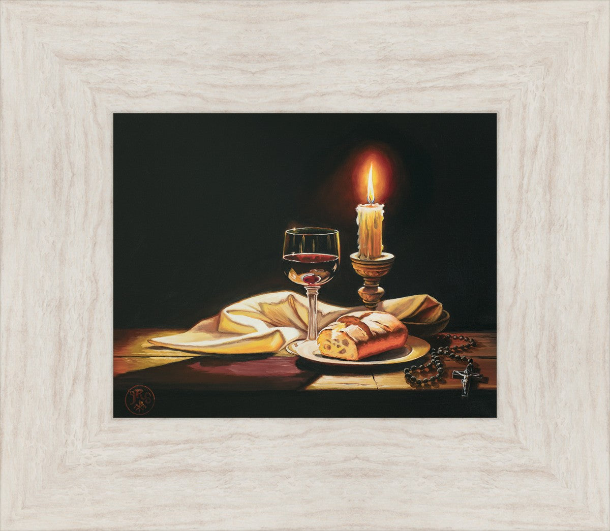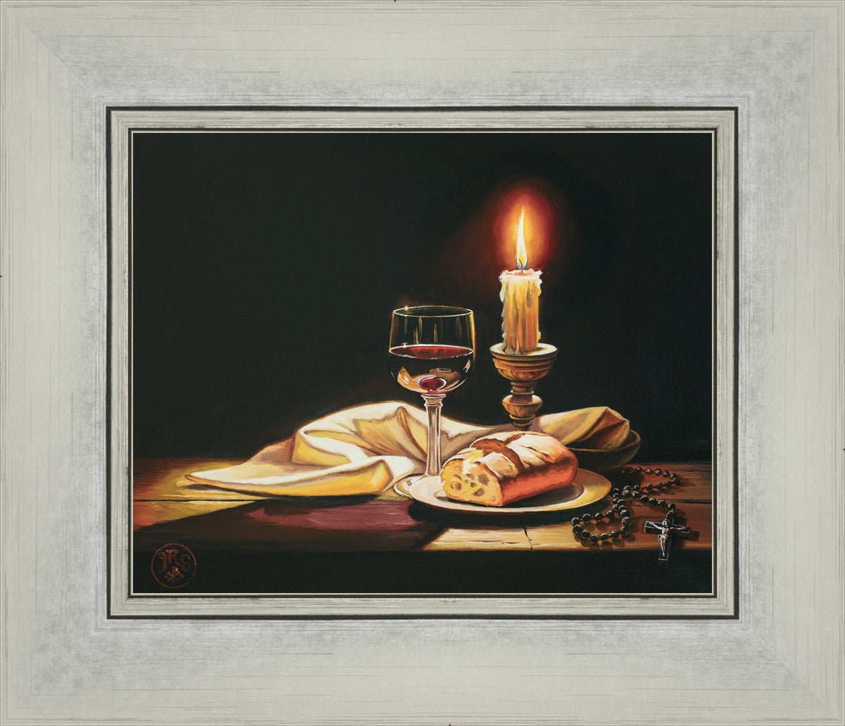 This painting features symbolic eucharistic elements bathed in candle light as a vehicle for portraying the Way, the Truth, and the Light. With a rosary laid next to the elements, this piece also aims to remind us how we all have direct access via prayer to daily interaction with our Lord and Savior.
