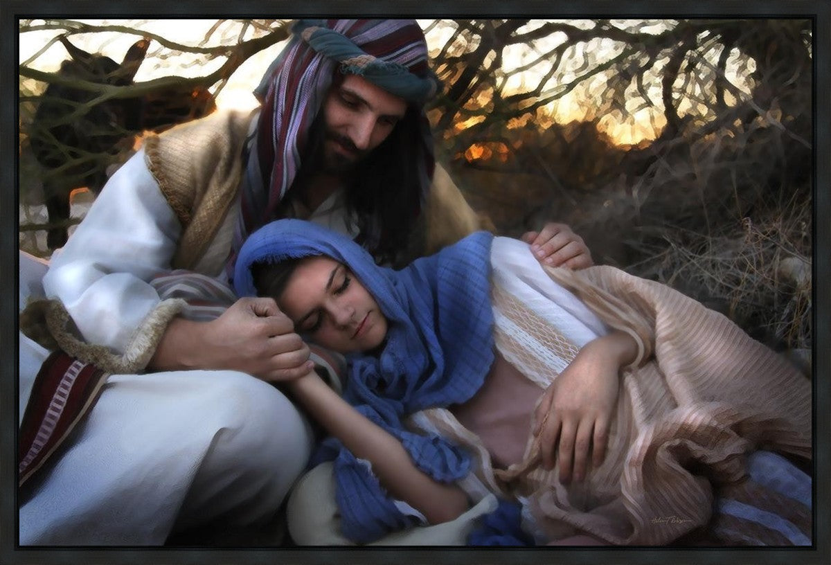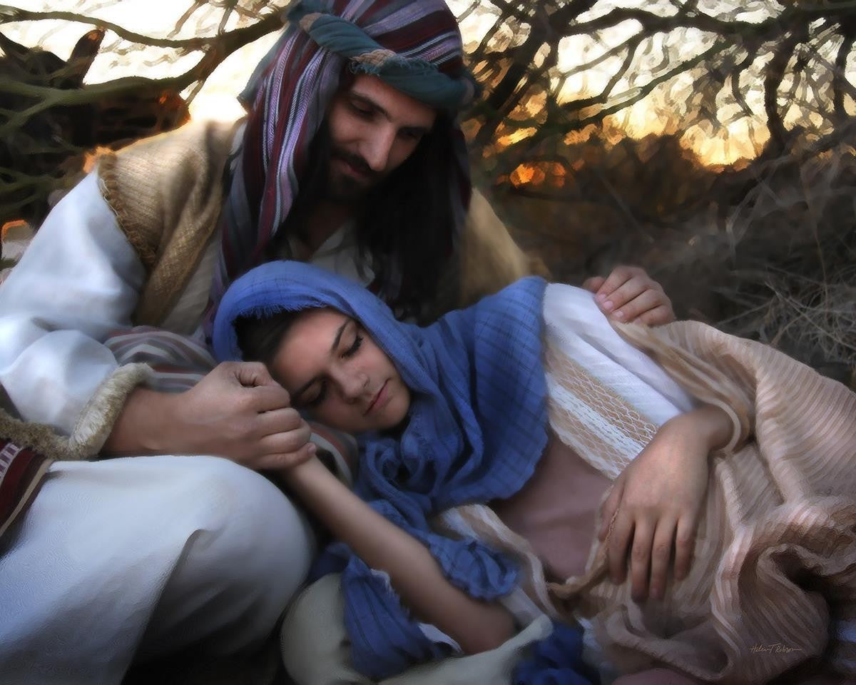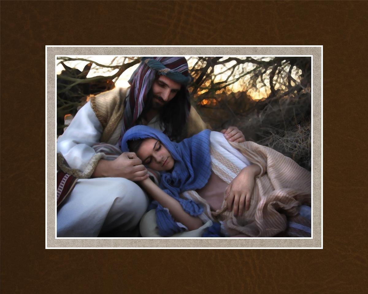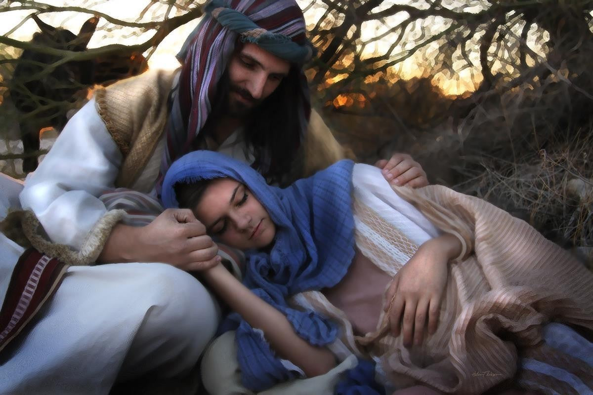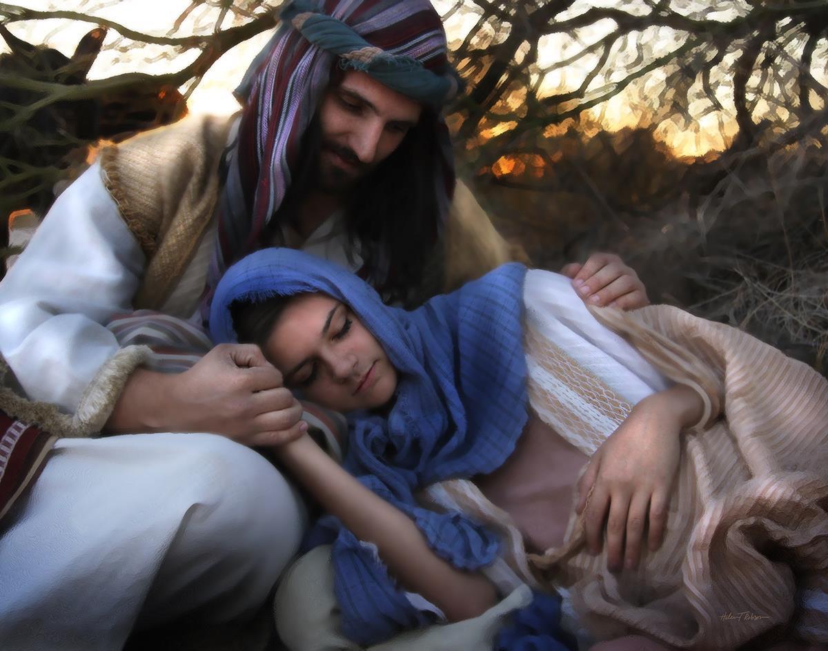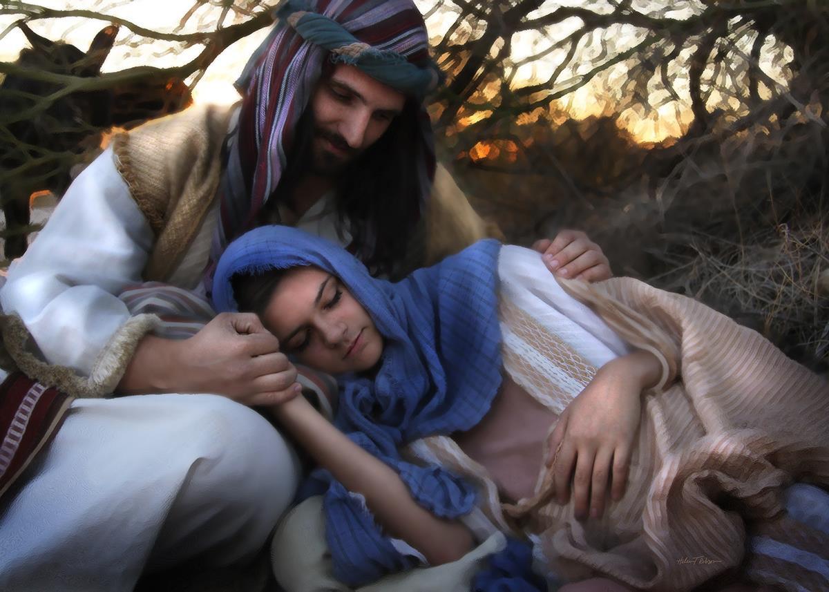 Joseph caring for and protecting Mary on their journey to Bethlehem