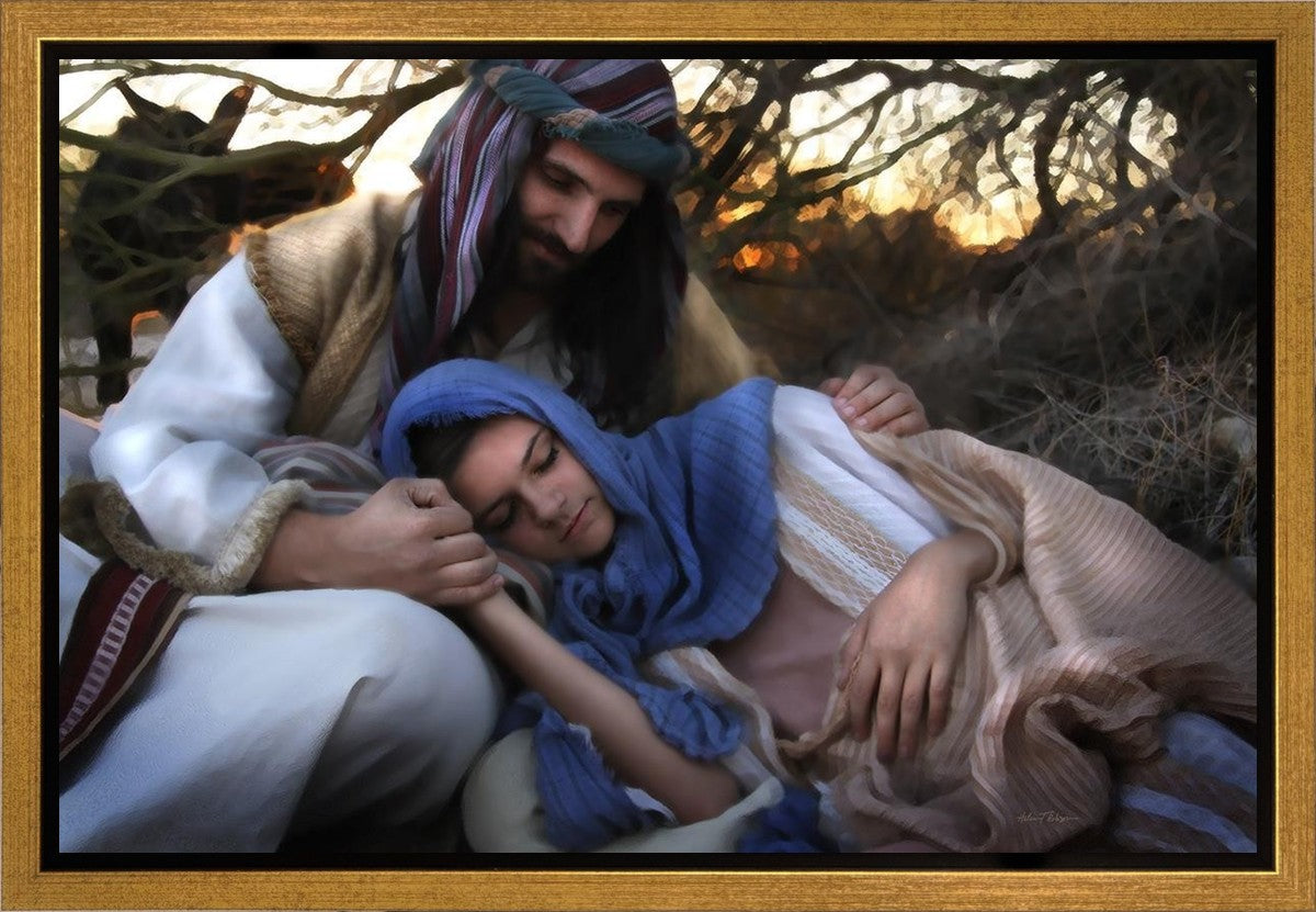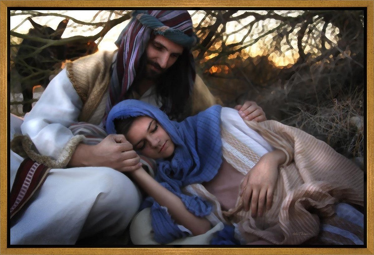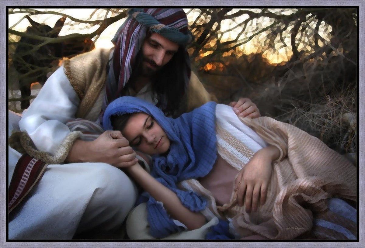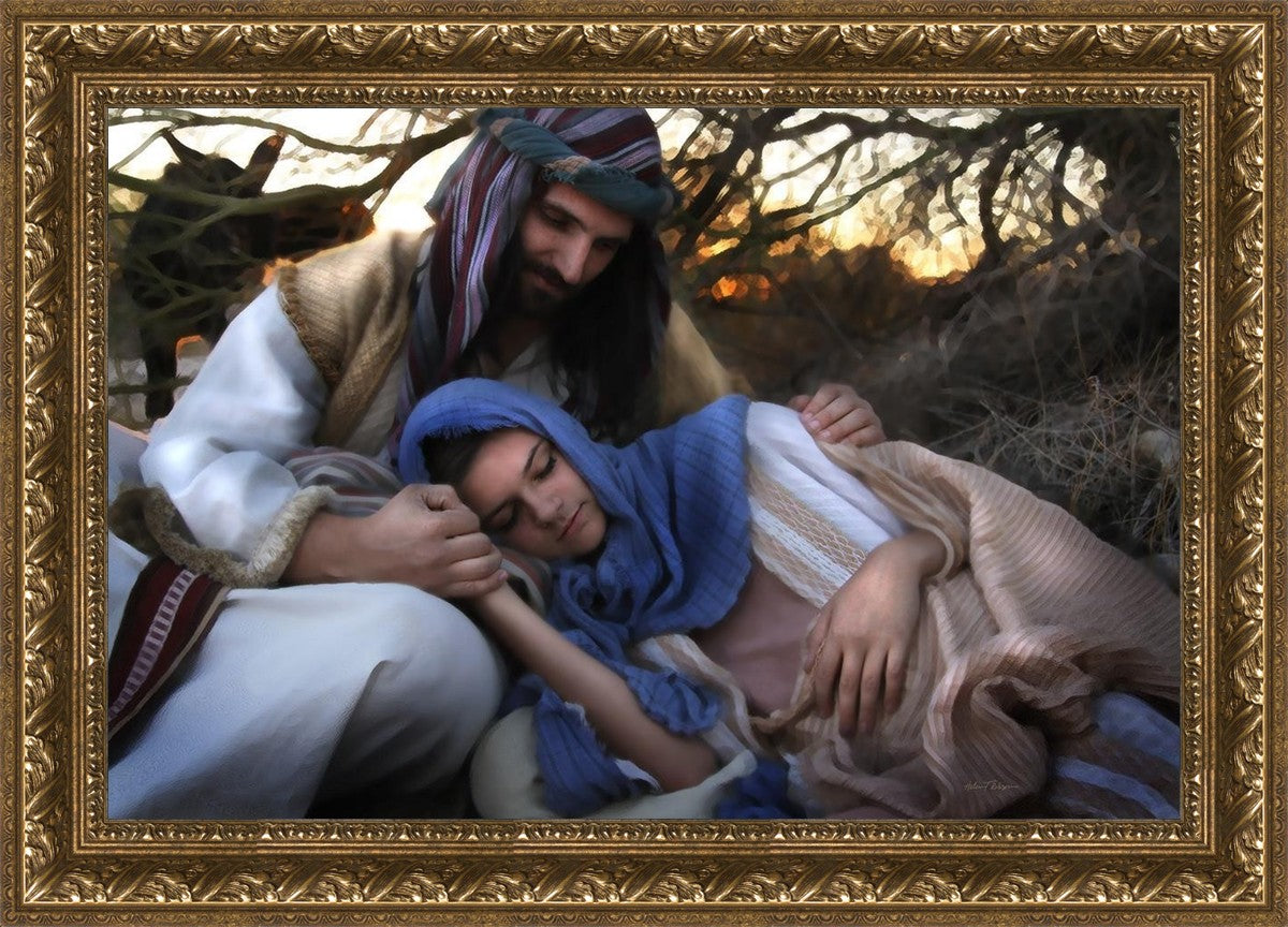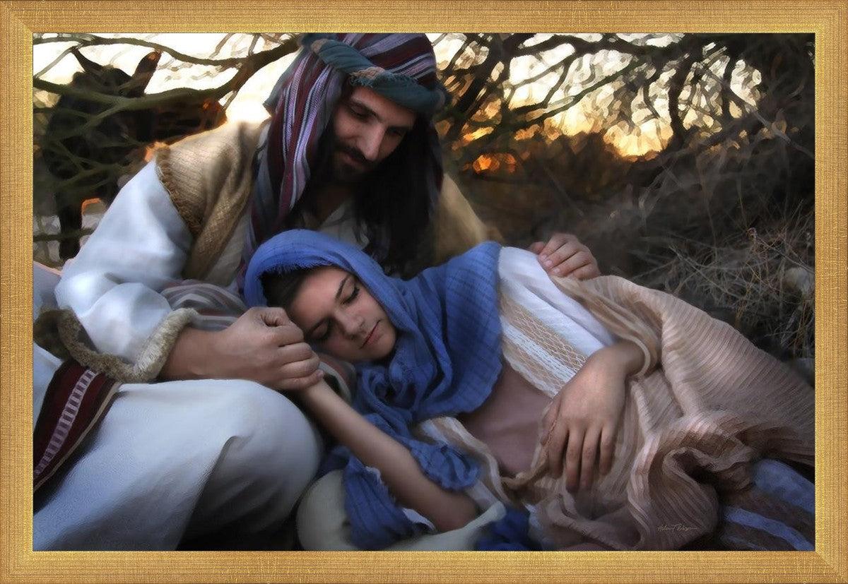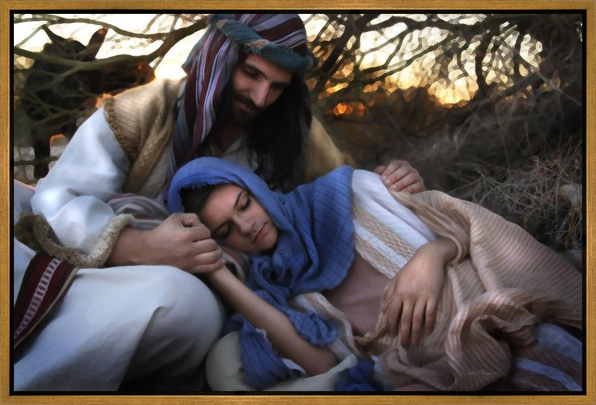 Joseph caring for and protecting Mary on their journey to Bethlehem