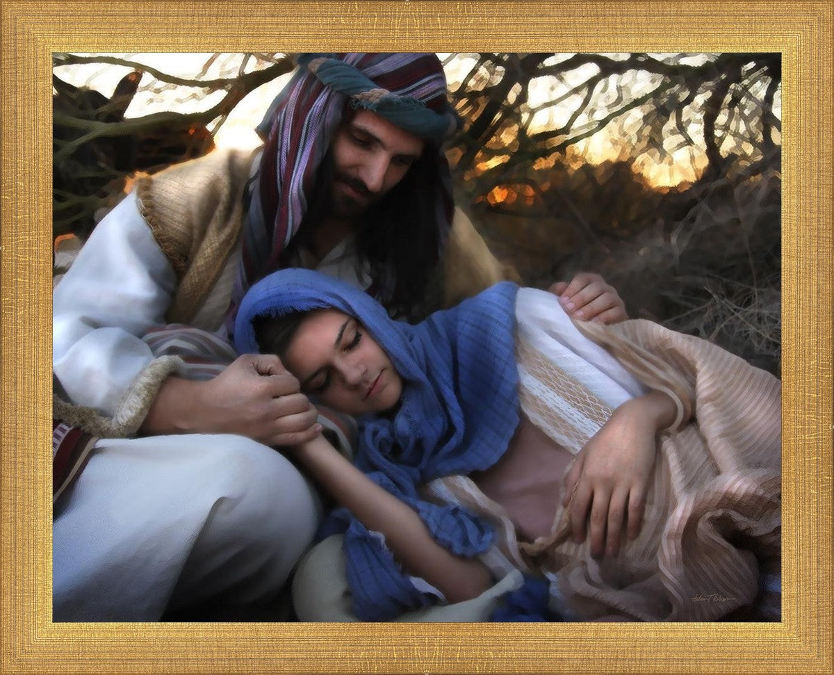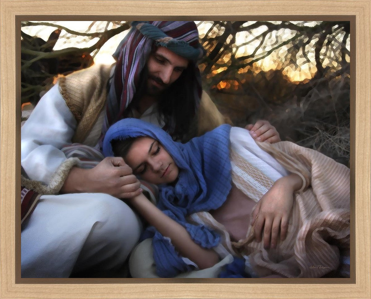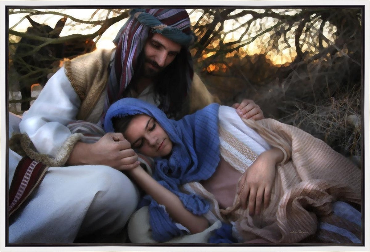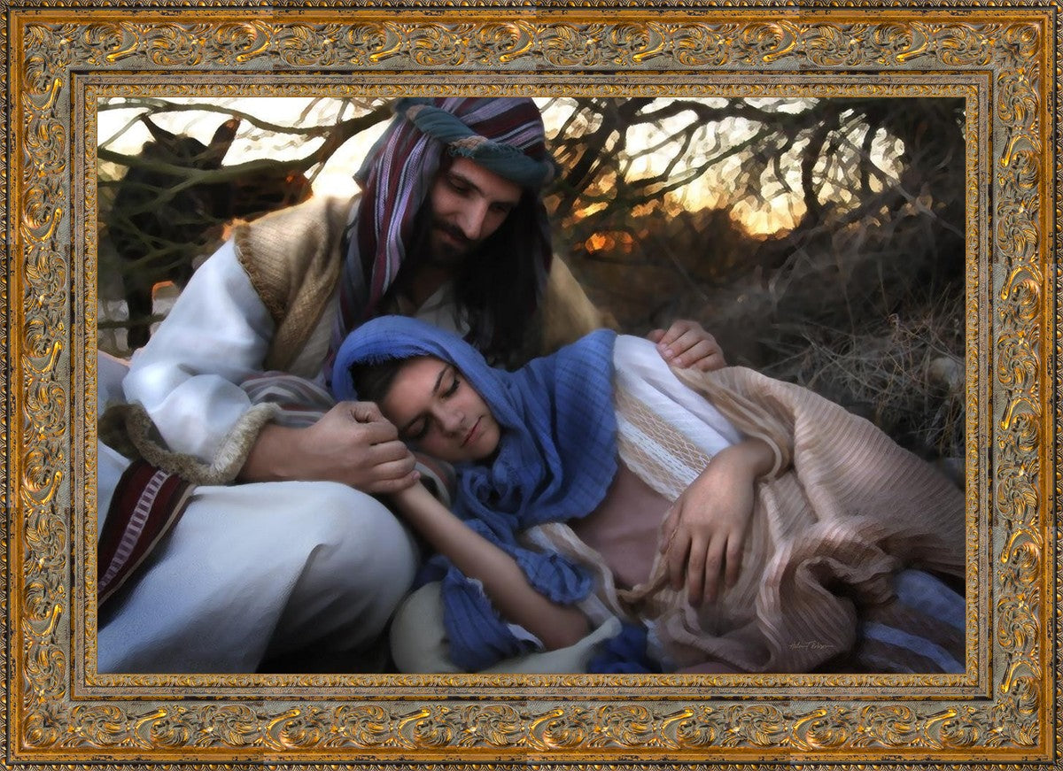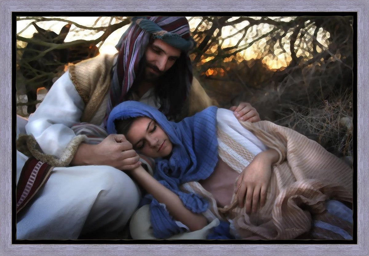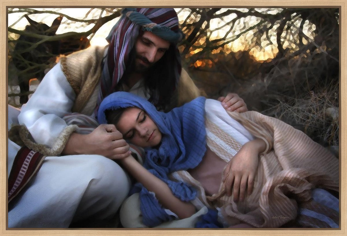 Joseph caring for and protecting Mary on their journey to Bethlehem