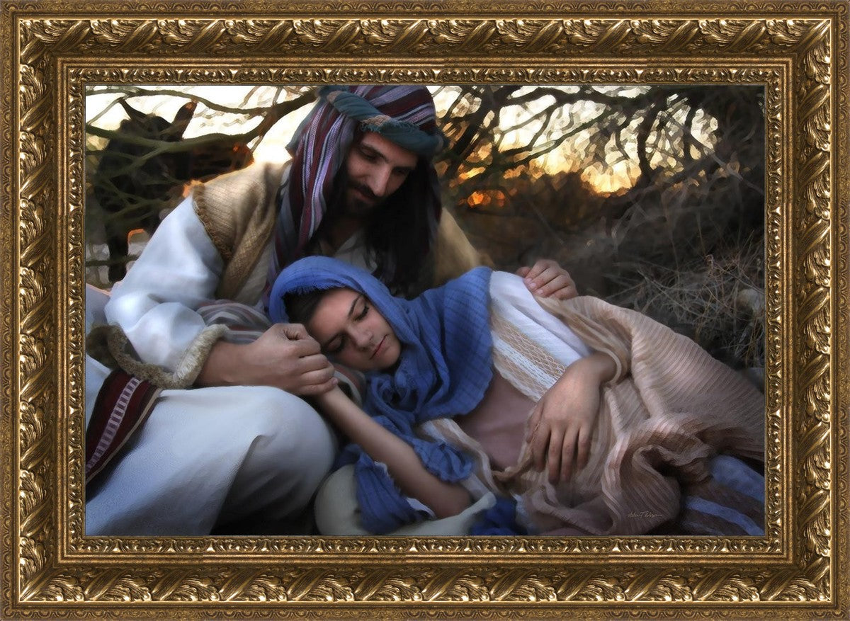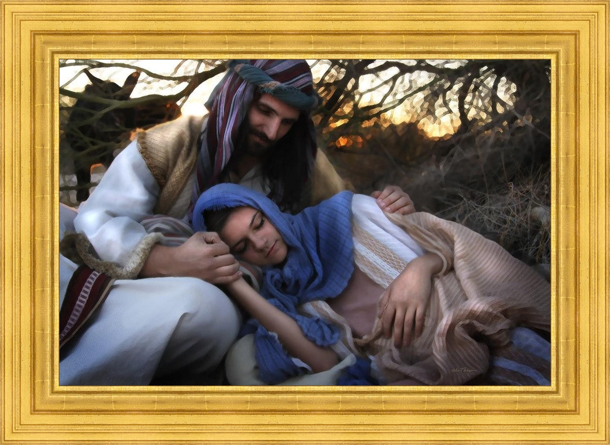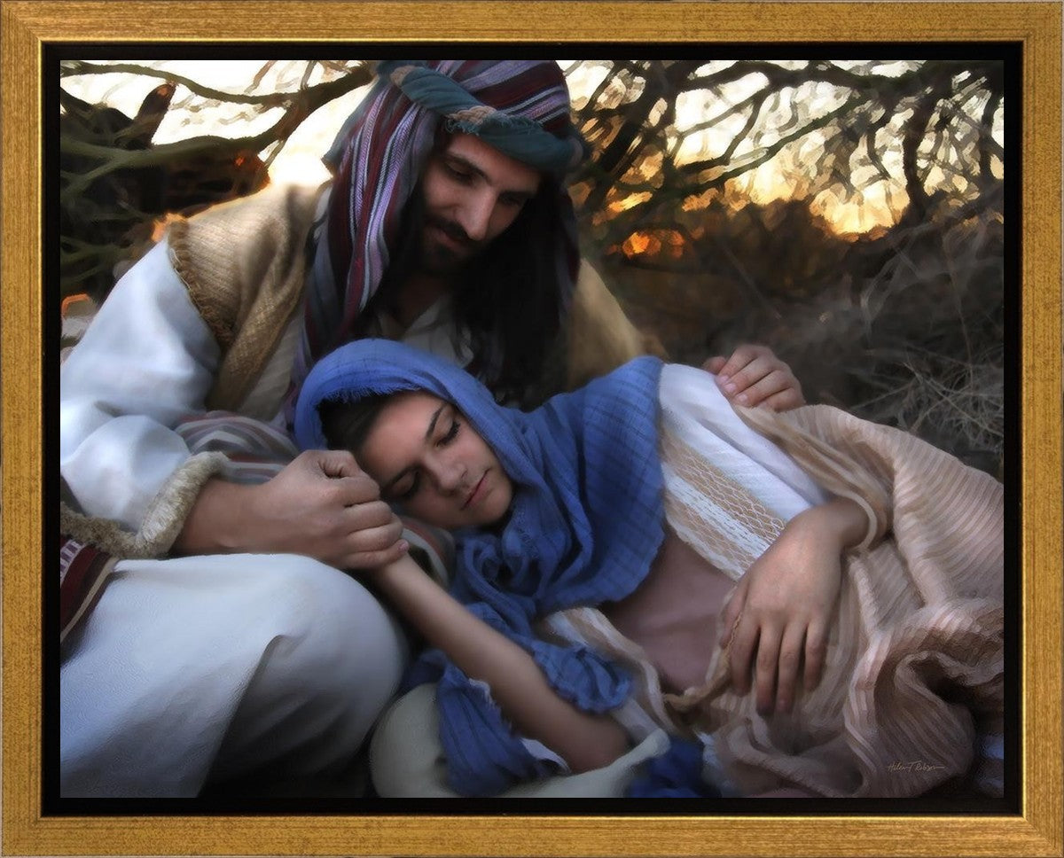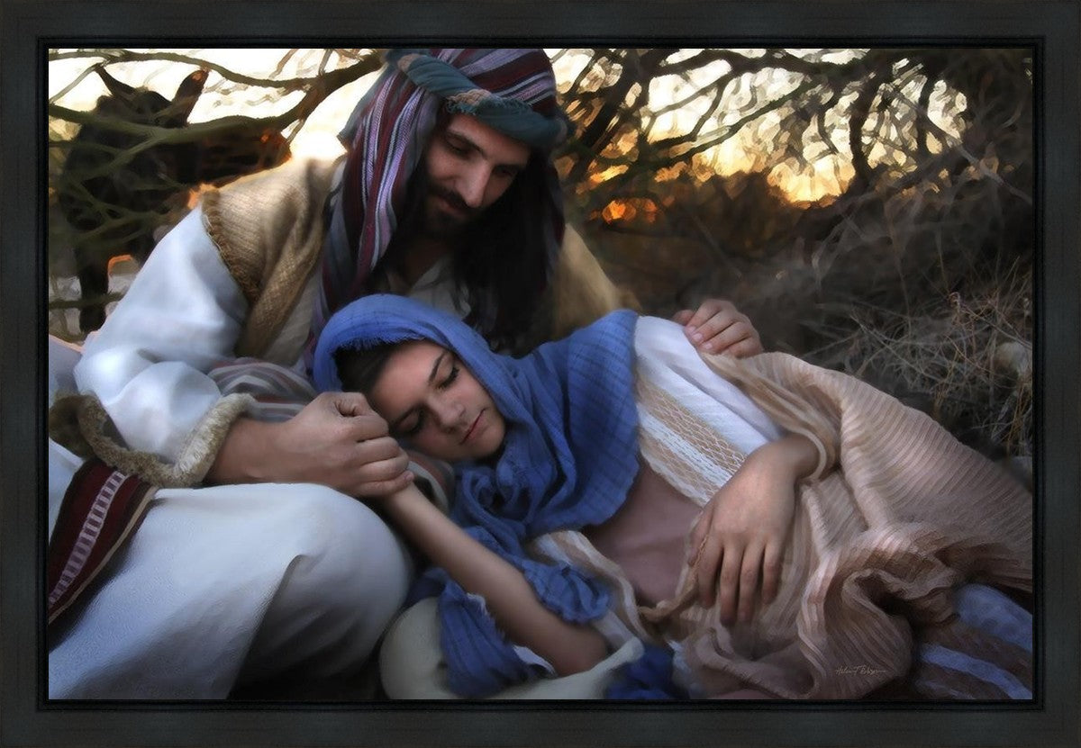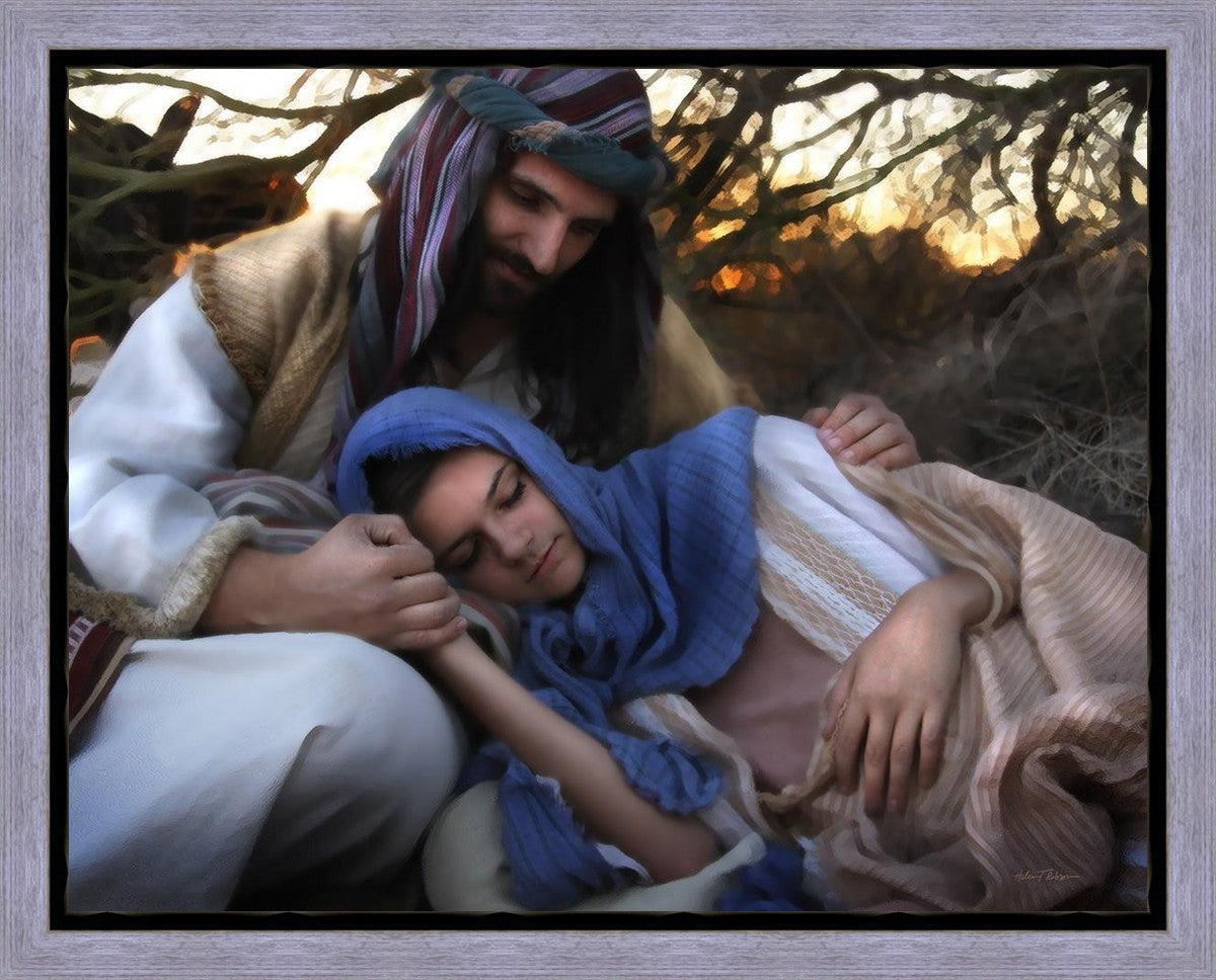 Joseph caring for and protecting Mary on their journey to Bethlehem