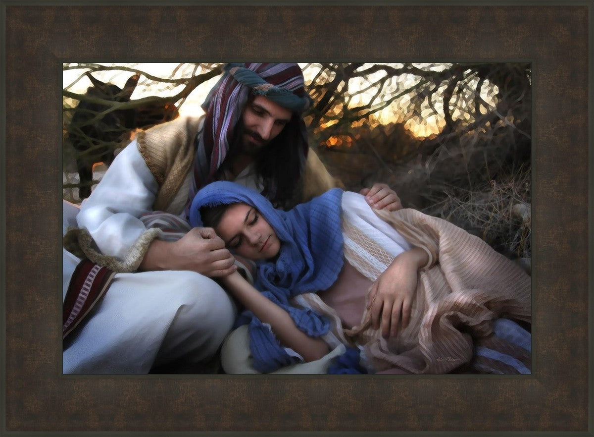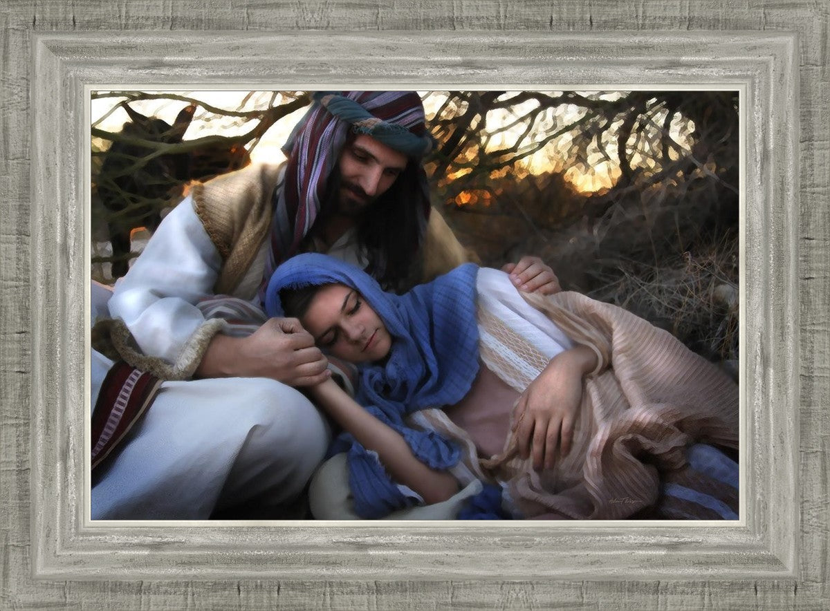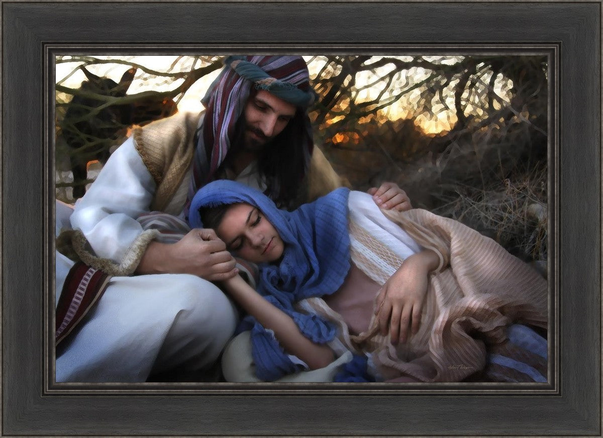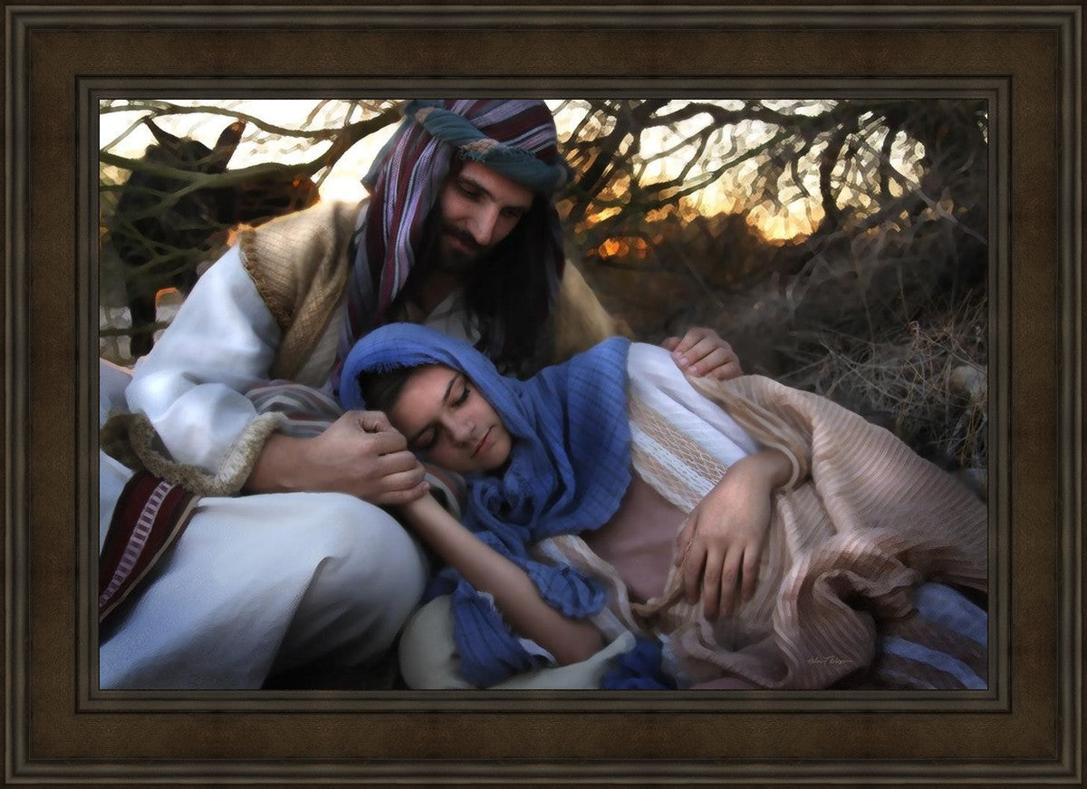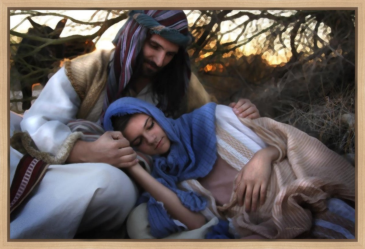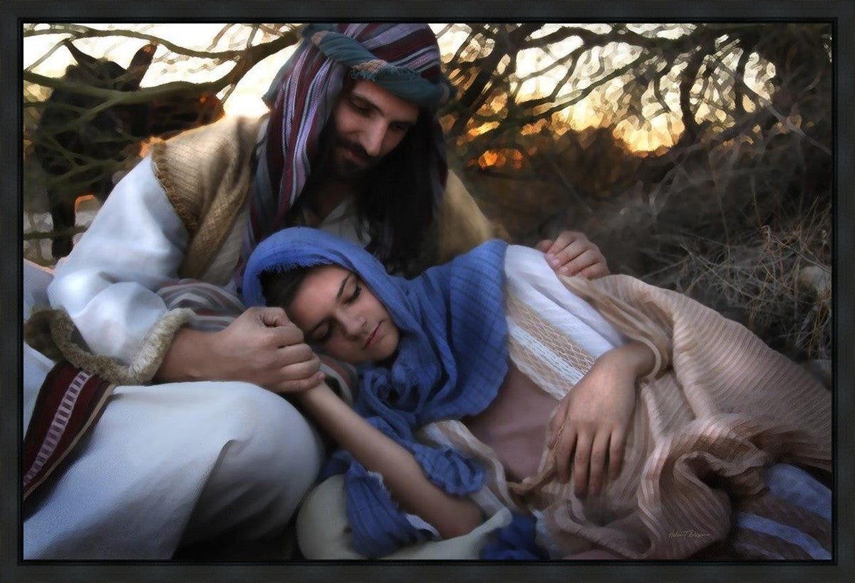Joseph caring for and protecting Mary on their journey to Bethlehem