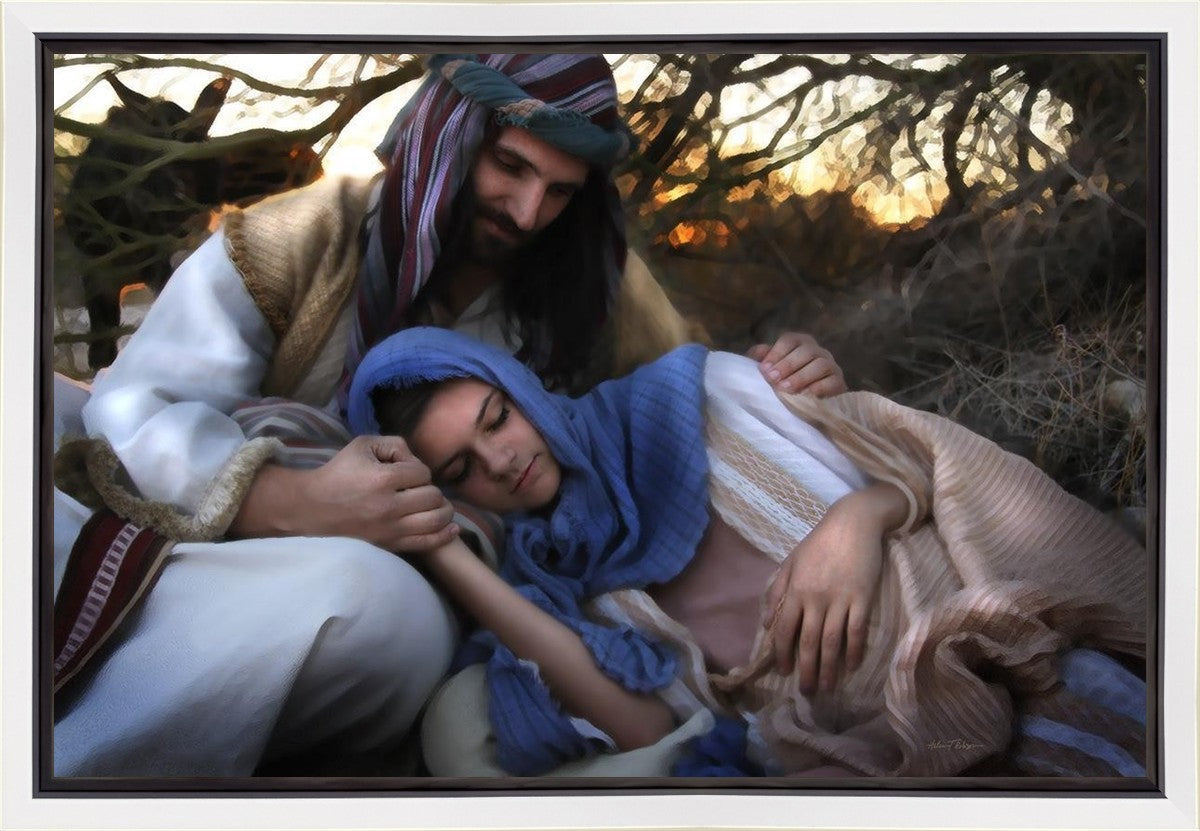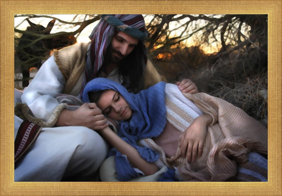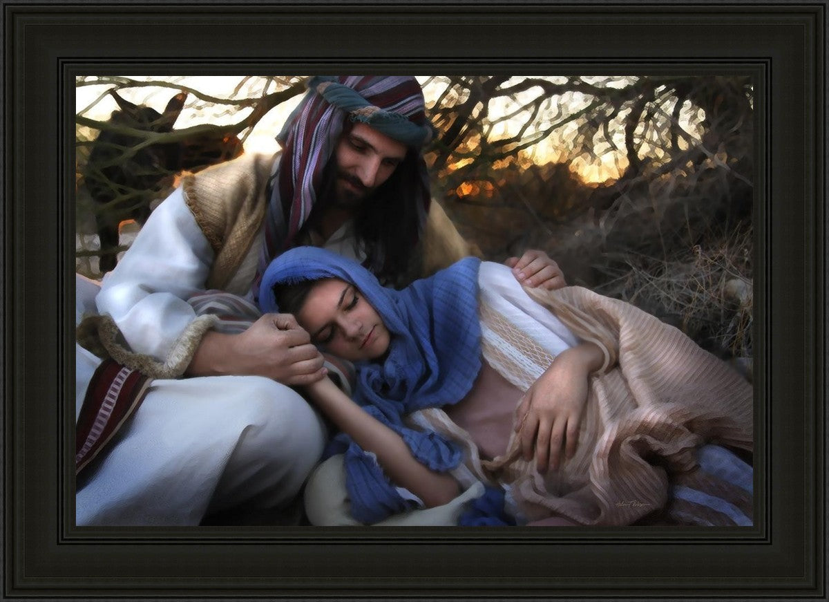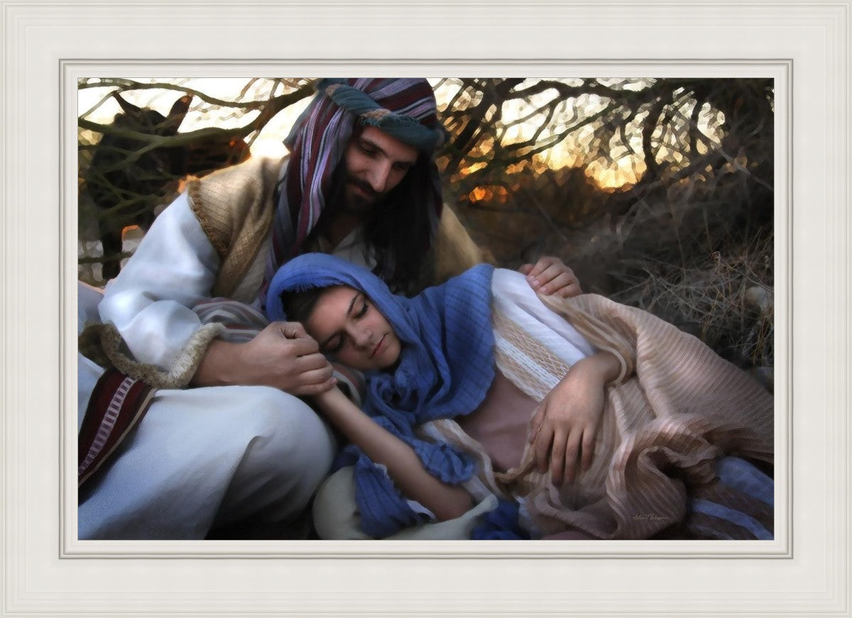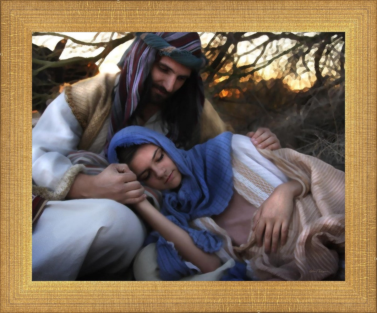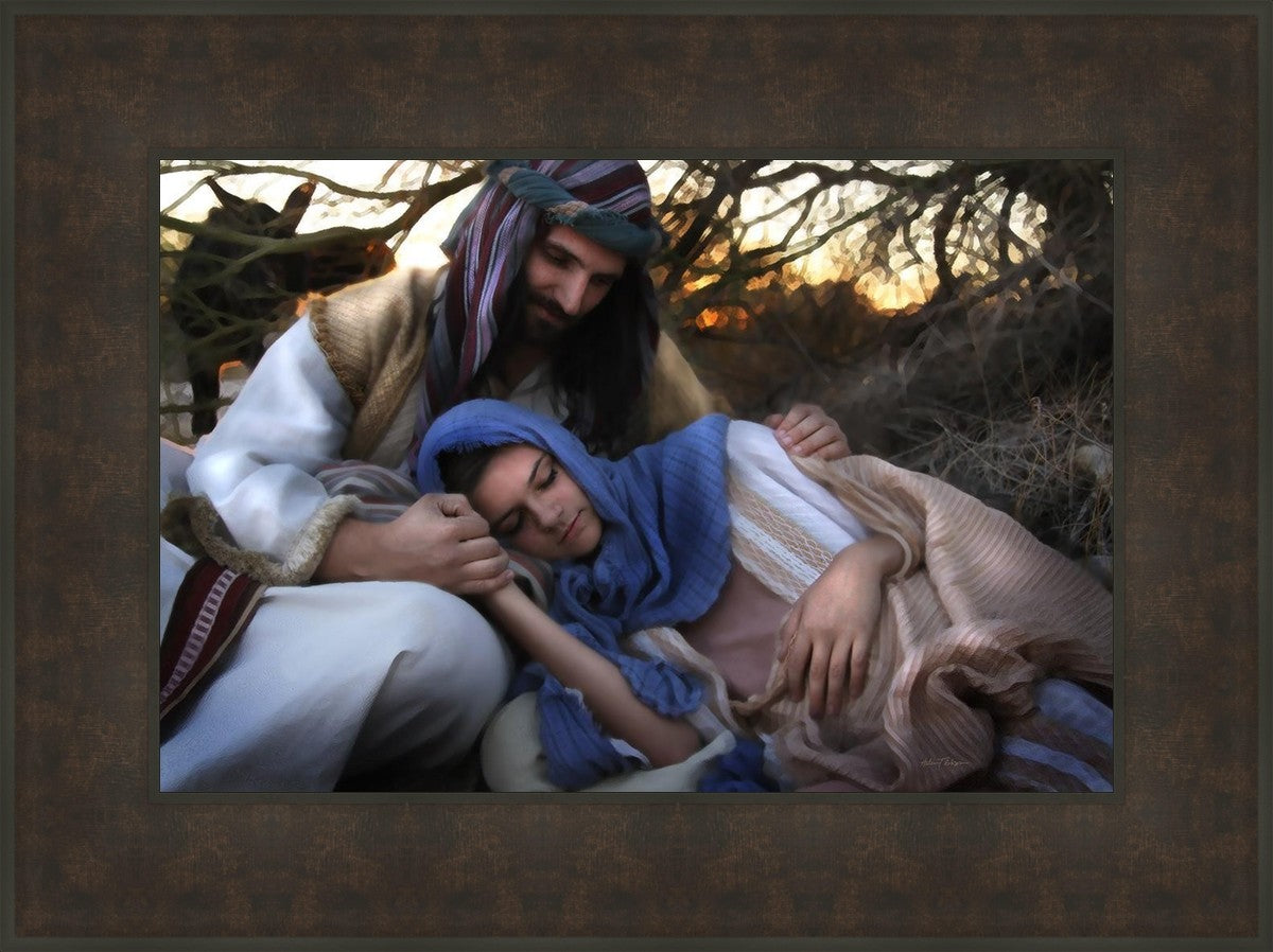 Joseph caring for and protecting Mary on their journey to Bethlehem