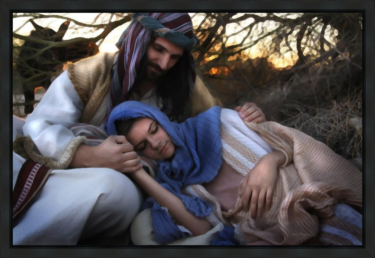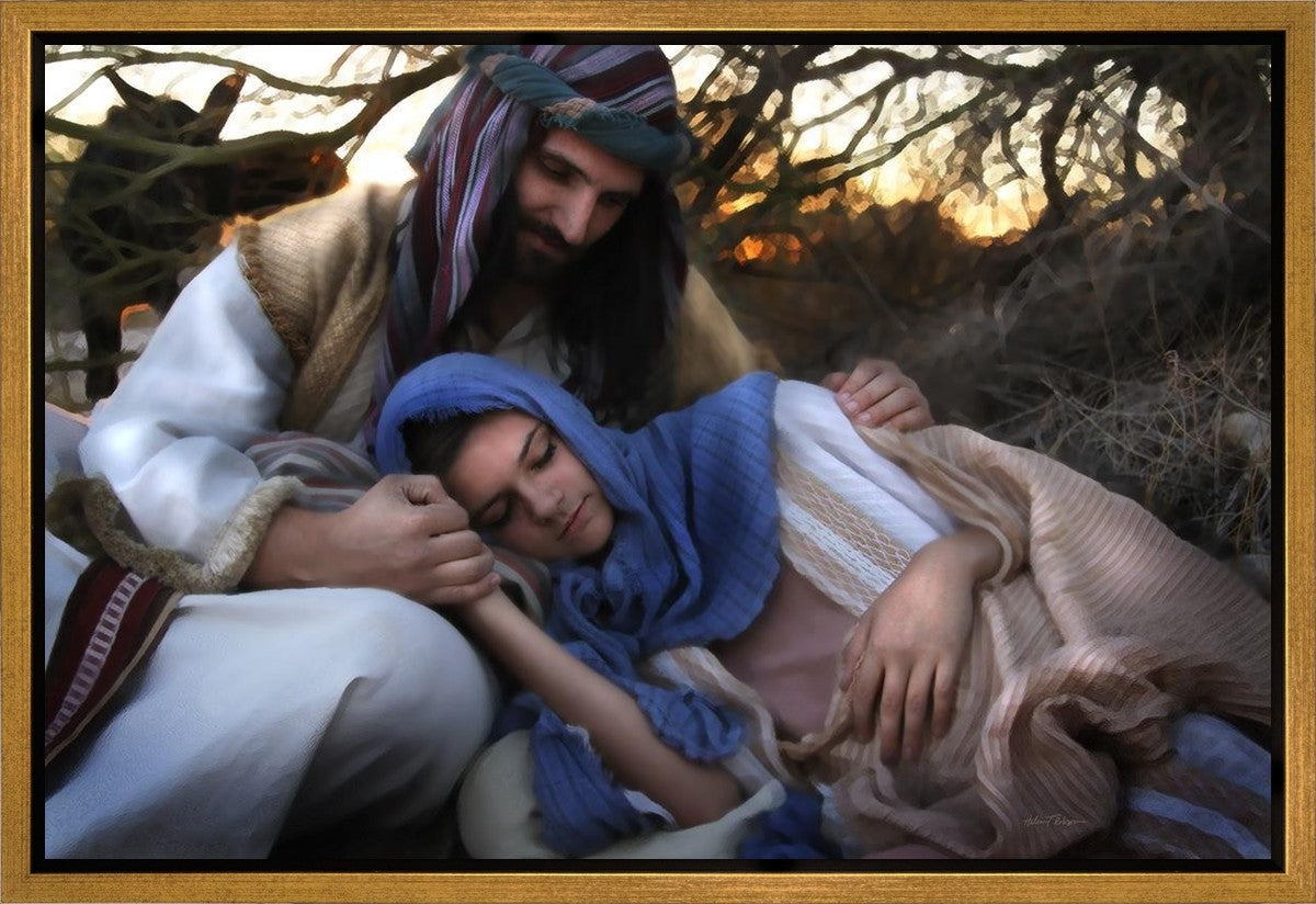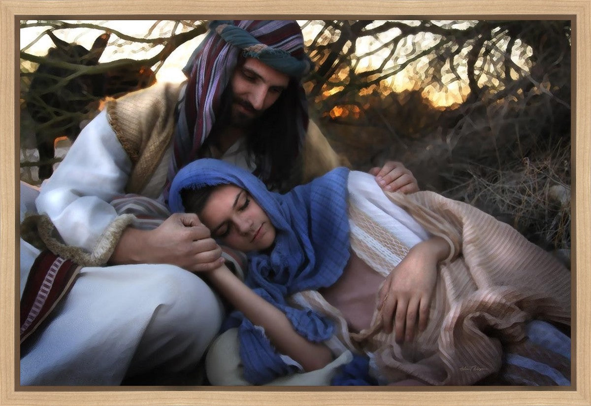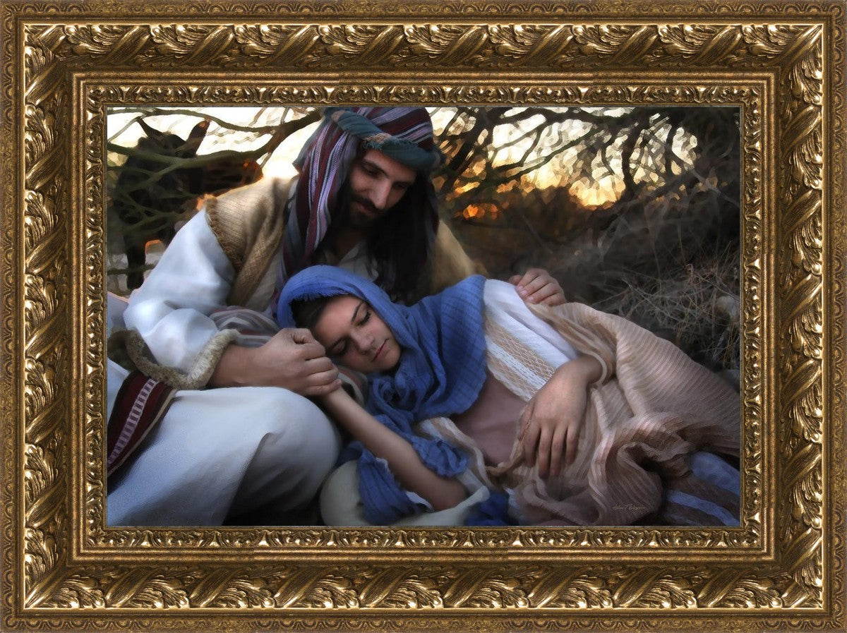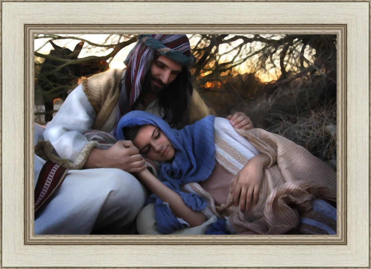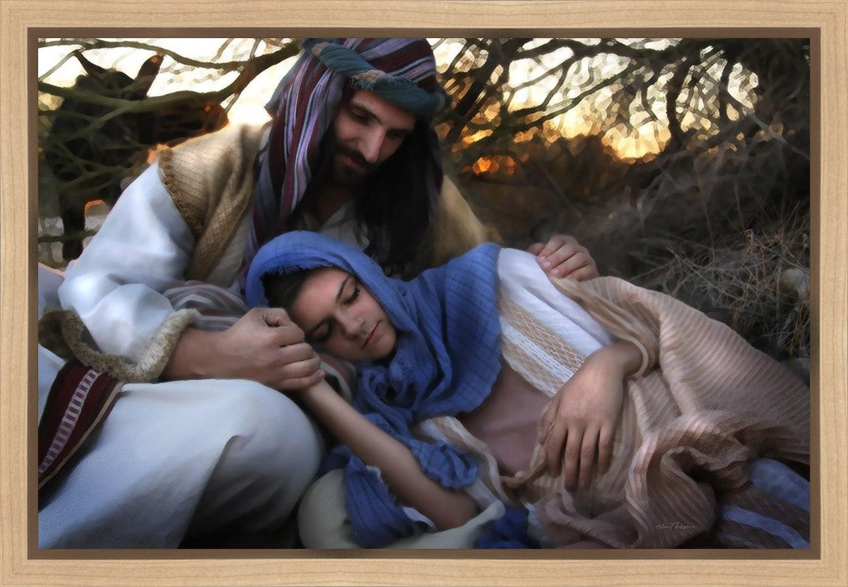 Joseph caring for and protecting Mary on their journey to Bethlehem