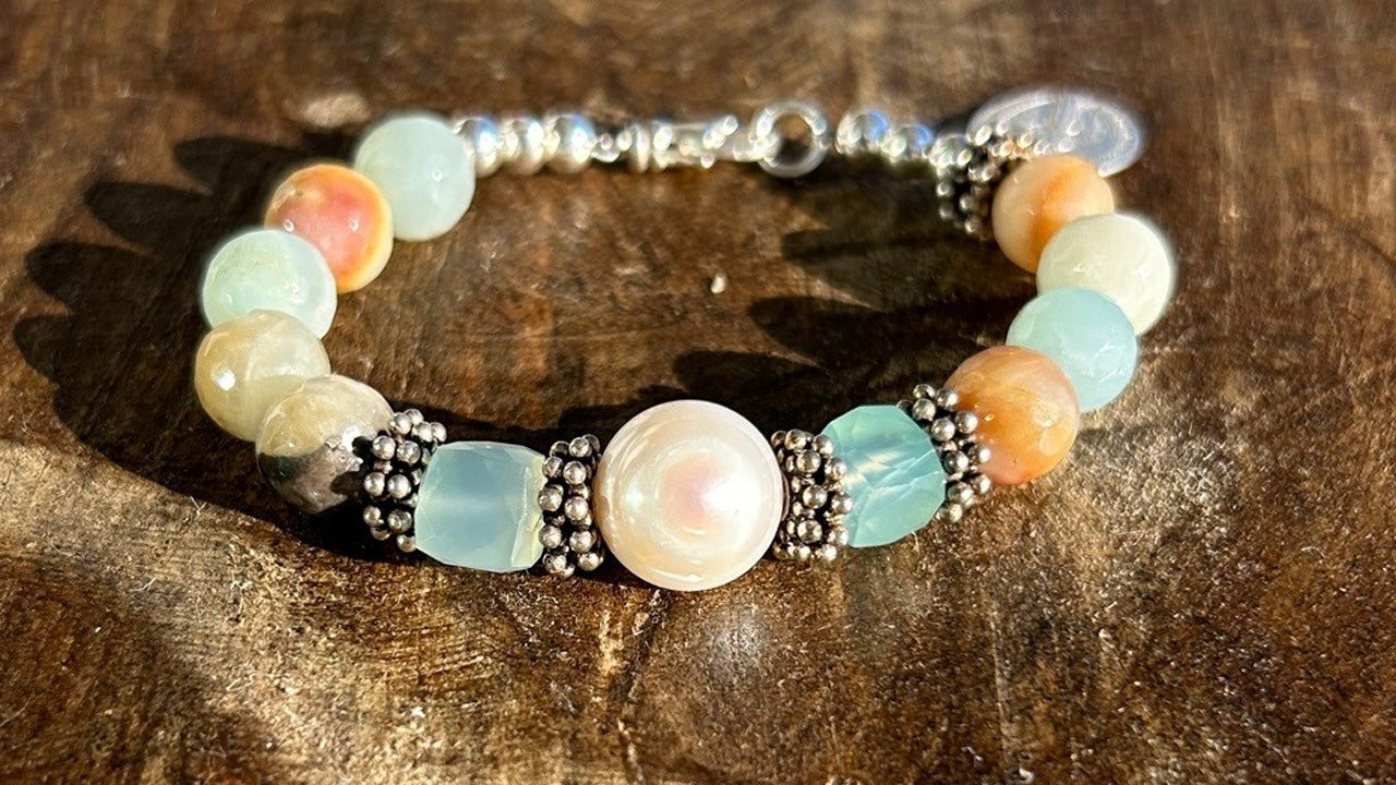 The White Pearl symbolizes faith. I surround it with stones of balance and stability, a pair of Chalcedony. I also love this blue stone because it is so reflective and clear. Amazonite surrounds the center piece which provides one with courage and empowerment. The charm is added to bring you the graces of the Virgin Mary.