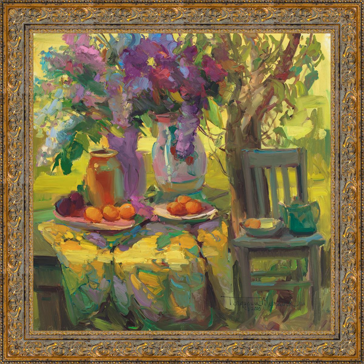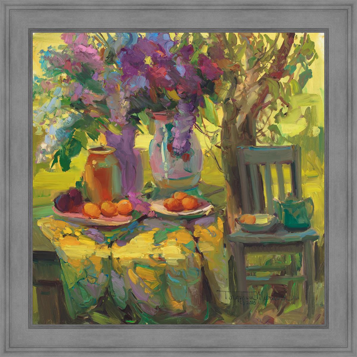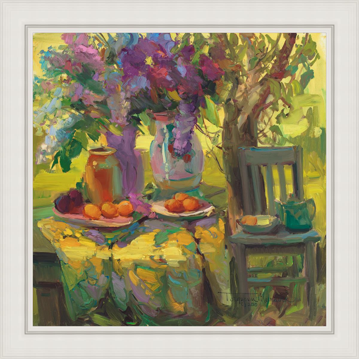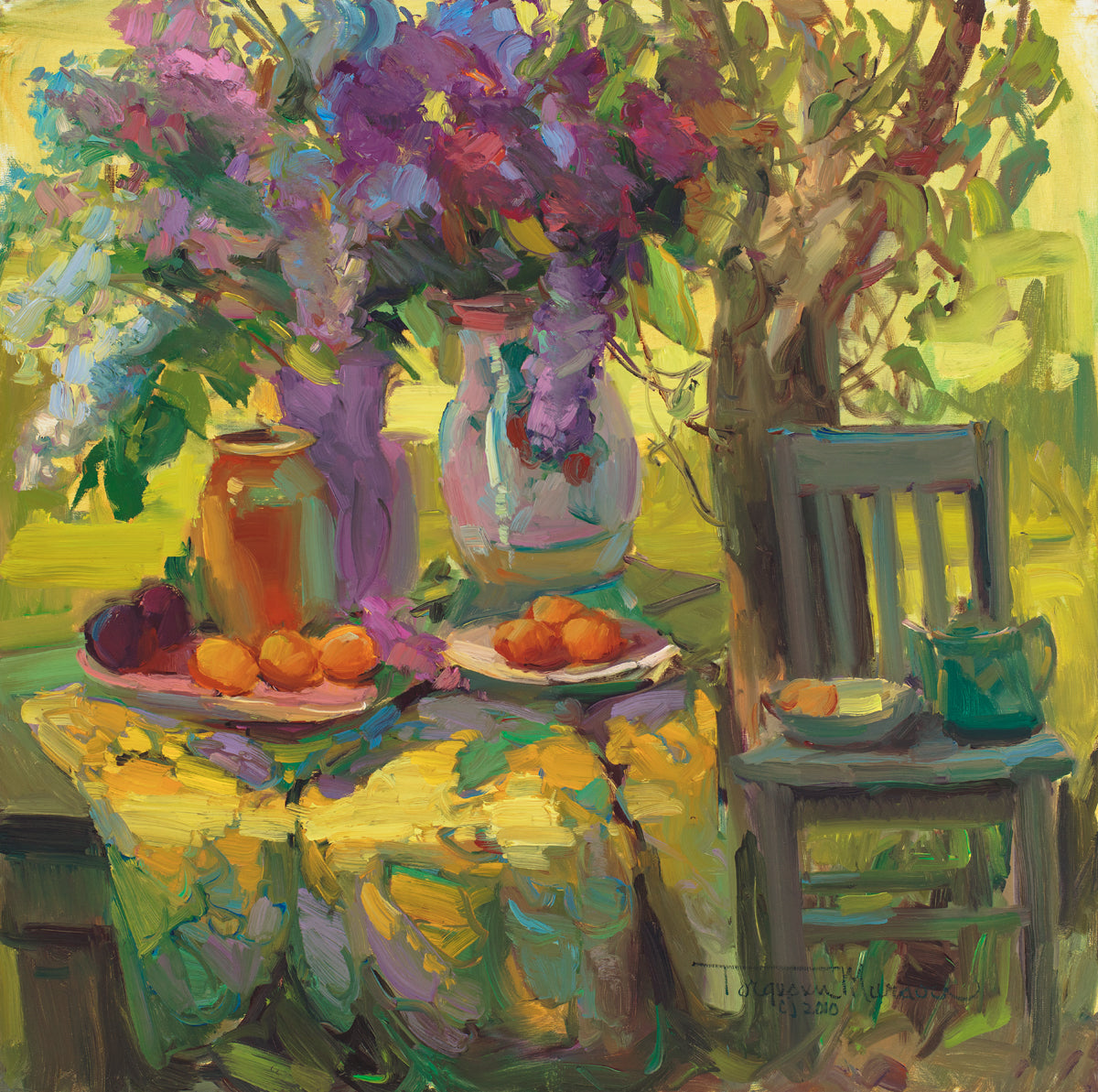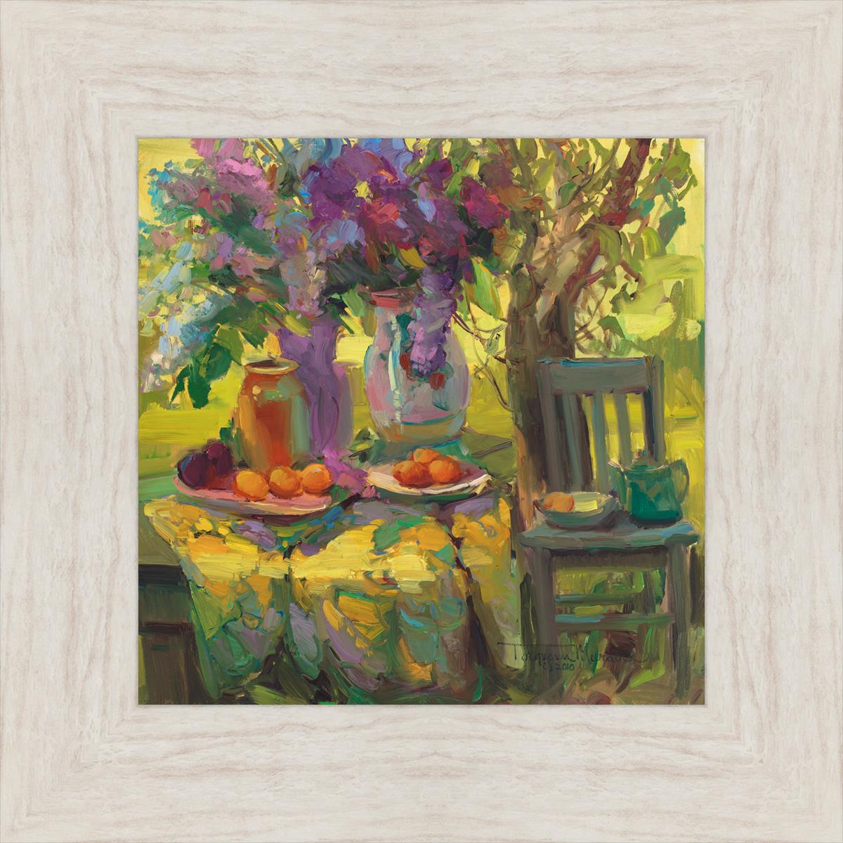 viridian and cobalt blue, and the sounds of little ladybugs and fireflies wafting around the set up. This painting was done outside on a cool evening in July under the spreading branches of a crab apple tree. The lavenders and cool pinks and greens are set off by the apricots and plums and the gold patterned cloth. It was awesome to be in the shade, looking through the still life to the green lawn made yellow by the sunlight. Can this be described as complete peace? I still feel the evening softness when I look at this painting.