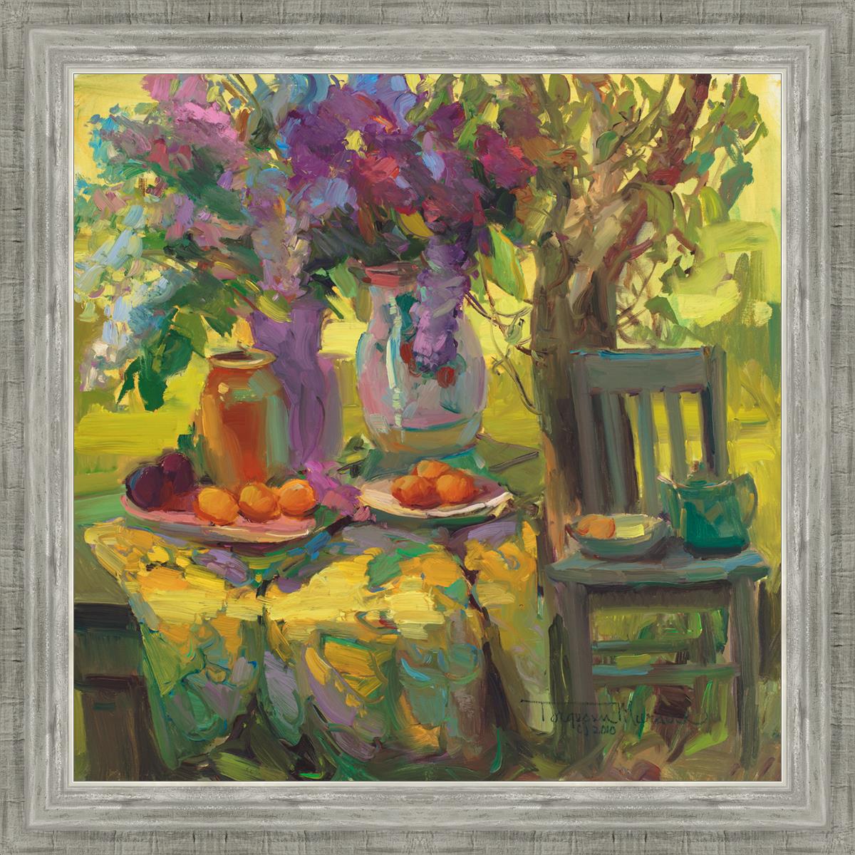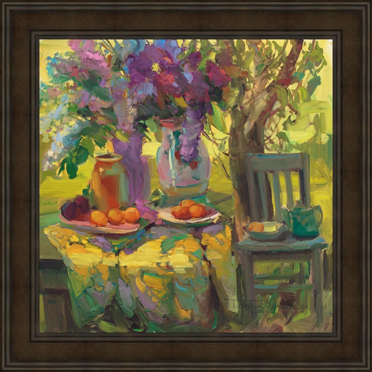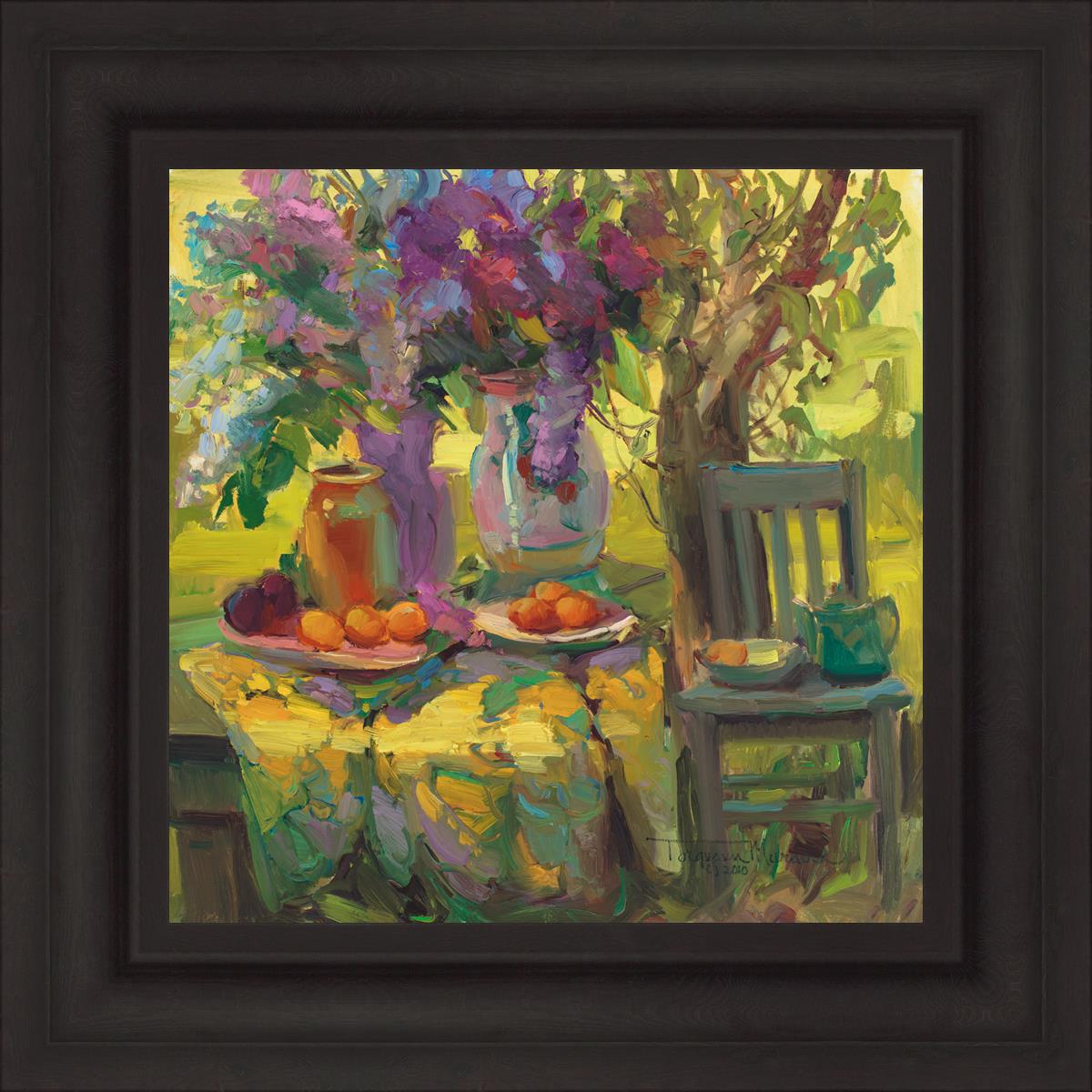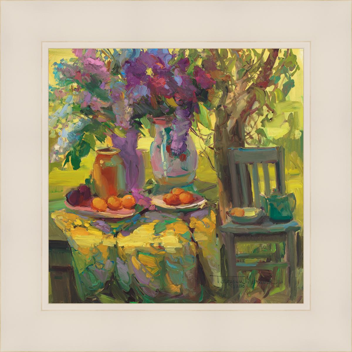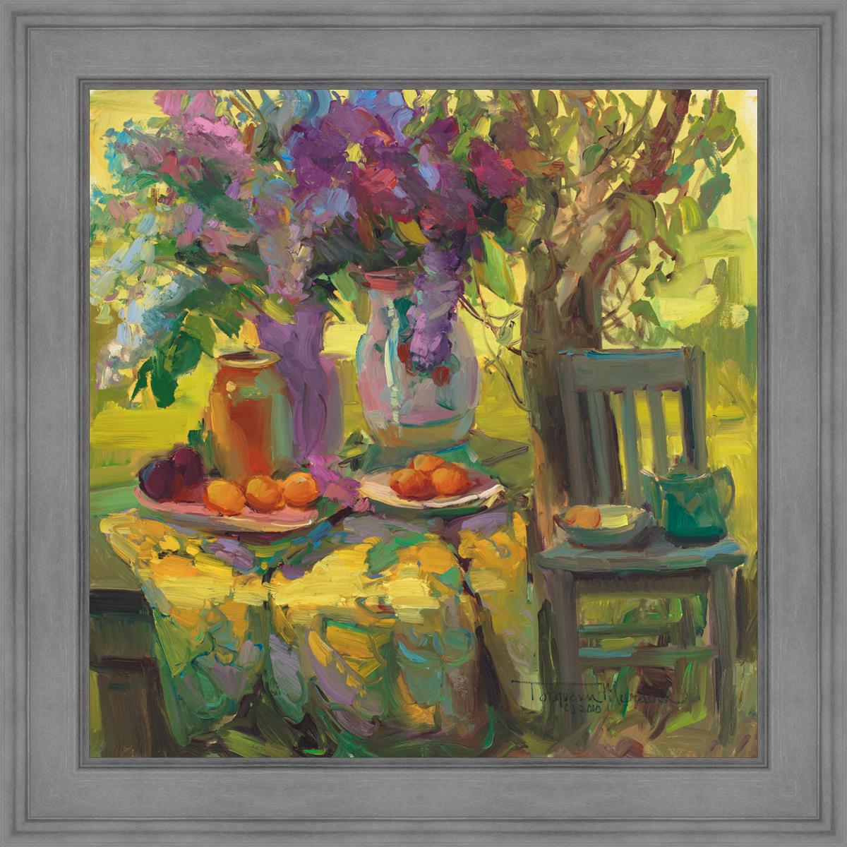 viridian and cobalt blue, and the sounds of little ladybugs and fireflies wafting around the set up. This painting was done outside on a cool evening in July under the spreading branches of a crab apple tree. The lavenders and cool pinks and greens are set off by the apricots and plums and the gold patterned cloth. It was awesome to be in the shade, looking through the still life to the green lawn made yellow by the sunlight. Can this be described as complete peace? I still feel the evening softness when I look at this painting.