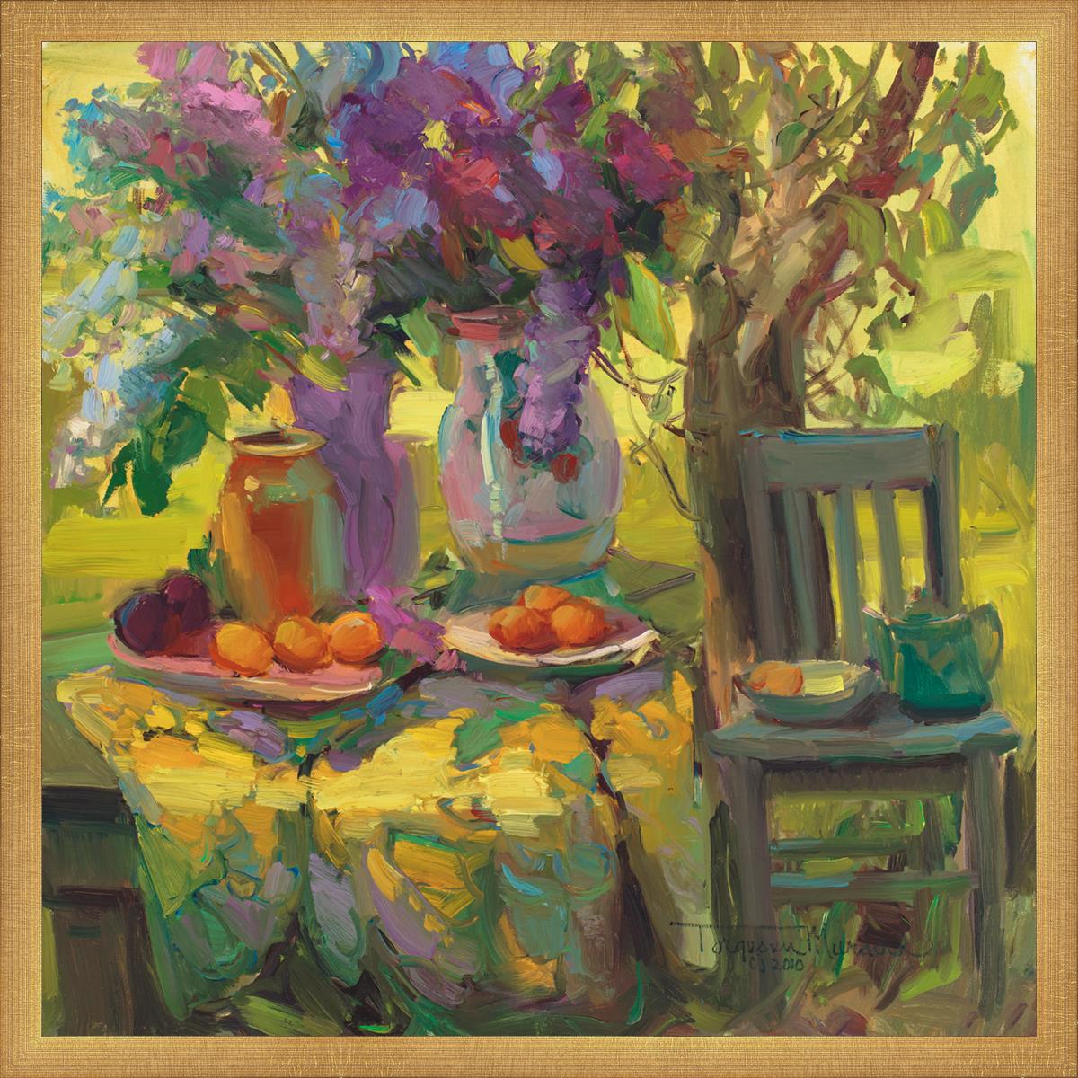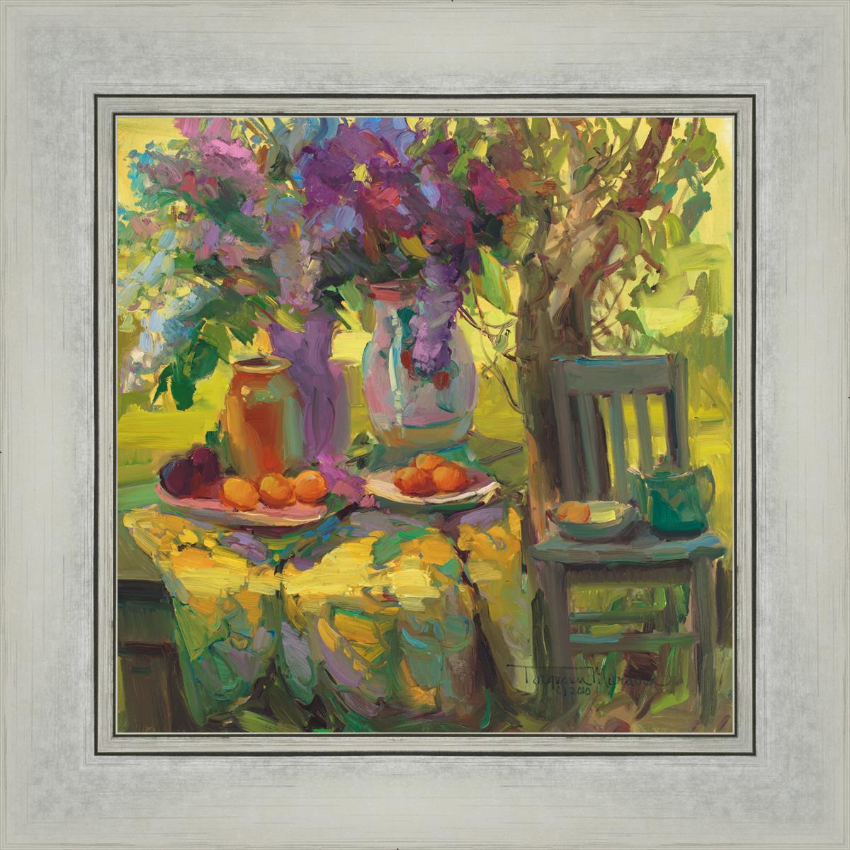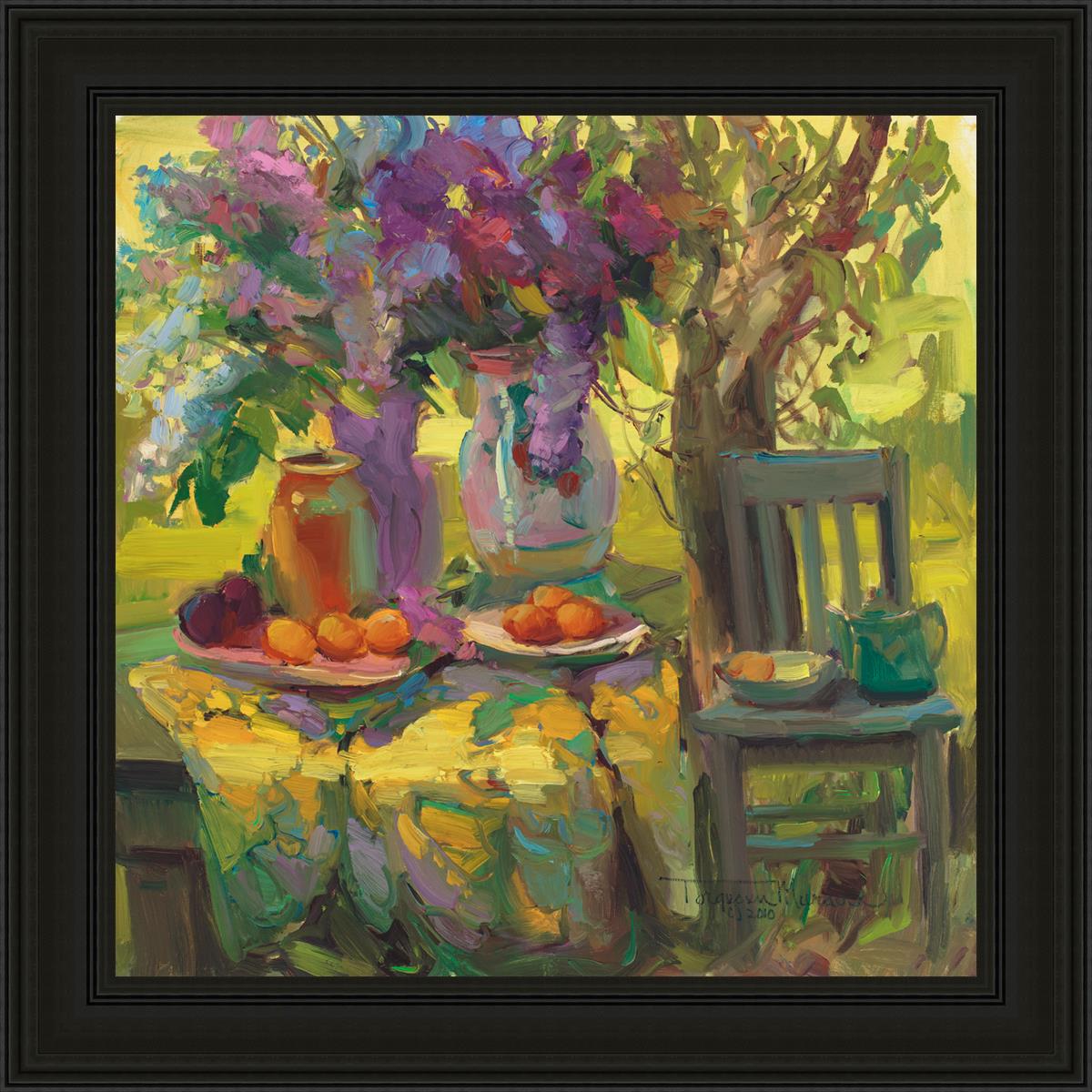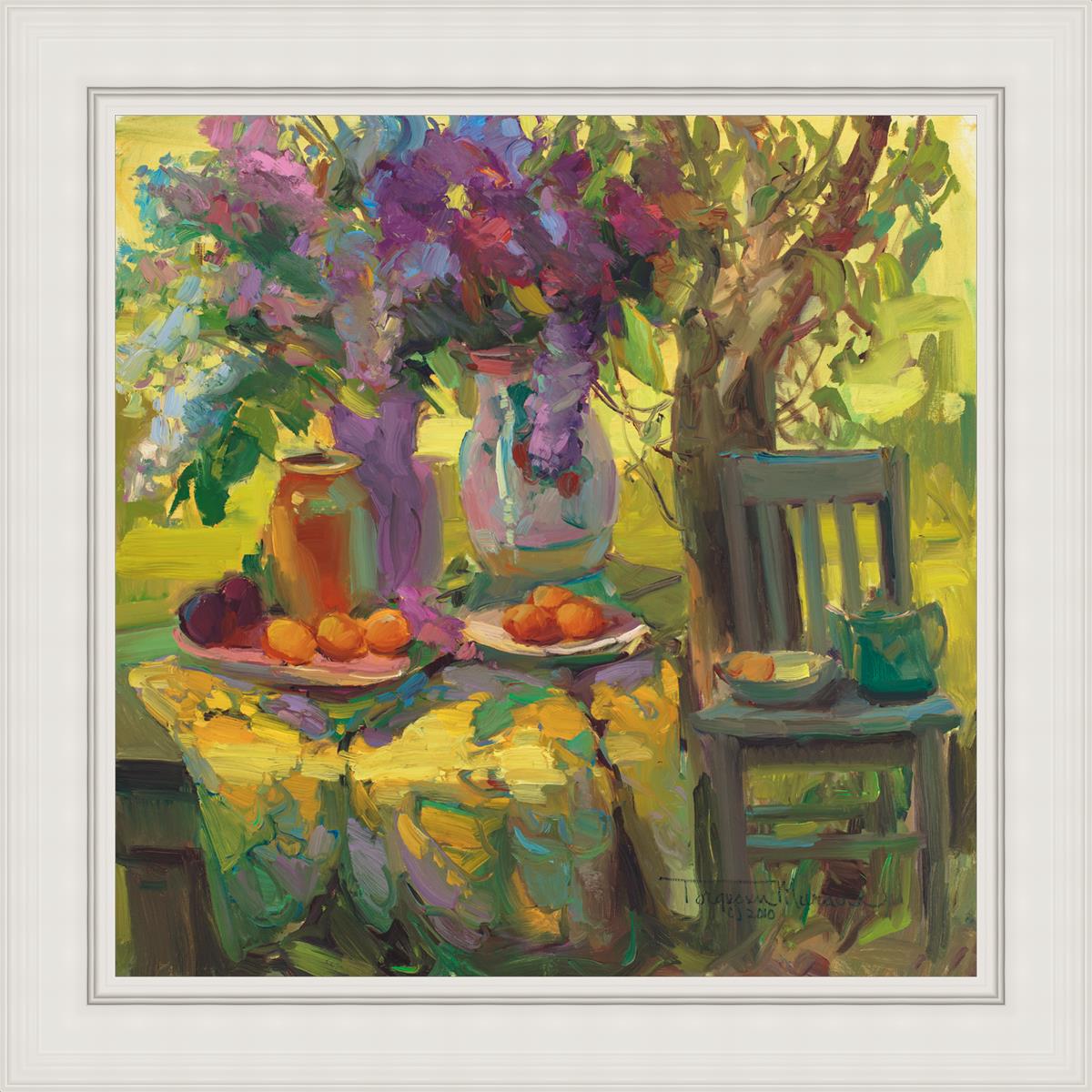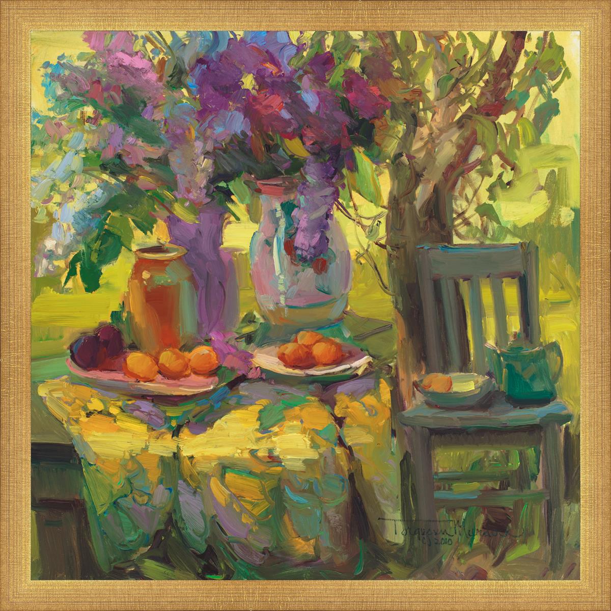 viridian and cobalt blue, and the sounds of little ladybugs and fireflies wafting around the set up. This painting was done outside on a cool evening in July under the spreading branches of a crab apple tree. The lavenders and cool pinks and greens are set off by the apricots and plums and the gold patterned cloth. It was awesome to be in the shade, looking through the still life to the green lawn made yellow by the sunlight. Can this be described as complete peace? I still feel the evening softness when I look at this painting.