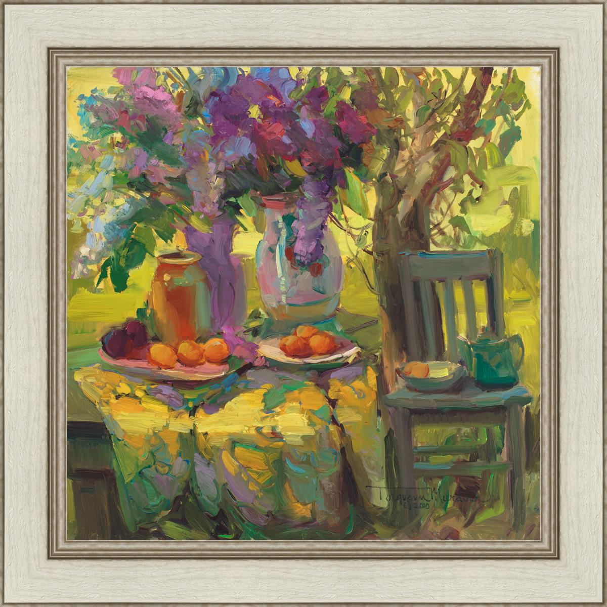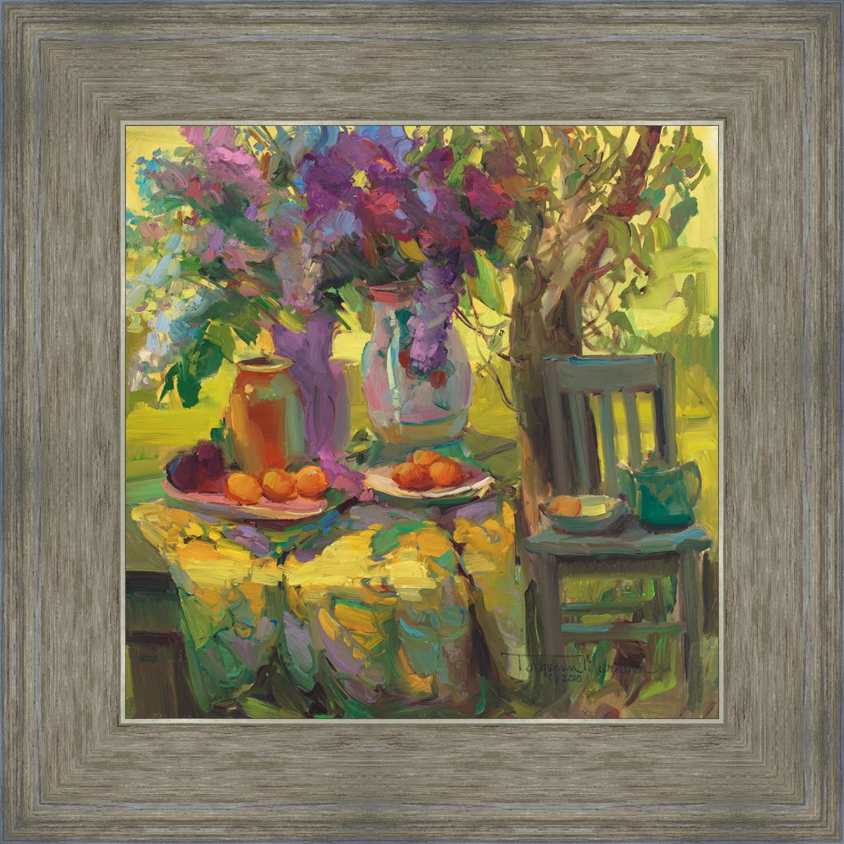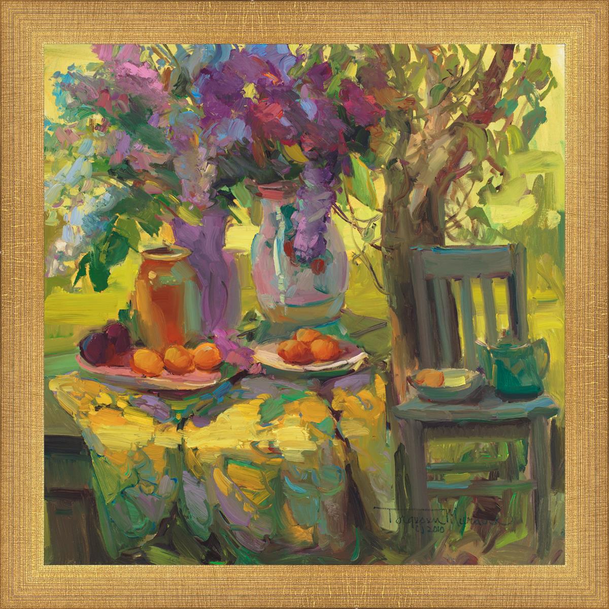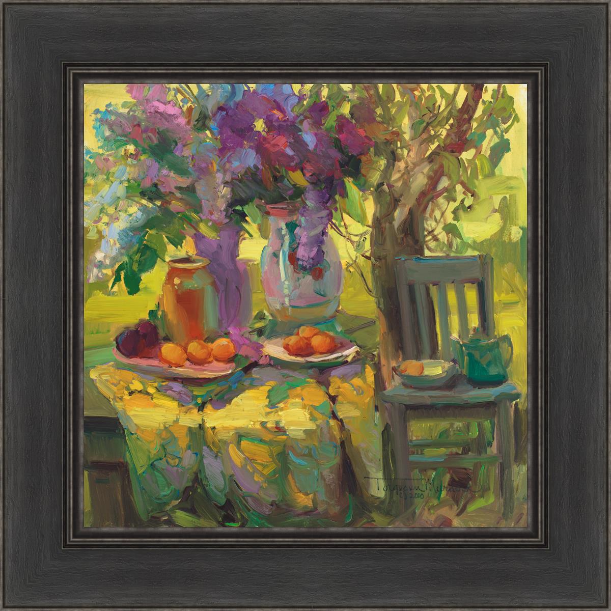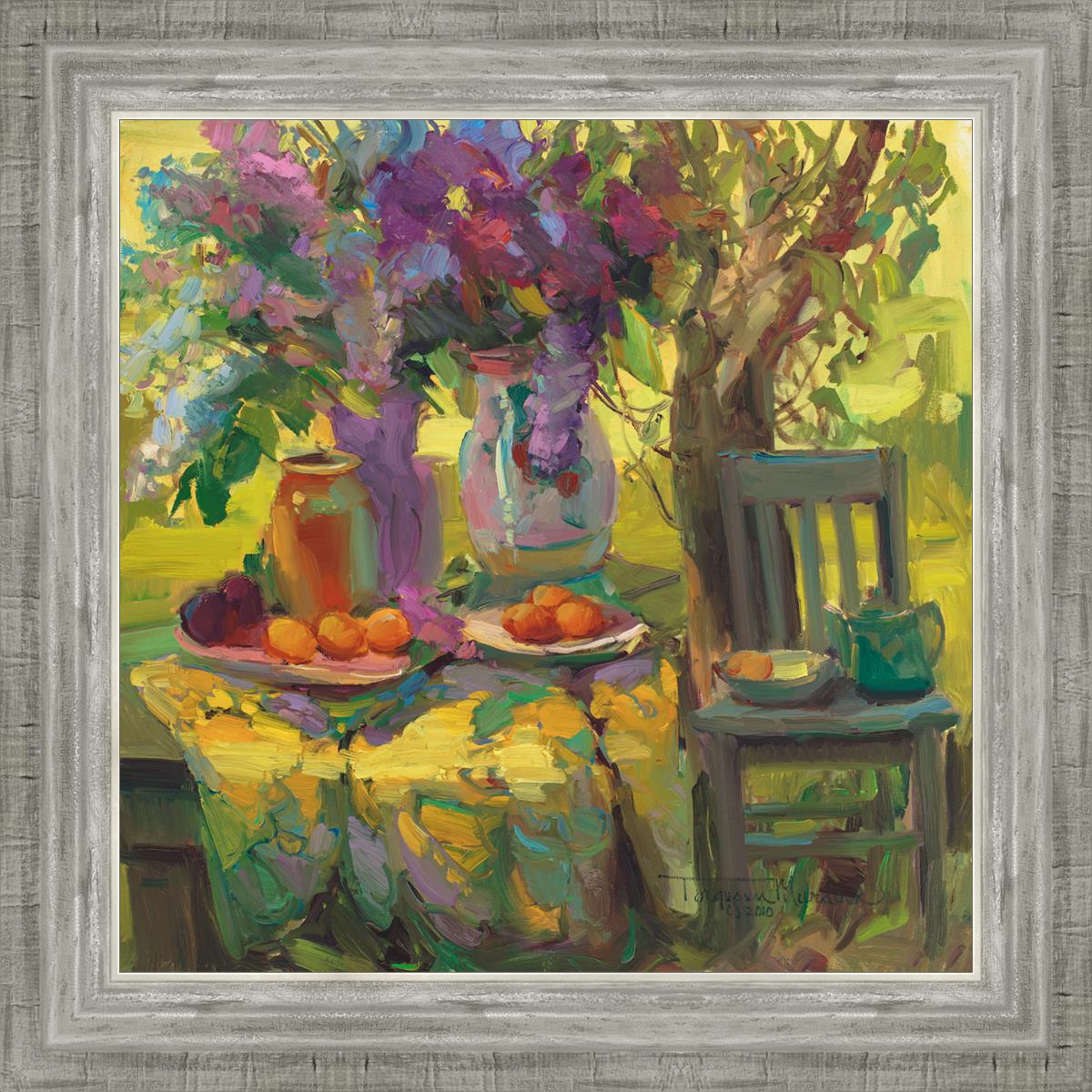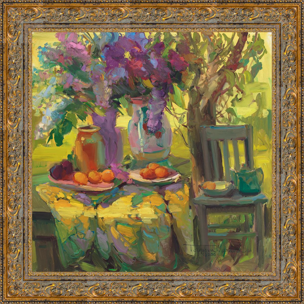 viridian and cobalt blue, and the sounds of little ladybugs and fireflies wafting around the set up. This painting was done outside on a cool evening in July under the spreading branches of a crab apple tree. The lavenders and cool pinks and greens are set off by the apricots and plums and the gold patterned cloth. It was awesome to be in the shade, looking through the still life to the green lawn made yellow by the sunlight. Can this be described as complete peace? I still feel the evening softness when I look at this painting.