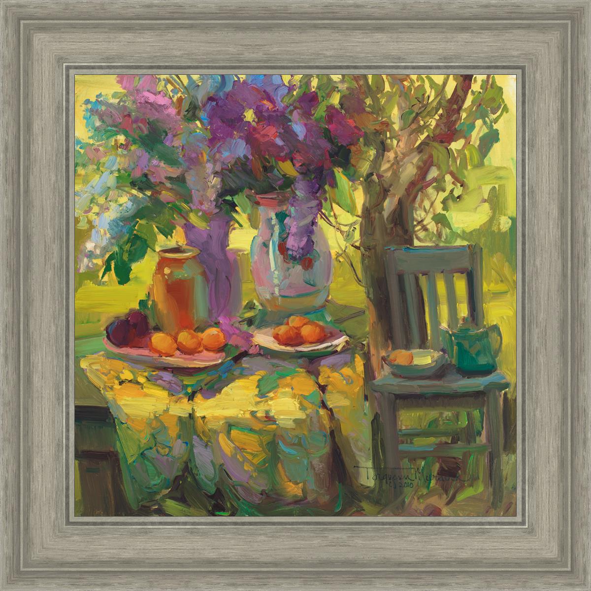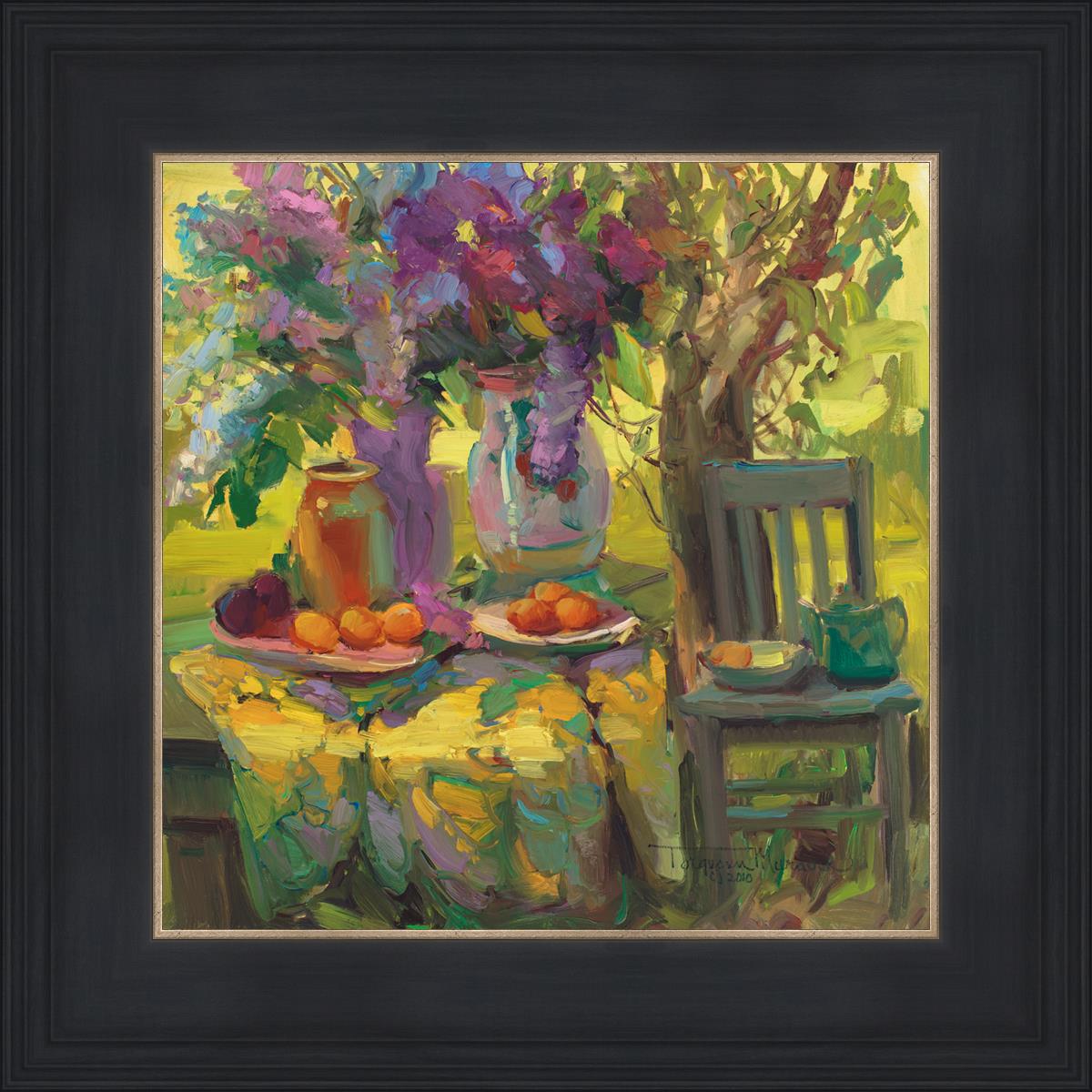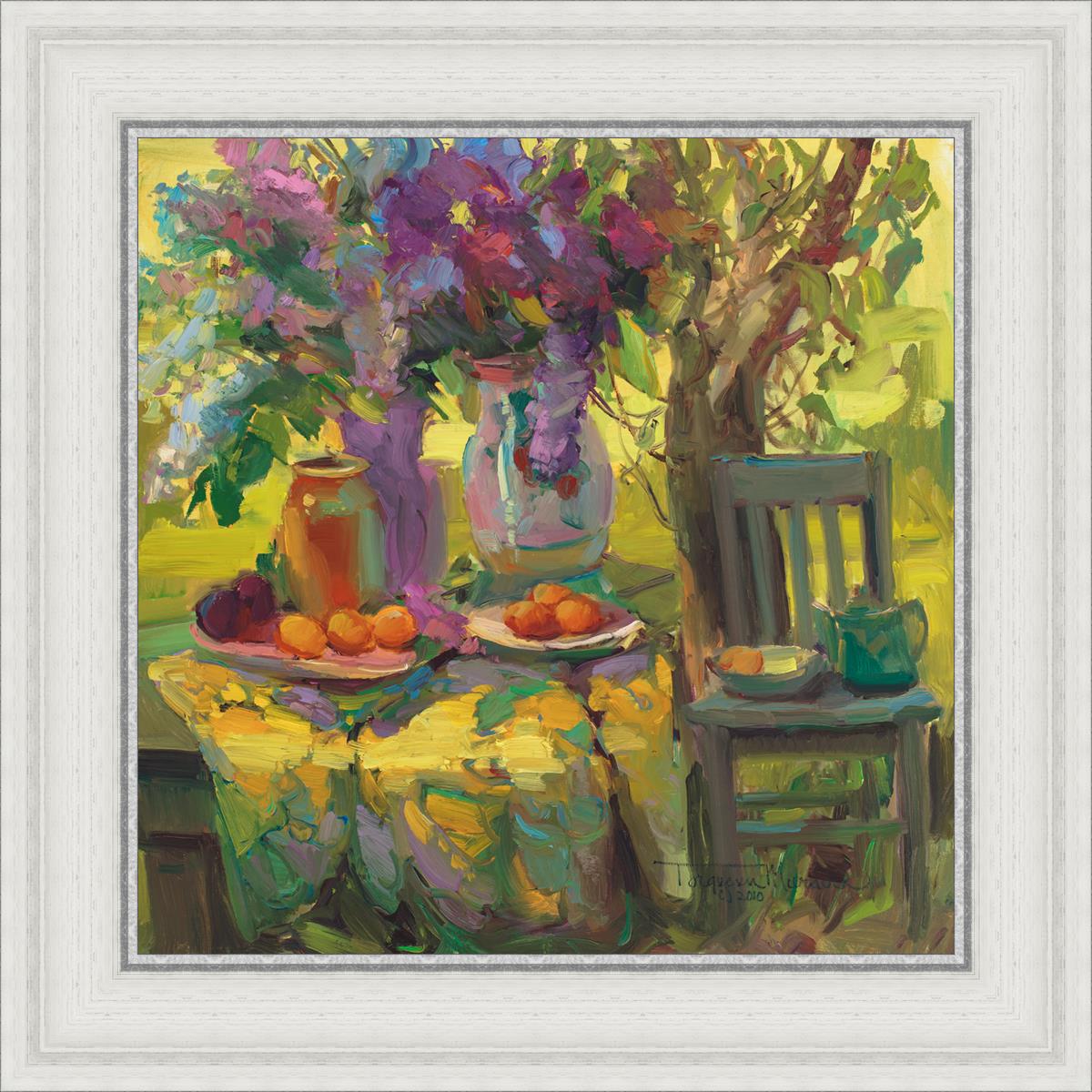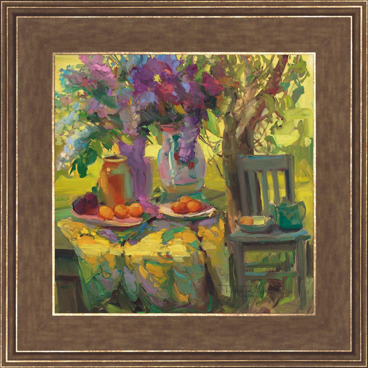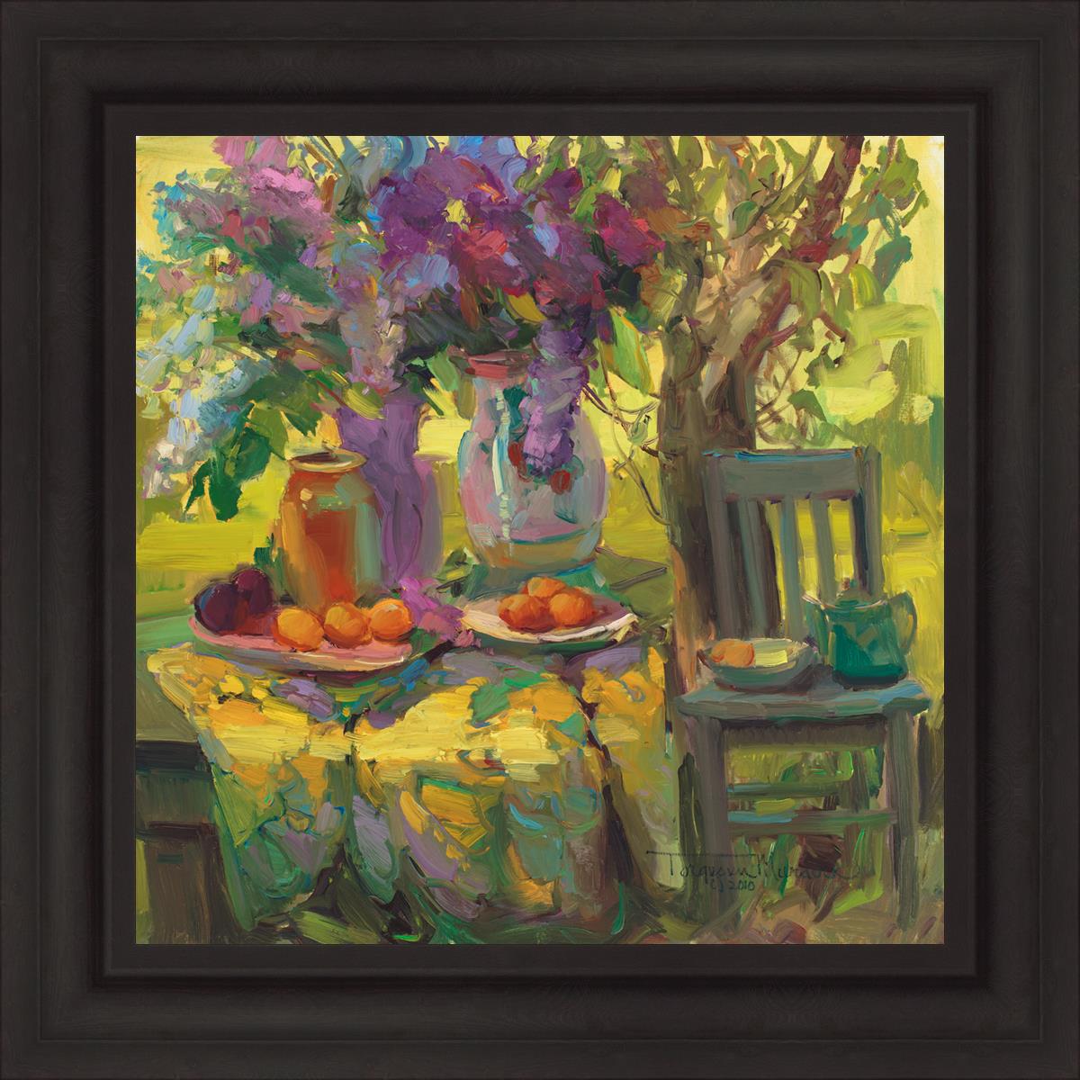 viridian and cobalt blue, and the sounds of little ladybugs and fireflies wafting around the set up. This painting was done outside on a cool evening in July under the spreading branches of a crab apple tree. The lavenders and cool pinks and greens are set off by the apricots and plums and the gold patterned cloth. It was awesome to be in the shade, looking through the still life to the green lawn made yellow by the sunlight. Can this be described as complete peace? I still feel the evening softness when I look at this painting.