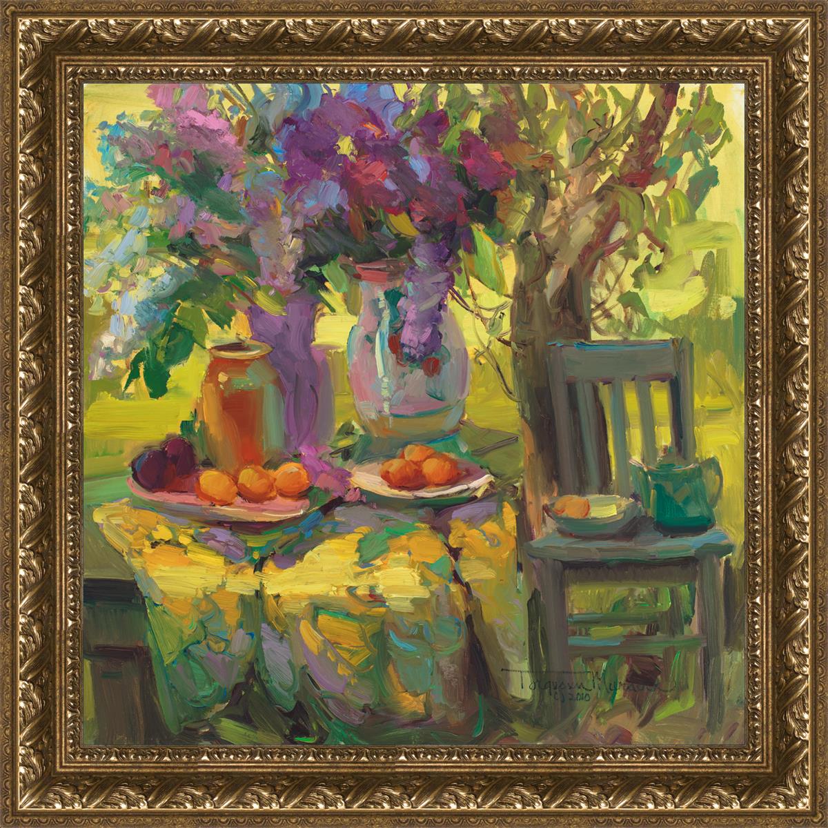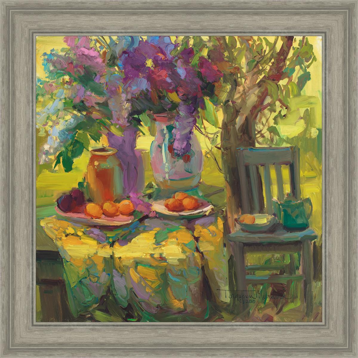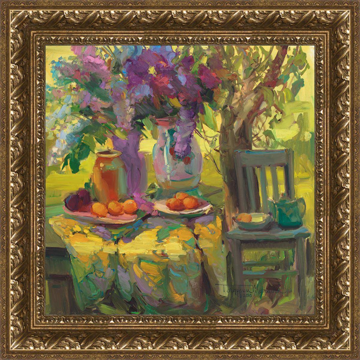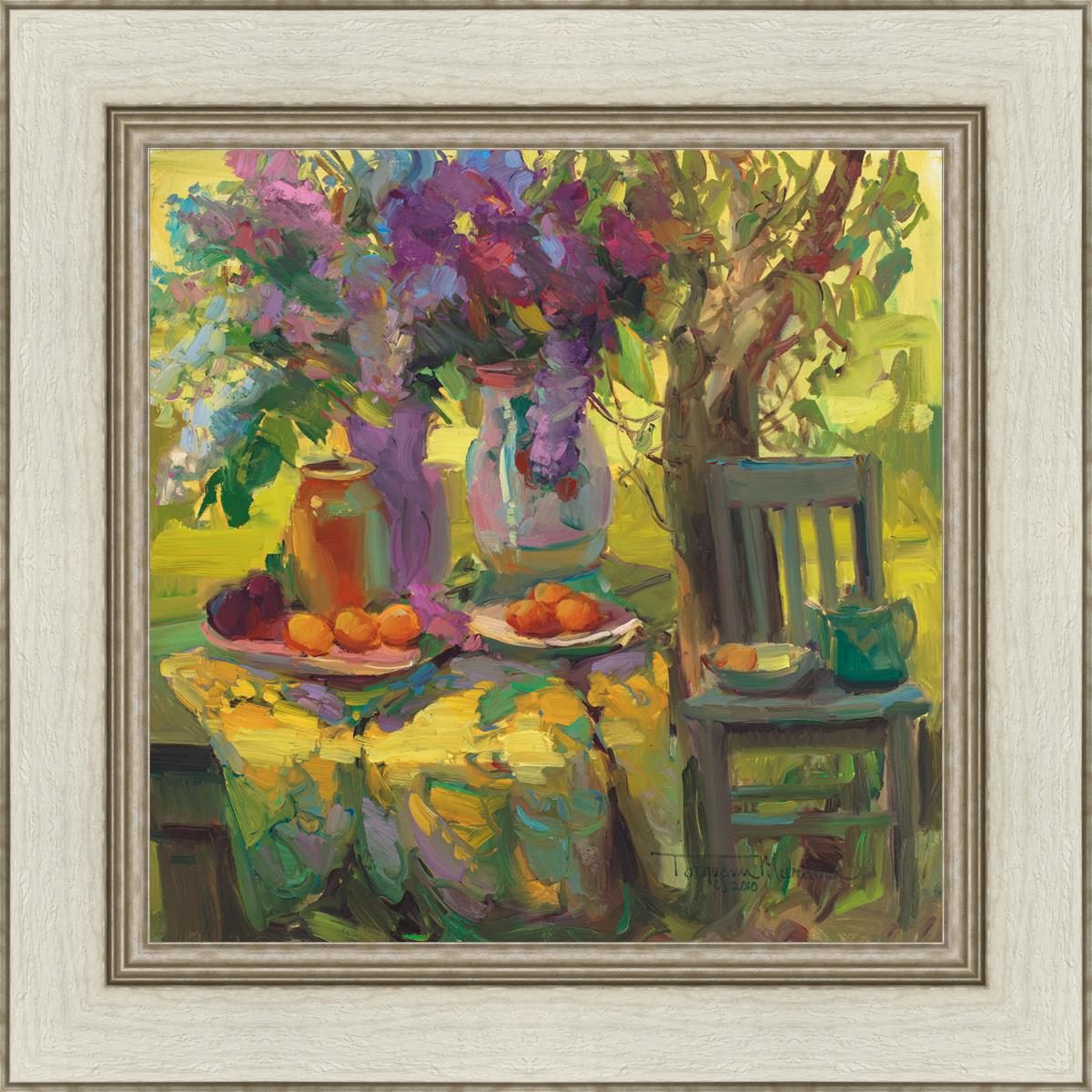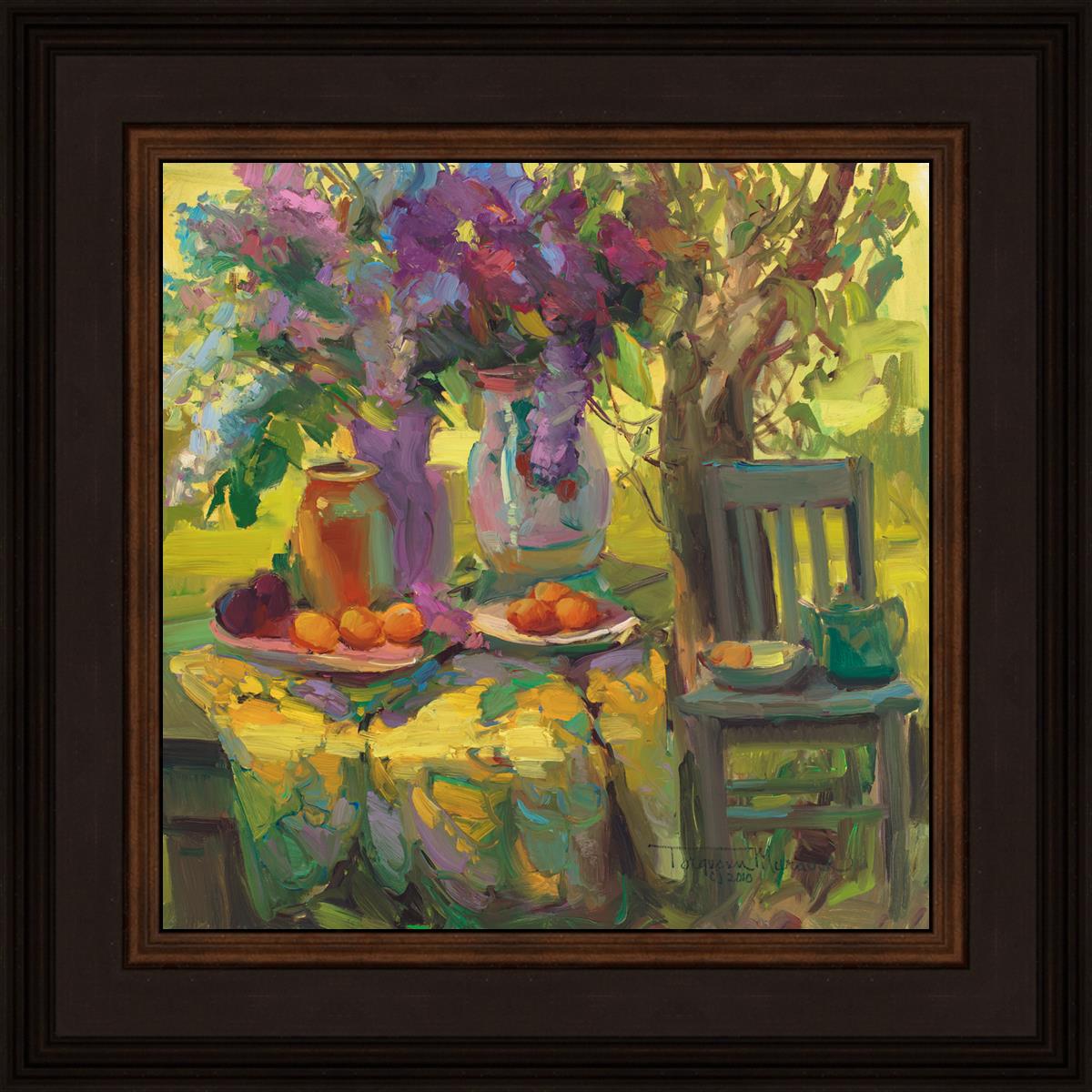 viridian and cobalt blue, and the sounds of little ladybugs and fireflies wafting around the set up. This painting was done outside on a cool evening in July under the spreading branches of a crab apple tree. The lavenders and cool pinks and greens are set off by the apricots and plums and the gold patterned cloth. It was awesome to be in the shade, looking through the still life to the green lawn made yellow by the sunlight. Can this be described as complete peace? I still feel the evening softness when I look at this painting.