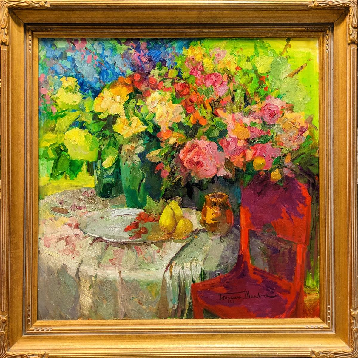Torgesen Murdock painted this delightful painting outside for a few hours each day from 10 to 1. The painting speaks of summer with the roses in a mass and a satin tablecloth creating the soft sheen of water on which the different items sit. The shadow on the chair pushes the brilliant glow of the flowers to the forefront and lets the viewer find cool rest for their eyes behind. If anything could be better on a summer day than sitting in the cool breeze and painting the glories of color in thick juicy paint, the artist would ask you what that could possibly be? Perhaps this painting will bring you the same enjoyment.