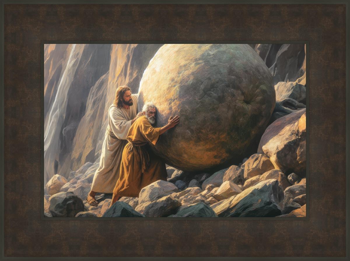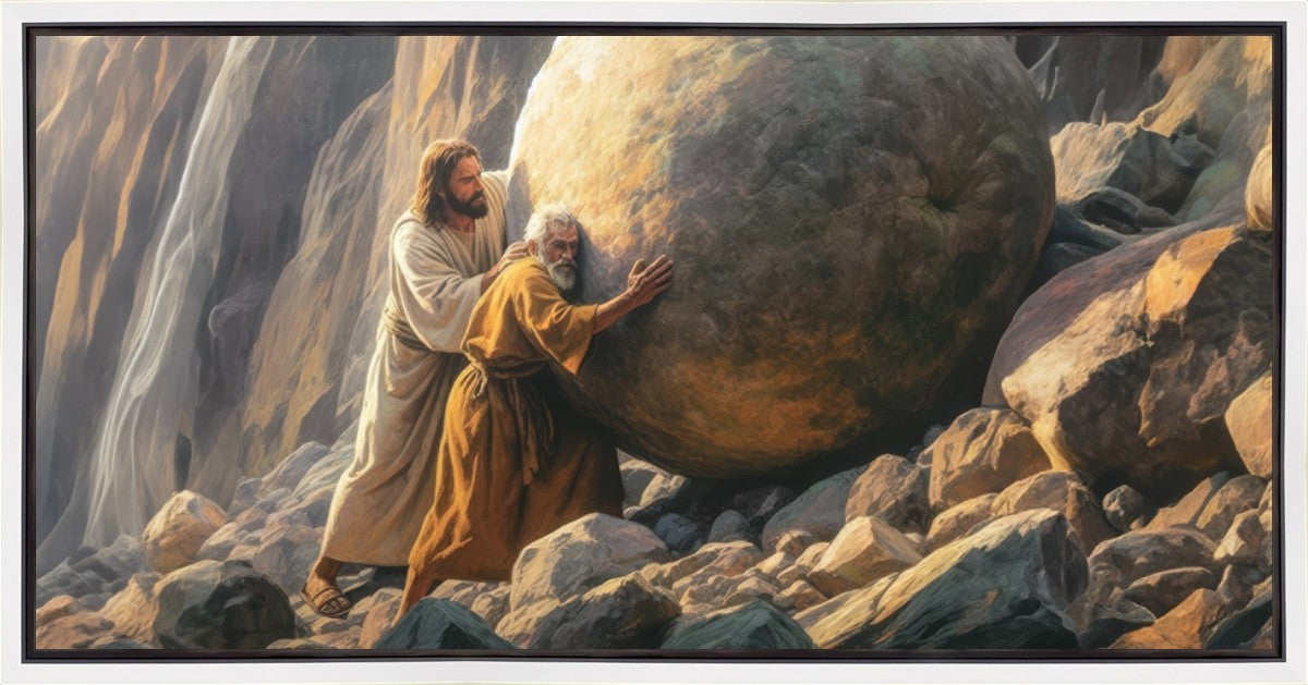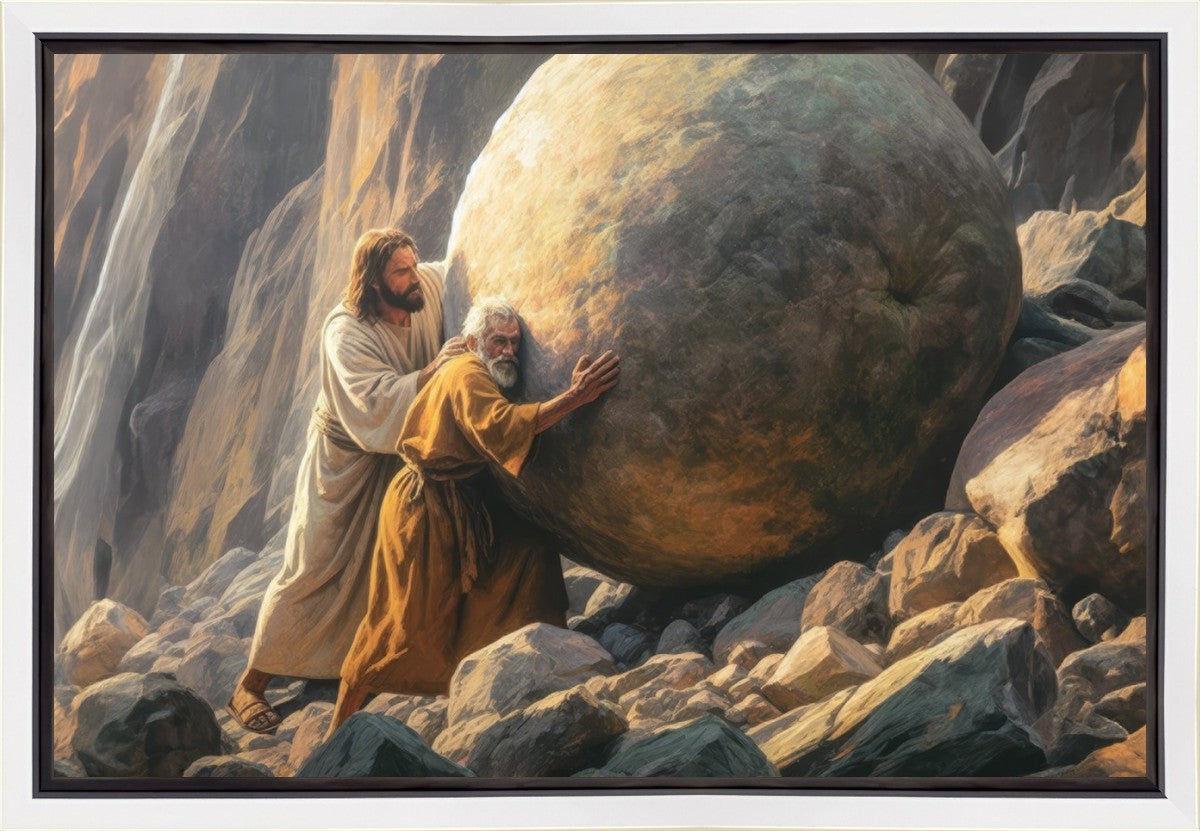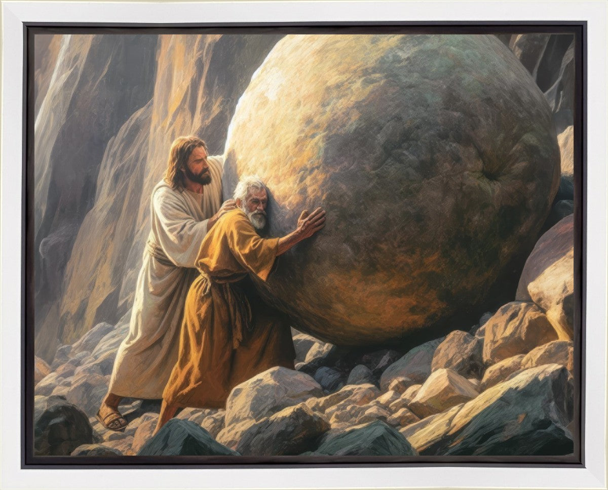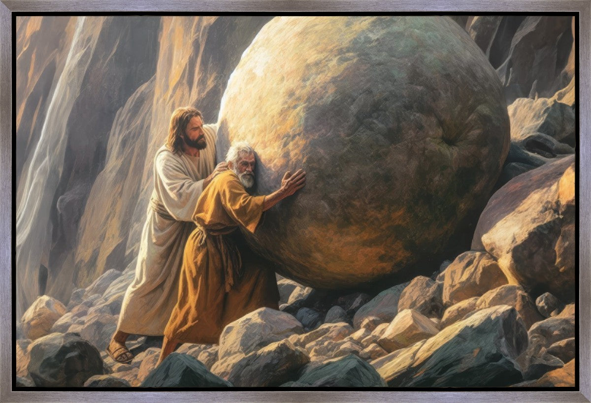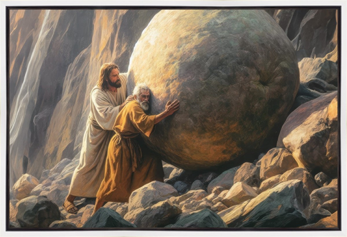 Inspired by the myth of Sisyphus, "Redemption's Ascent," features an old man pushing a heavy stone up a rocky slope. The story of Sisyphus tells of a man condemned to endlessly push a boulder uphill, only to watch it roll back down each time. Similarly, the old man in our painting represents humanity's struggles with sin and redemption. But in our version, Jesus stands beside him, sharing the burden. With Jesus by his side, the narrative changes. Jesus offers strength and support, transforming the journey from one of despair to one of hope and redemption.