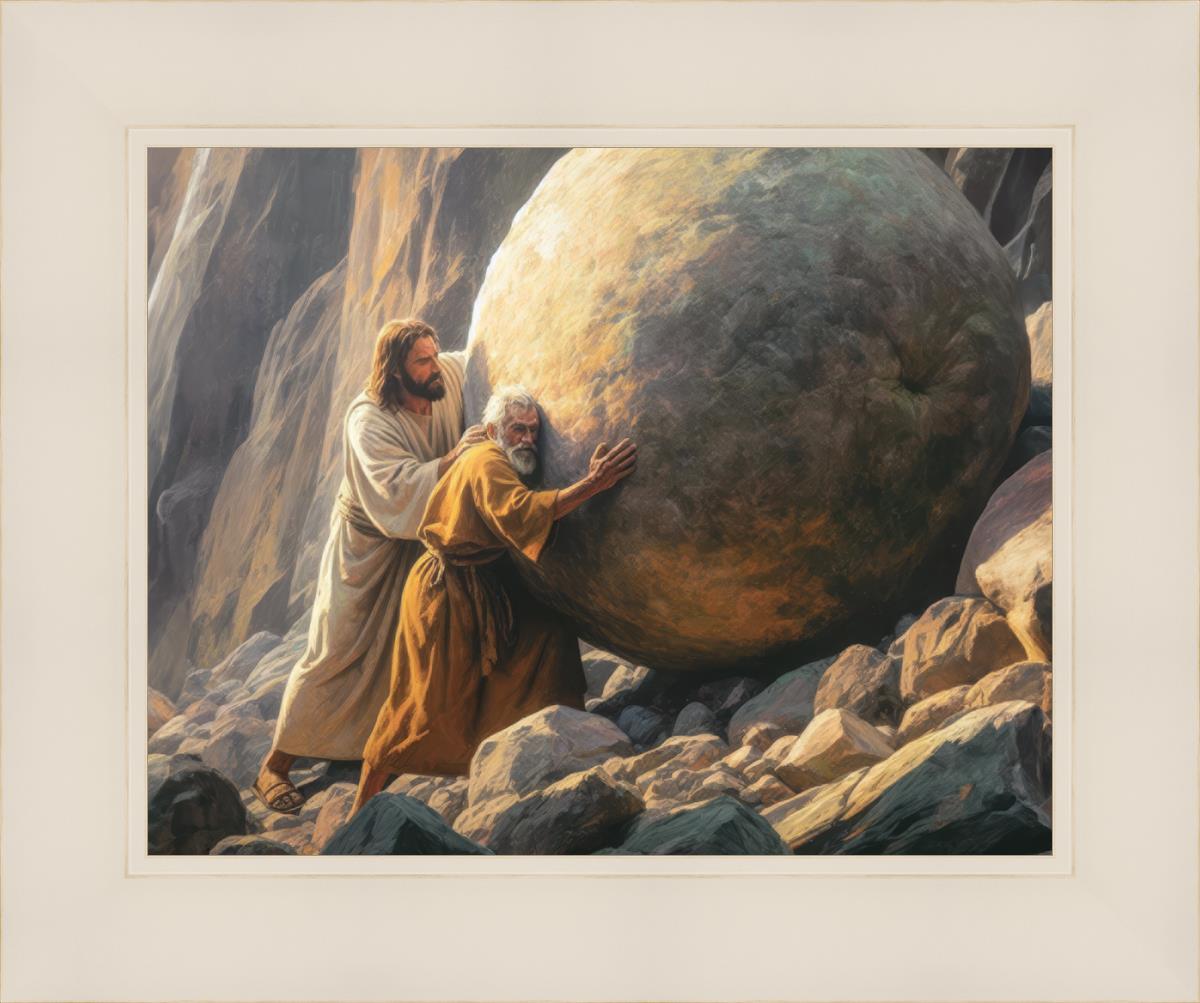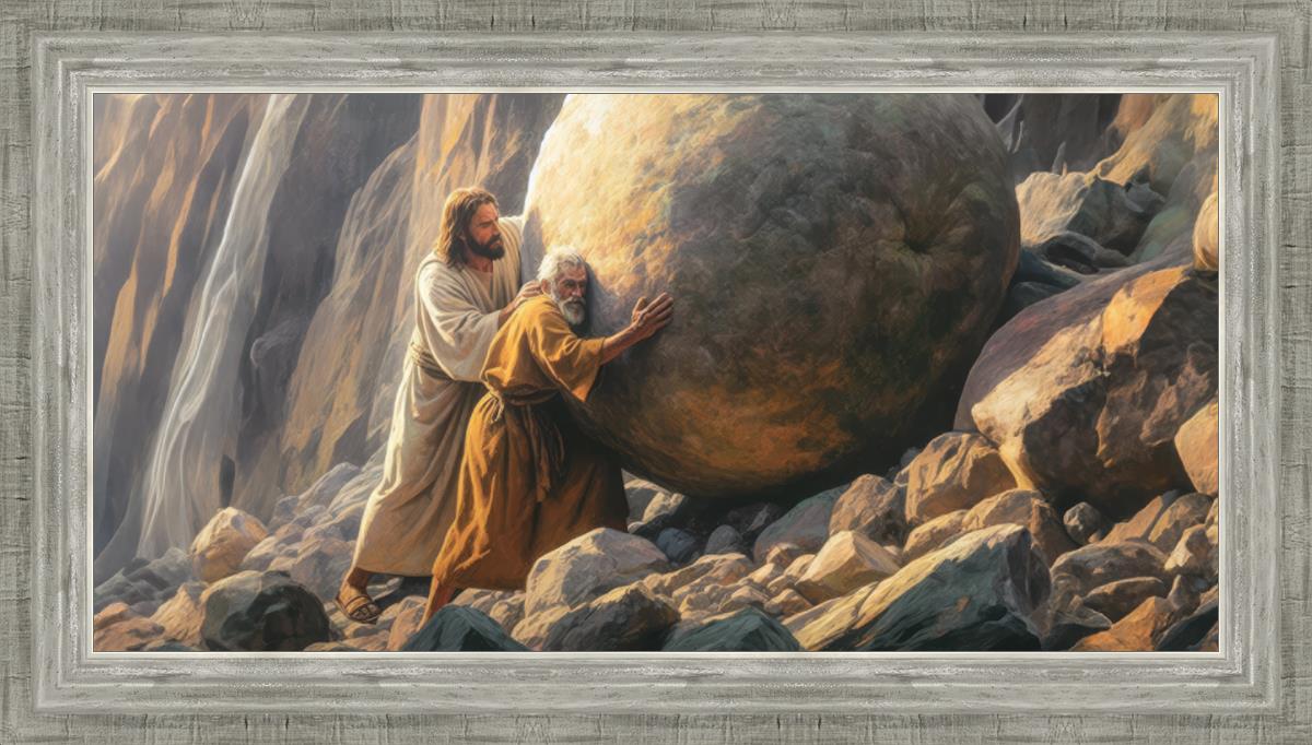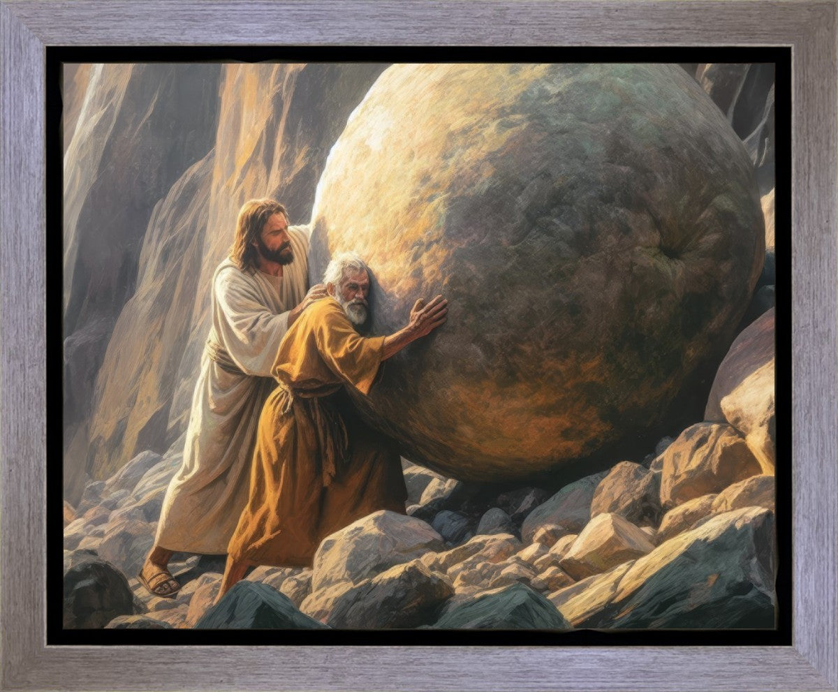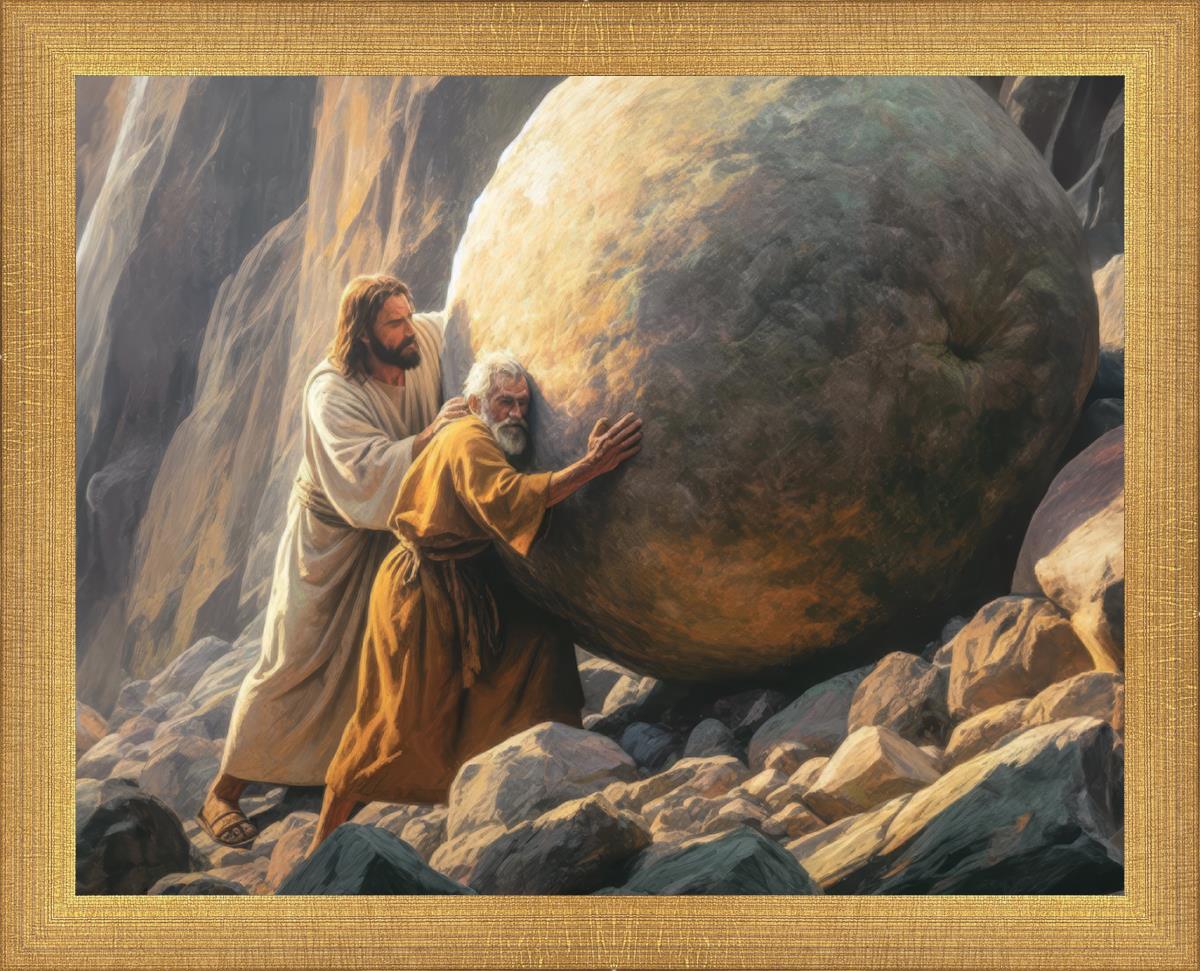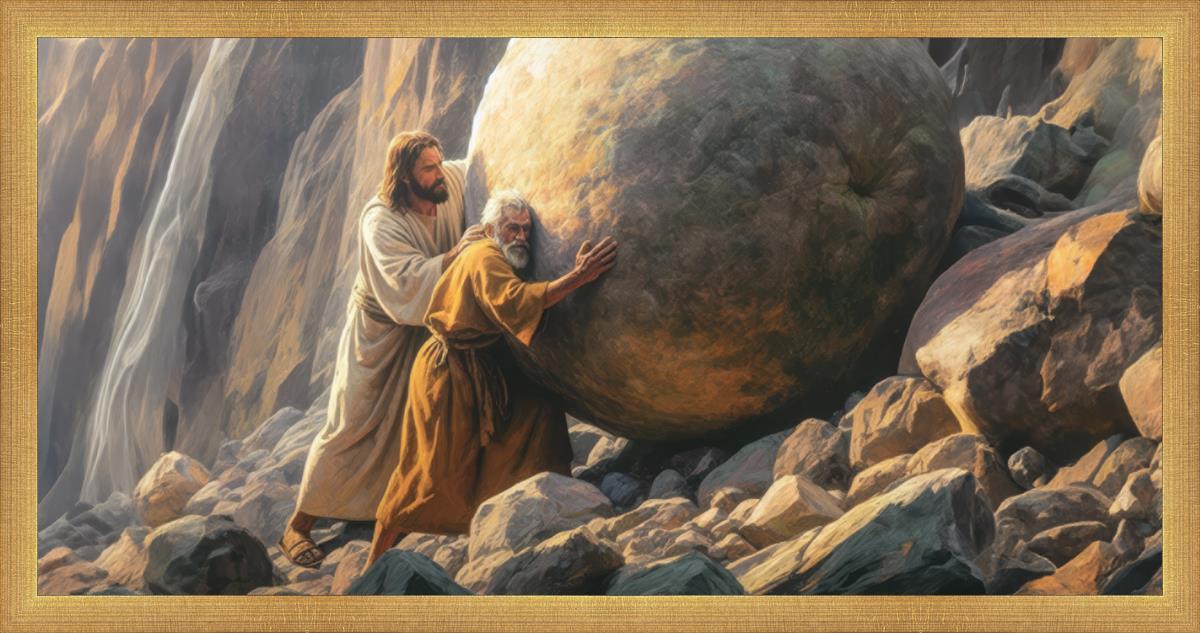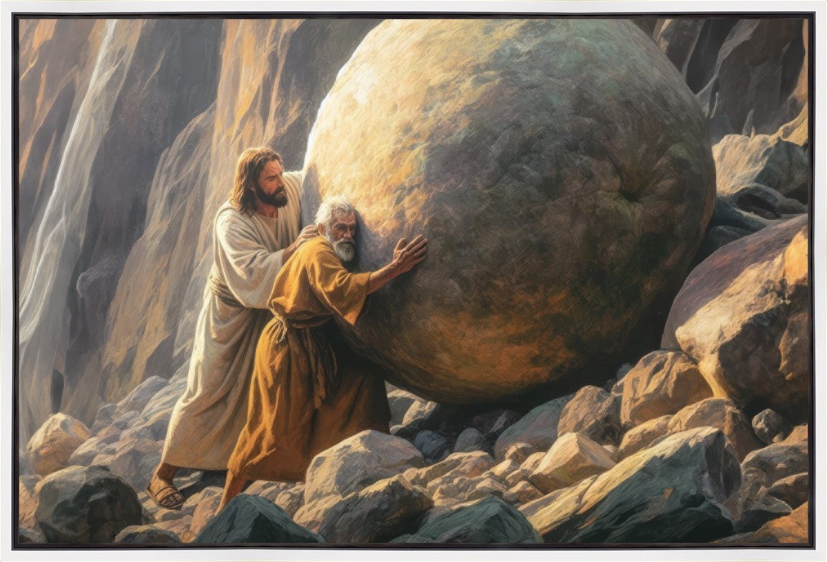 Inspired by the myth of Sisyphus, "Redemption's Ascent," features an old man pushing a heavy stone up a rocky slope. The story of Sisyphus tells of a man condemned to endlessly push a boulder uphill, only to watch it roll back down each time. Similarly, the old man in our painting represents humanity's struggles with sin and redemption. But in our version, Jesus stands beside him, sharing the burden. With Jesus by his side, the narrative changes. Jesus offers strength and support, transforming the journey from one of despair to one of hope and redemption.