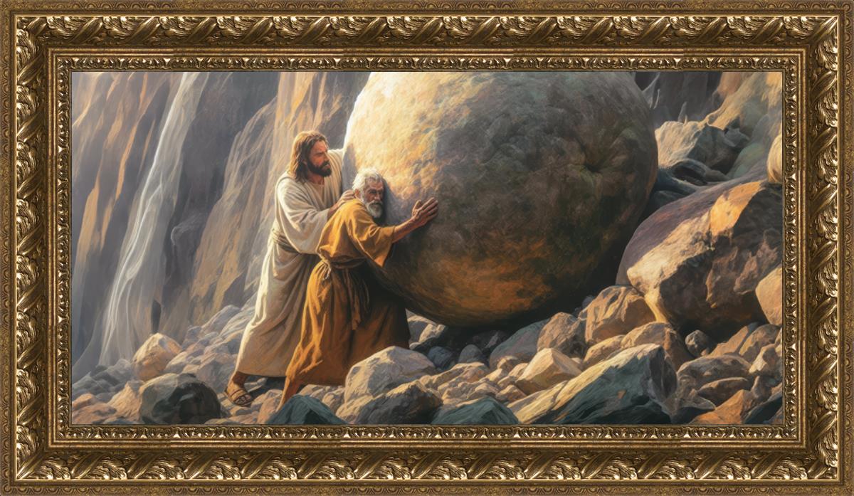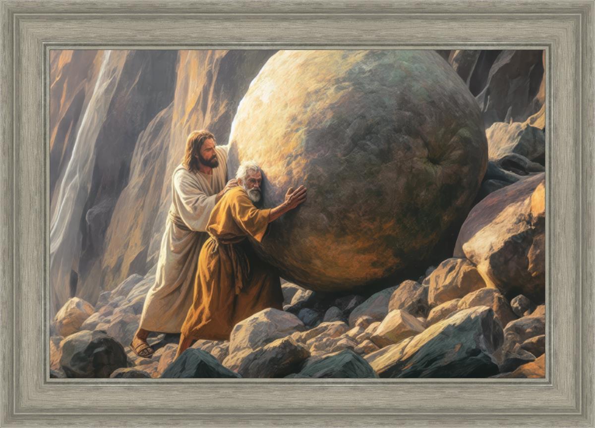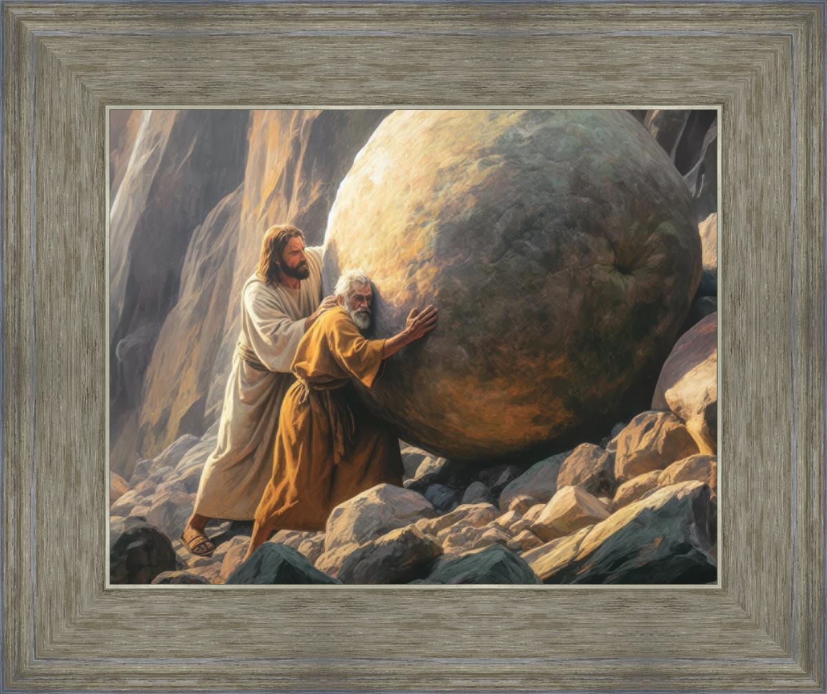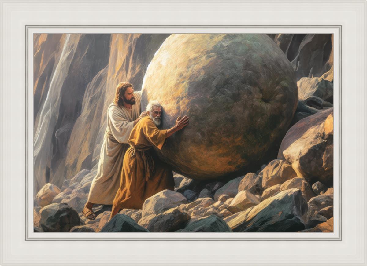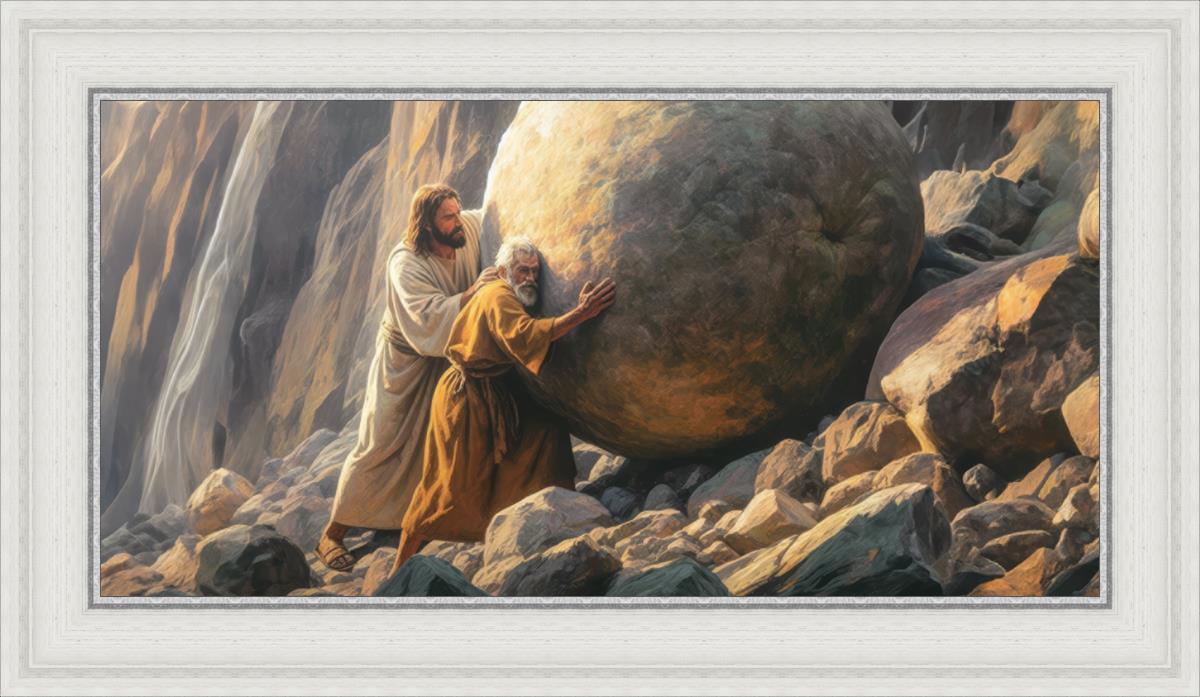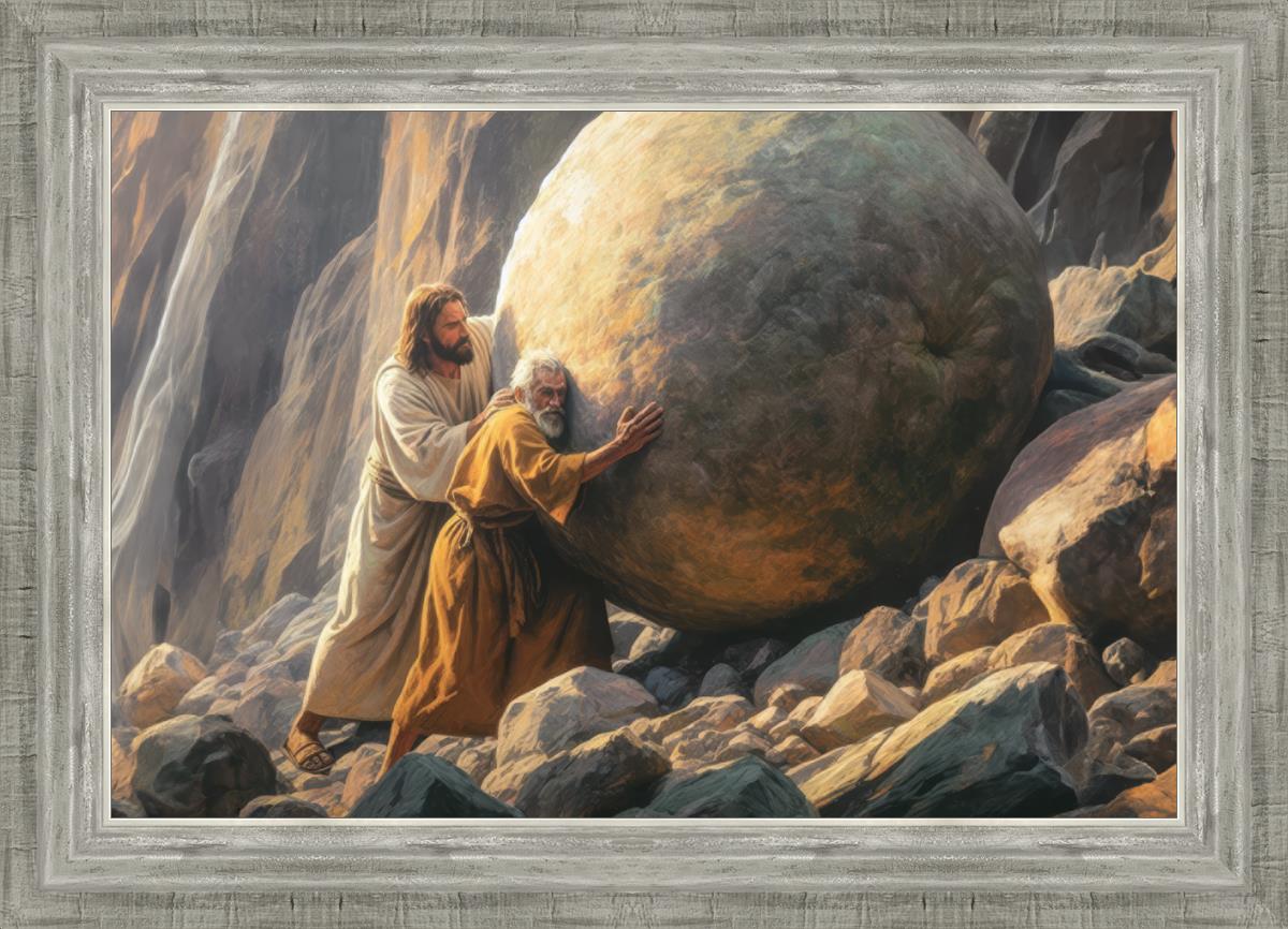 Inspired by the myth of Sisyphus, "Redemption's Ascent," features an old man pushing a heavy stone up a rocky slope. The story of Sisyphus tells of a man condemned to endlessly push a boulder uphill, only to watch it roll back down each time. Similarly, the old man in our painting represents humanity's struggles with sin and redemption. But in our version, Jesus stands beside him, sharing the burden. With Jesus by his side, the narrative changes. Jesus offers strength and support, transforming the journey from one of despair to one of hope and redemption.
