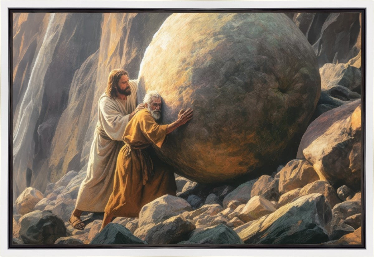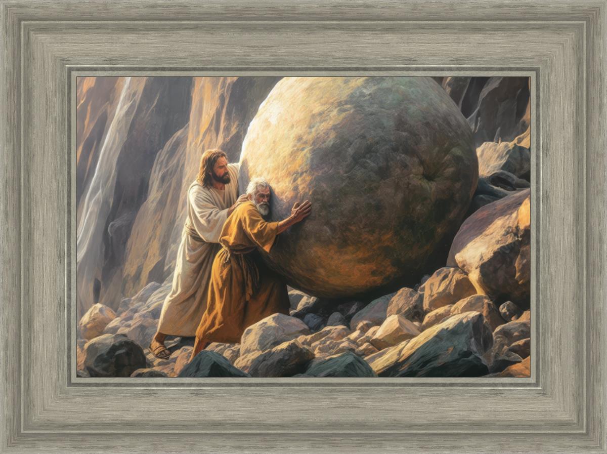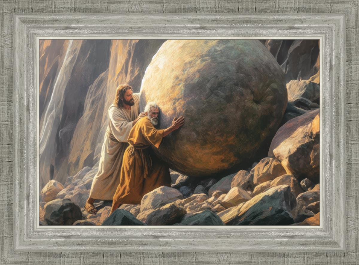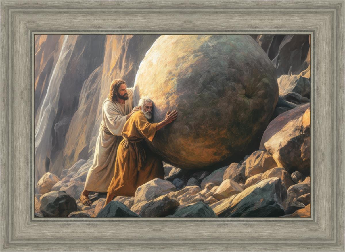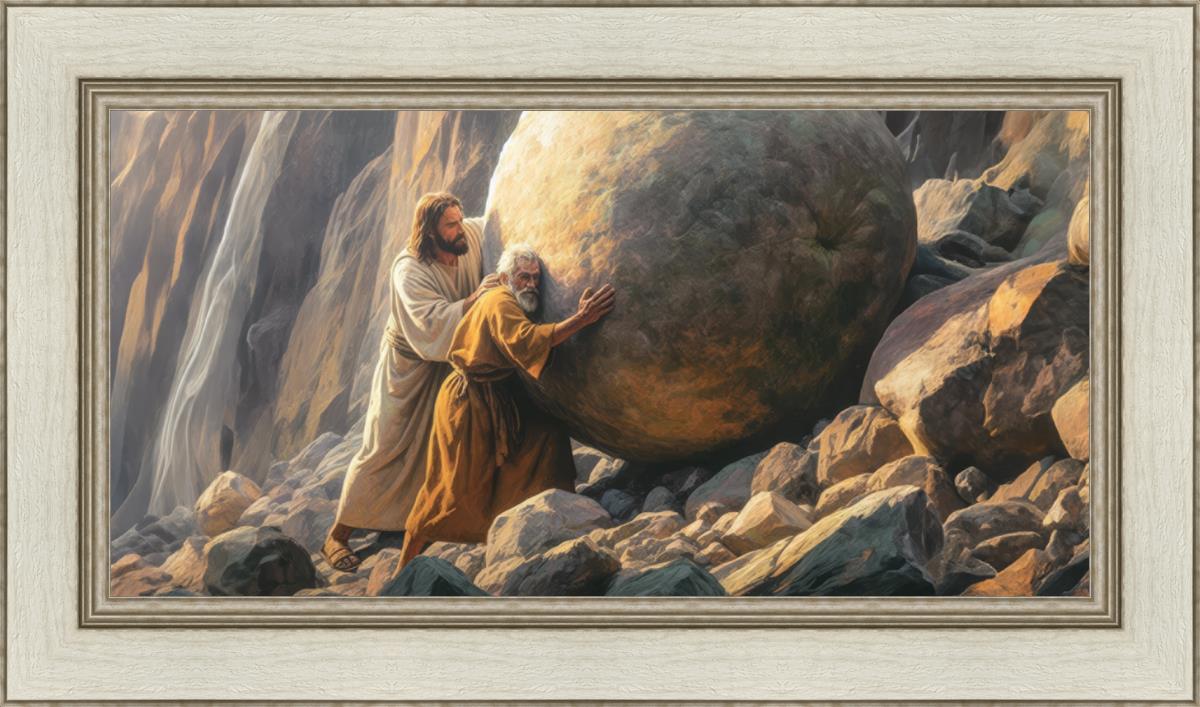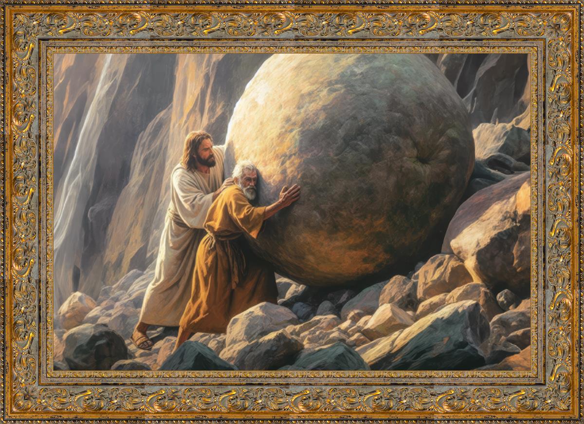 Inspired by the myth of Sisyphus, "Redemption's Ascent," features an old man pushing a heavy stone up a rocky slope. The story of Sisyphus tells of a man condemned to endlessly push a boulder uphill, only to watch it roll back down each time. Similarly, the old man in our painting represents humanity's struggles with sin and redemption. But in our version, Jesus stands beside him, sharing the burden. With Jesus by his side, the narrative changes. Jesus offers strength and support, transforming the journey from one of despair to one of hope and redemption.