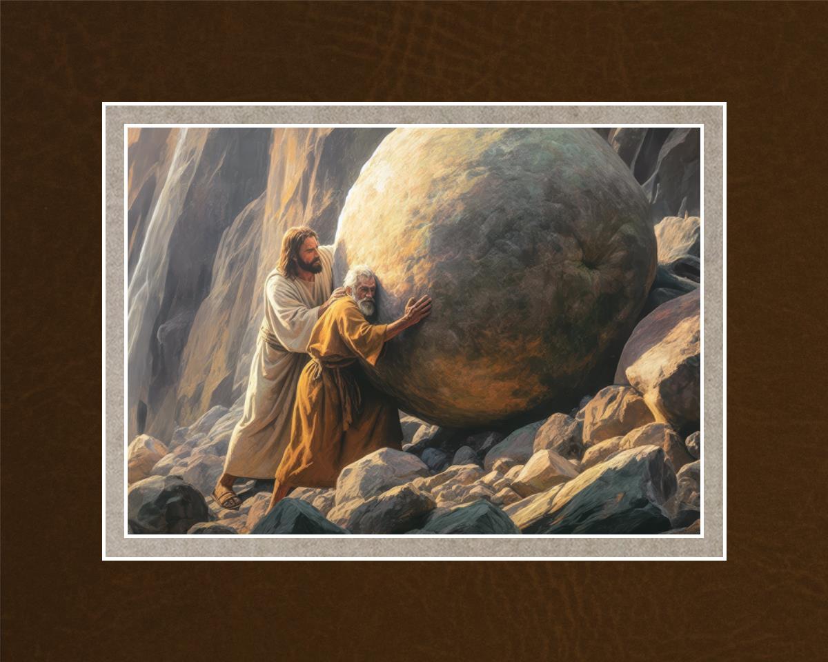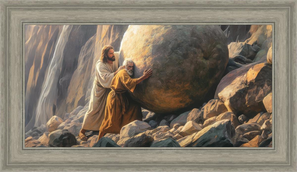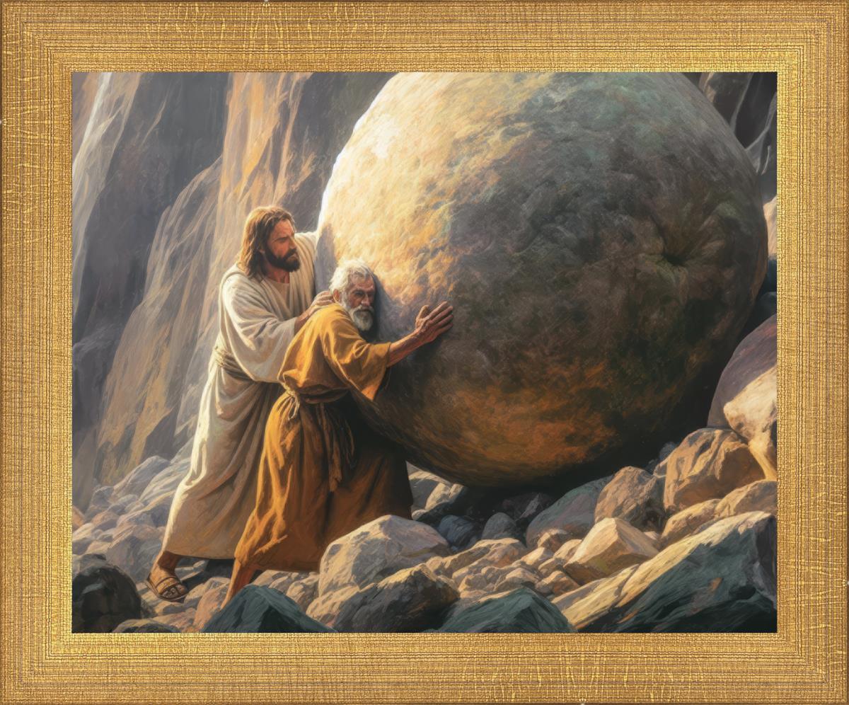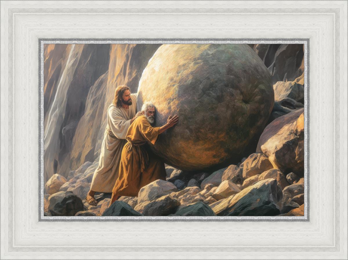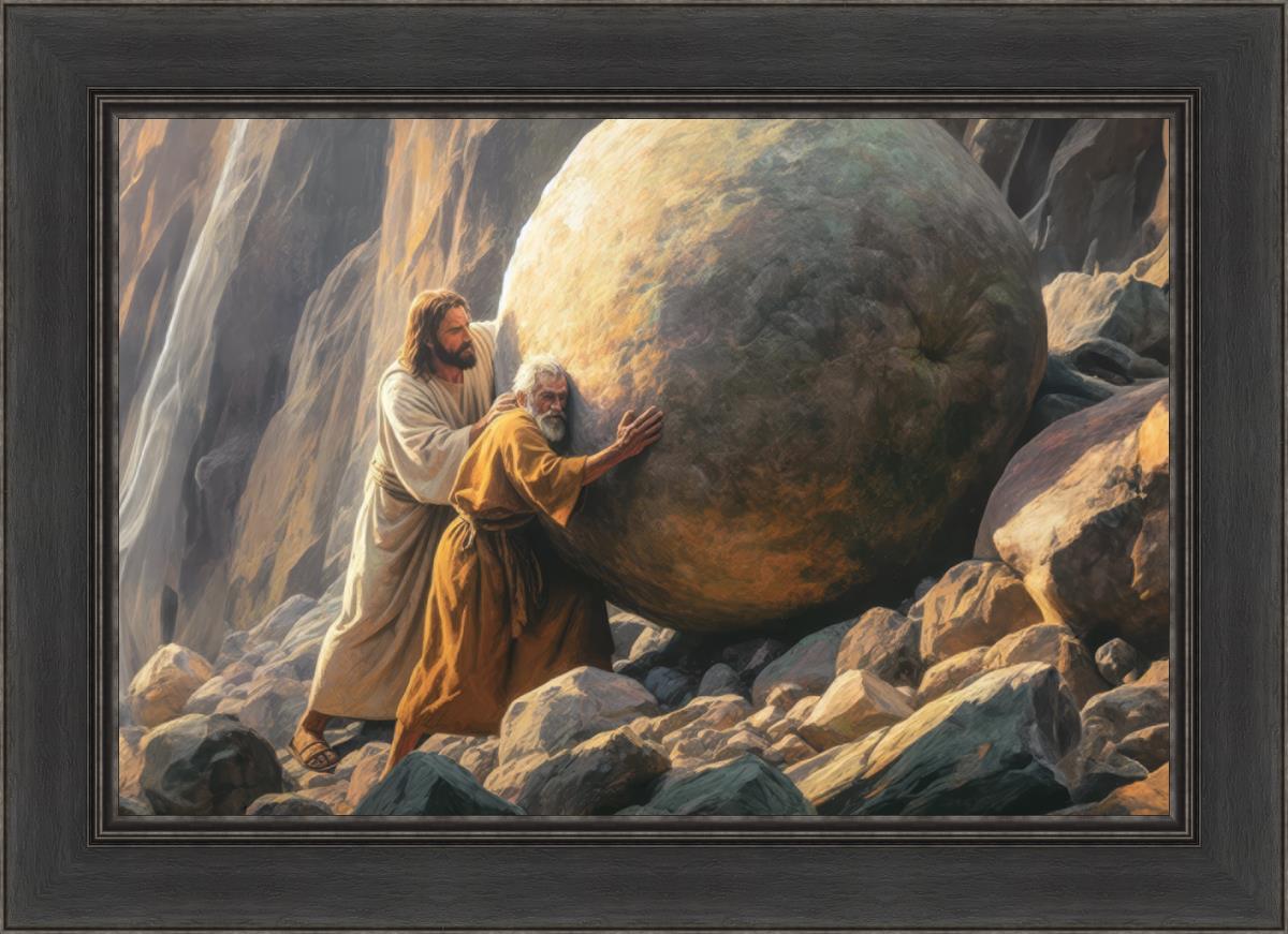 Inspired by the myth of Sisyphus, "Redemption's Ascent," features an old man pushing a heavy stone up a rocky slope. The story of Sisyphus tells of a man condemned to endlessly push a boulder uphill, only to watch it roll back down each time. Similarly, the old man in our painting represents humanity's struggles with sin and redemption. But in our version, Jesus stands beside him, sharing the burden. With Jesus by his side, the narrative changes. Jesus offers strength and support, transforming the journey from one of despair to one of hope and redemption.