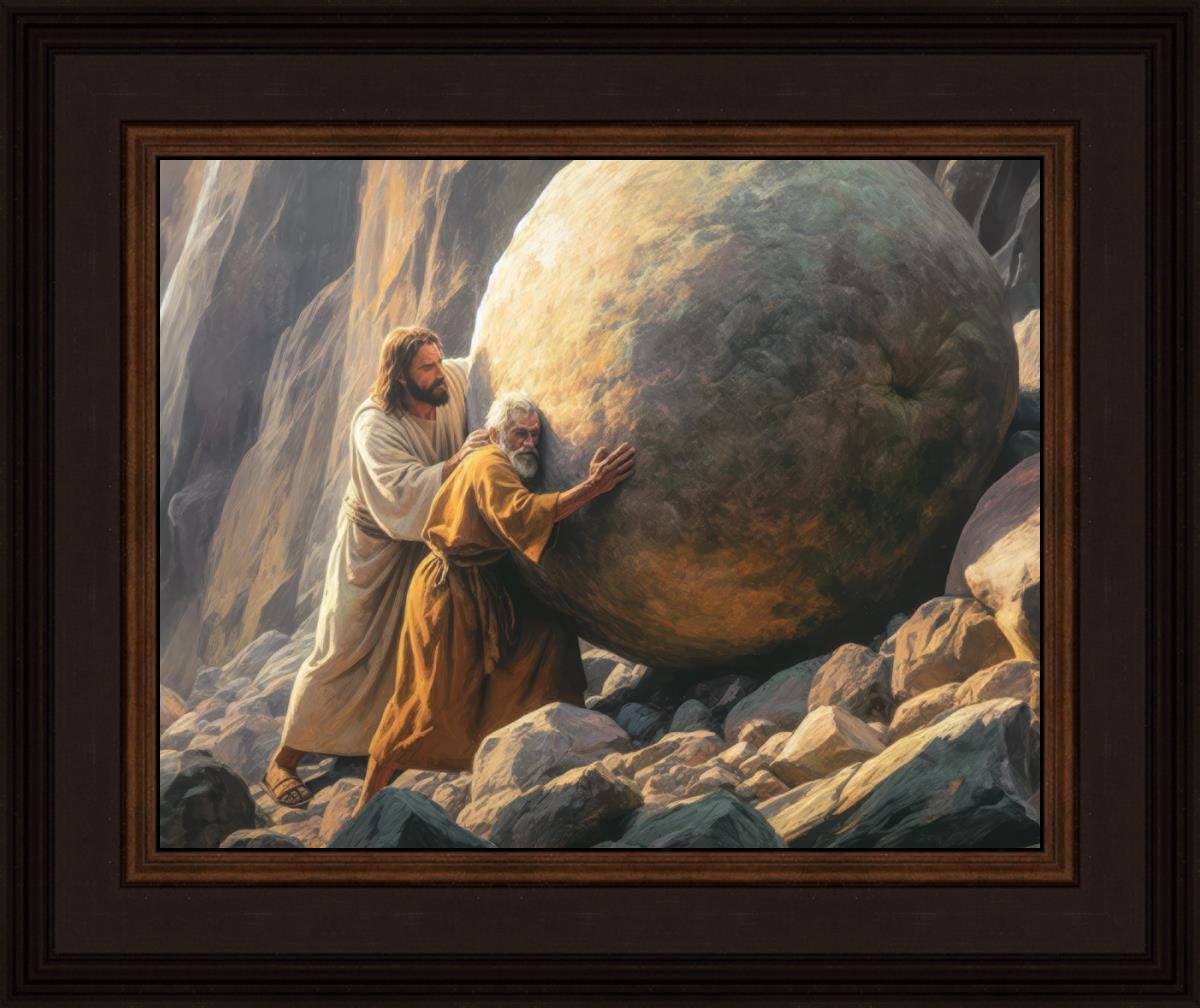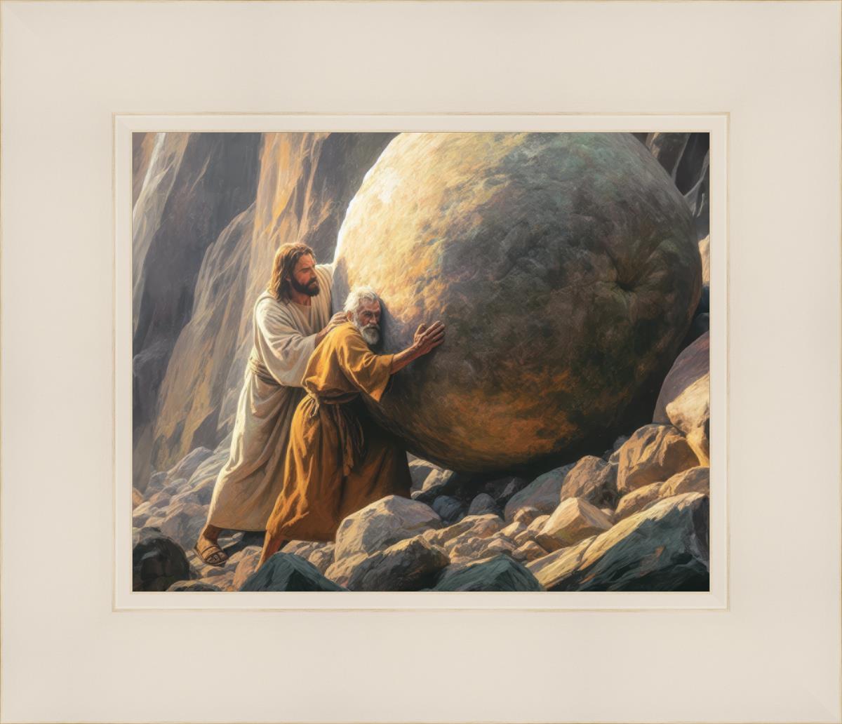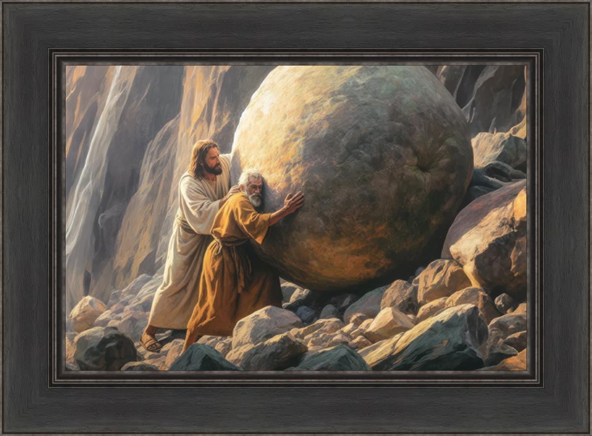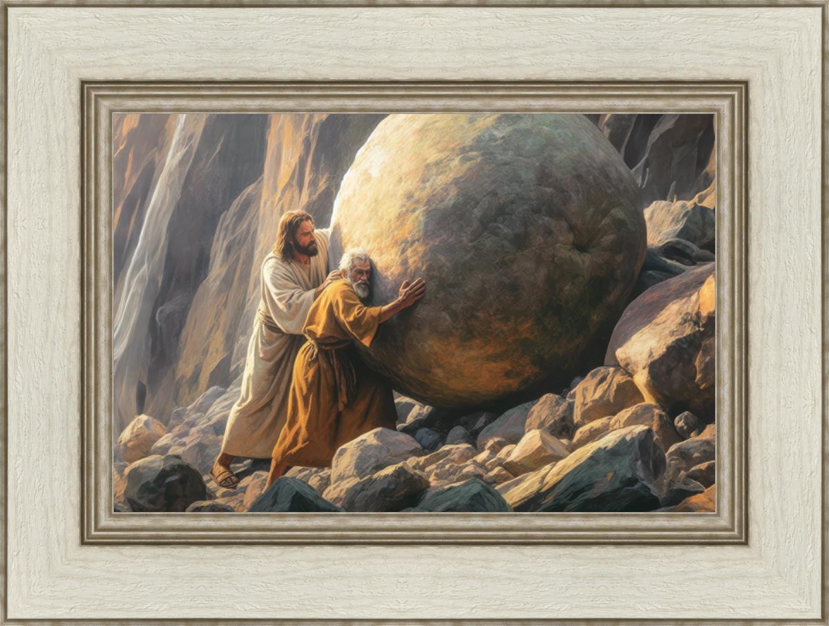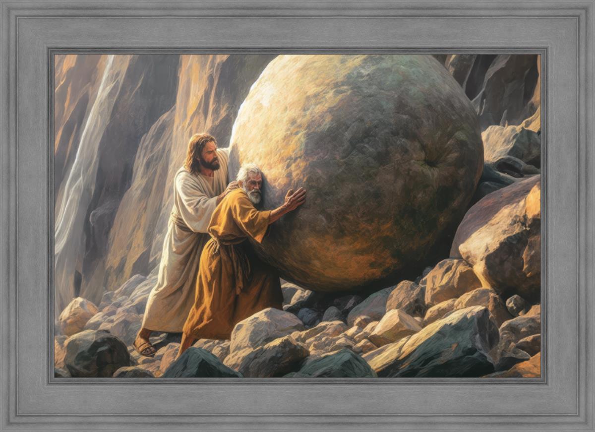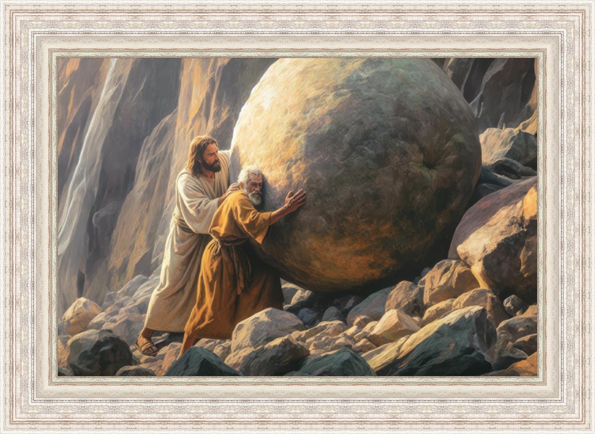 Inspired by the myth of Sisyphus, "Redemption's Ascent," features an old man pushing a heavy stone up a rocky slope. The story of Sisyphus tells of a man condemned to endlessly push a boulder uphill, only to watch it roll back down each time. Similarly, the old man in our painting represents humanity's struggles with sin and redemption. But in our version, Jesus stands beside him, sharing the burden. With Jesus by his side, the narrative changes. Jesus offers strength and support, transforming the journey from one of despair to one of hope and redemption.