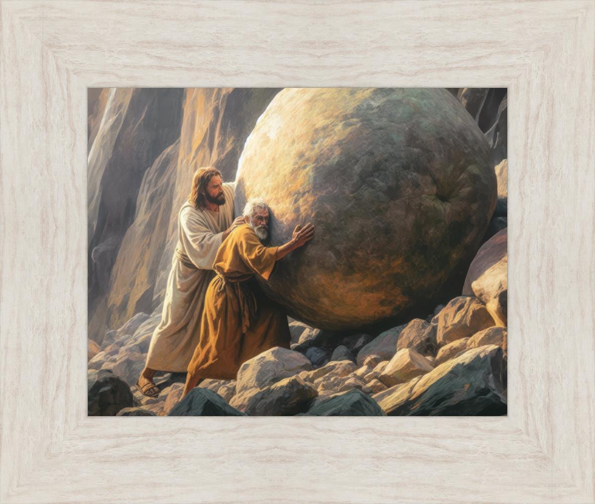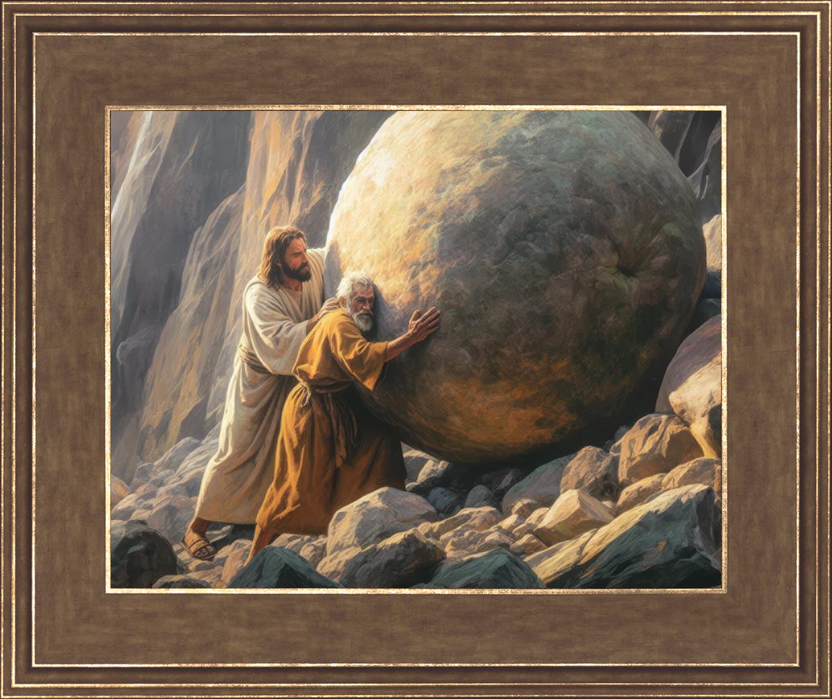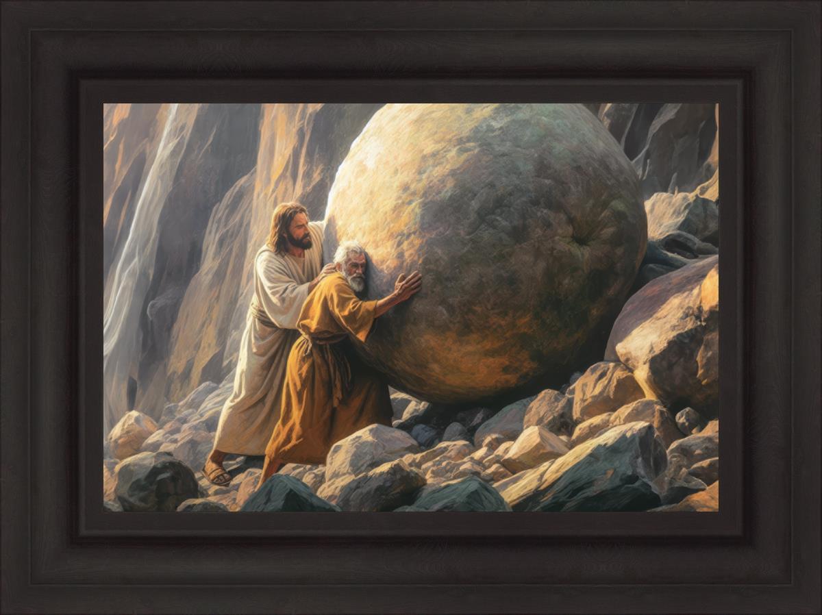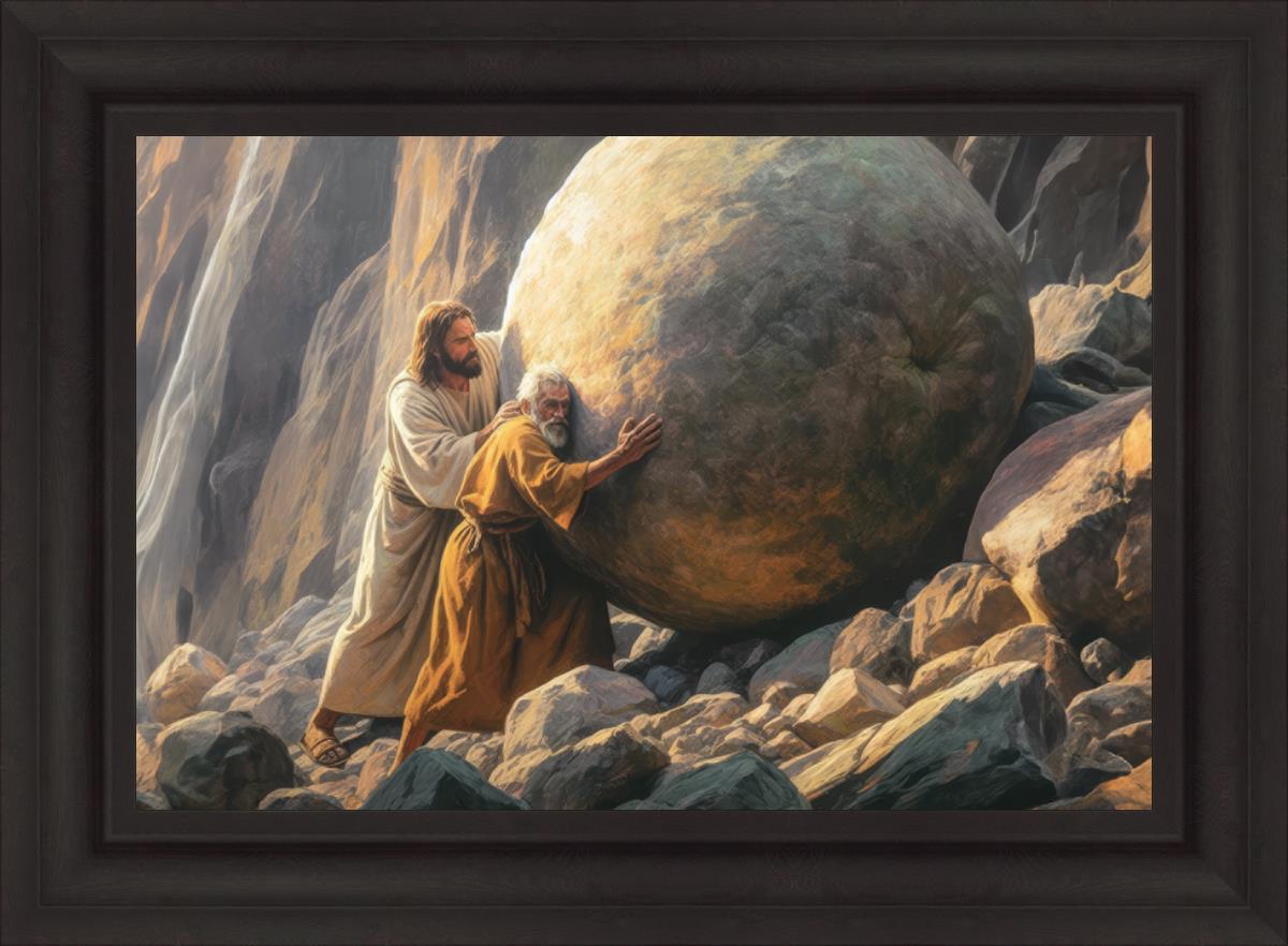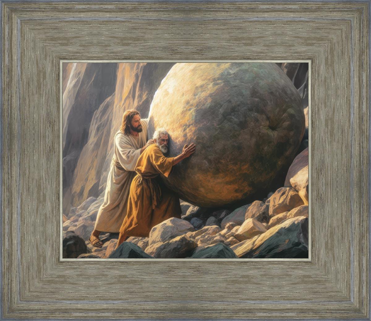 Inspired by the myth of Sisyphus, "Redemption's Ascent," features an old man pushing a heavy stone up a rocky slope. The story of Sisyphus tells of a man condemned to endlessly push a boulder uphill, only to watch it roll back down each time. Similarly, the old man in our painting represents humanity's struggles with sin and redemption. But in our version, Jesus stands beside him, sharing the burden. With Jesus by his side, the narrative changes. Jesus offers strength and support, transforming the journey from one of despair to one of hope and redemption.