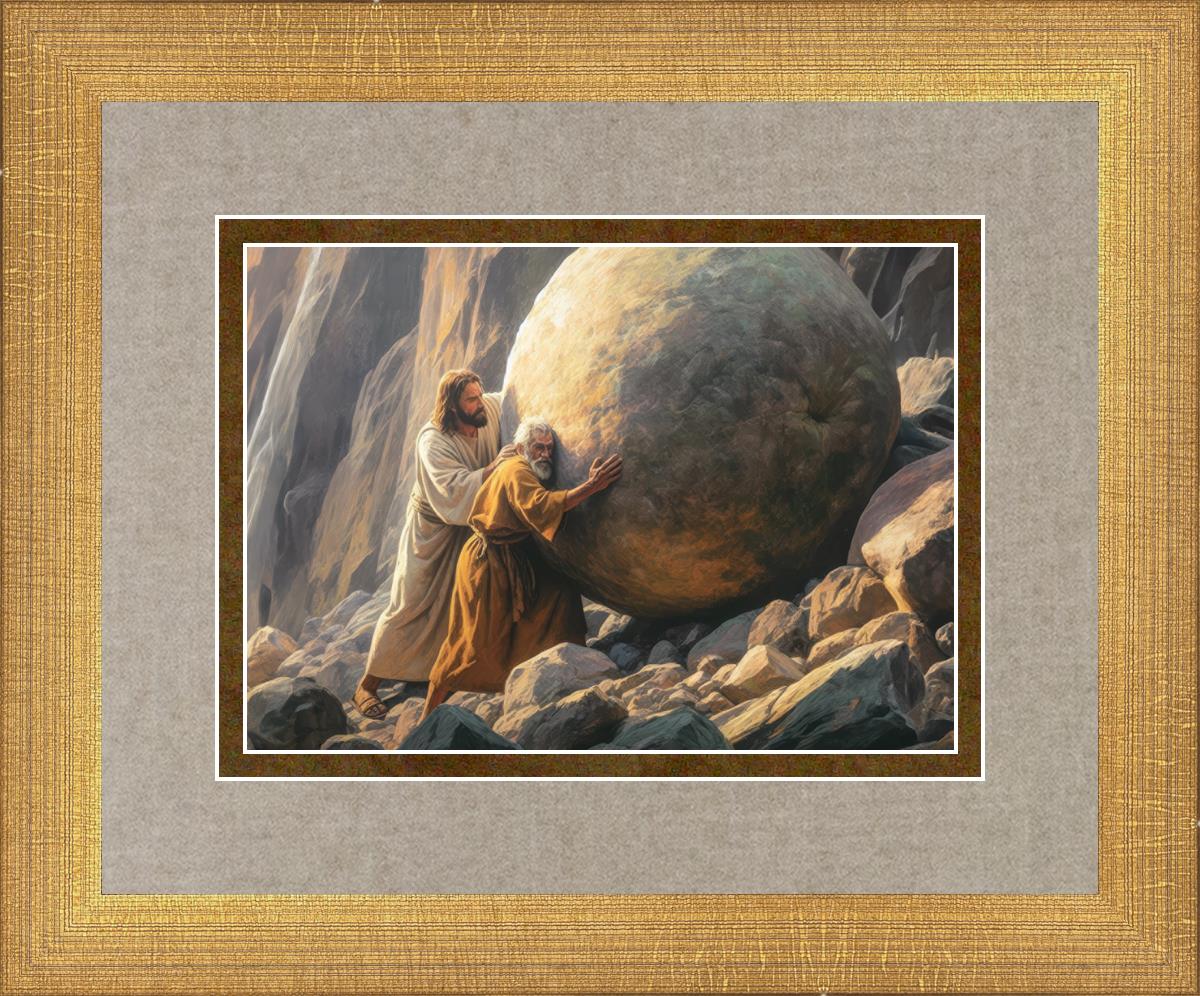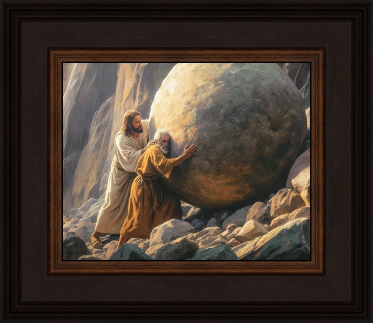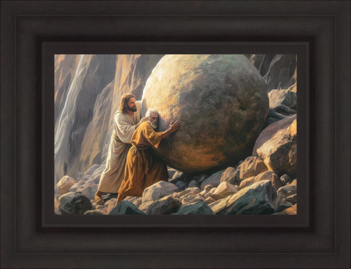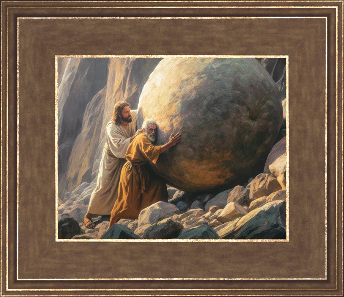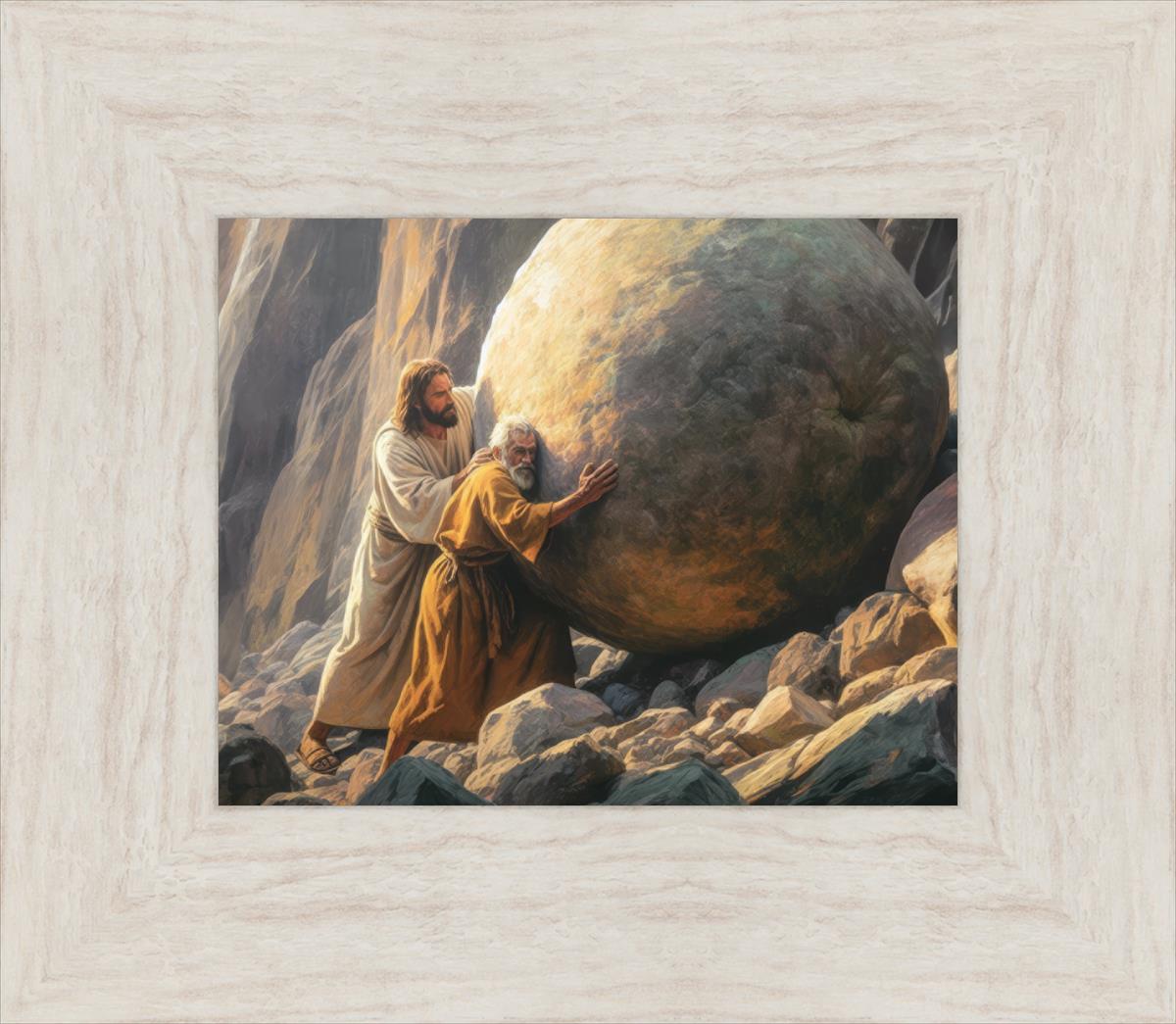 Inspired by the myth of Sisyphus, "Redemption's Ascent," features an old man pushing a heavy stone up a rocky slope. The story of Sisyphus tells of a man condemned to endlessly push a boulder uphill, only to watch it roll back down each time. Similarly, the old man in our painting represents humanity's struggles with sin and redemption. But in our version, Jesus stands beside him, sharing the burden. With Jesus by his side, the narrative changes. Jesus offers strength and support, transforming the journey from one of despair to one of hope and redemption.