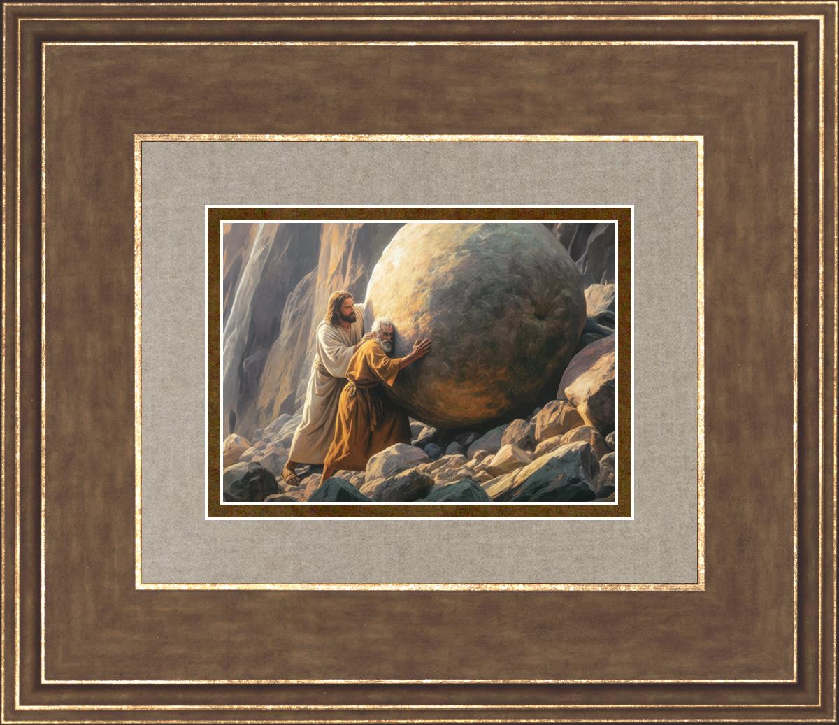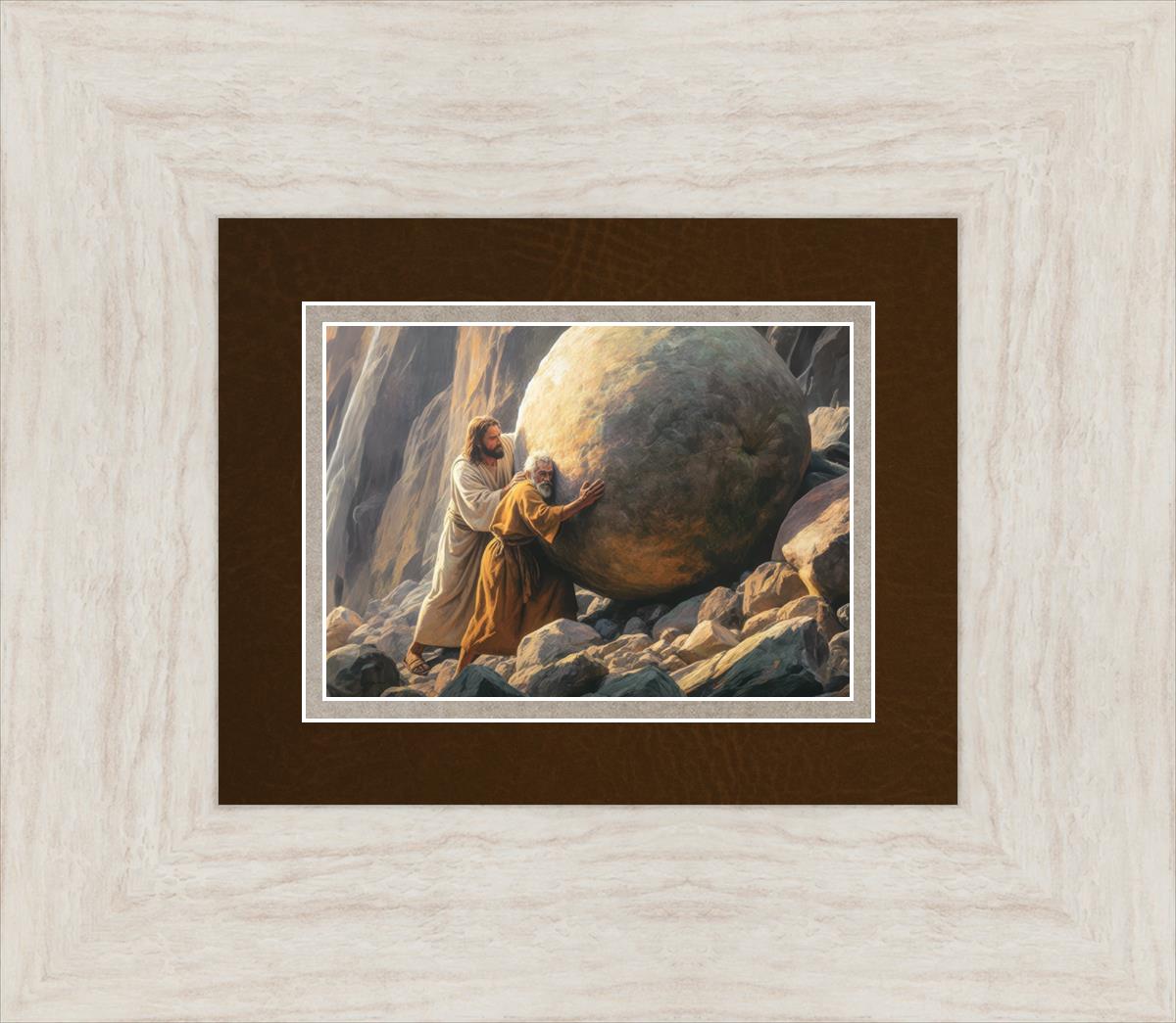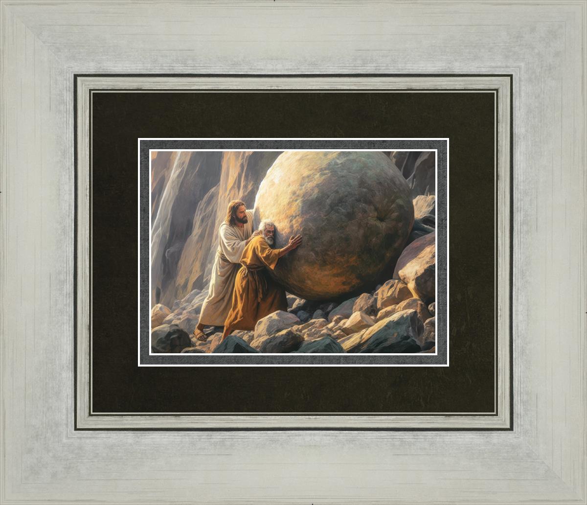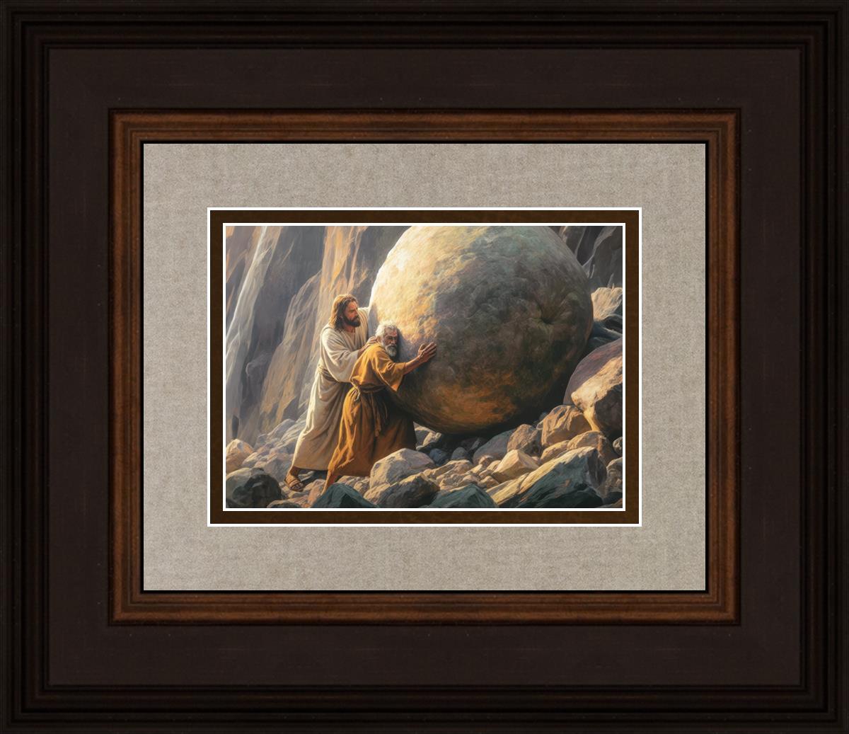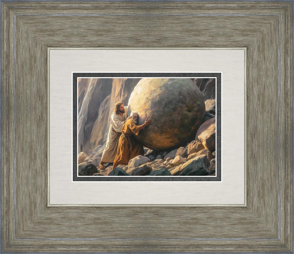Inspired by the myth of Sisyphus, "Redemption's Ascent," features an old man pushing a heavy stone up a rocky slope. The story of Sisyphus tells of a man condemned to endlessly push a boulder uphill, only to watch it roll back down each time. Similarly, the old man in our painting represents humanity's struggles with sin and redemption. But in our version, Jesus stands beside him, sharing the burden. With Jesus by his side, the narrative changes. Jesus offers strength and support, transforming the journey from one of despair to one of hope and redemption.