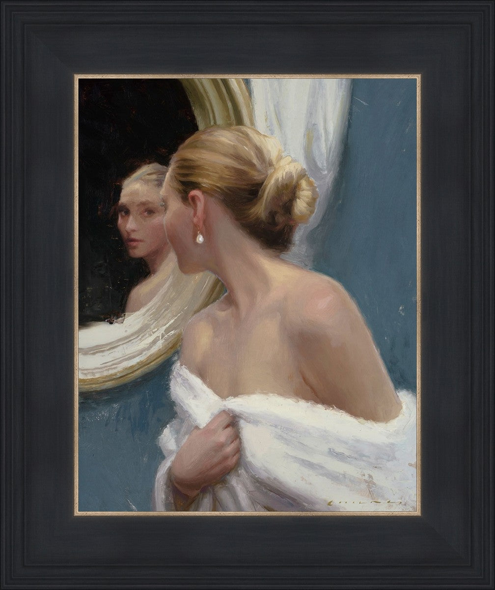 A young elegantly dressed woman pauses before a mirror taking stock of the little girl she once was and the woman she now sees