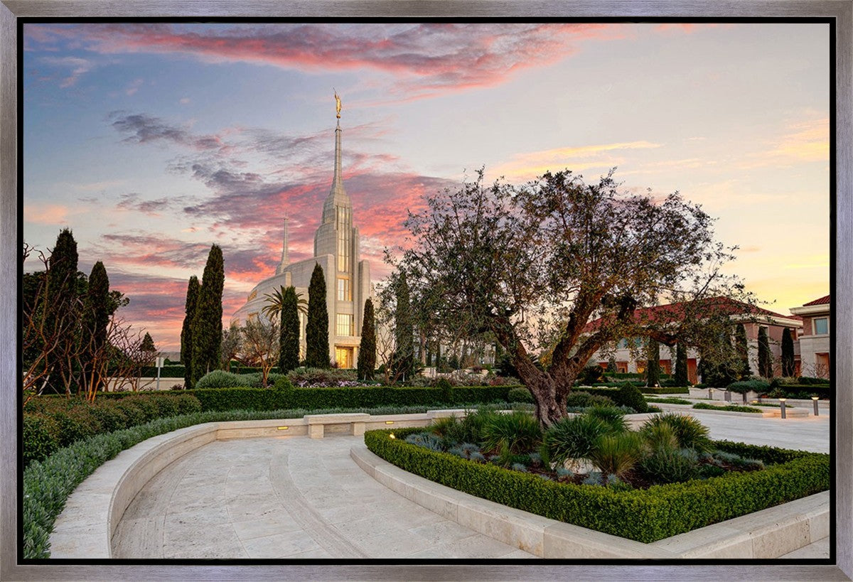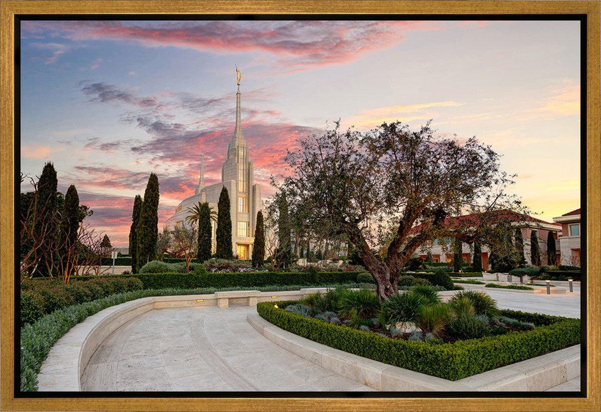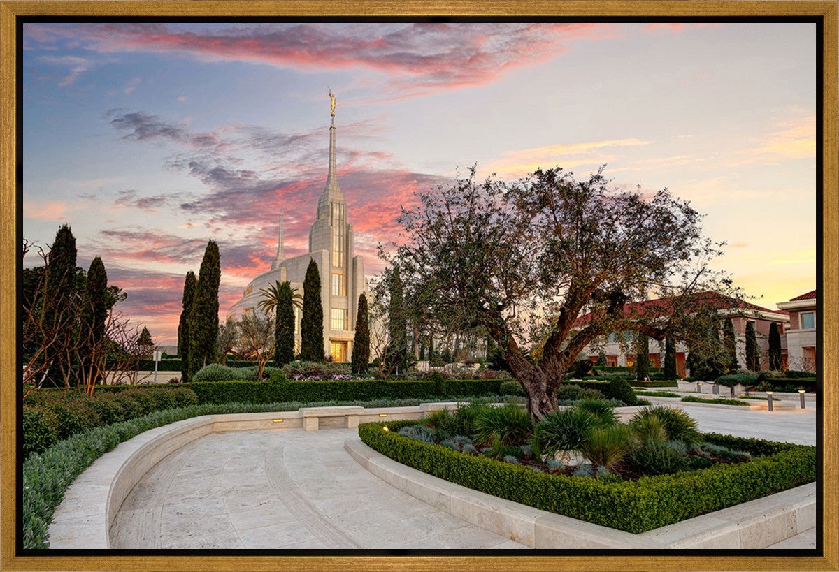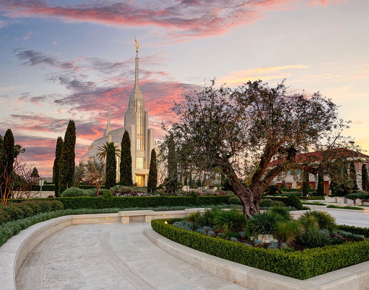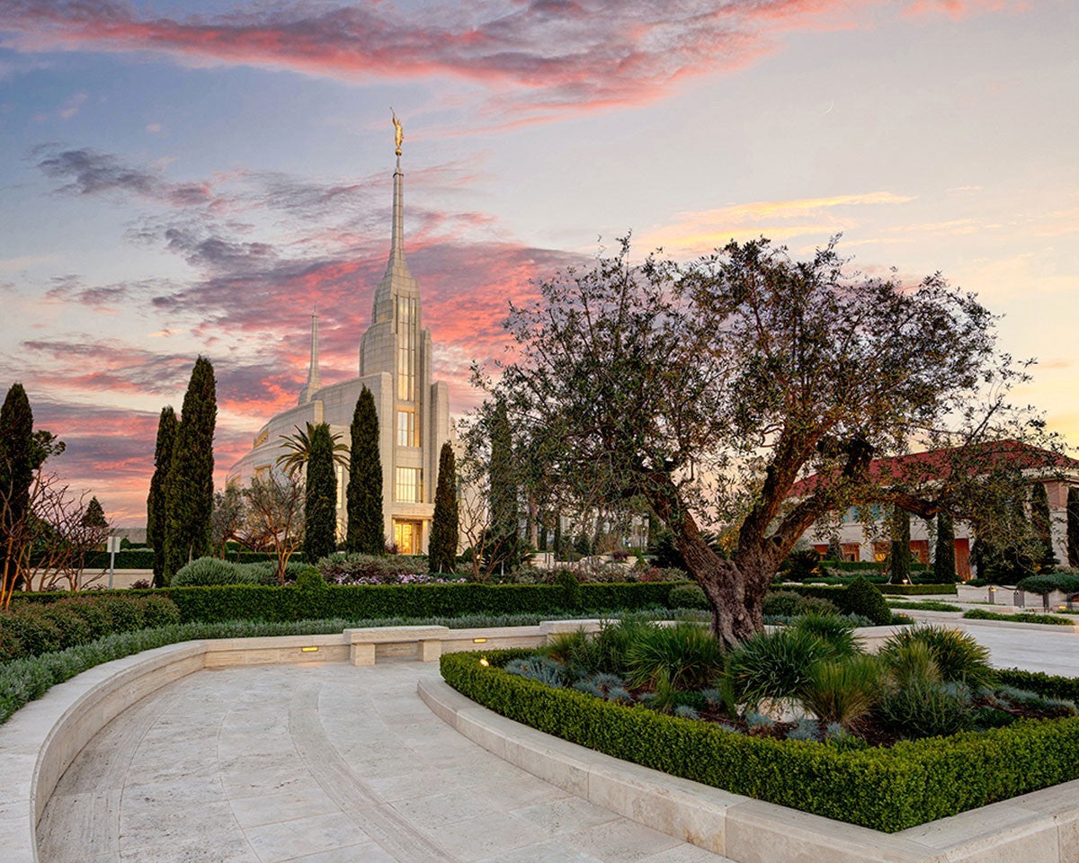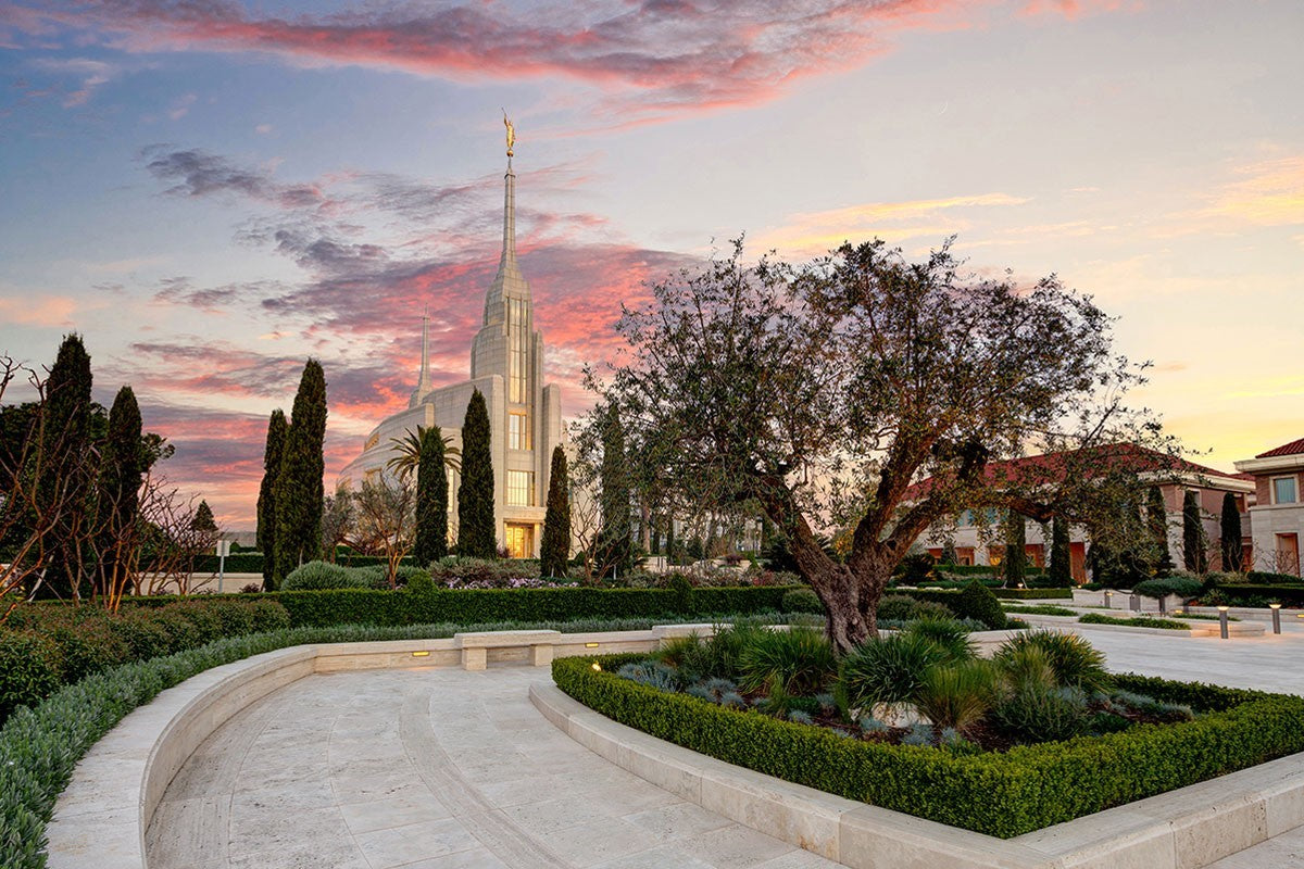 A landscape photograph of the new Rome Temple at sunset taken from one of the beautiful sitting areas found at the site