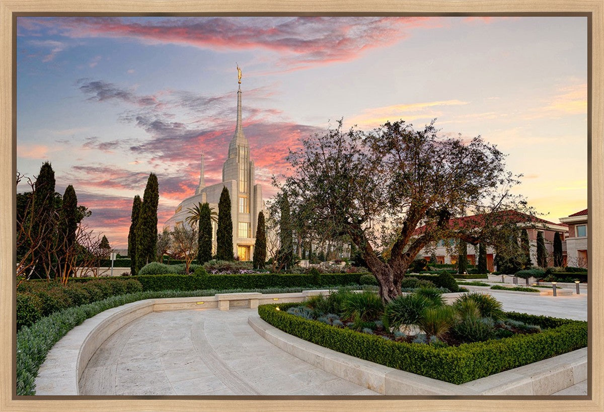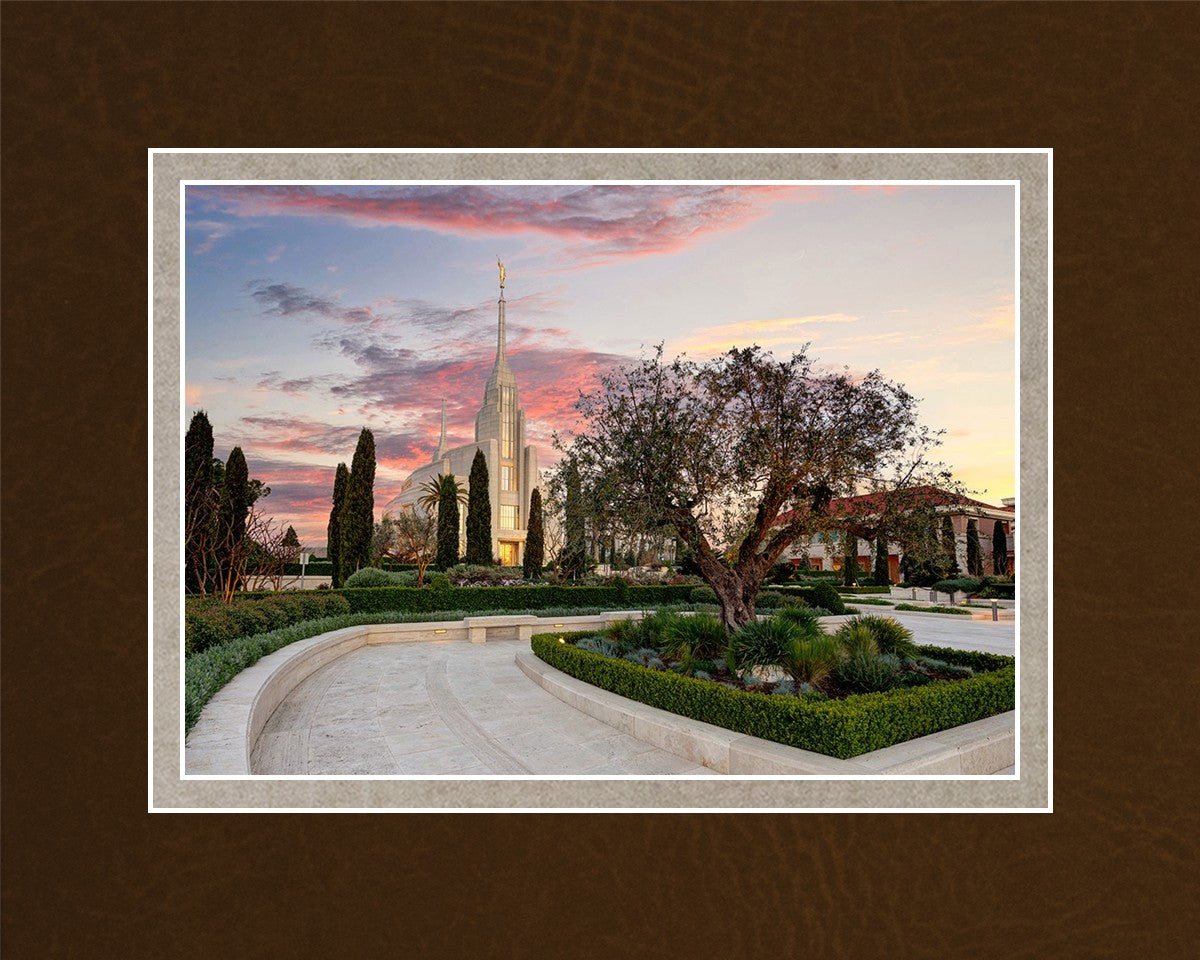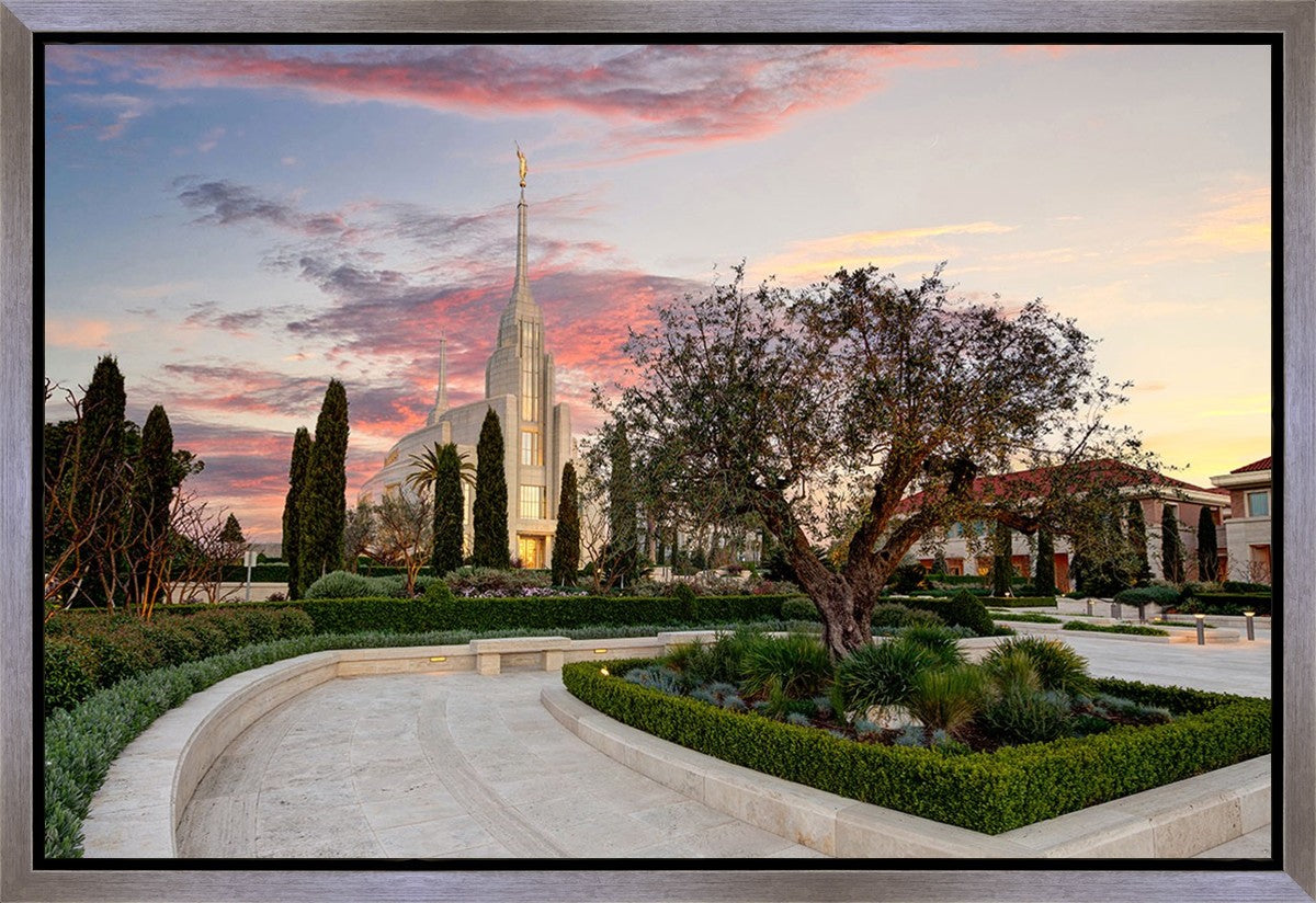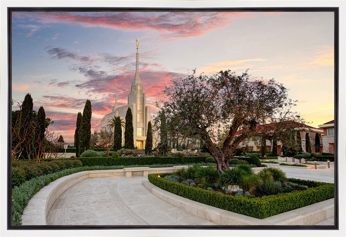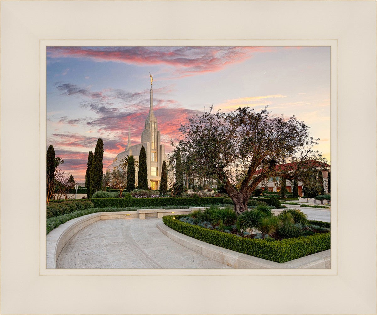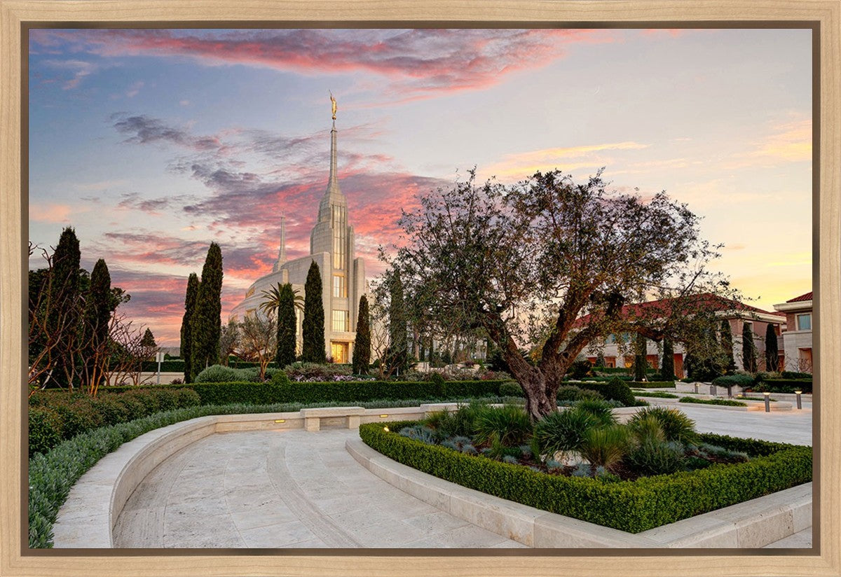 A landscape photograph of the new Rome Temple at sunset taken from one of the beautiful sitting areas found at the site