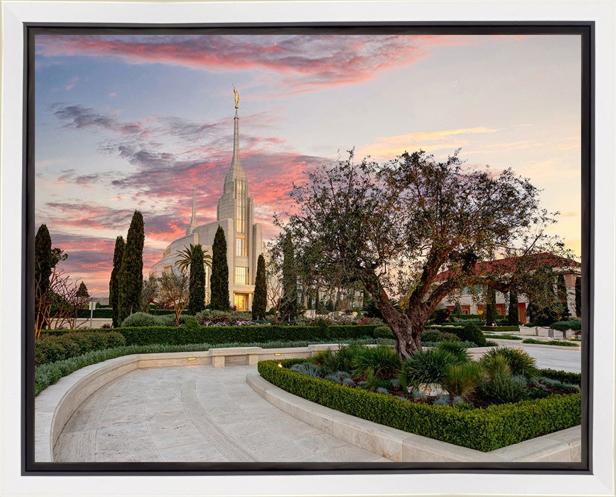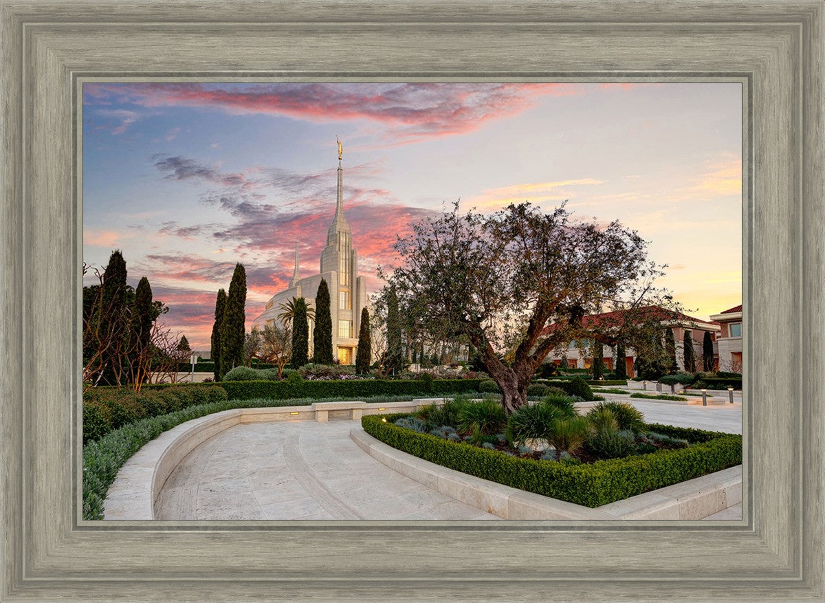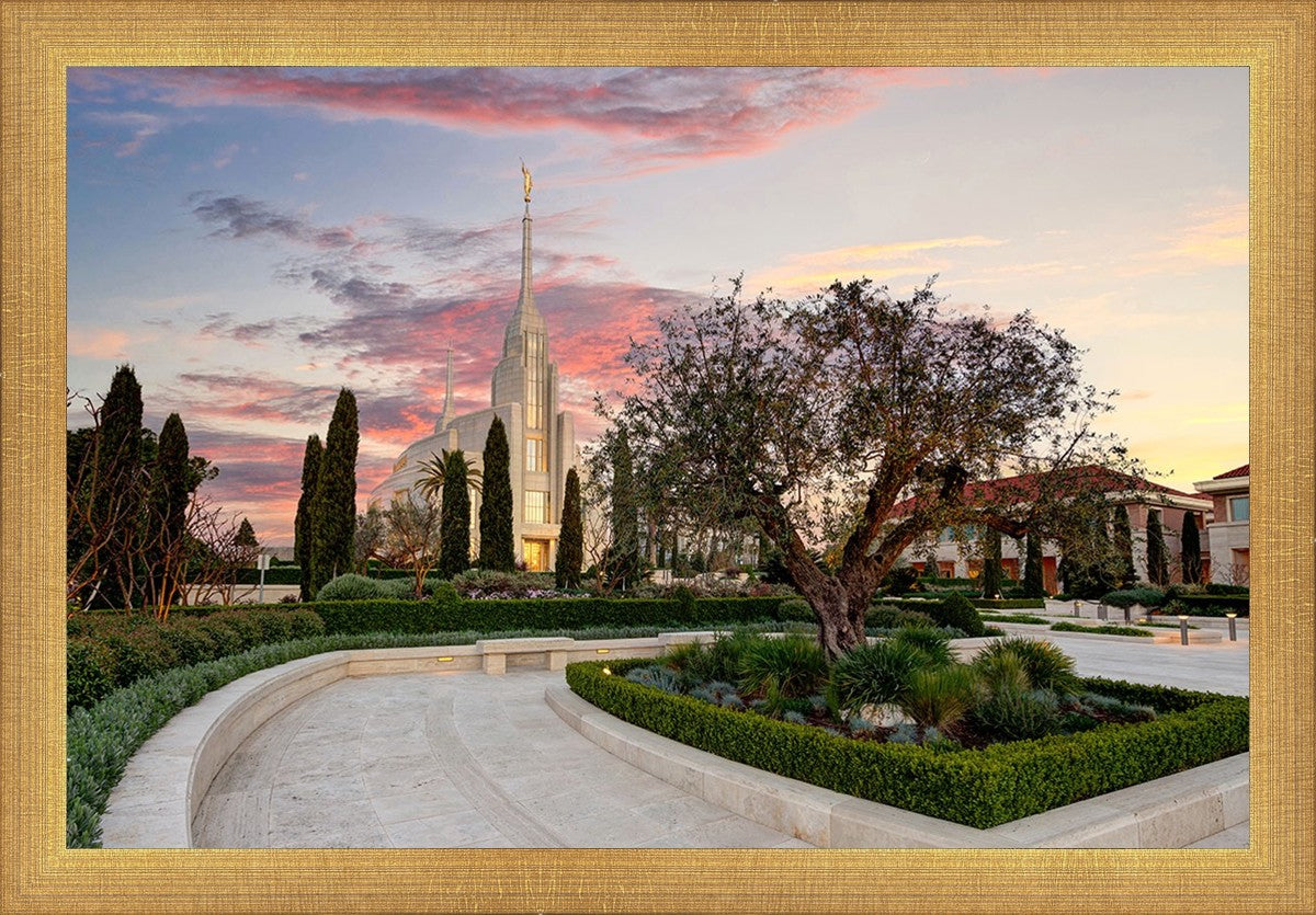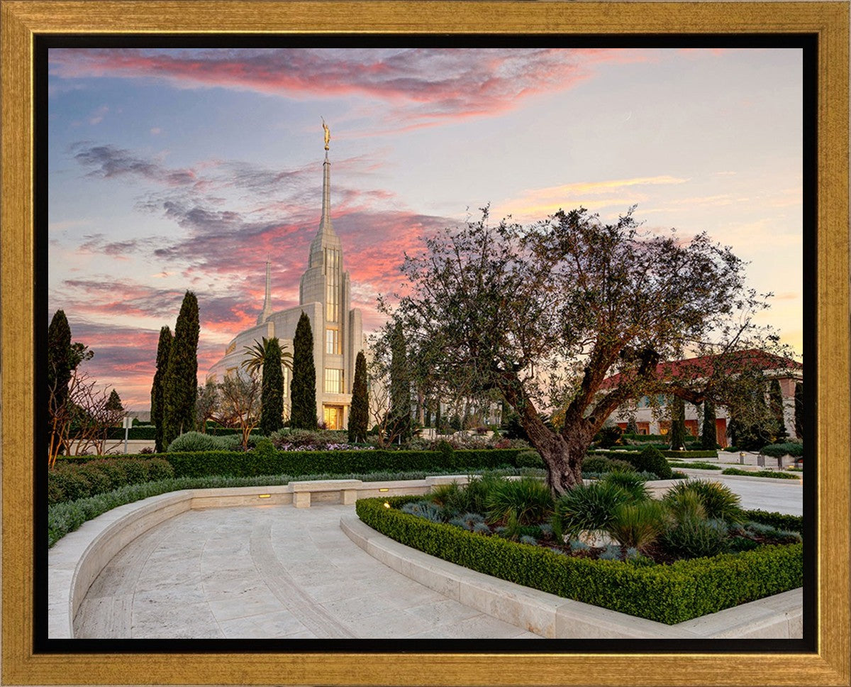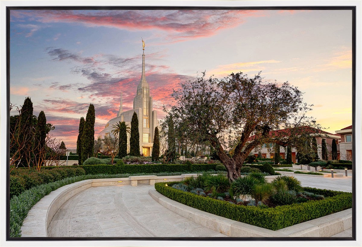A landscape photograph of the new Rome Temple at sunset taken from one of the beautiful sitting areas found at the site