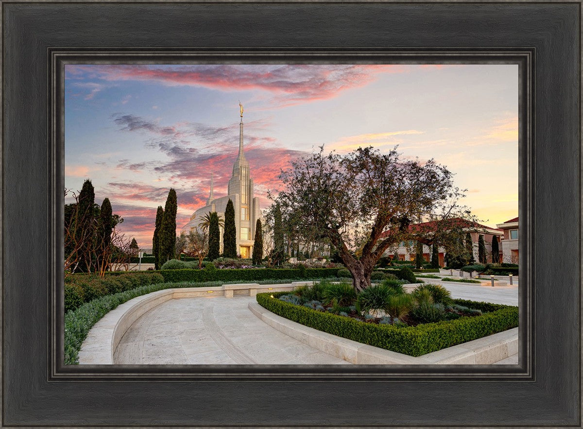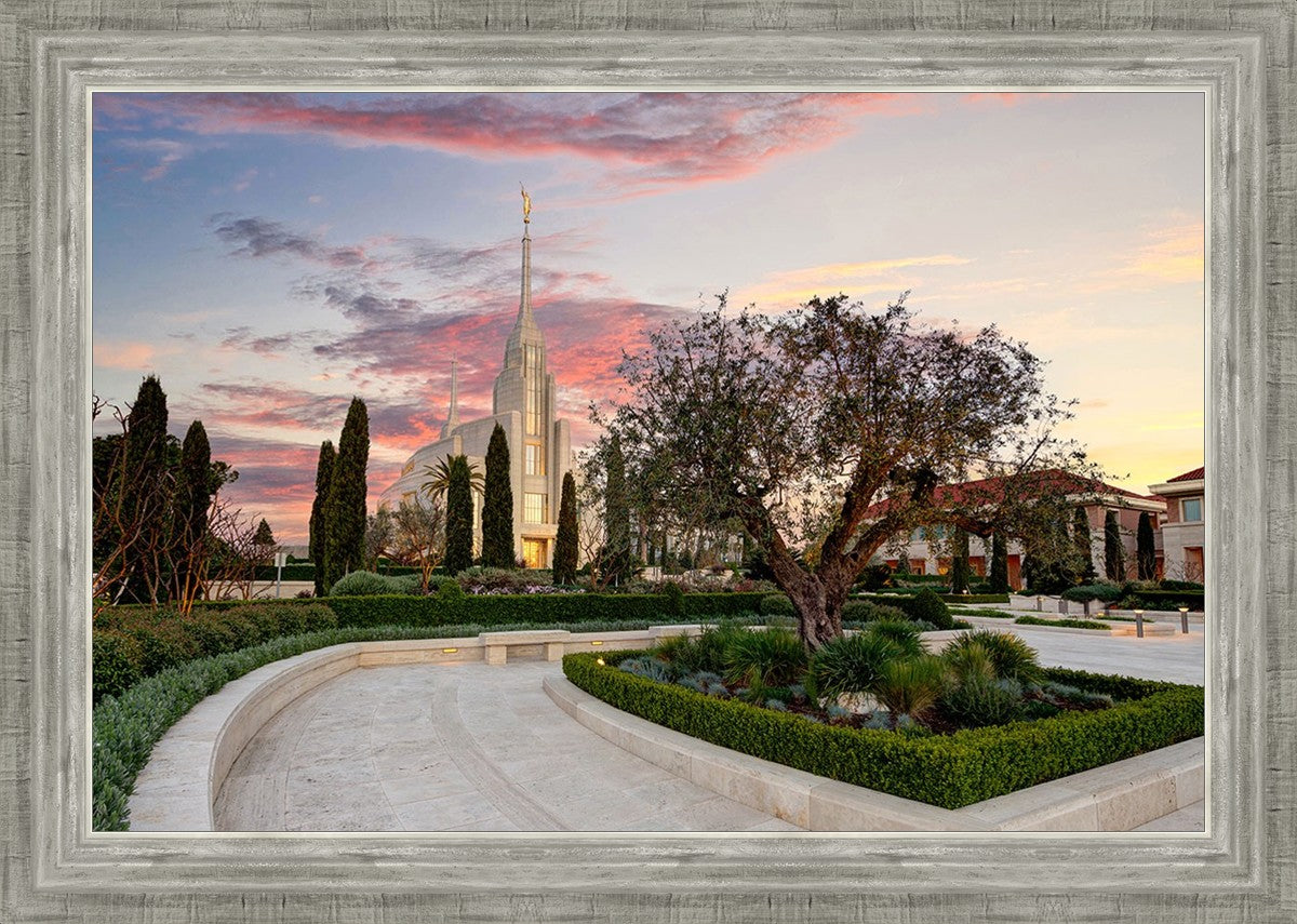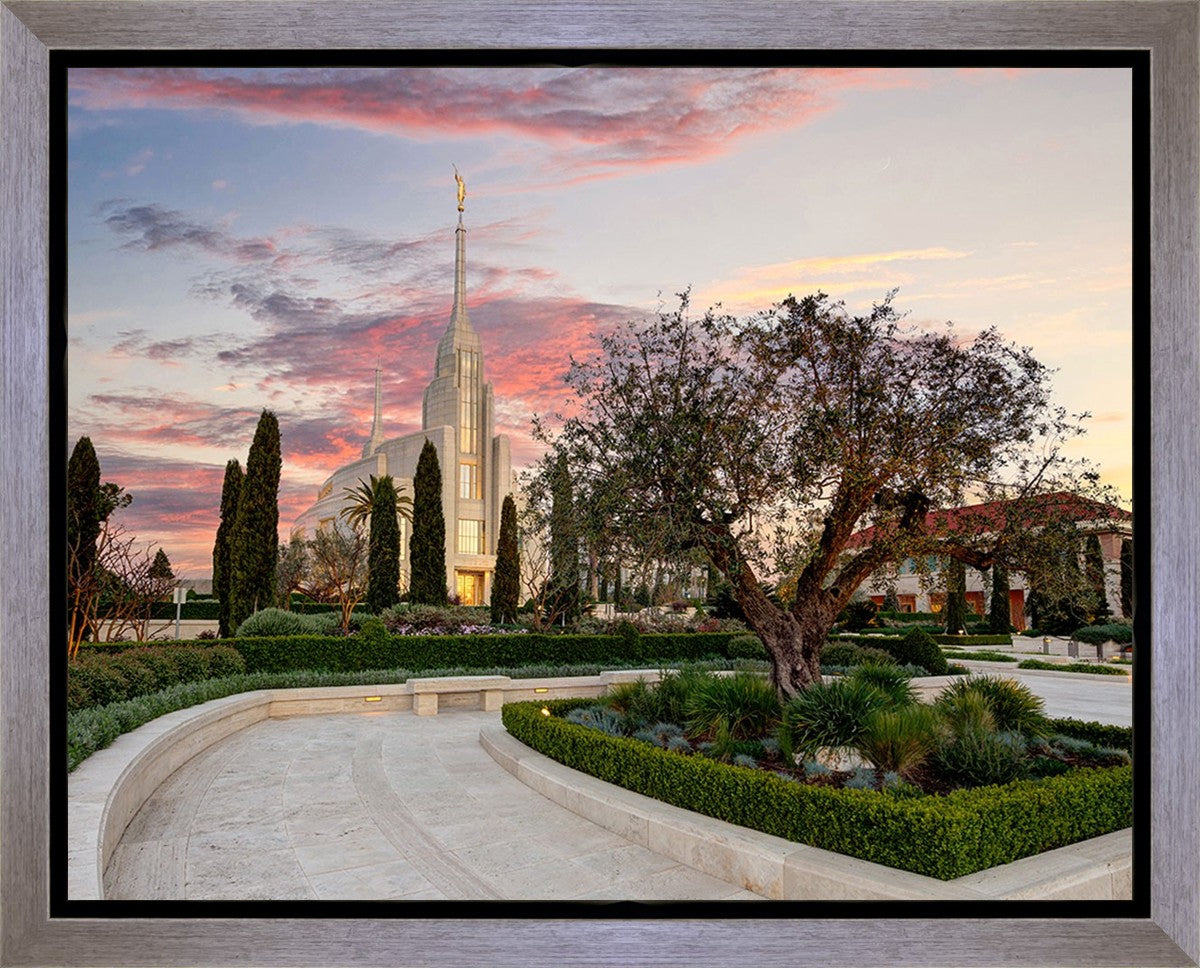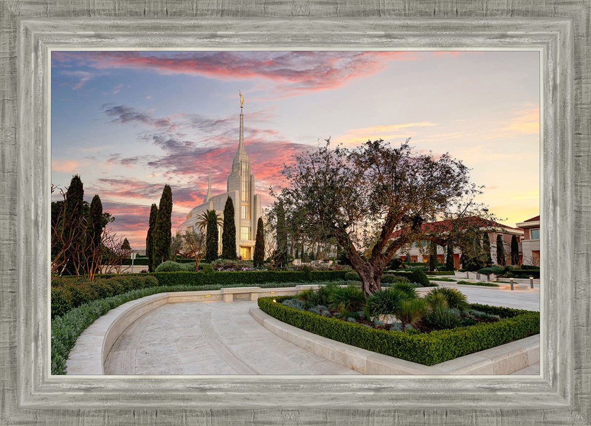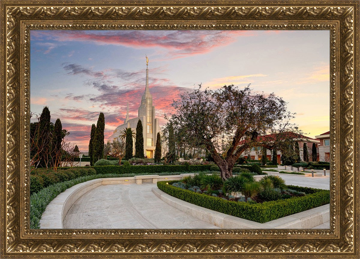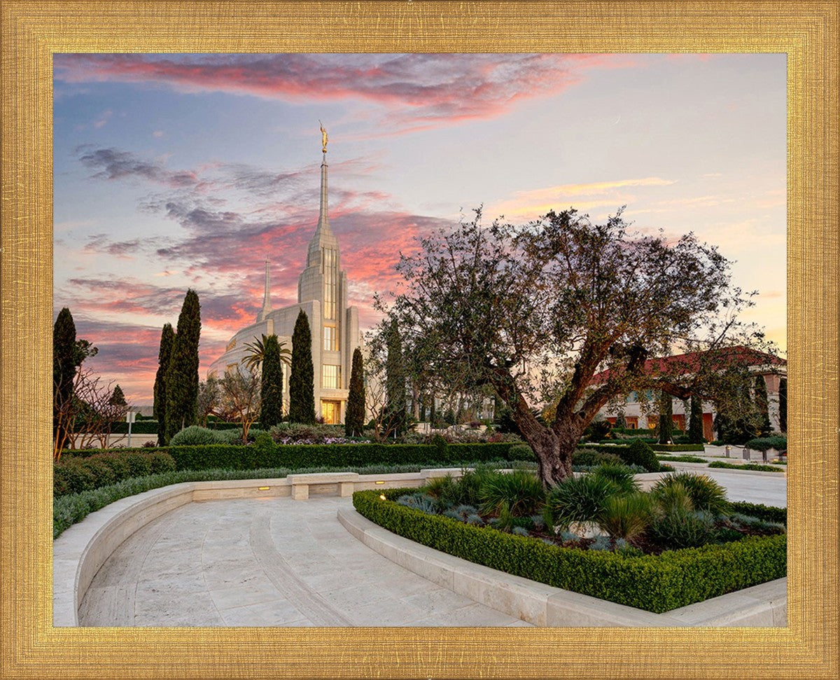 A landscape photograph of the new Rome Temple at sunset taken from one of the beautiful sitting areas found at the site