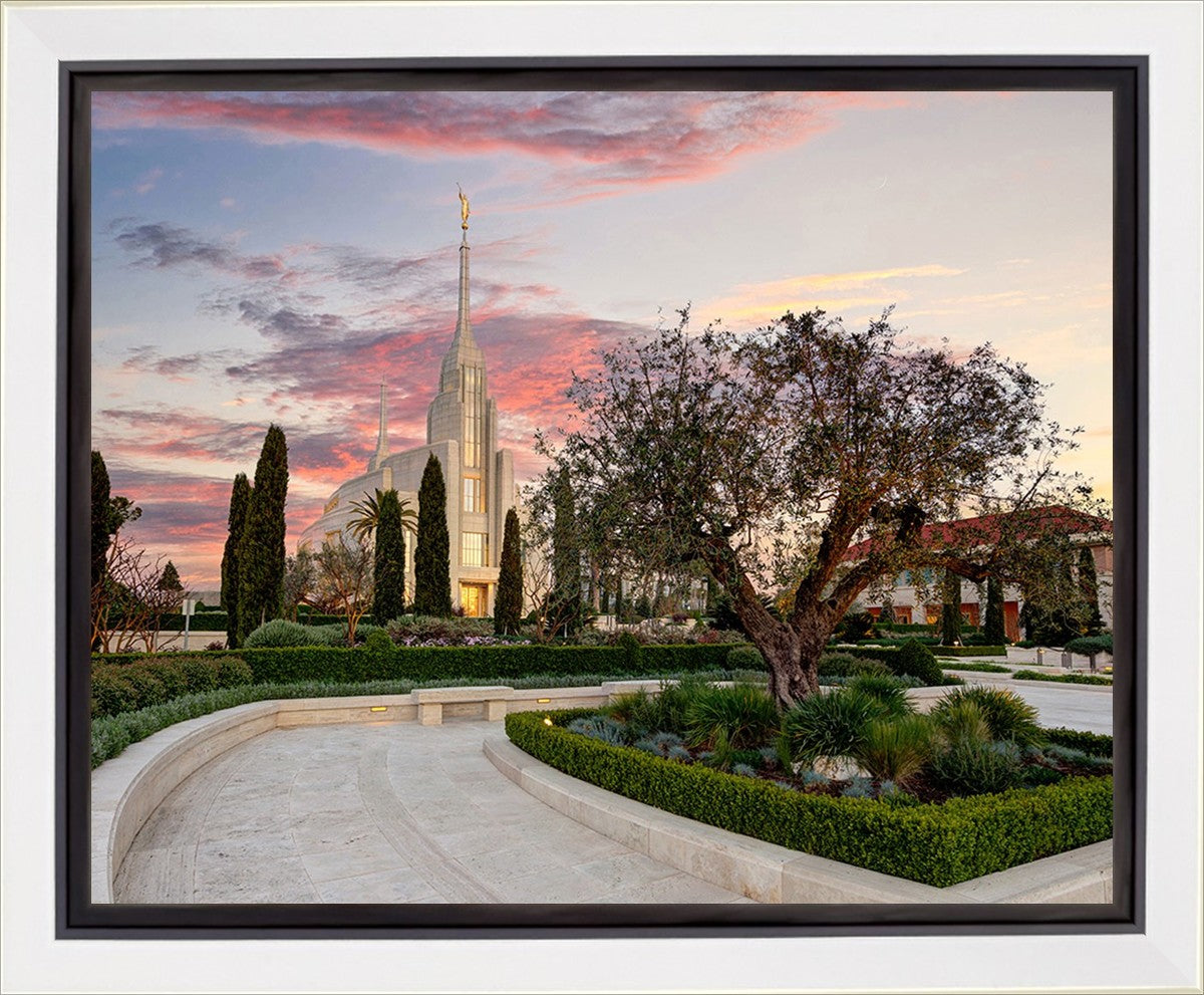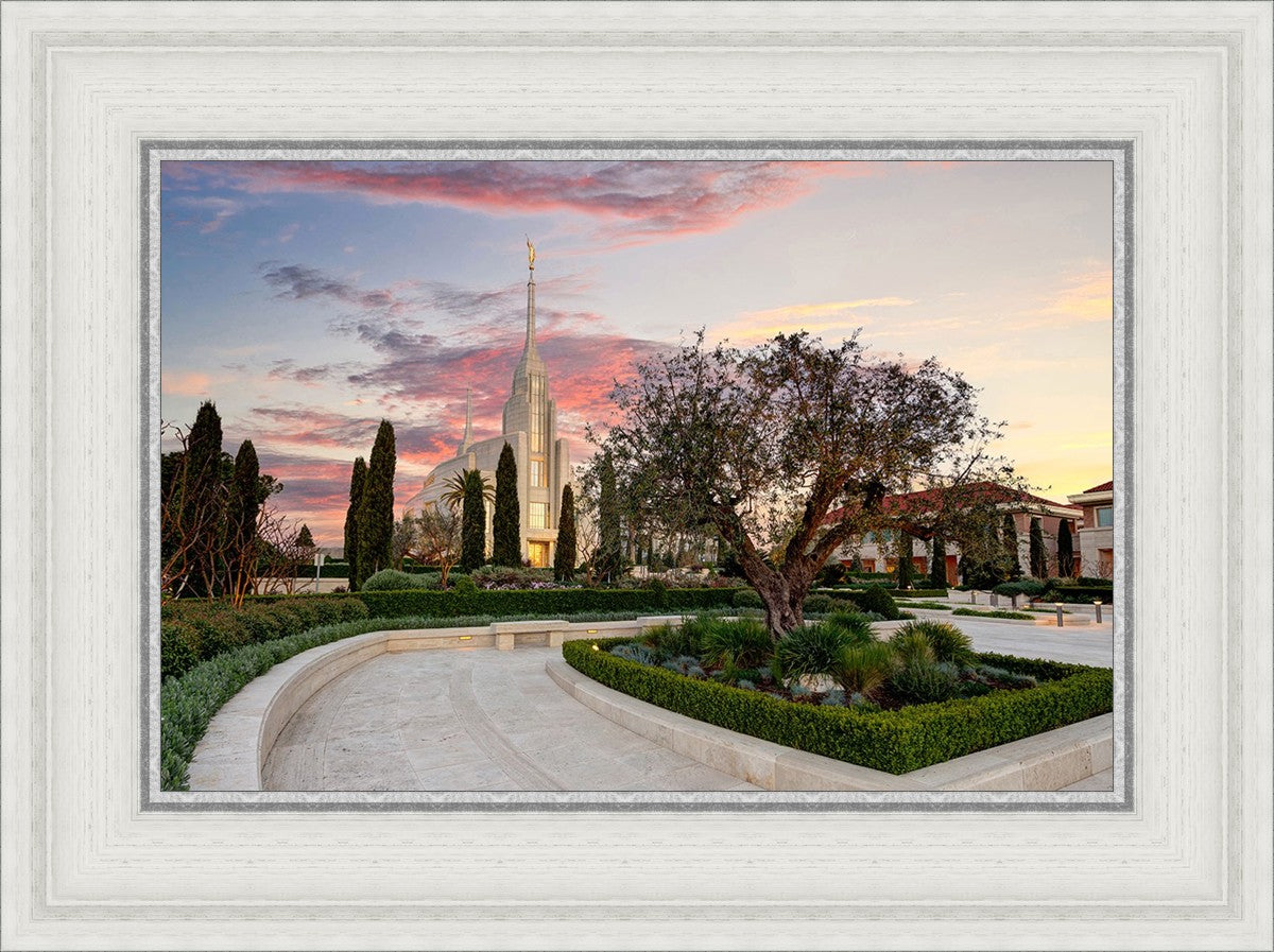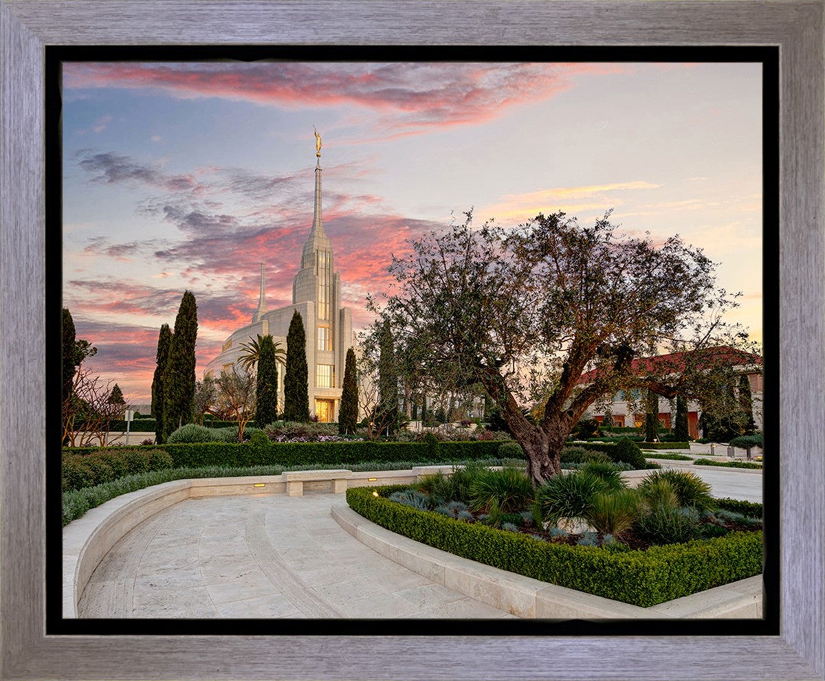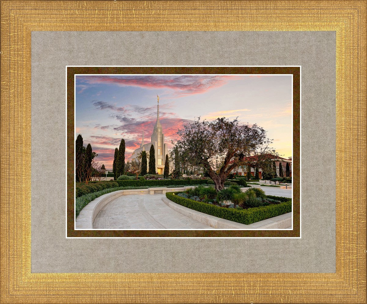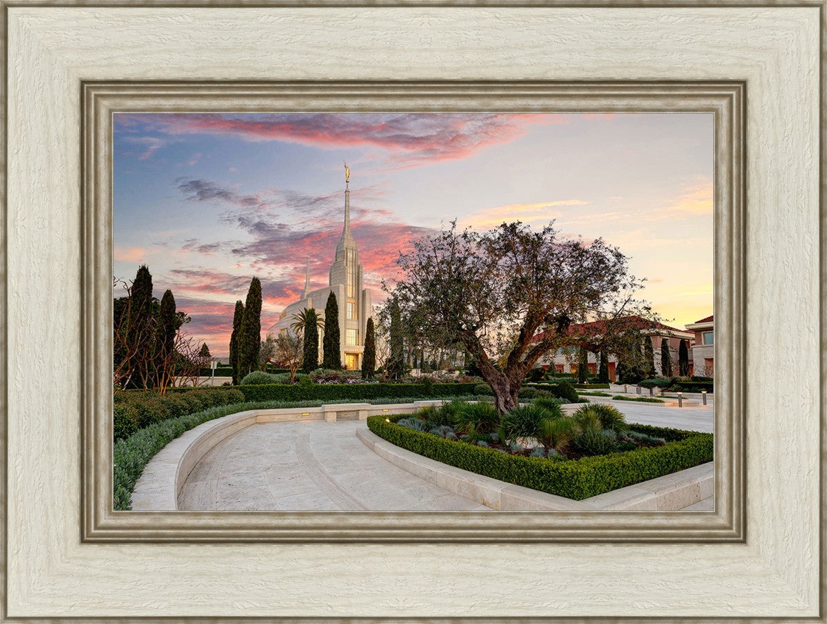 A landscape photograph of the new Rome Temple at sunset taken from one of the beautiful sitting areas found at the site