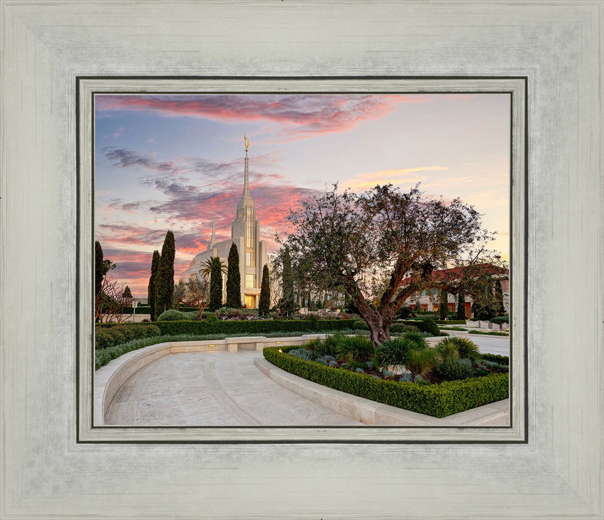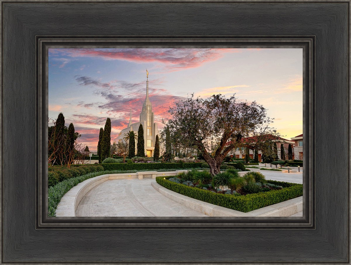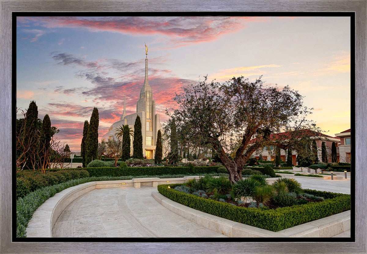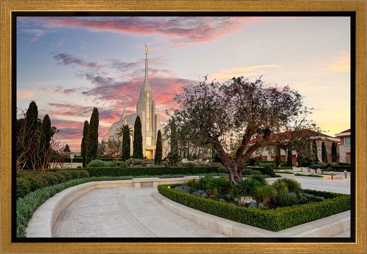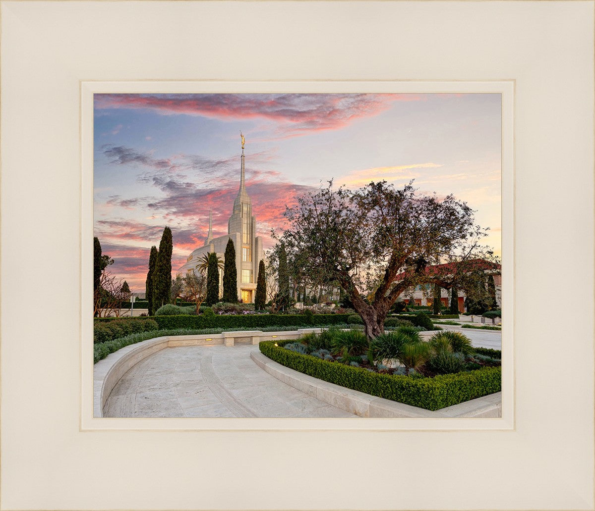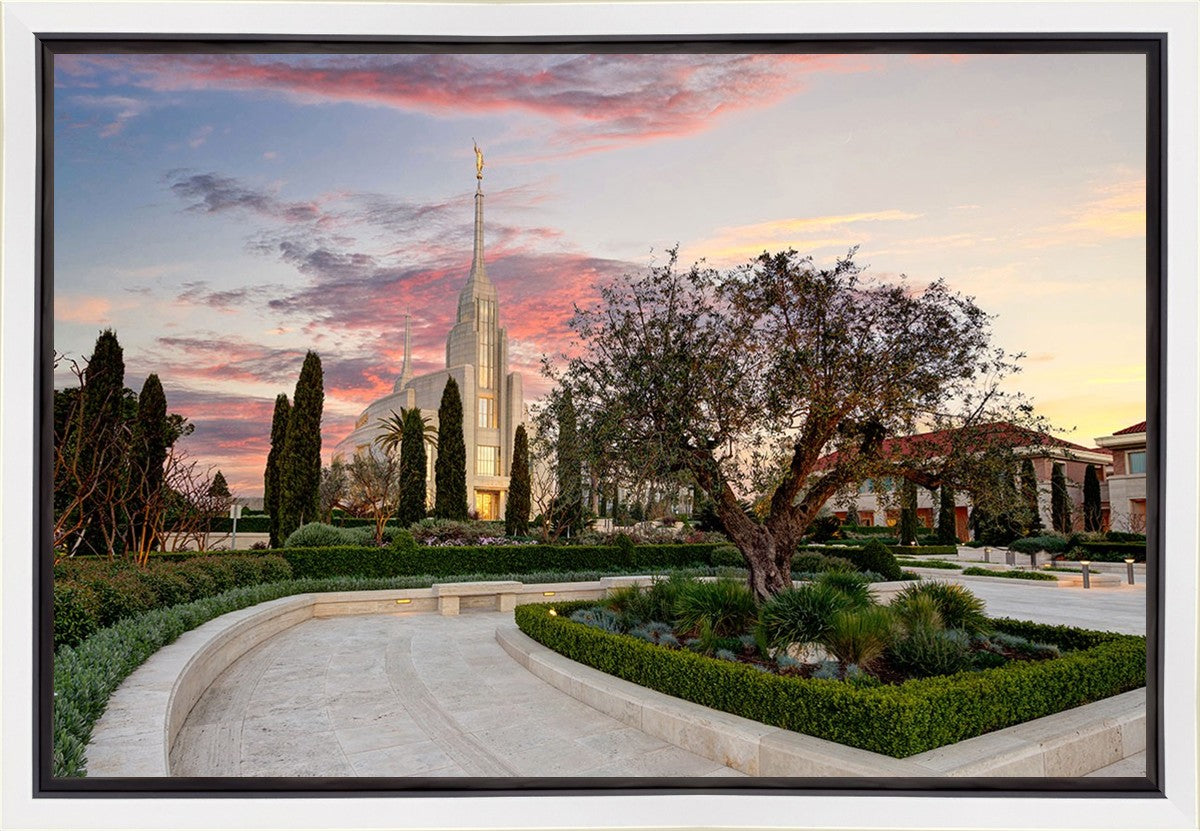 A landscape photograph of the new Rome Temple at sunset taken from one of the beautiful sitting areas found at the site