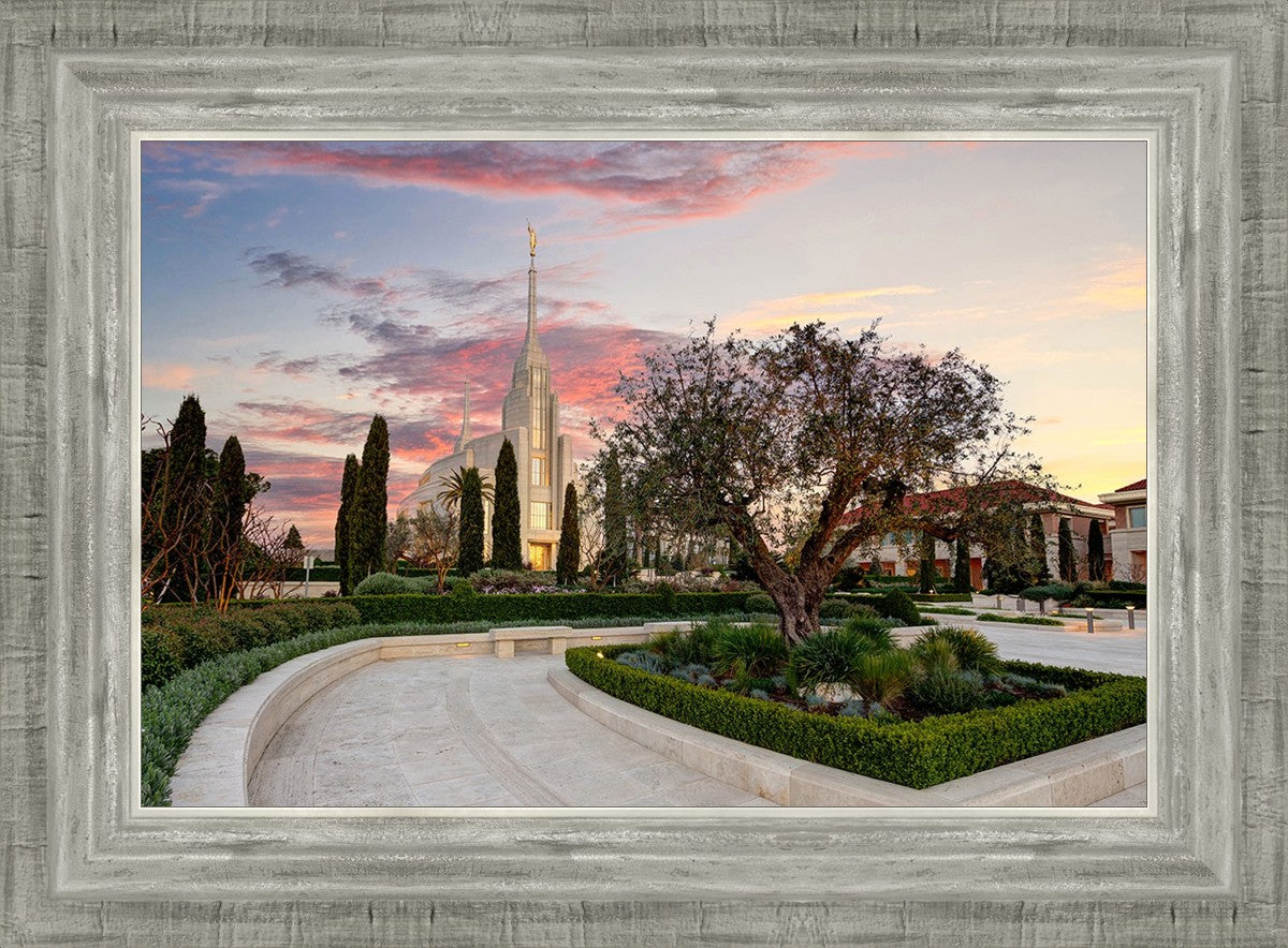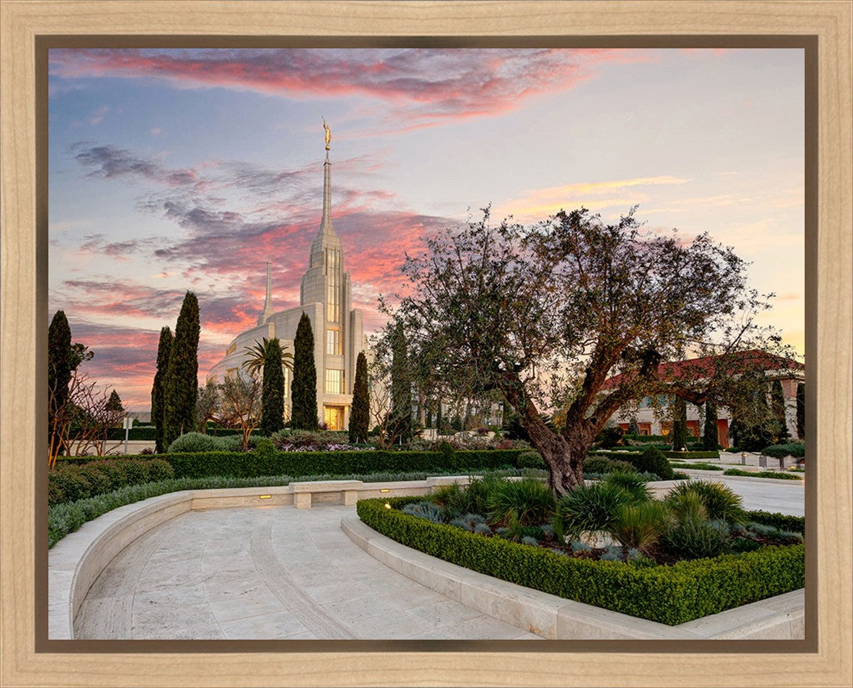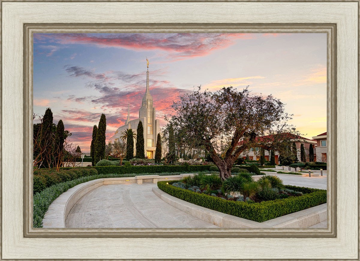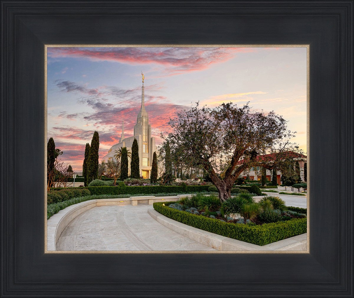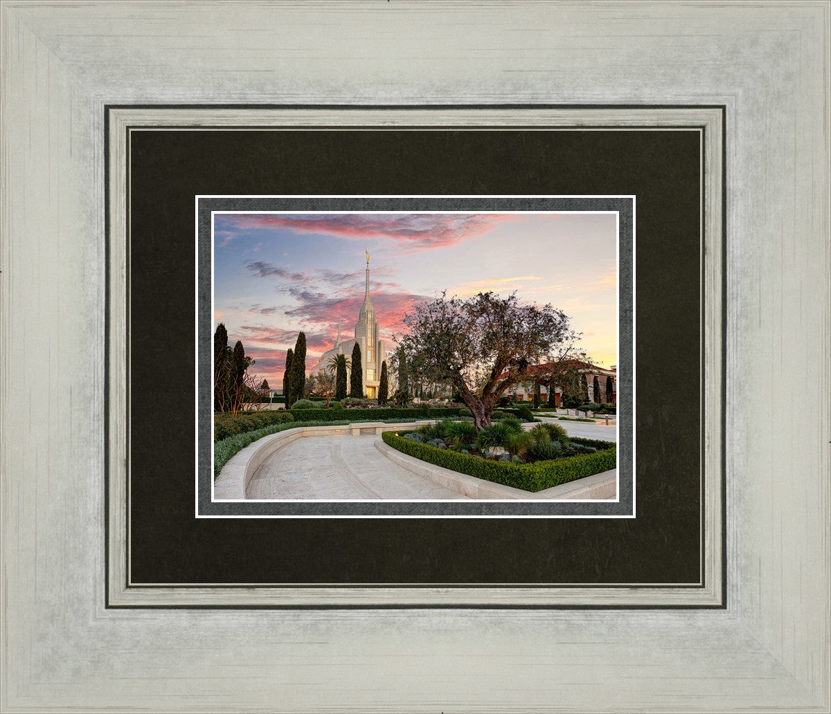 A landscape photograph of the new Rome Temple at sunset taken from one of the beautiful sitting areas found at the site