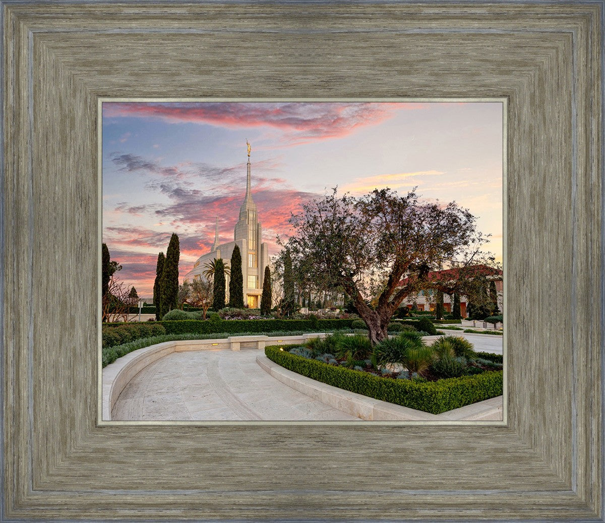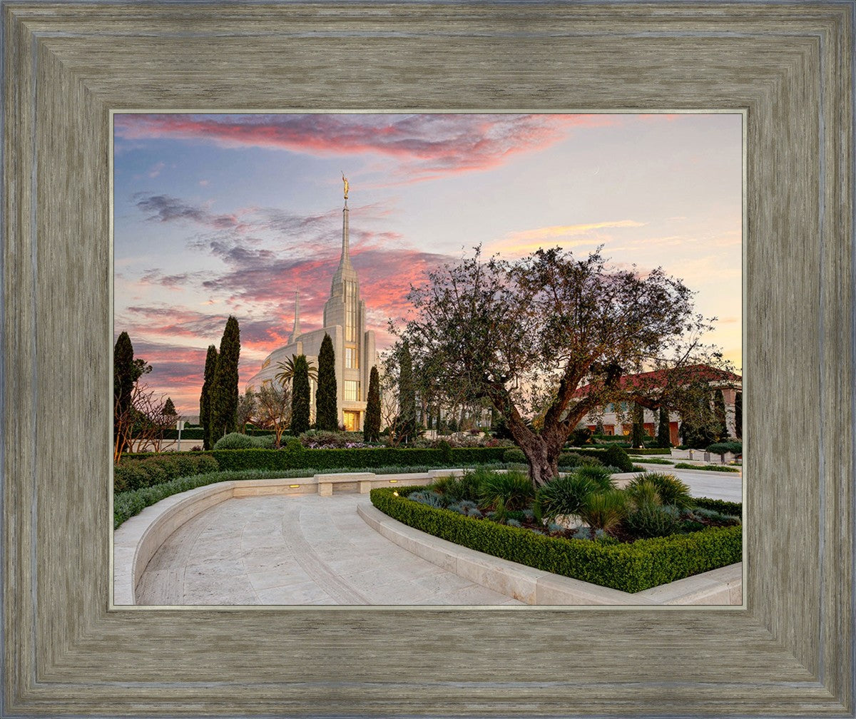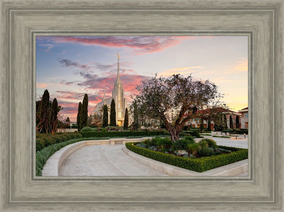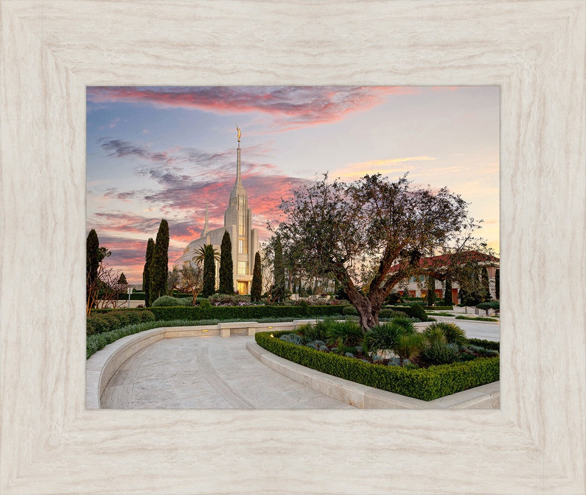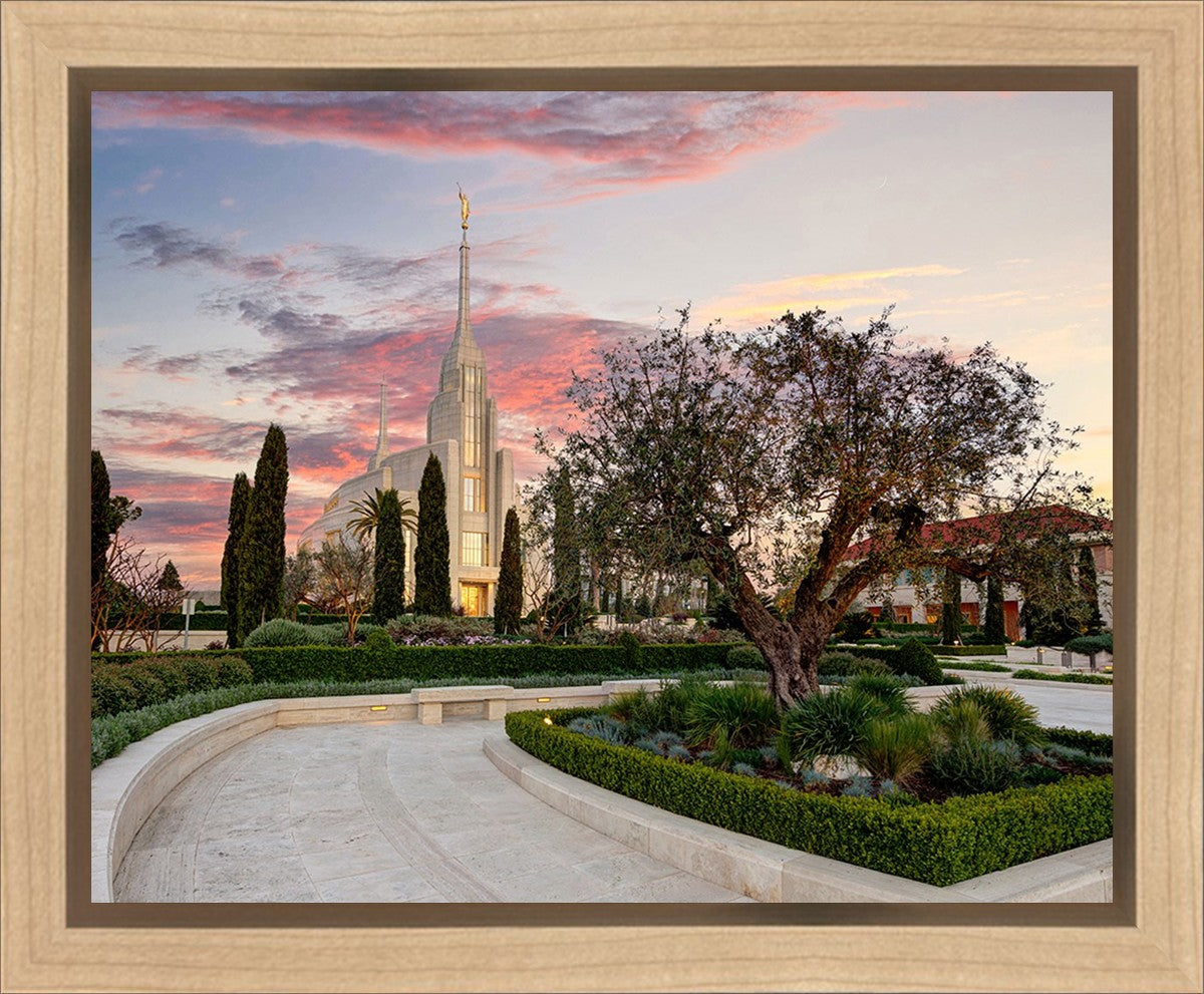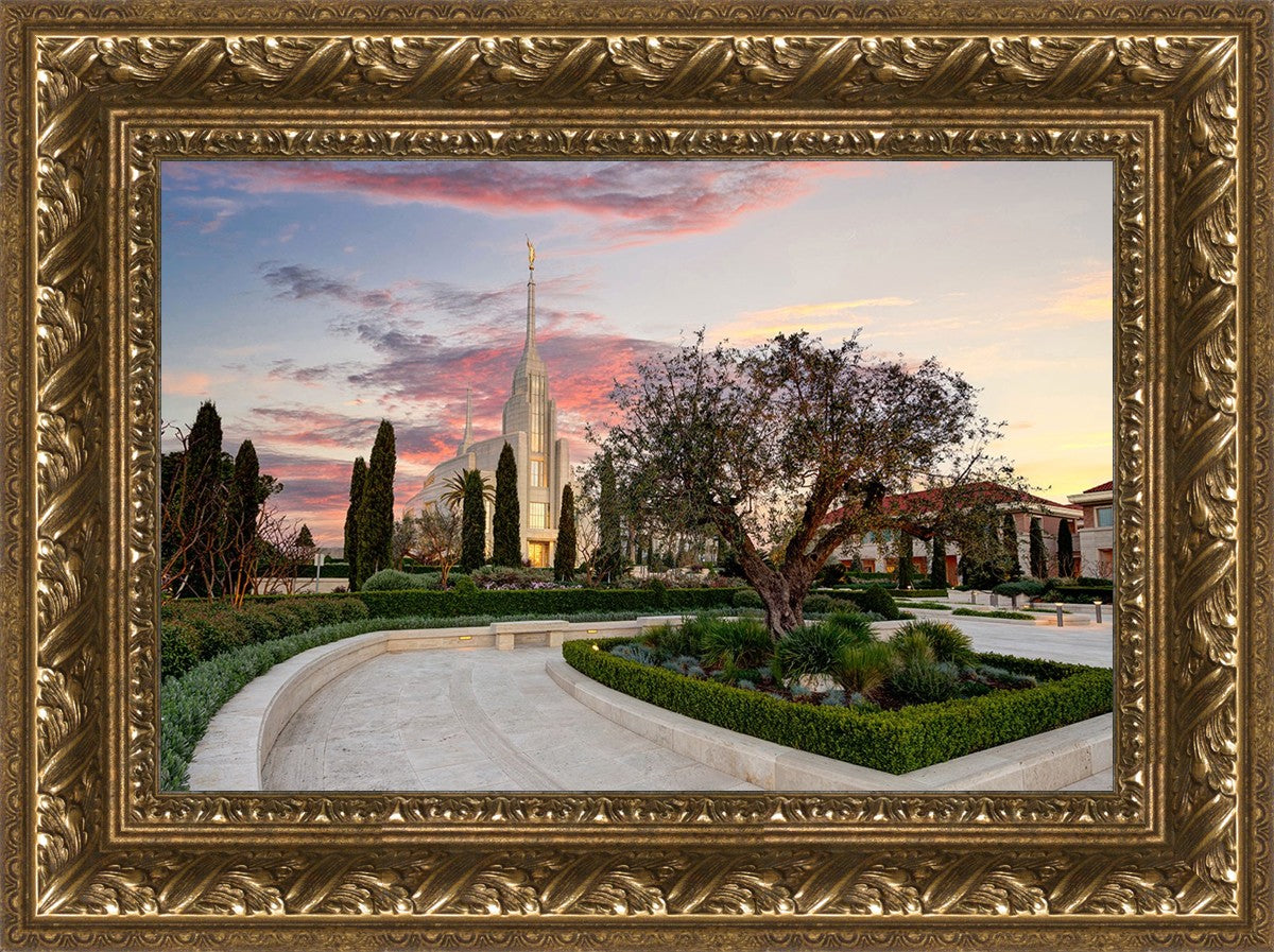A landscape photograph of the new Rome Temple at sunset taken from one of the beautiful sitting areas found at the site
