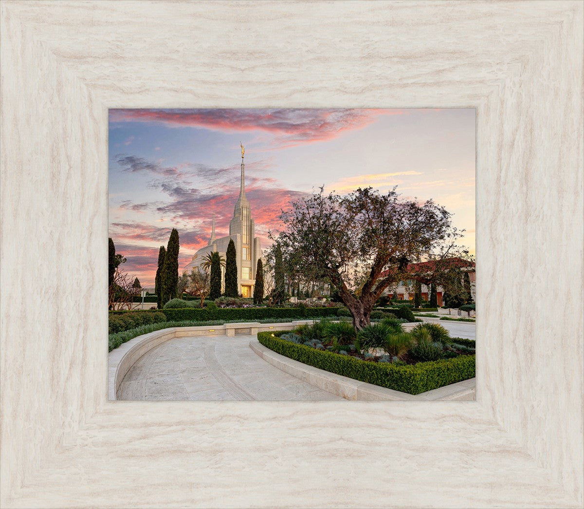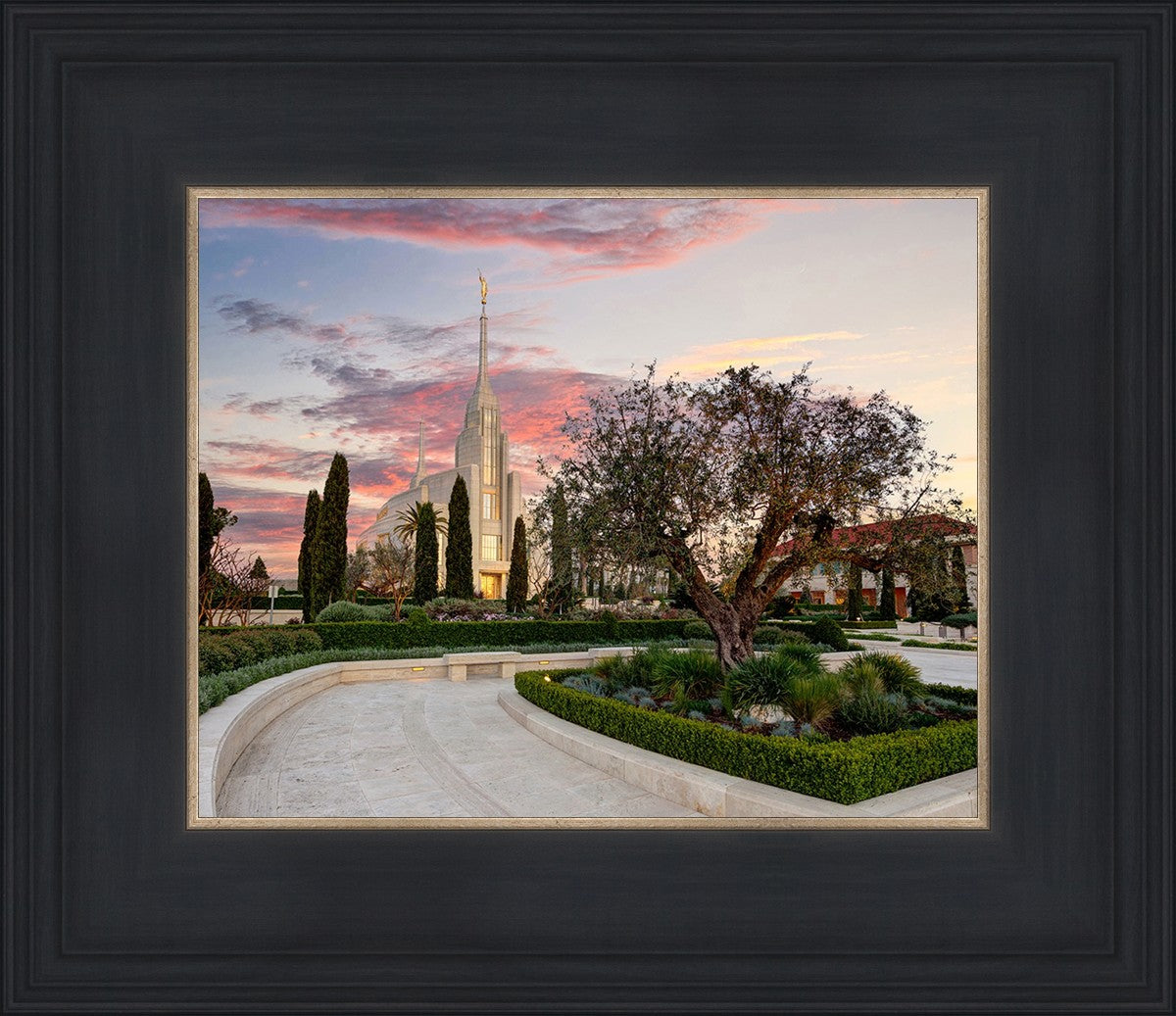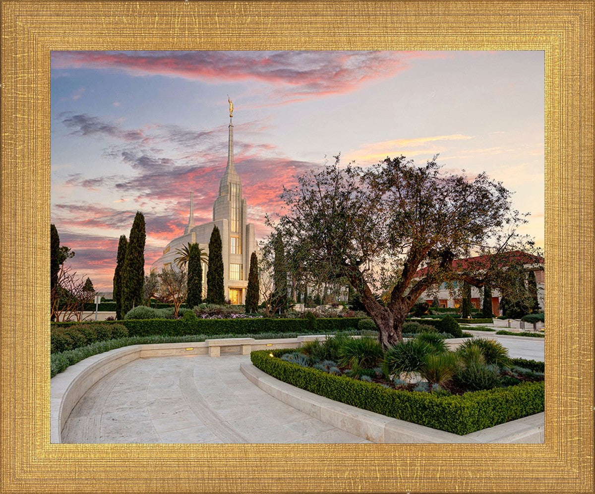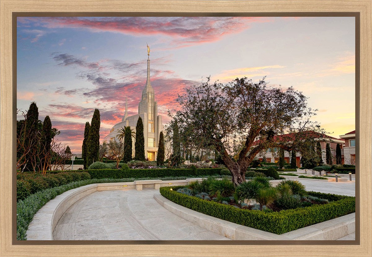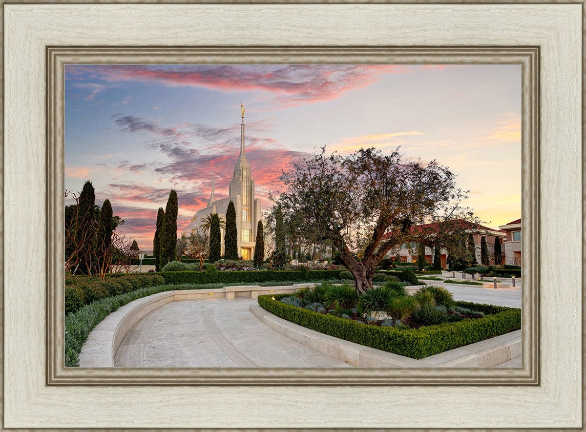A landscape photograph of the new Rome Temple at sunset taken from one of the beautiful sitting areas found at the site