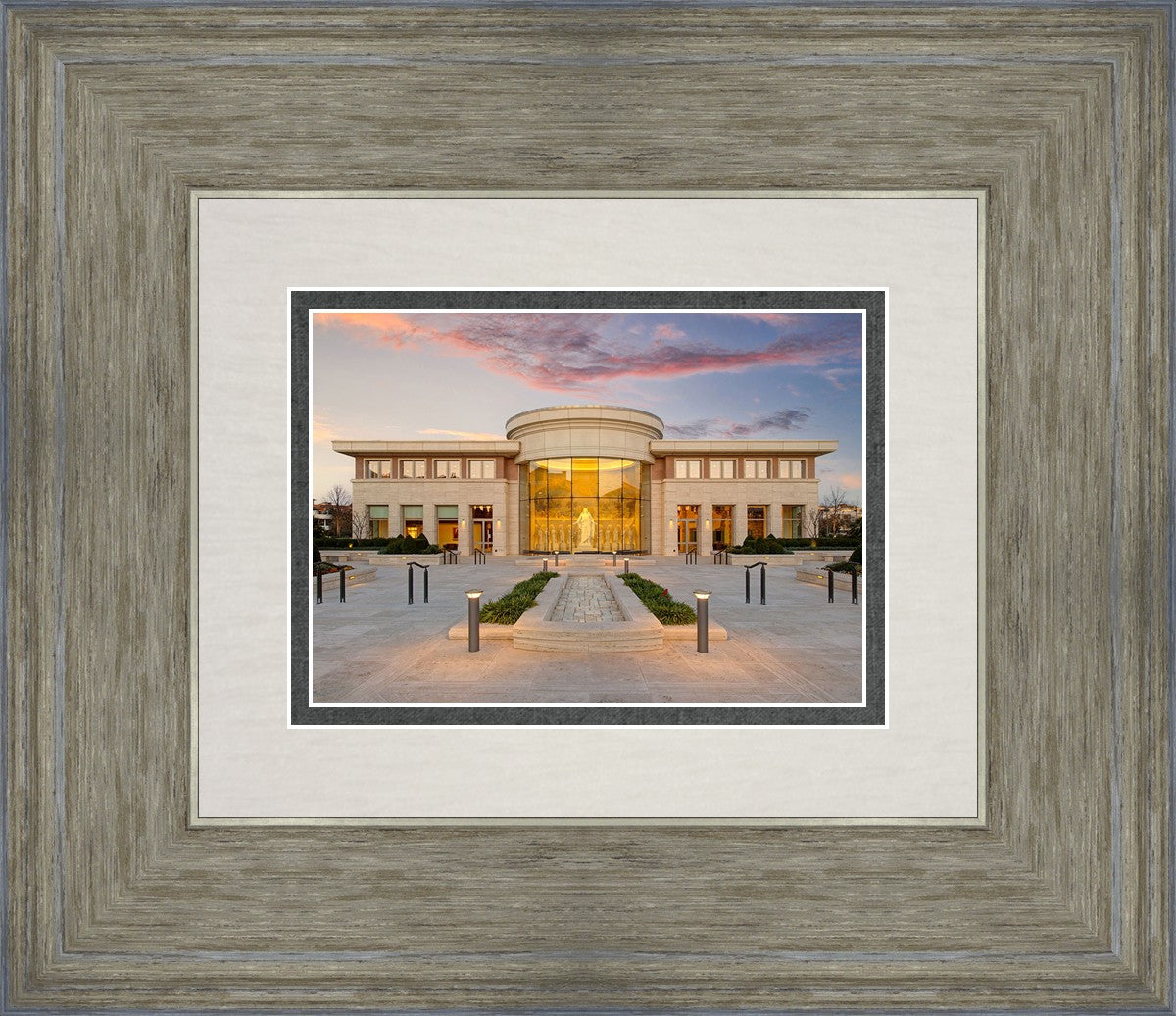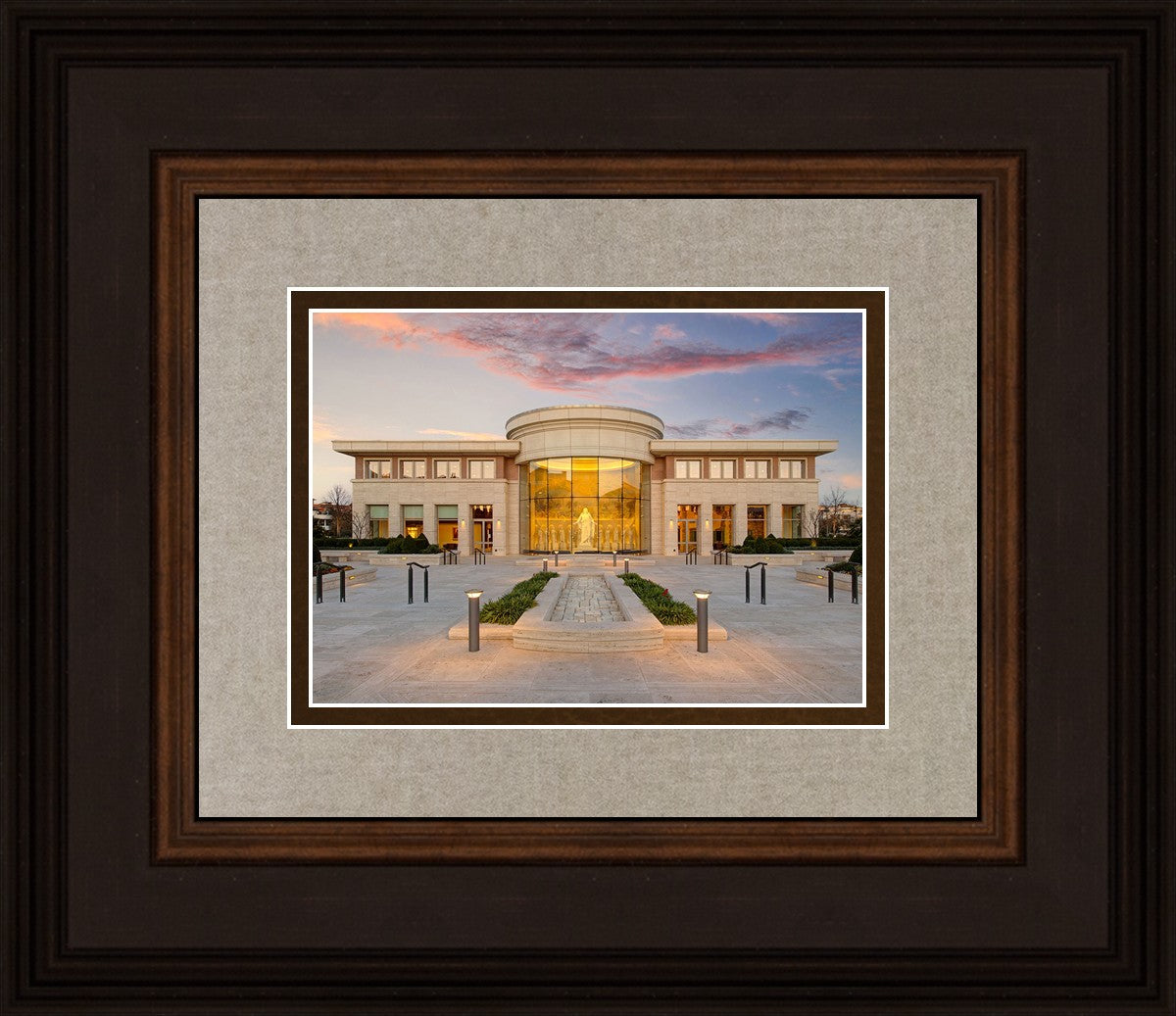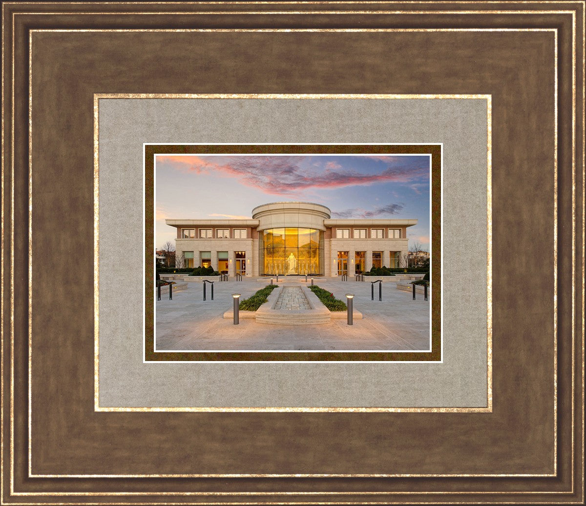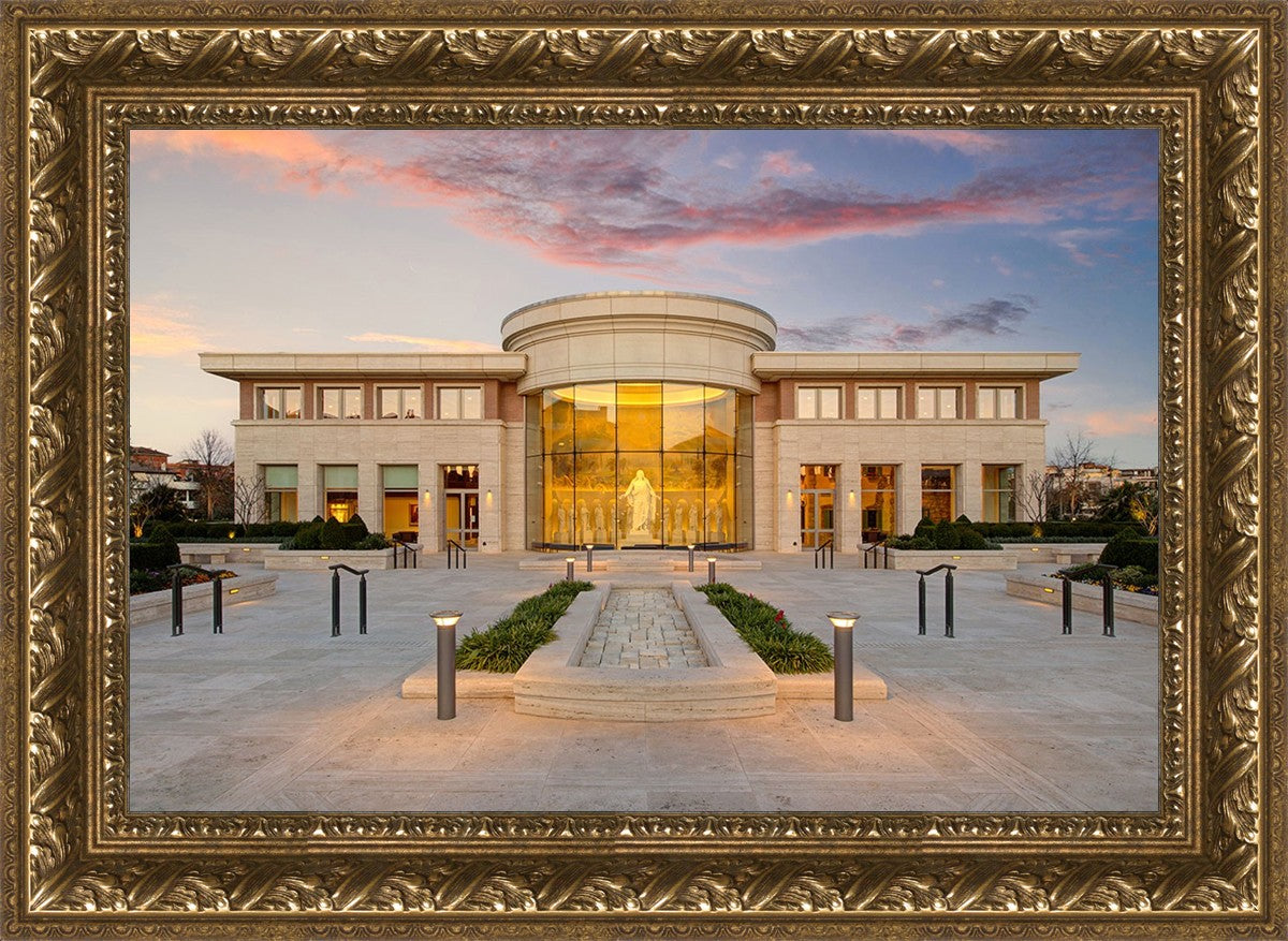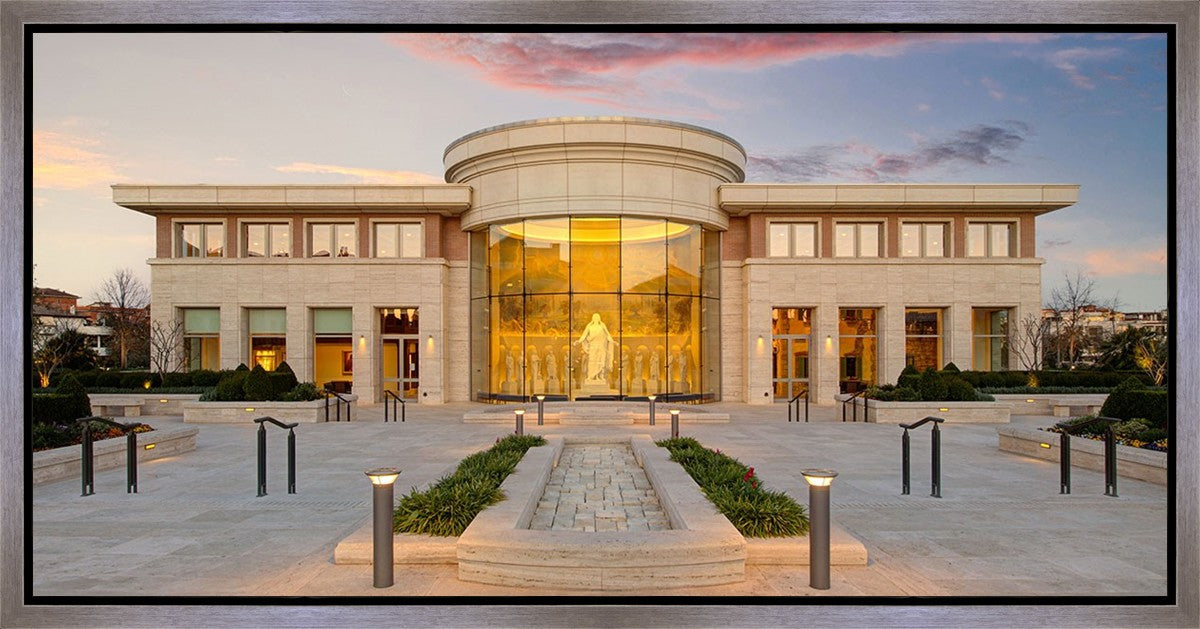 A photograph of the new Rome Italy visitors center at sunset, peering in at the Christus statue flanked by the 12 disciples.