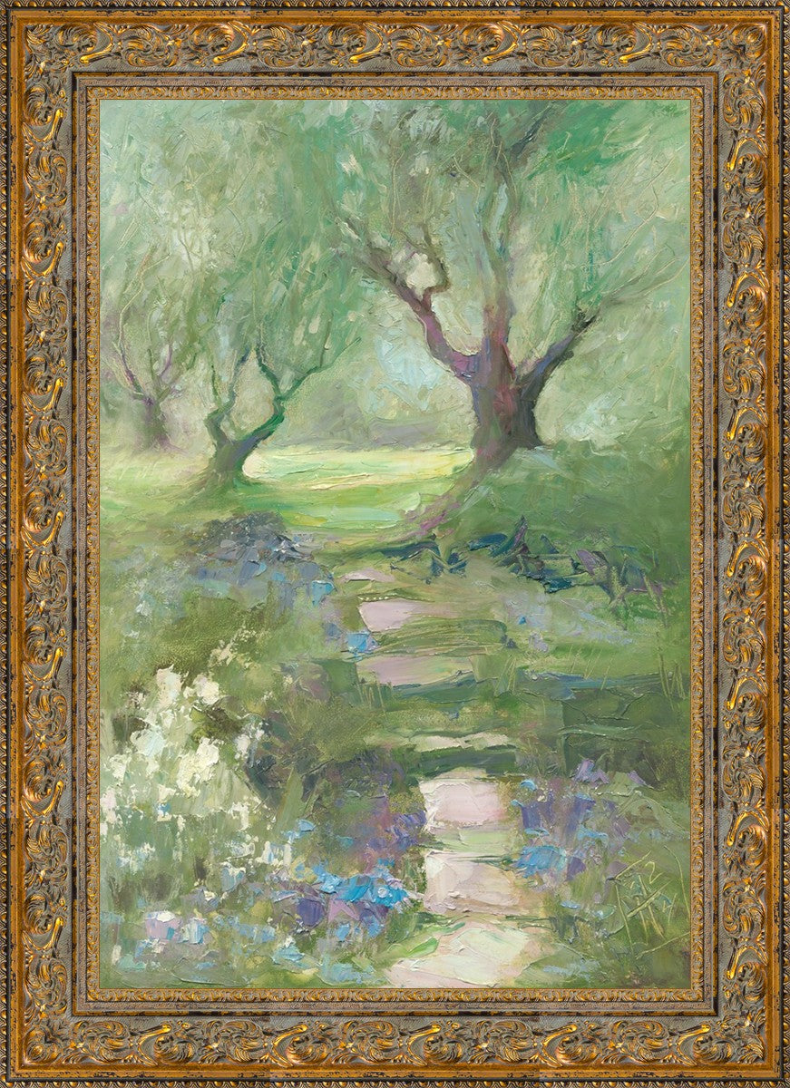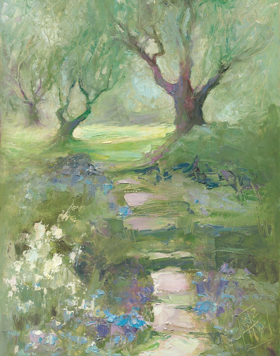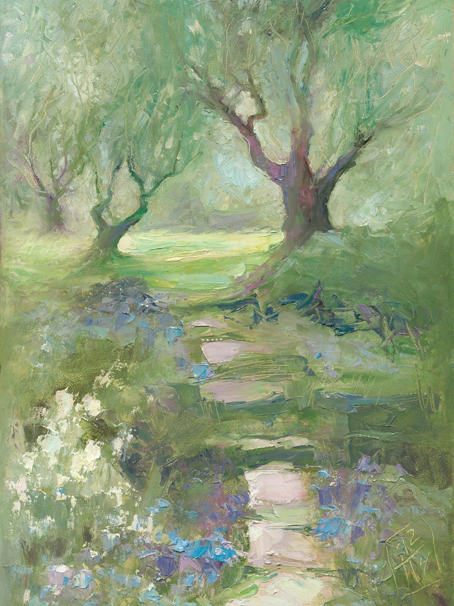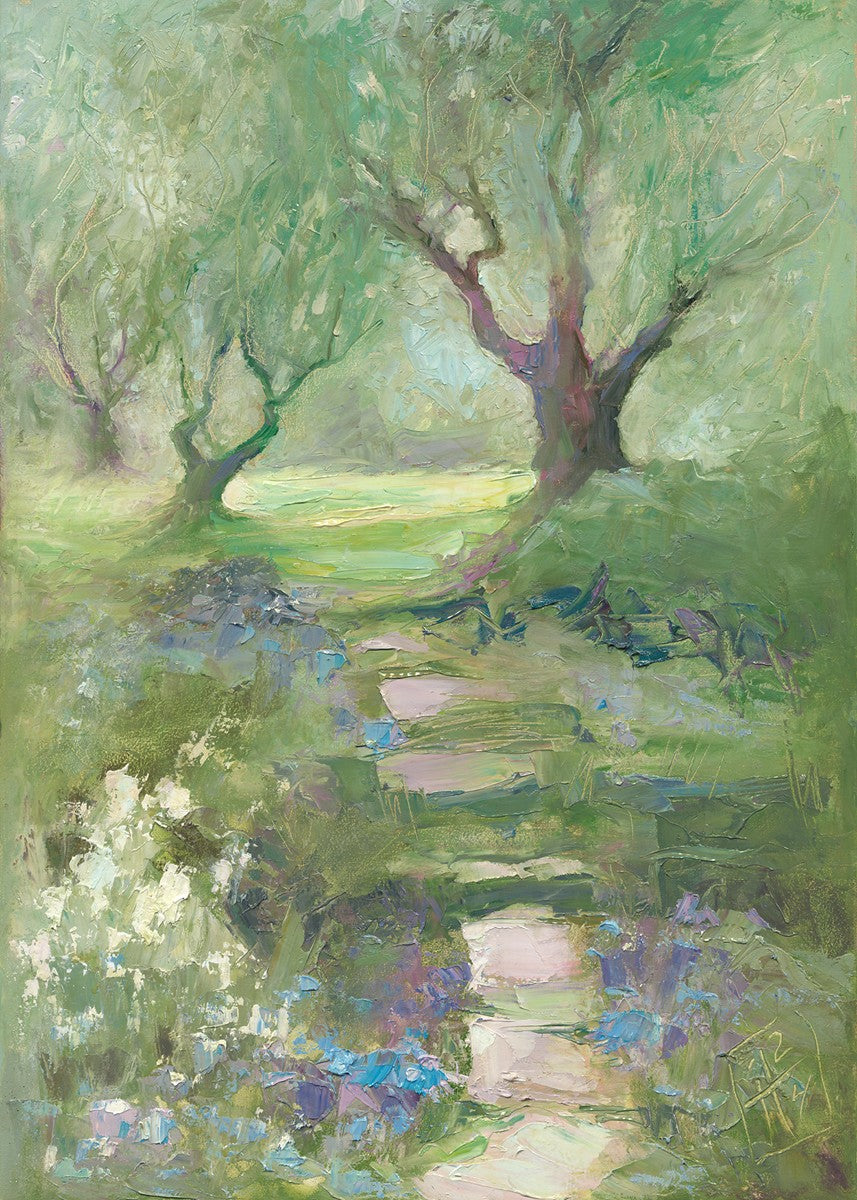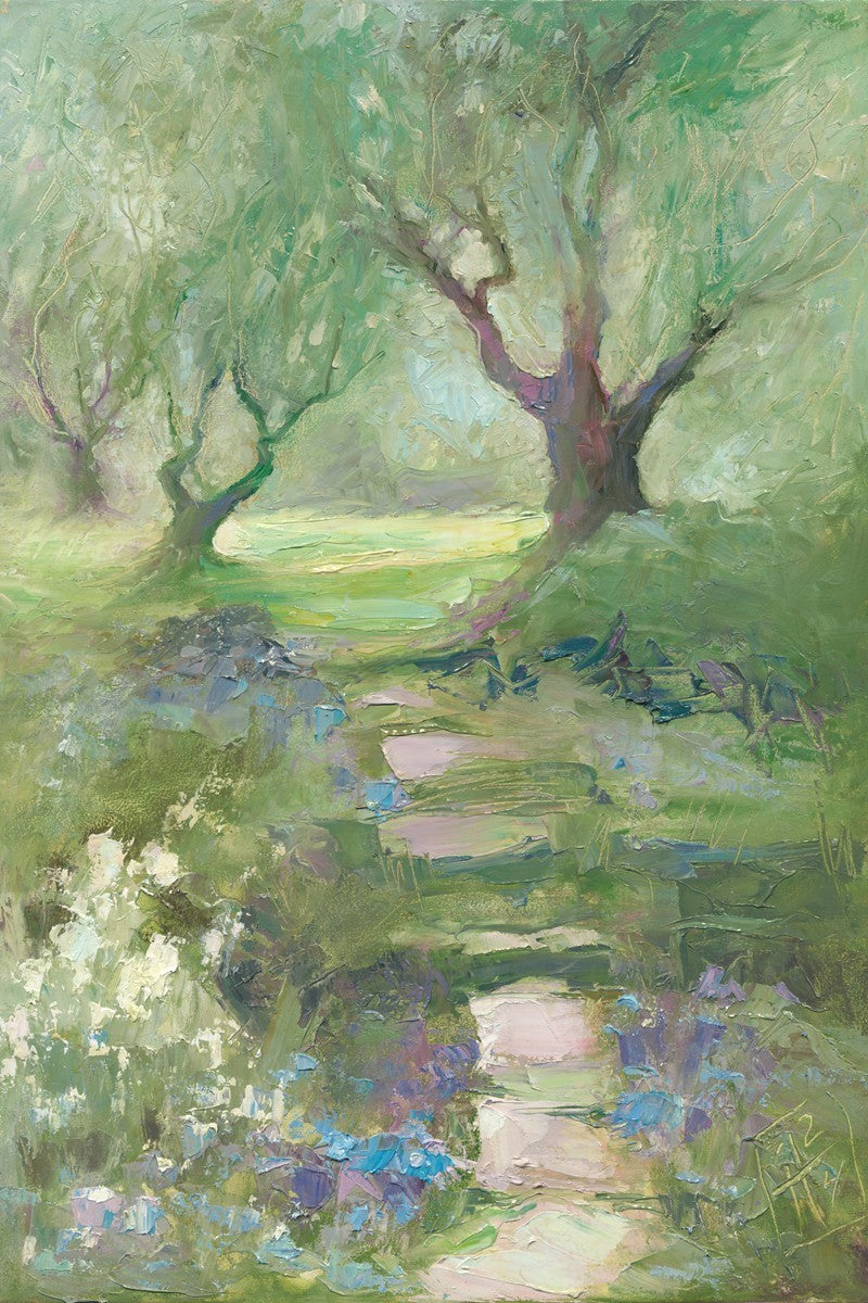 The painting was inspired by my memories of visiting Gethsemane in Jerusalem. The olive trees there have witnessed many tragic and joyful events. These ancient trees endure dramatic lives, struggling for survival against extreme temperatures, winds, and dry soil. Yet, they persevere and produce fruit that plays a vital role in religious ordinances and traditions.