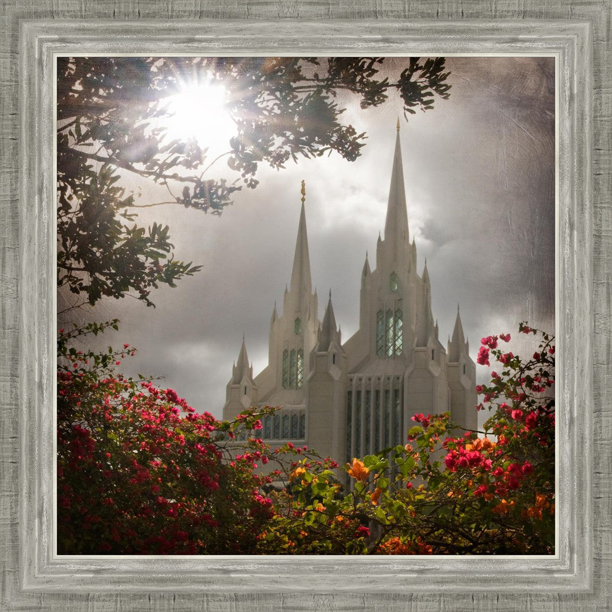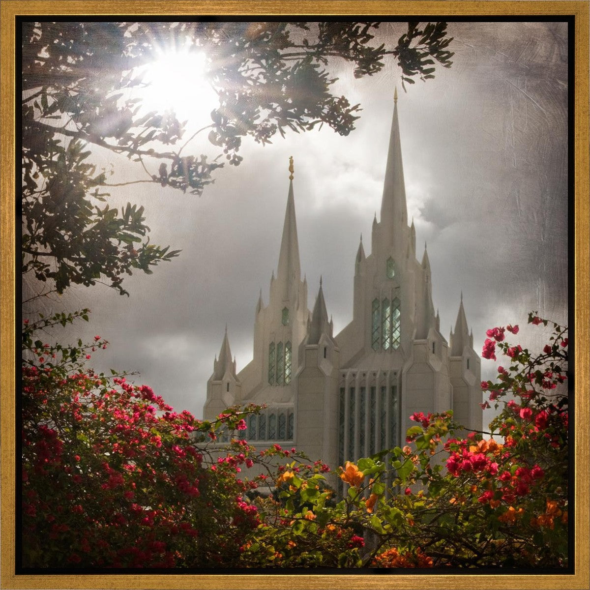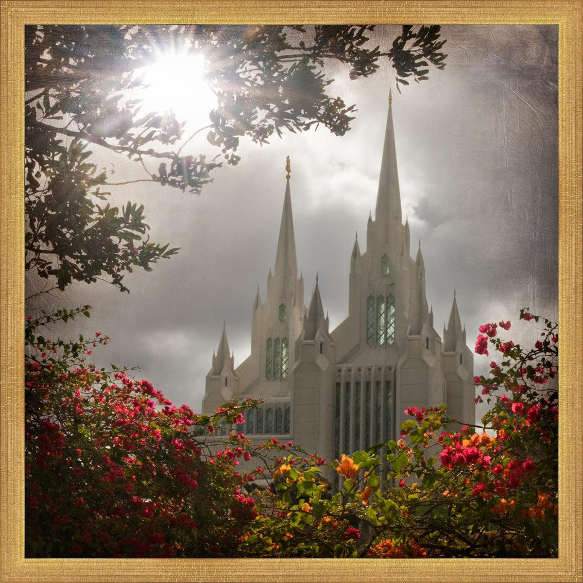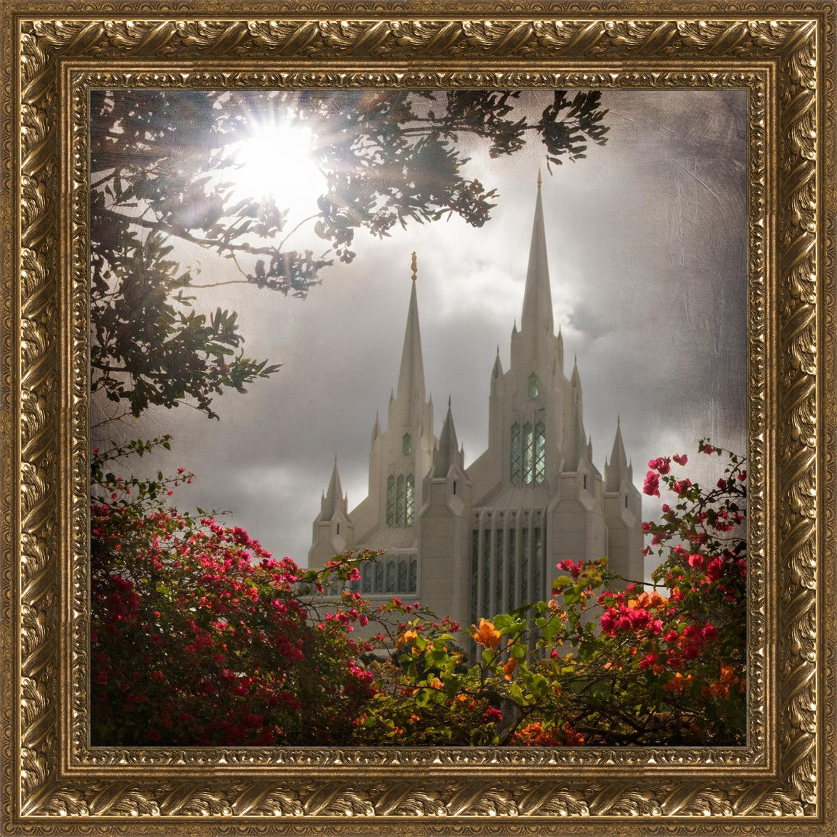 Since 1999 Landon has worked as an artisan in nearly 40 temples doing the decorative paint and gold leaf. He continues to do so as well as wood repair and graining. He was married in 2001 to Jacey Thomas in the Manti Utah temple. When she couldn’t find an image of the temple that she liked enough to purchase for their home, he decided to take one himself. That desire to create something original and different inspired his current series of temple art. They are taken from a panoramic viewpoint and stylized with an artistic border that reflect his paintings. All modern structures apart from the temple have been omitted.