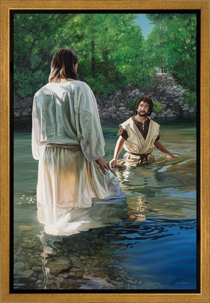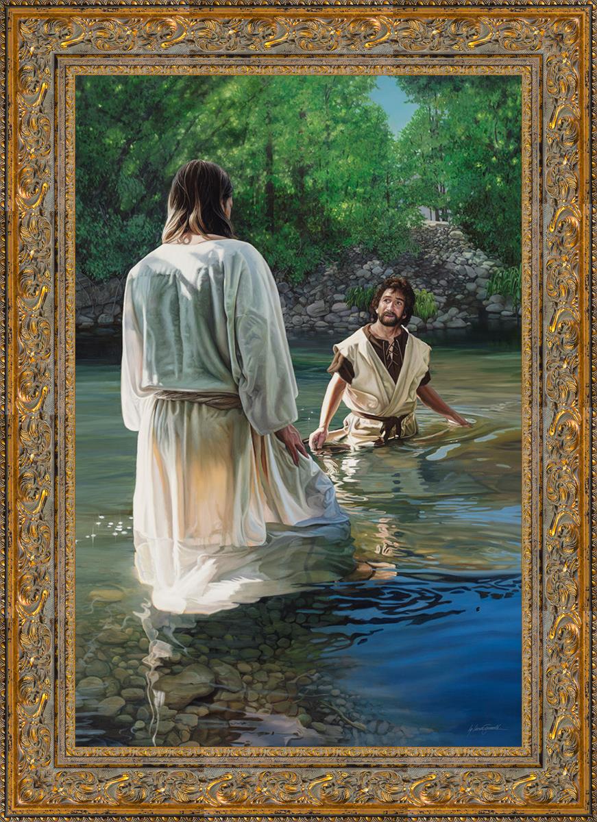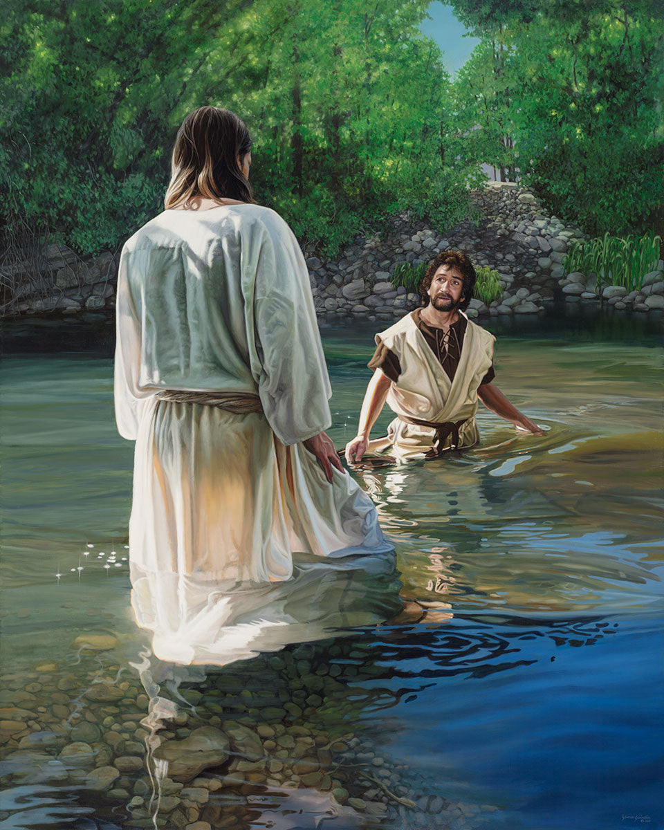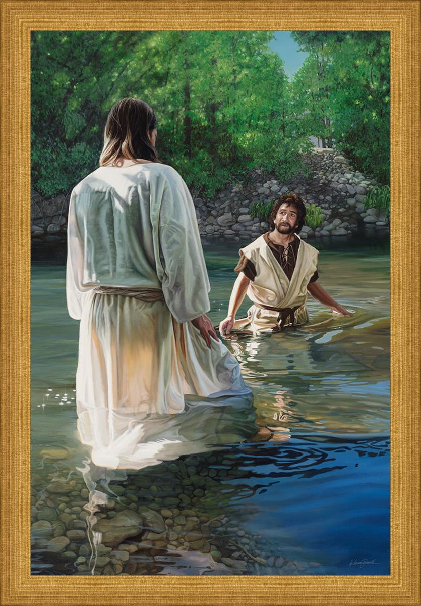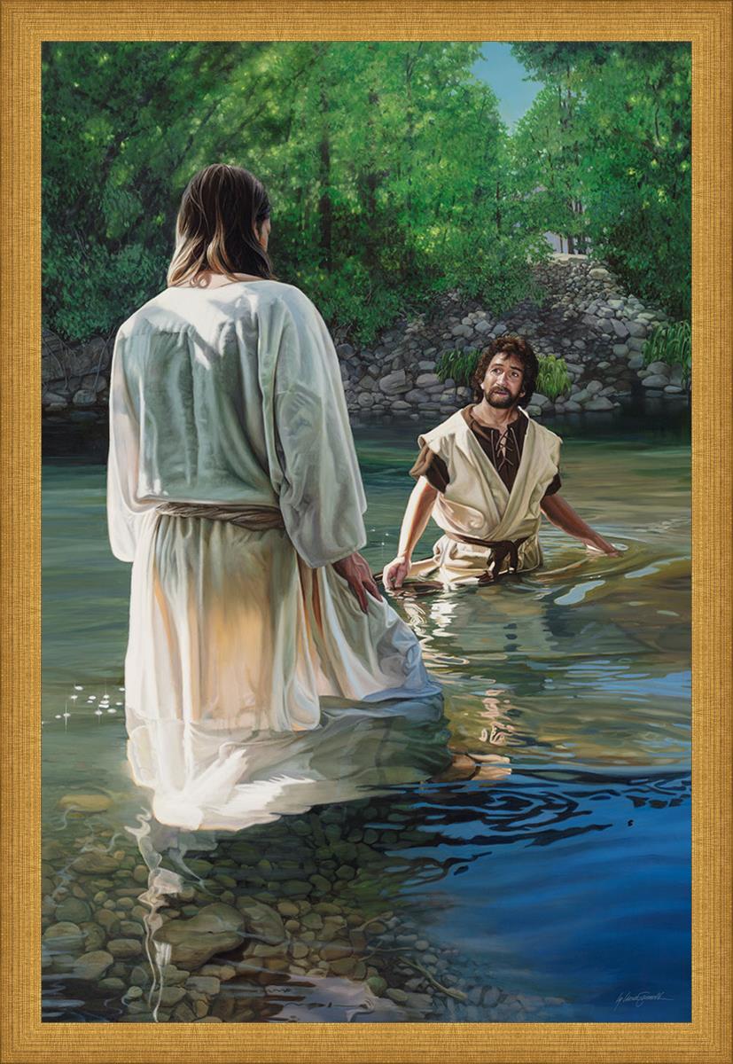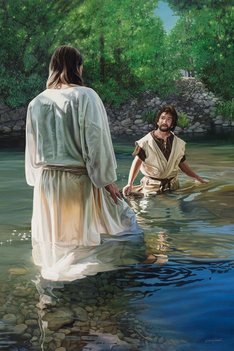 This beautiful painting by Liz Lemon Swindle depicts Jesus Christ being baptized by John the Baptist. Her depiction is of him entering the water, a special moment different from many depictions demonstrating his actual baptism.