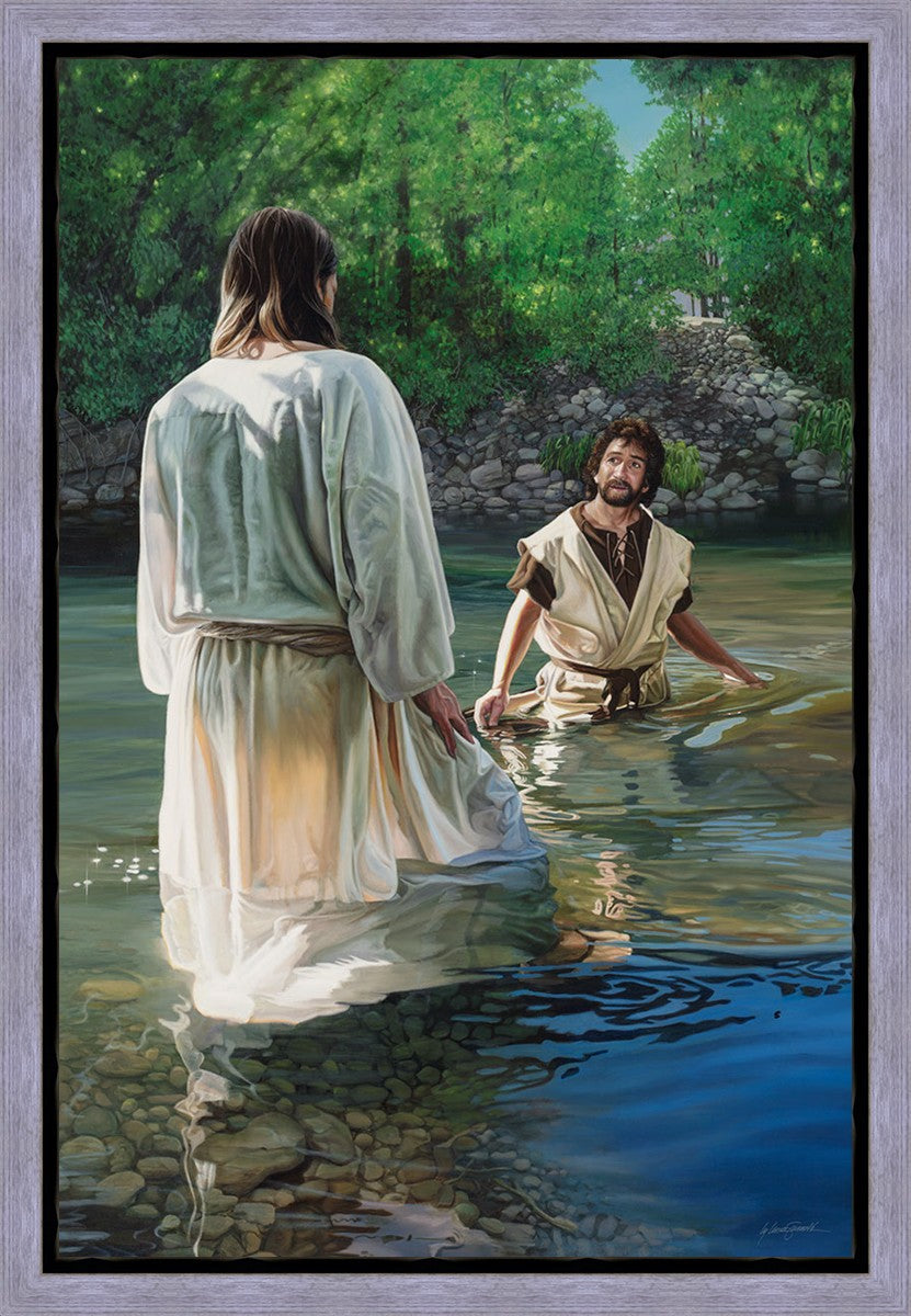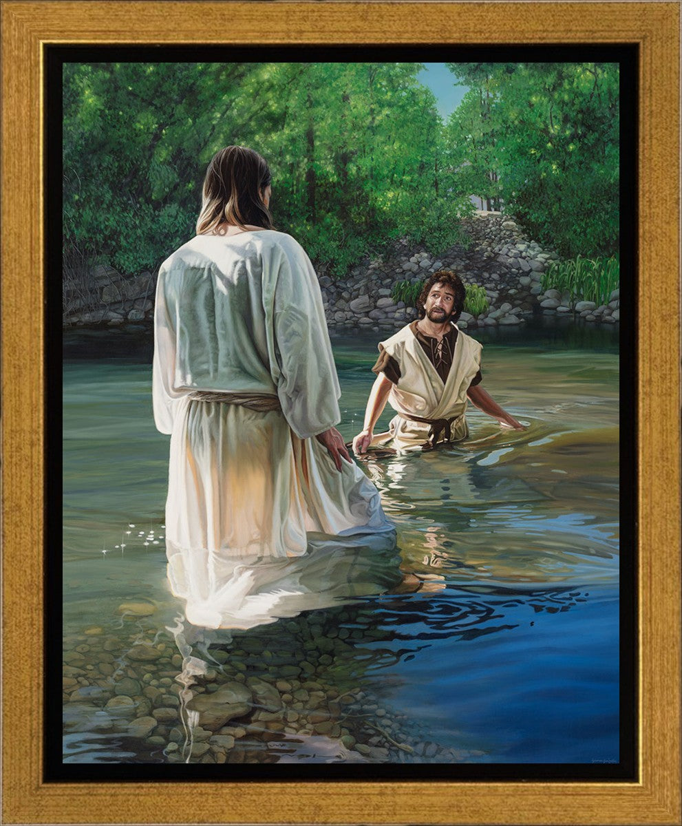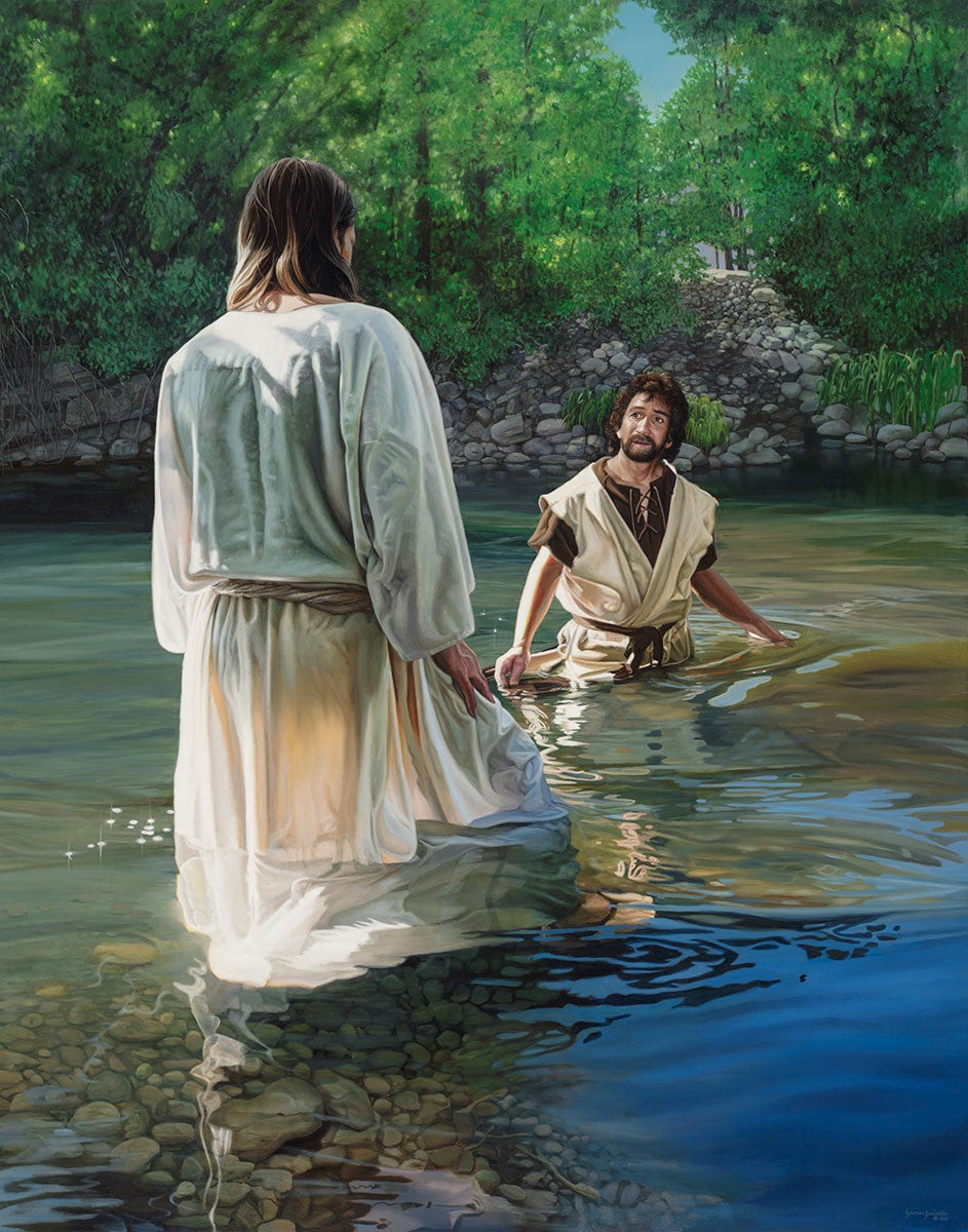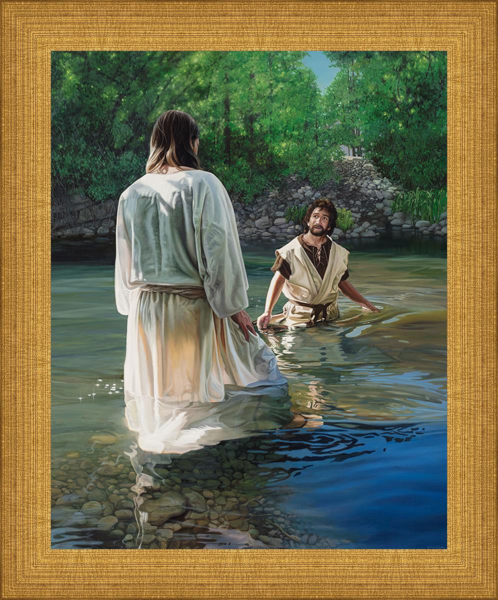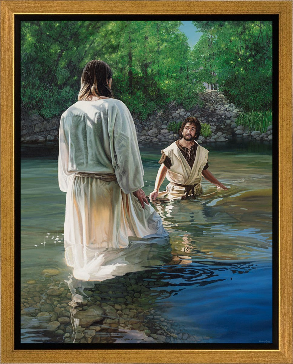This beautiful painting by Liz Lemon Swindle depicts Jesus Christ being baptized by John the Baptist. Her depiction is of him entering the water, a special moment different from many depictions demonstrating his actual baptism.